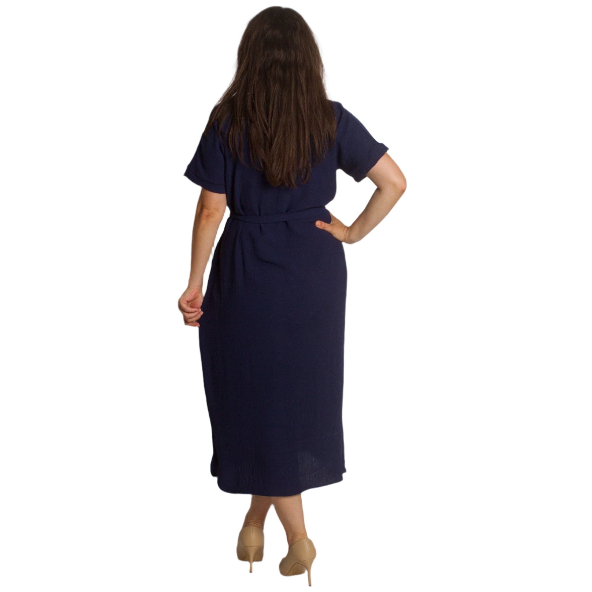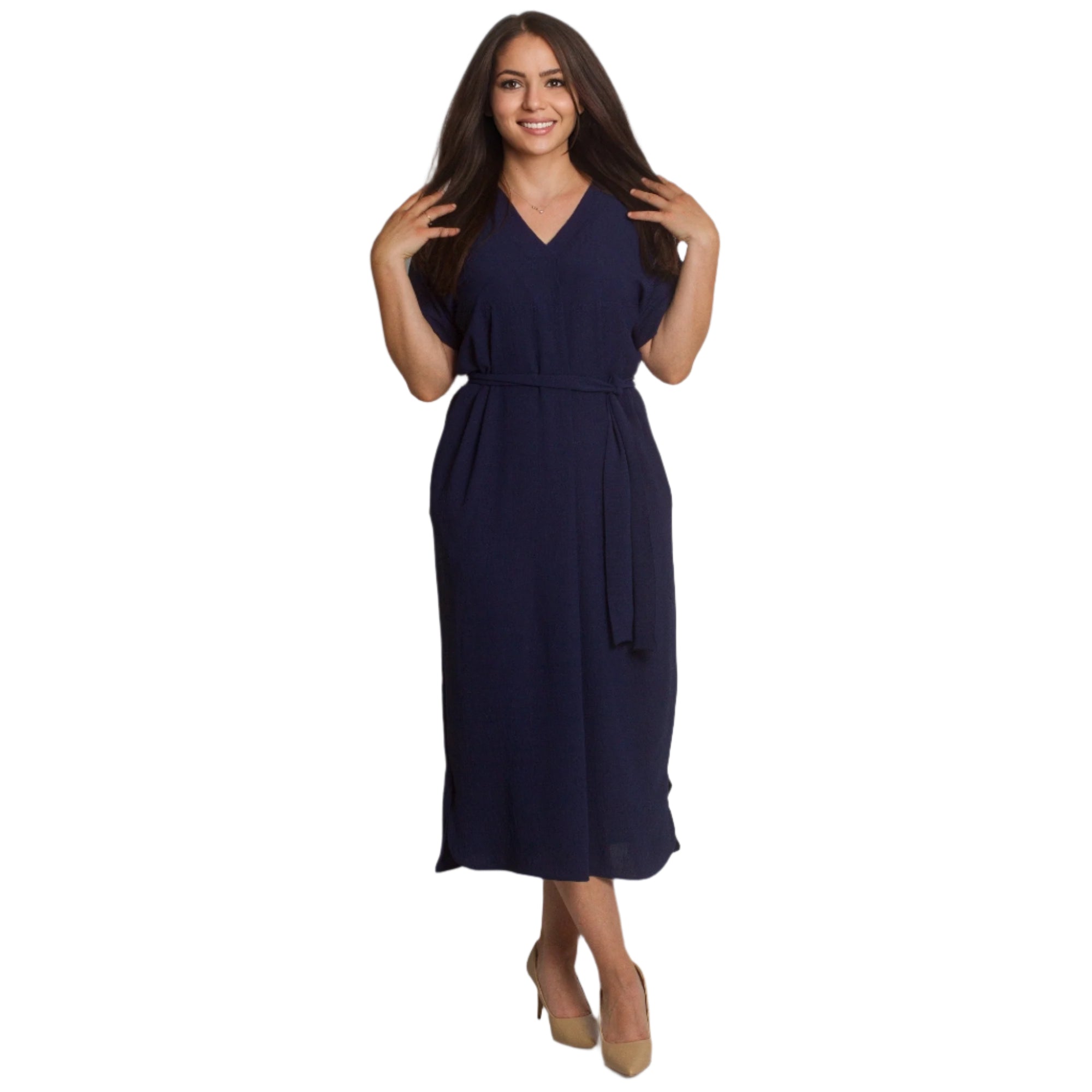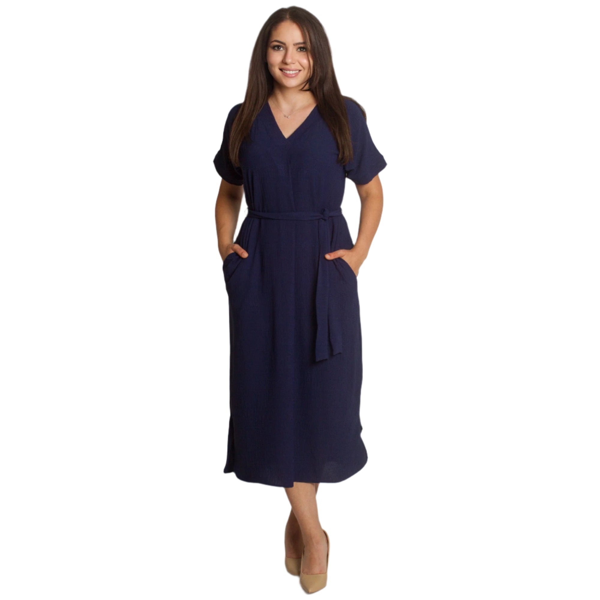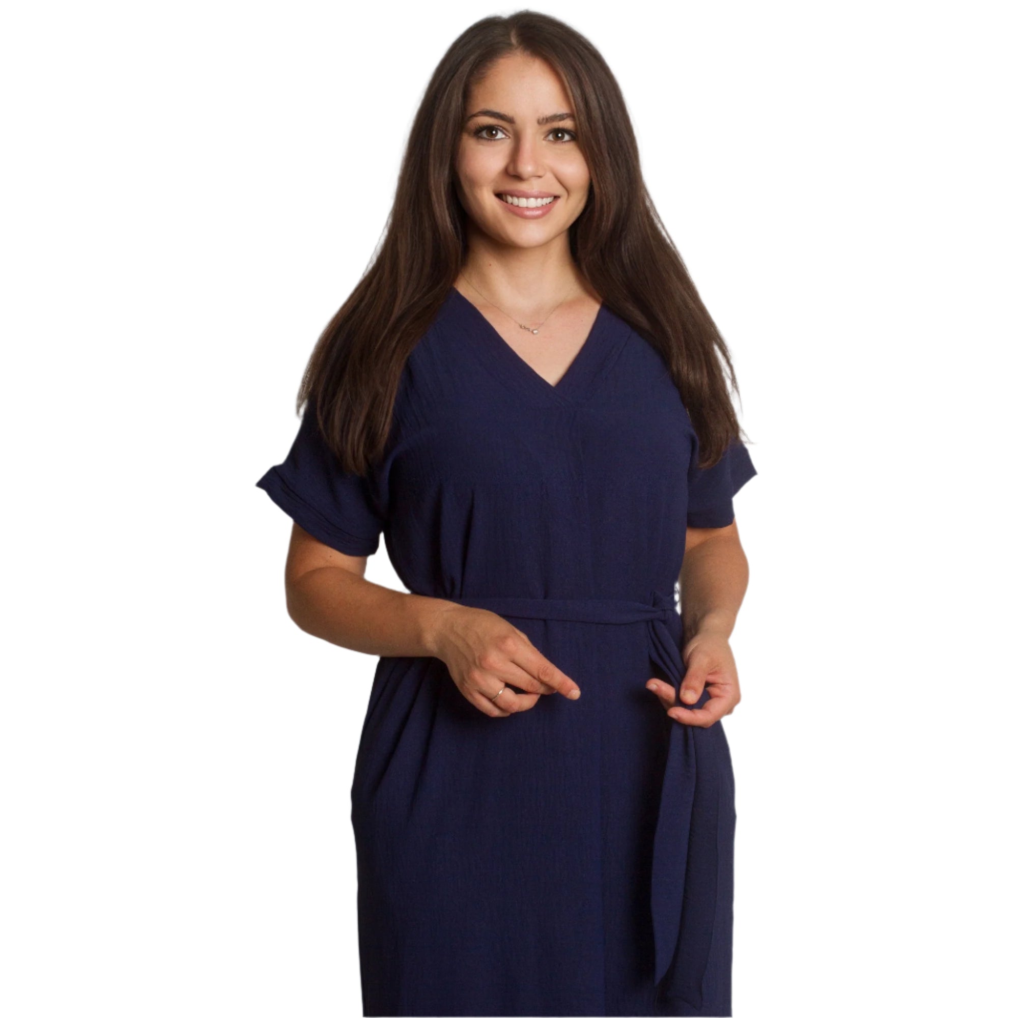 Елегантна и стилна, тази тъмносиня рокля е отличен избор за жените, които търсят изискан комфорт. Изработена от мека вискоза с еластан, тя приляга приятно към тялото и осигурява свобода на движение. V-образното деколте и коланът в талията подчертават женствеността, докато страничните джобове добавят практична нотка. Подходяща е както за ежедневни поводи, така и за по-официални събития през топлите сезони.