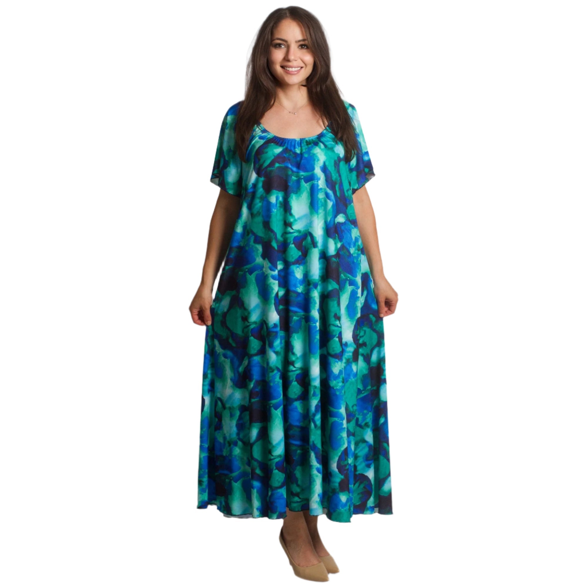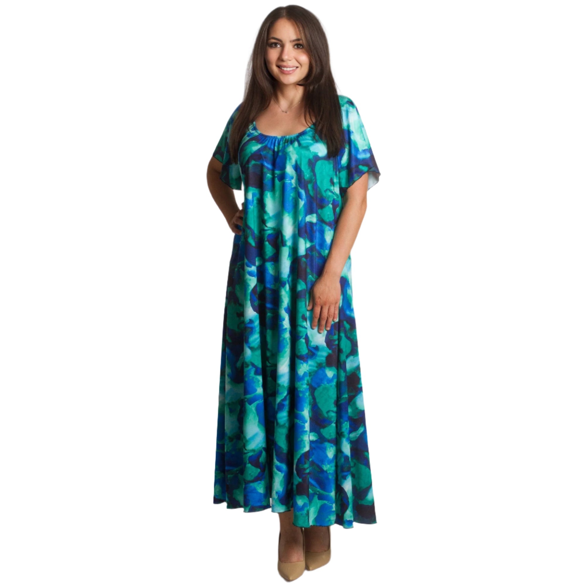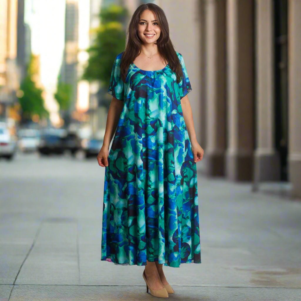 Насладете се на лекота и стил с тази ефирна рокля в многоцветен десен, съчетаващ синьо, зелено и тюркоазено. Моделът е с обло деколте, свободна разкроена кройка и дължина до глезена, което я прави идеален избор както за ежедневни, така и за официални поводи. Леката и еластична материя осигурява комфорт през пролетно-летните дни, а ефирните ръкави добавят нежност и женственост към визията.