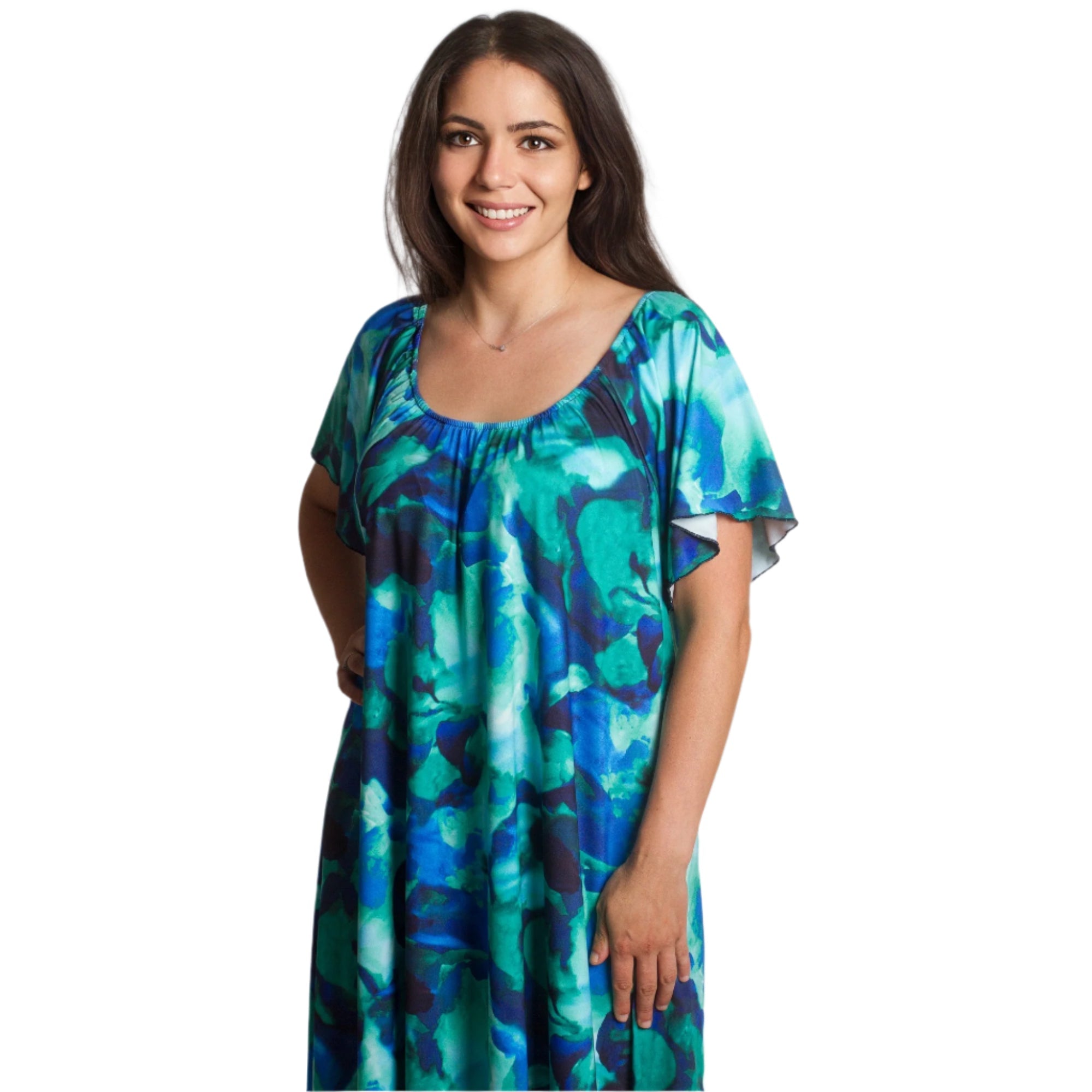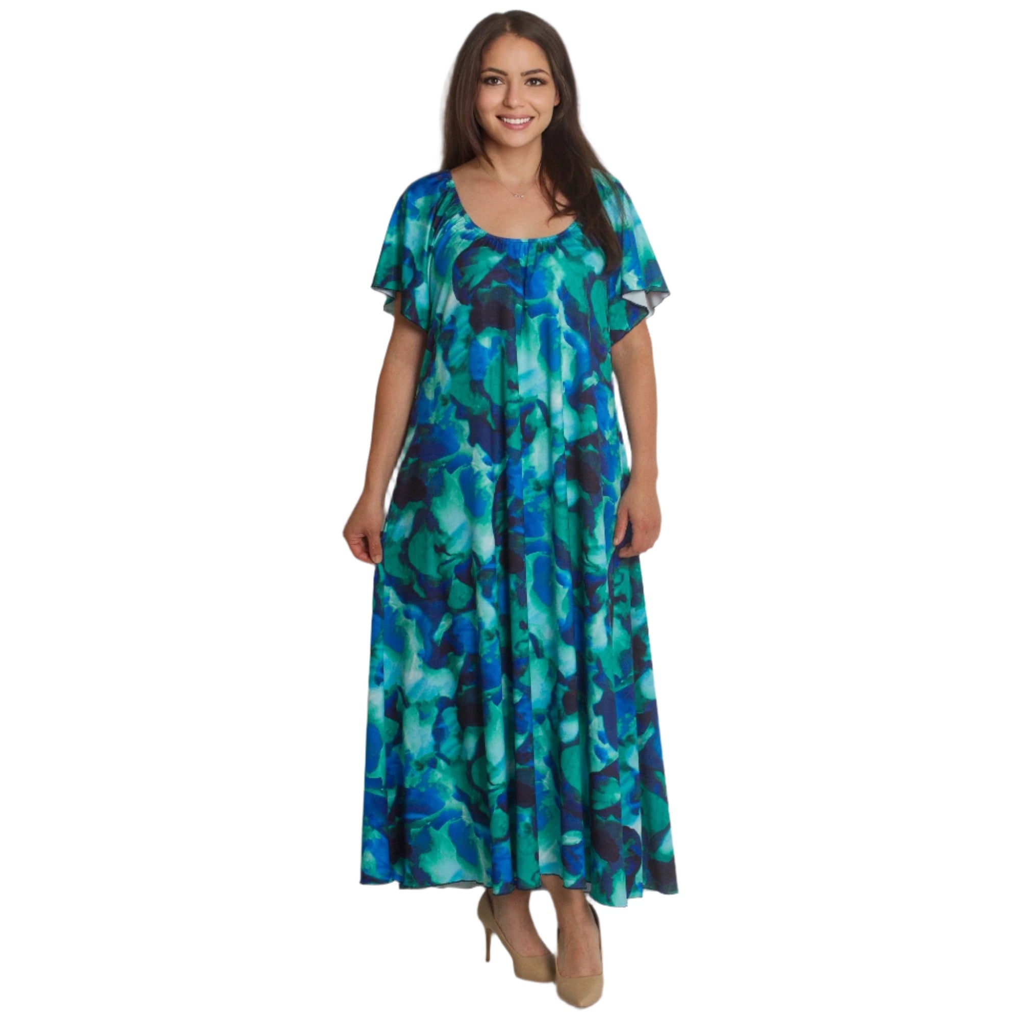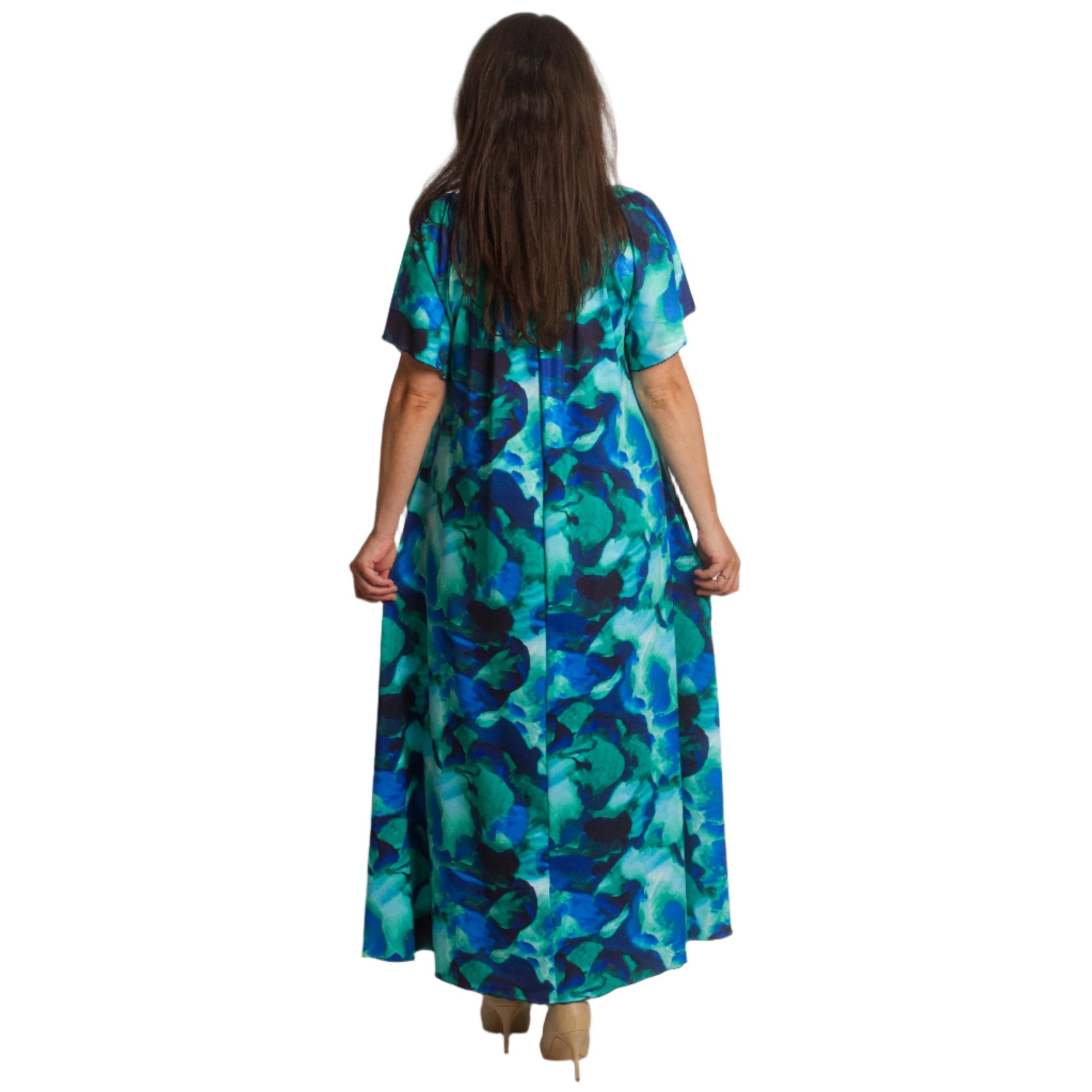 Насладете се на лекота и стил с тази ефирна рокля в многоцветен десен, съчетаващ синьо, зелено и тюркоазено. Моделът е с обло деколте, свободна разкроена кройка и дължина до глезена, което я прави идеален избор както за ежедневни, така и за официални поводи. Леката и еластична материя осигурява комфорт през пролетно-летните дни, а ефирните ръкави добавят нежност и женственост към визията.