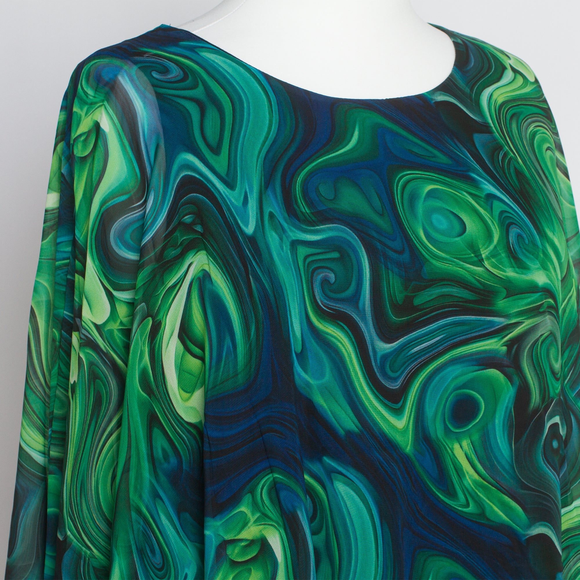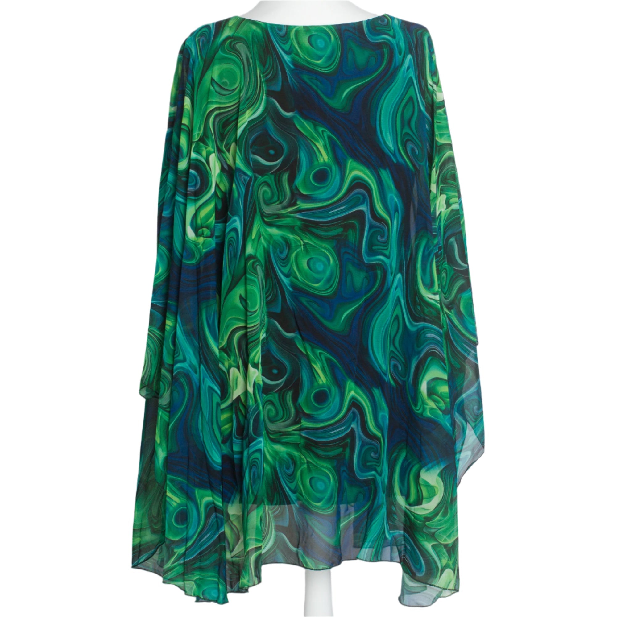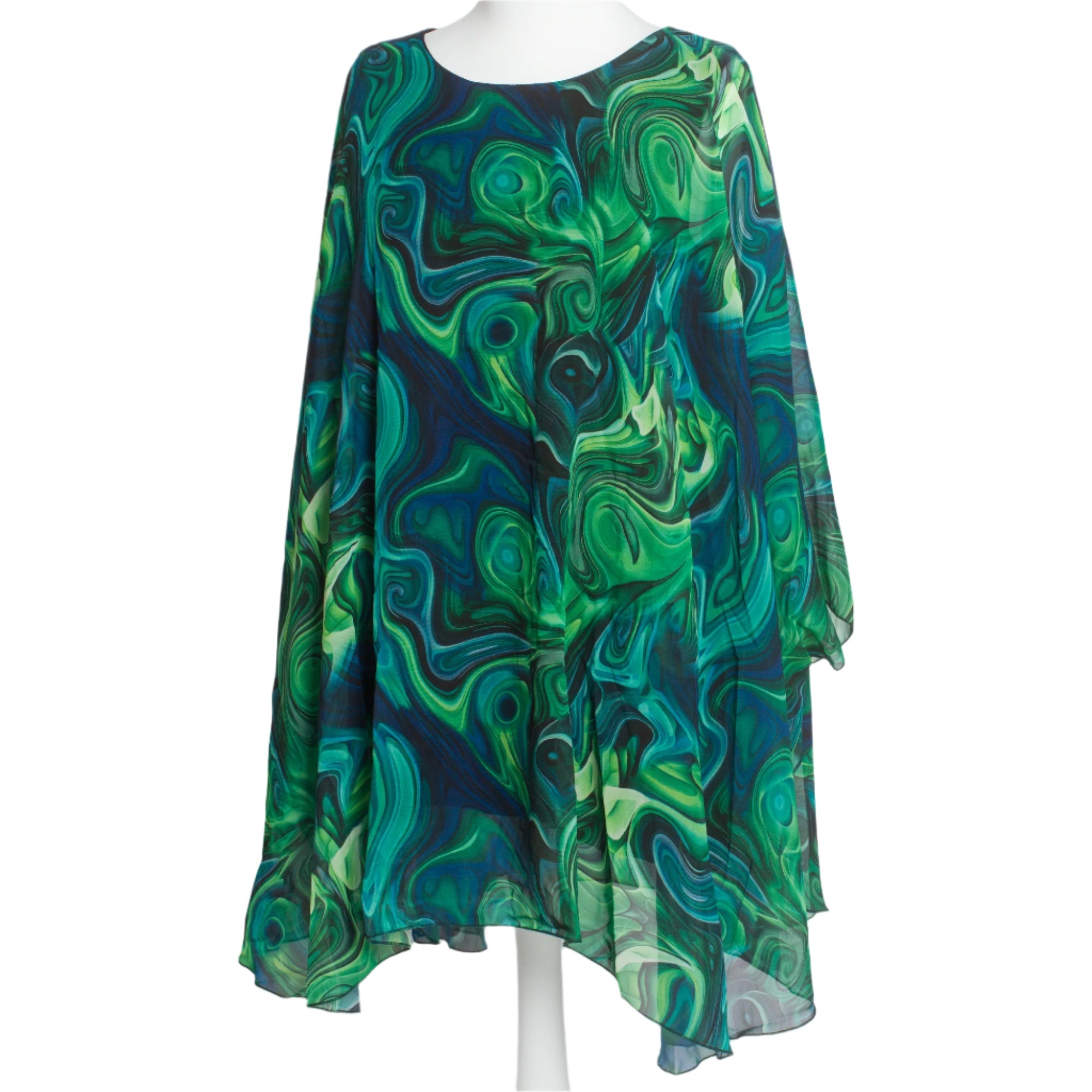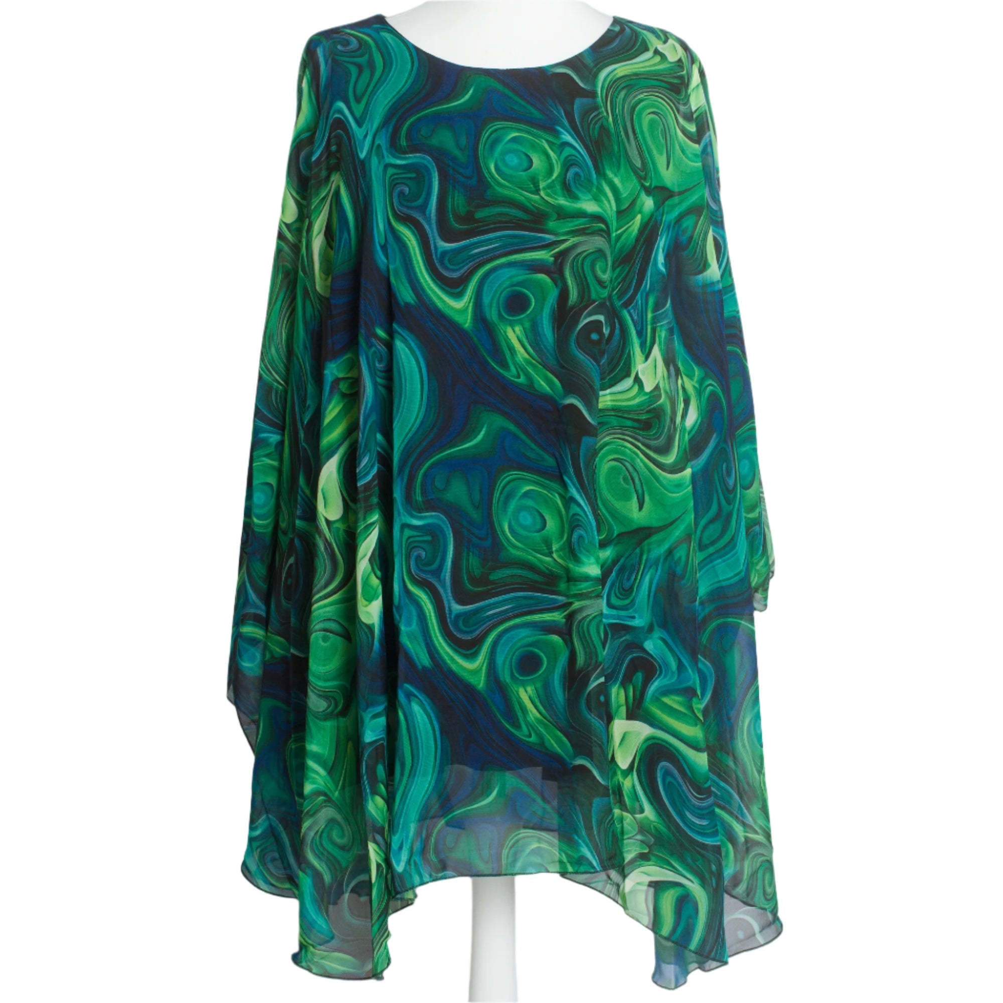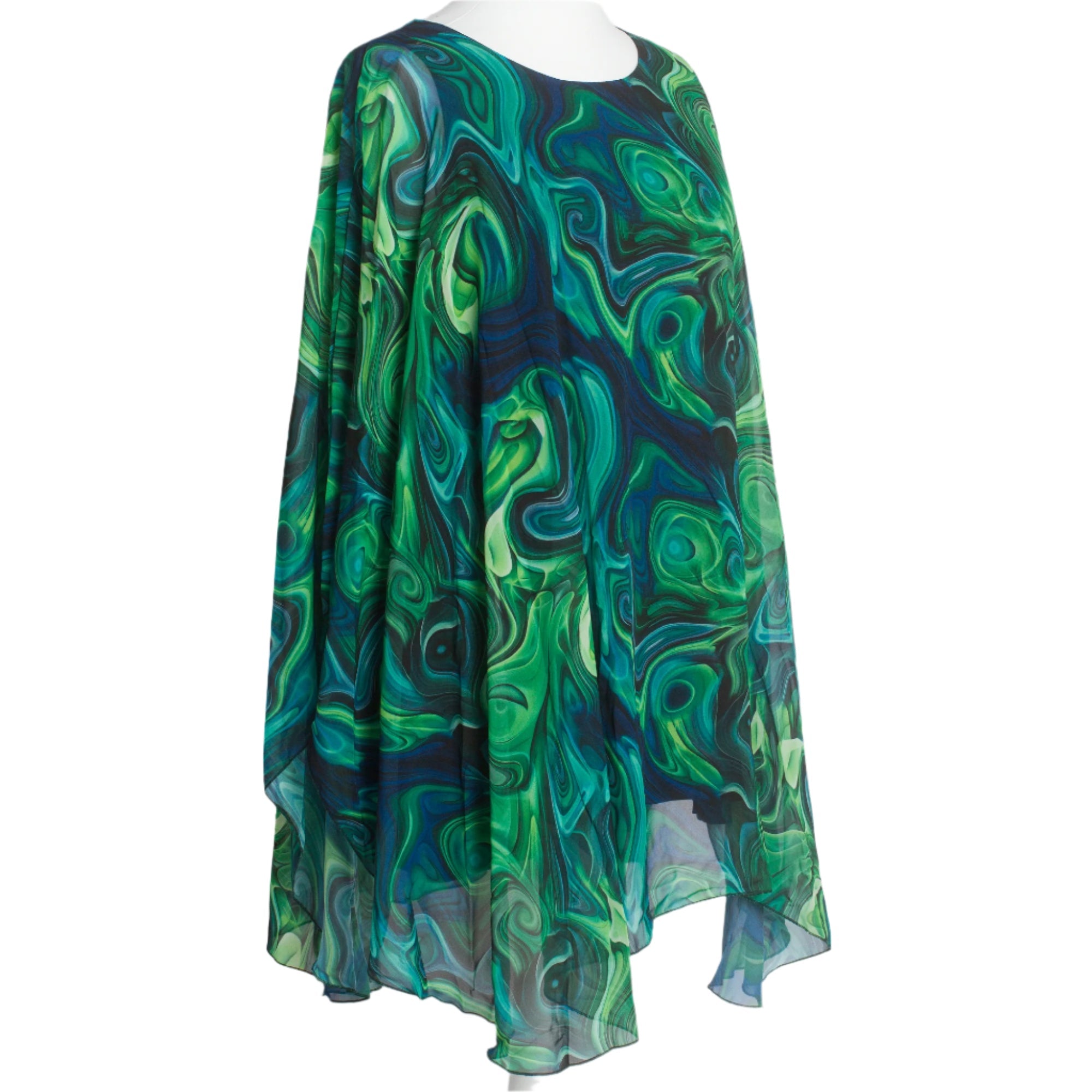 Потопете се в елегантността с тази впечатляваща туника в големи размери, изработена от ефирен шифон с абстрактен десен в зелено-сини нюанси. Свободната кройка и меката подплата от вискоза и еластан осигуряват комфорт и стил, докато обло деколте и плавният силует придават изтънчен вид. Идеална за официални поводи през пролетно-летния сезон, тази туника е изборът за жени, които обичат да се чувстват красиви и уверени.