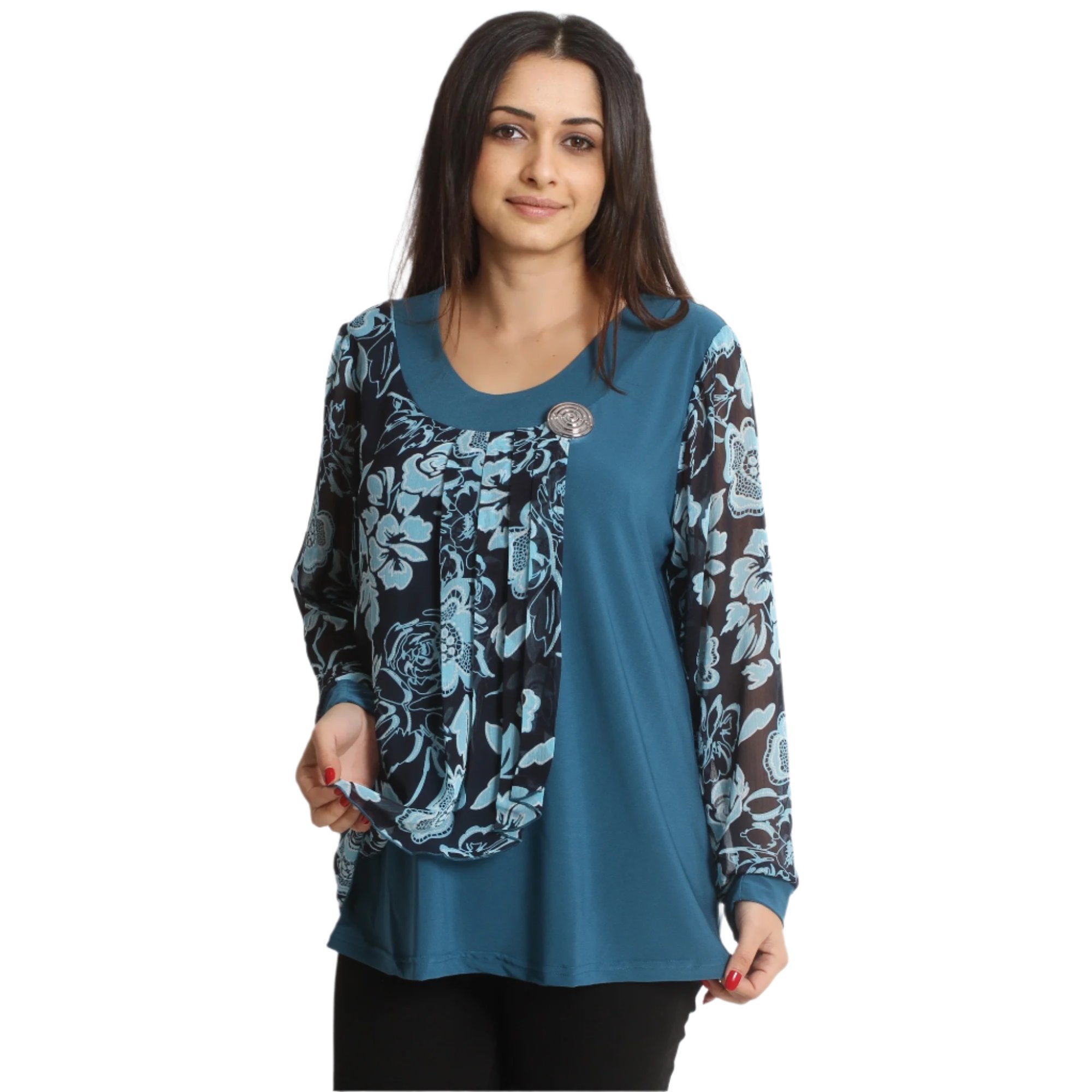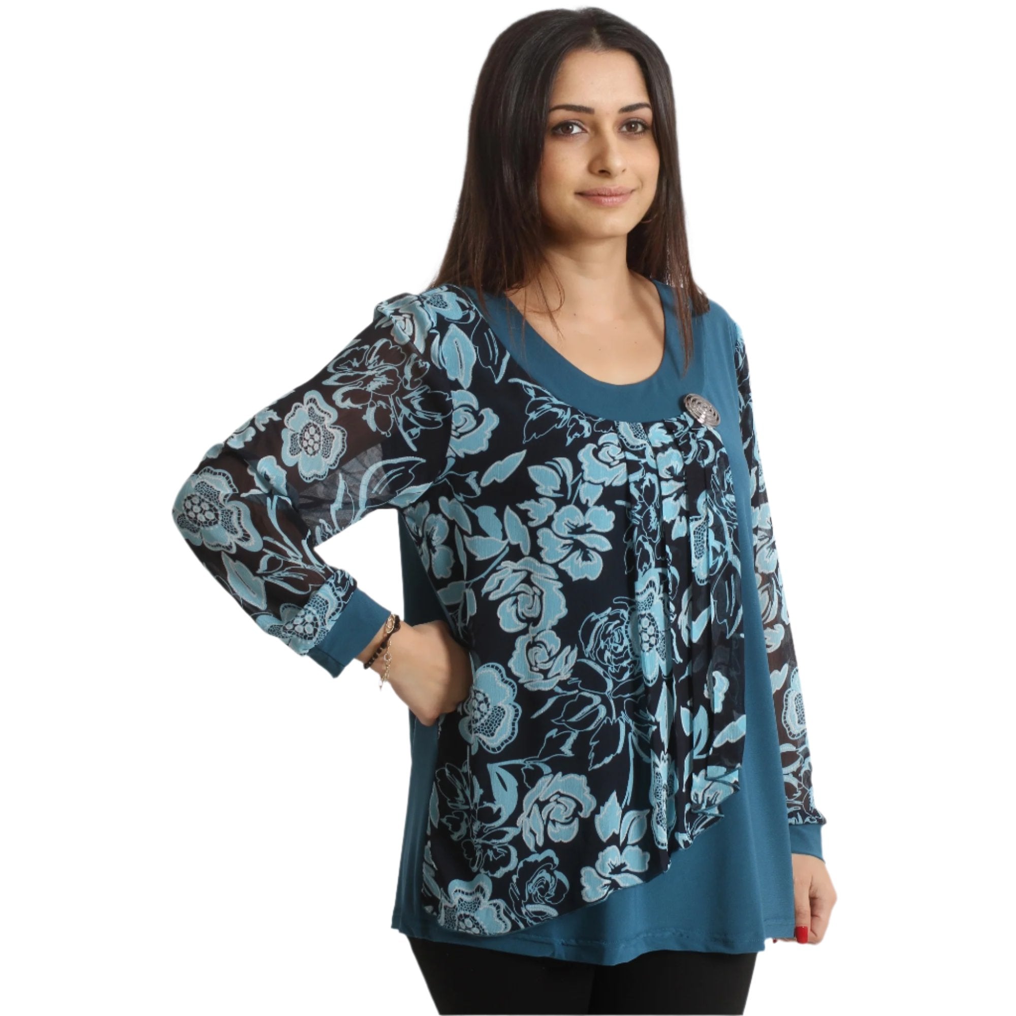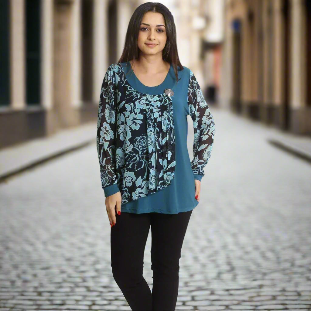 Открийте перфектната официална туника за вашите специални поводи в Maxi Market. Тази туника във впечатляващ петролен цвят е изключително изискана със своята свободна кройка и кръгло деколте, предлагайки елегантност и комфорт във всяка ситуация. Флоралният модел добавя нотка нежност и женственост, като прави тази дреха идеална за всякакви формални събития през всички сезони. Съставът от 95% вискоза и 5% еластан гарантира удобство и еластичност, позволявайки туниката да оформя естествено вашата фигура. Осигурете си увереност и стил с тази уникална туника, която ще бъде вашият верен спътник на официални събития.