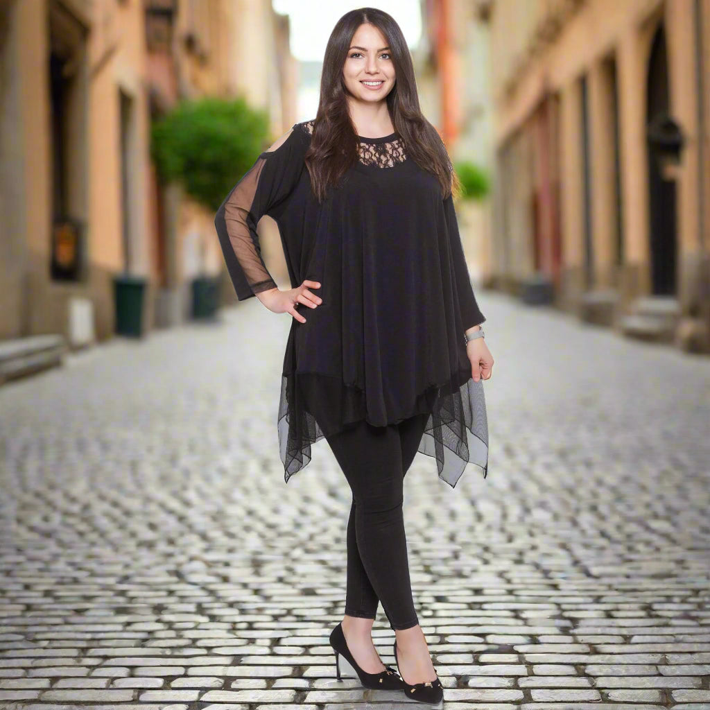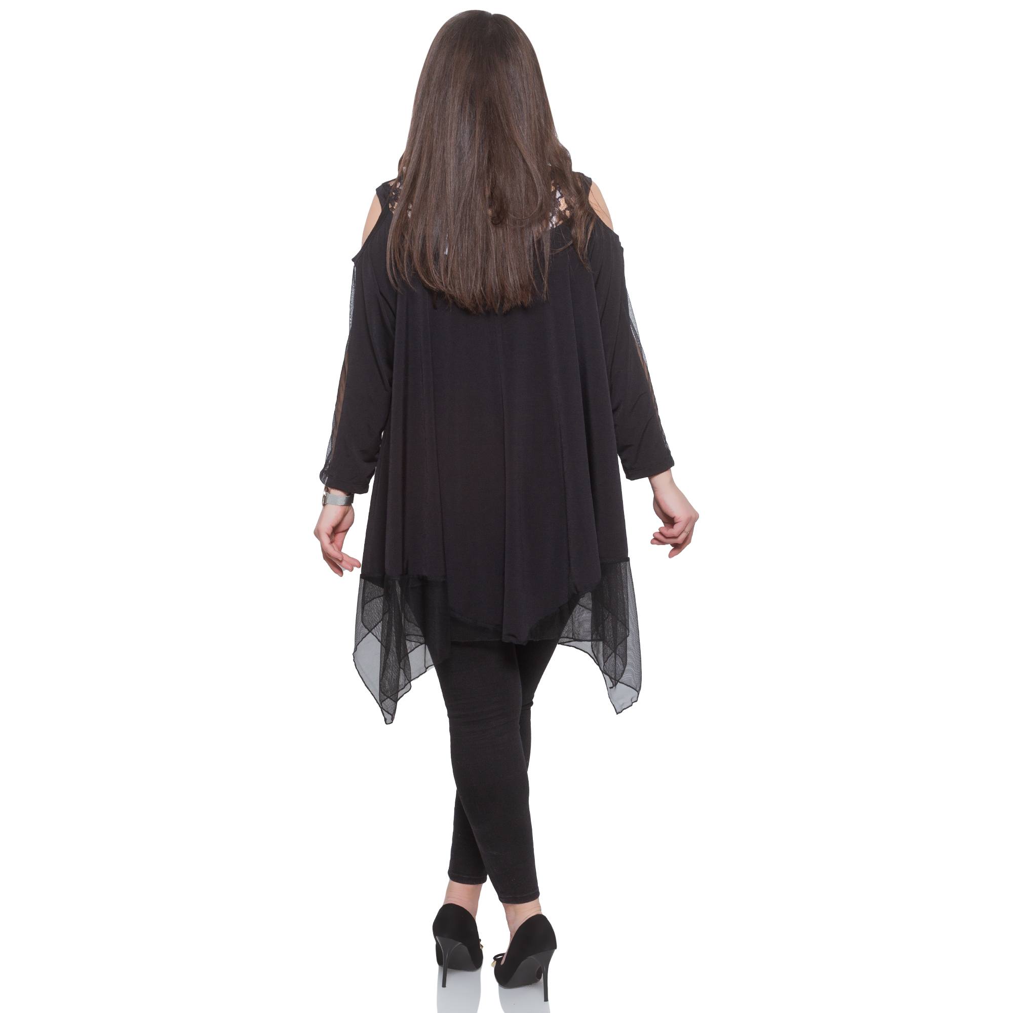 Открийте перфектната официална туника за всякакви специални случаи в Maxi Market! Тази черна туника от тюл е идеален избор за елегантни събития през есента и зимата. С разкроена кройка, която елегантно пада по фигурата, и елегантно деколте тип лодка, тази туника подчертава женствеността и стилната визия. Изработена от висококачествени материали - 95% памук и 5% еластан, тази дреха осигурява комфорт и еластичност, което я прави не само красива, но и удобна за носене.