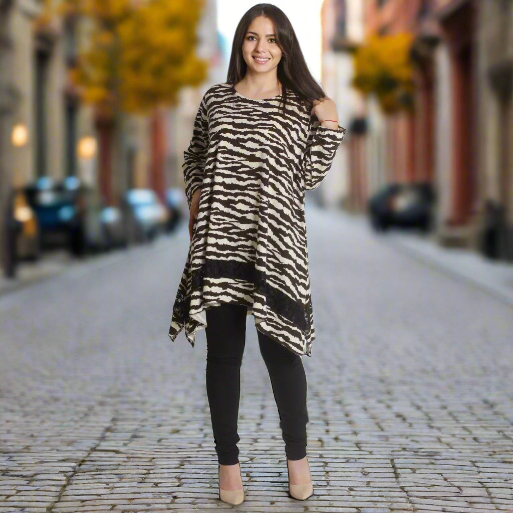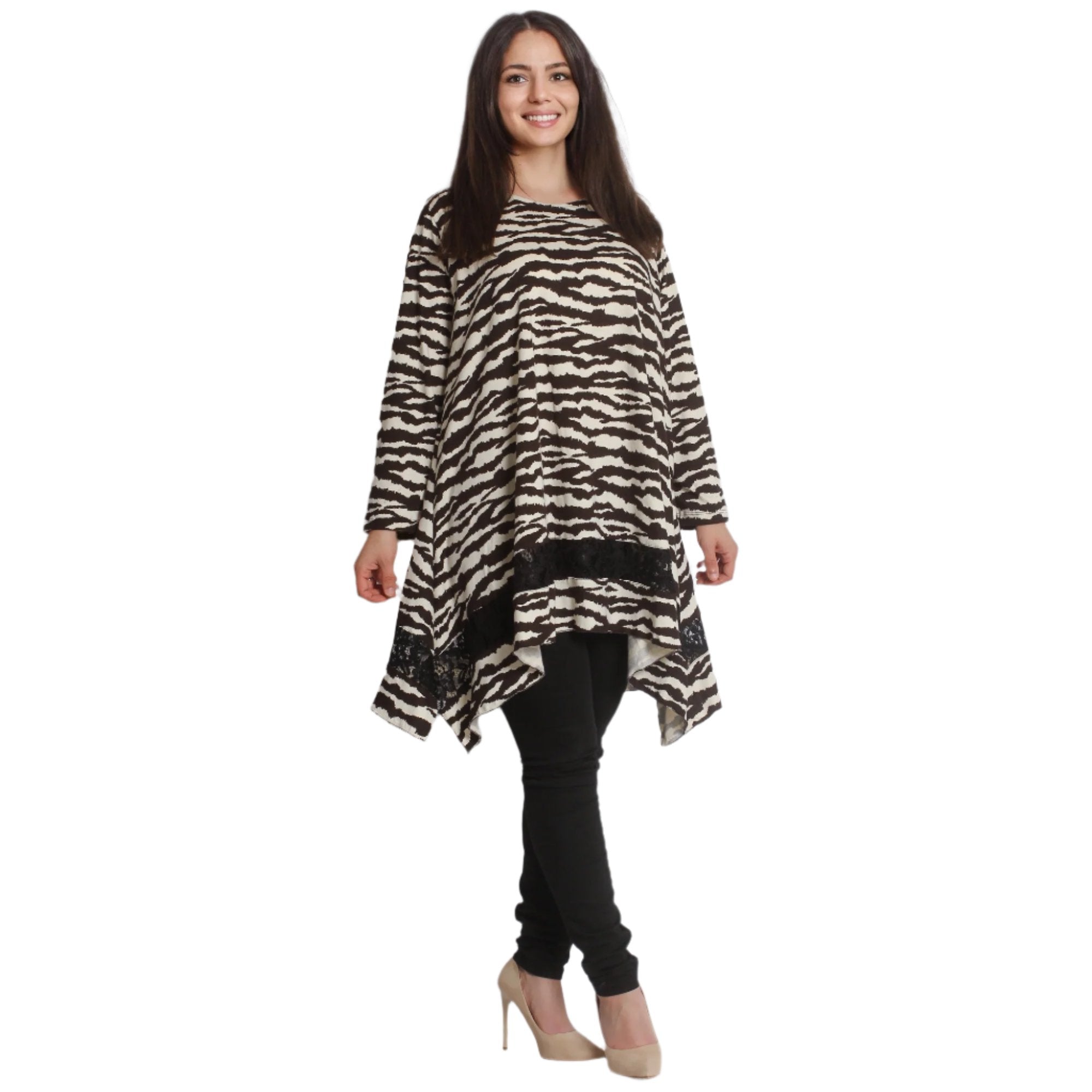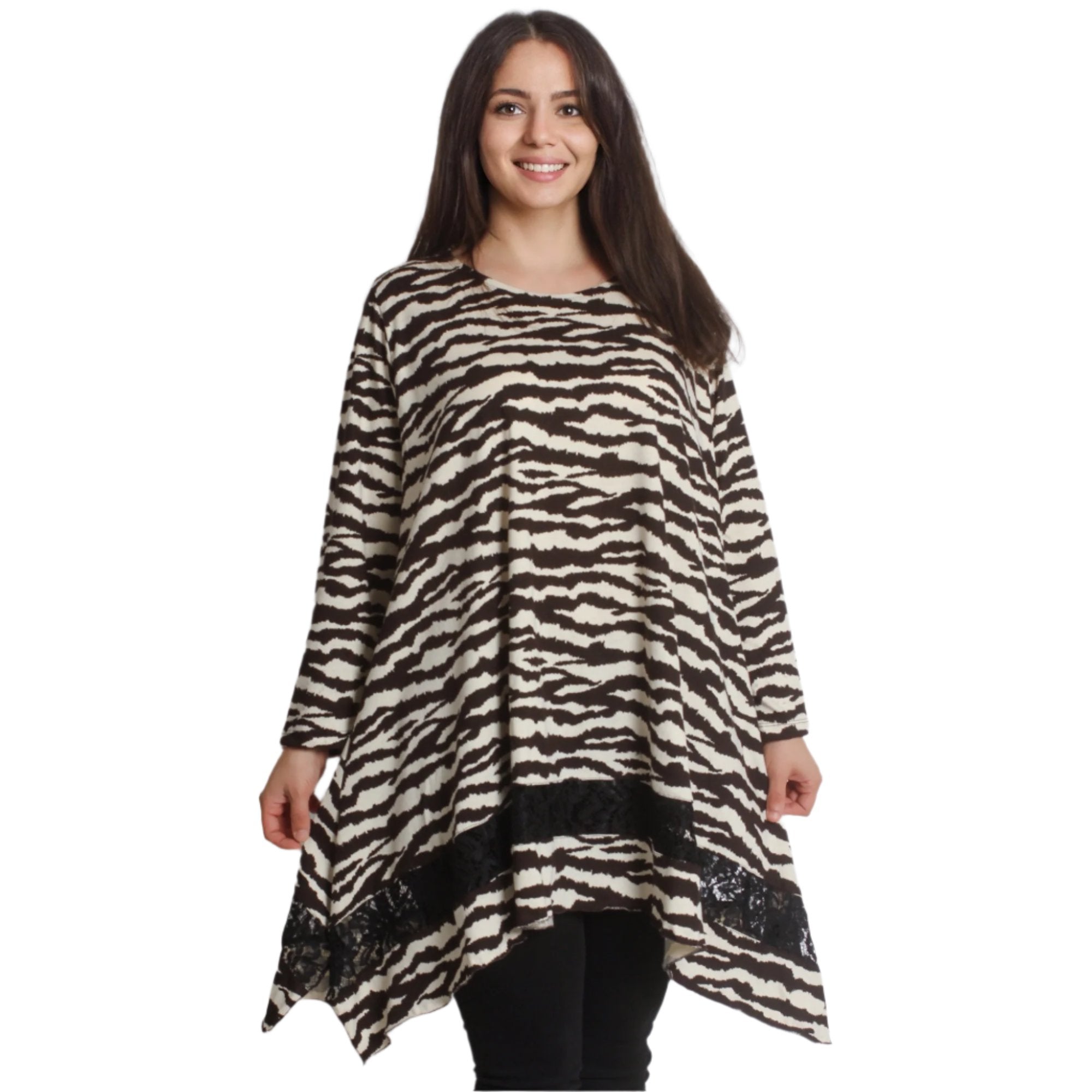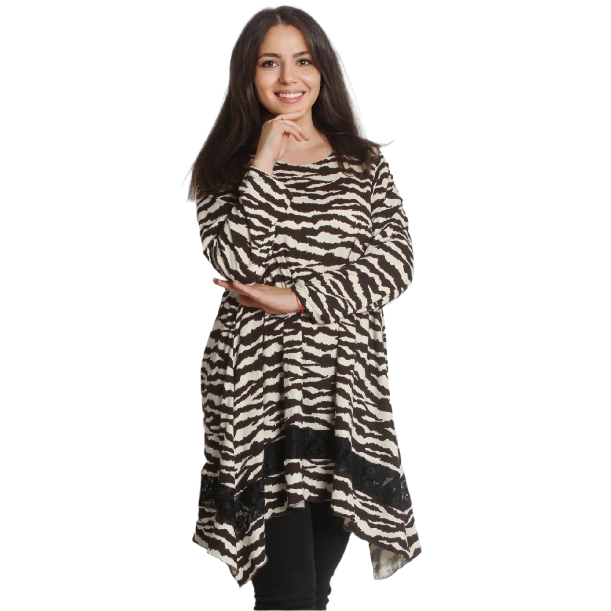 Разкроена туника с дълъг ръкав и красив детайл от дантела, изработена от 95% вискоза и 5% еластан. Асиметричната кройка и облото деколте правят туниката стилен и удобен избор за всеки повод, независимо дали е официален или ежедневен. Туниката е изключително комфортна и елегантна.
