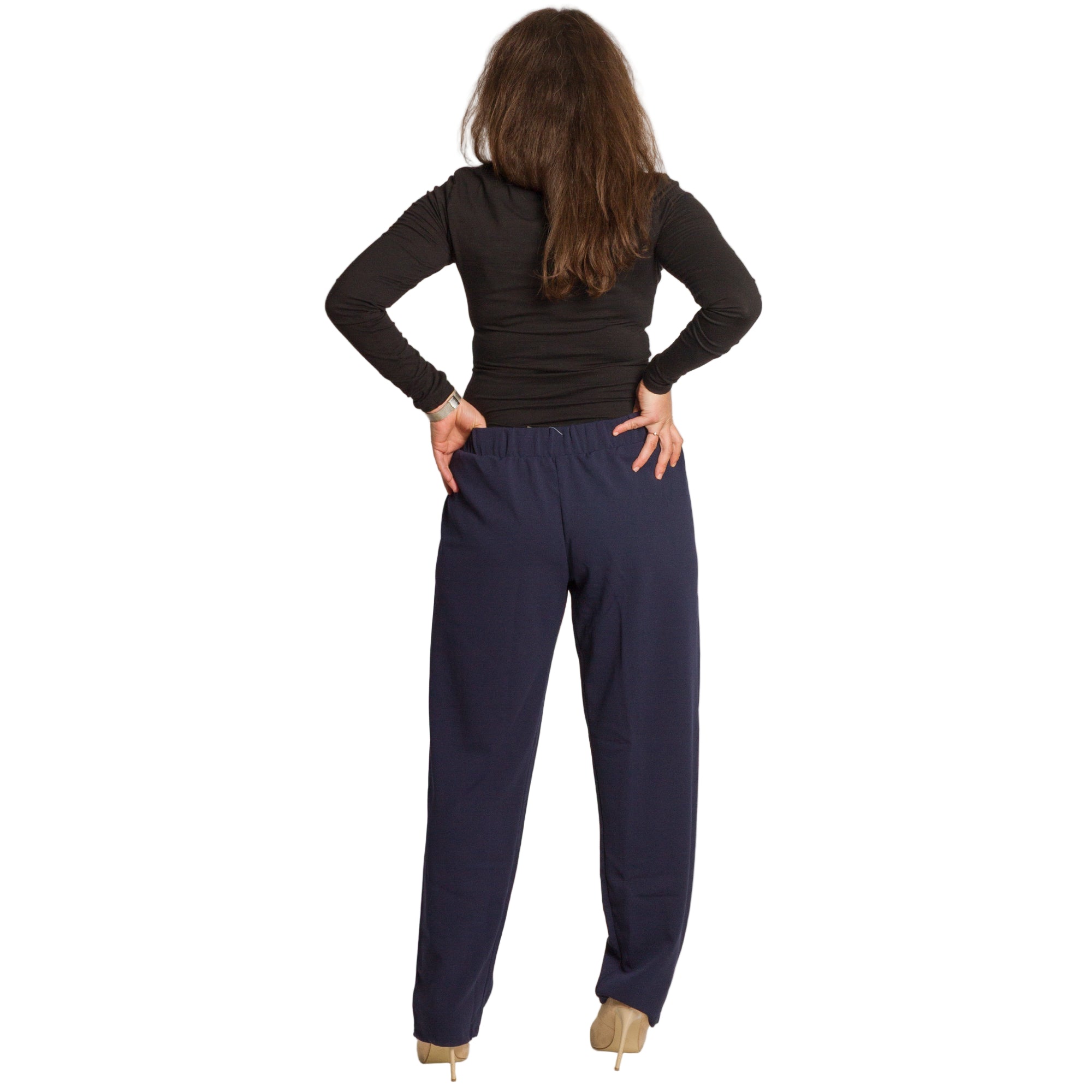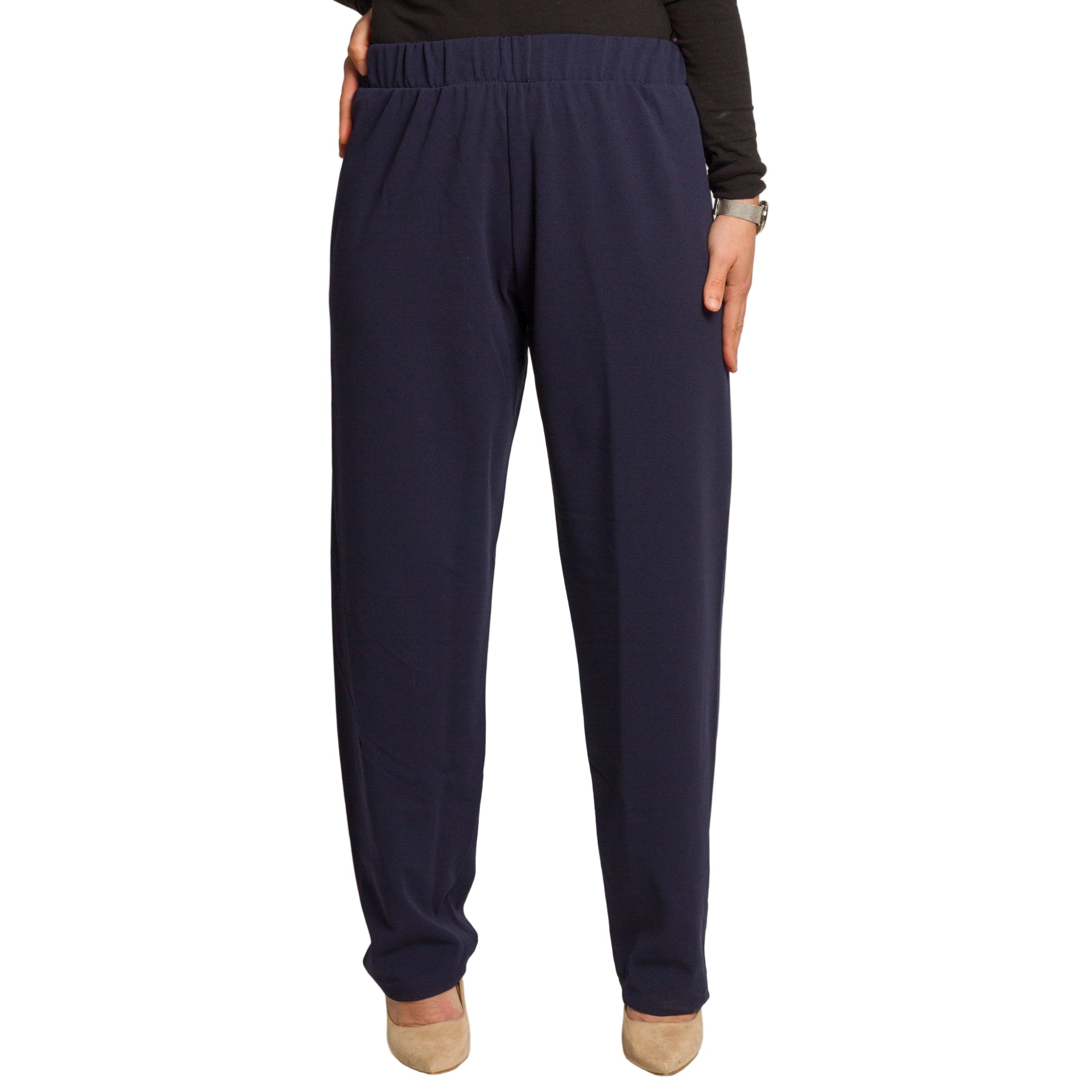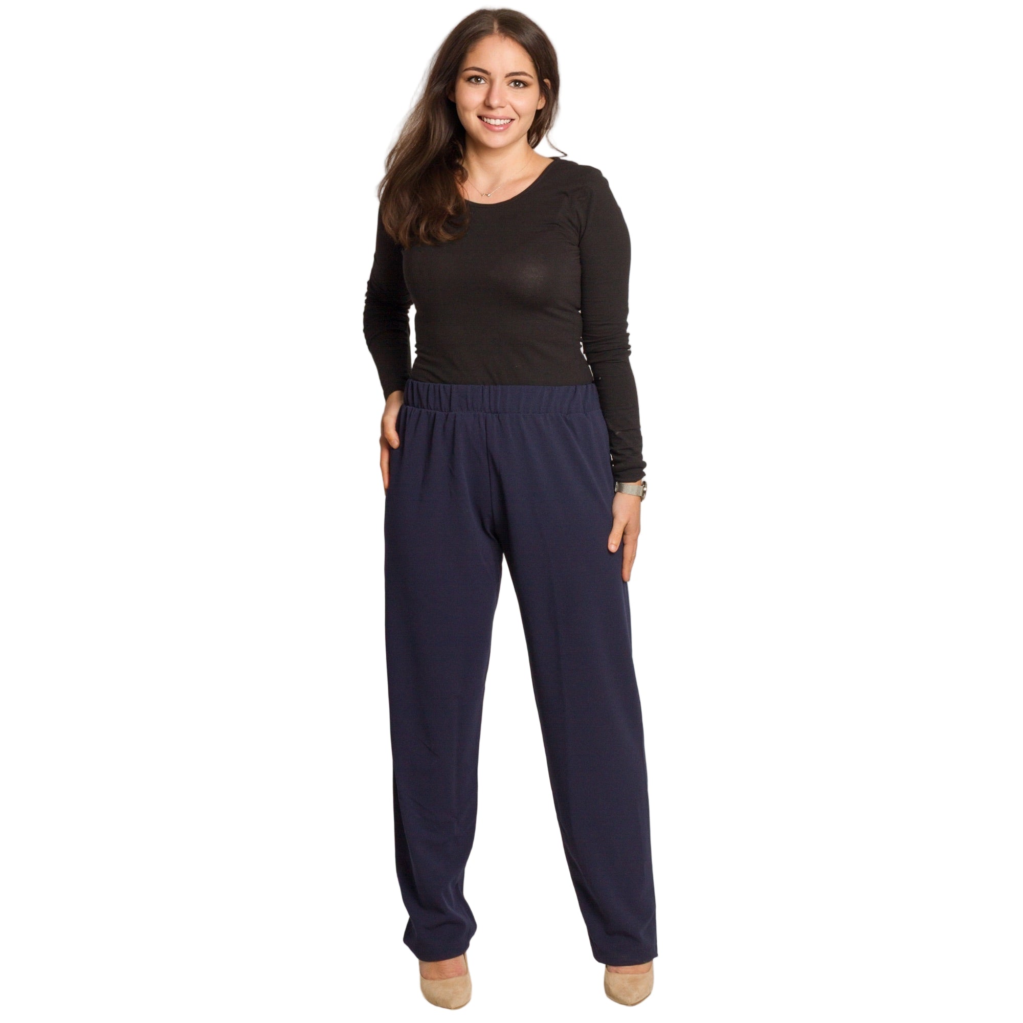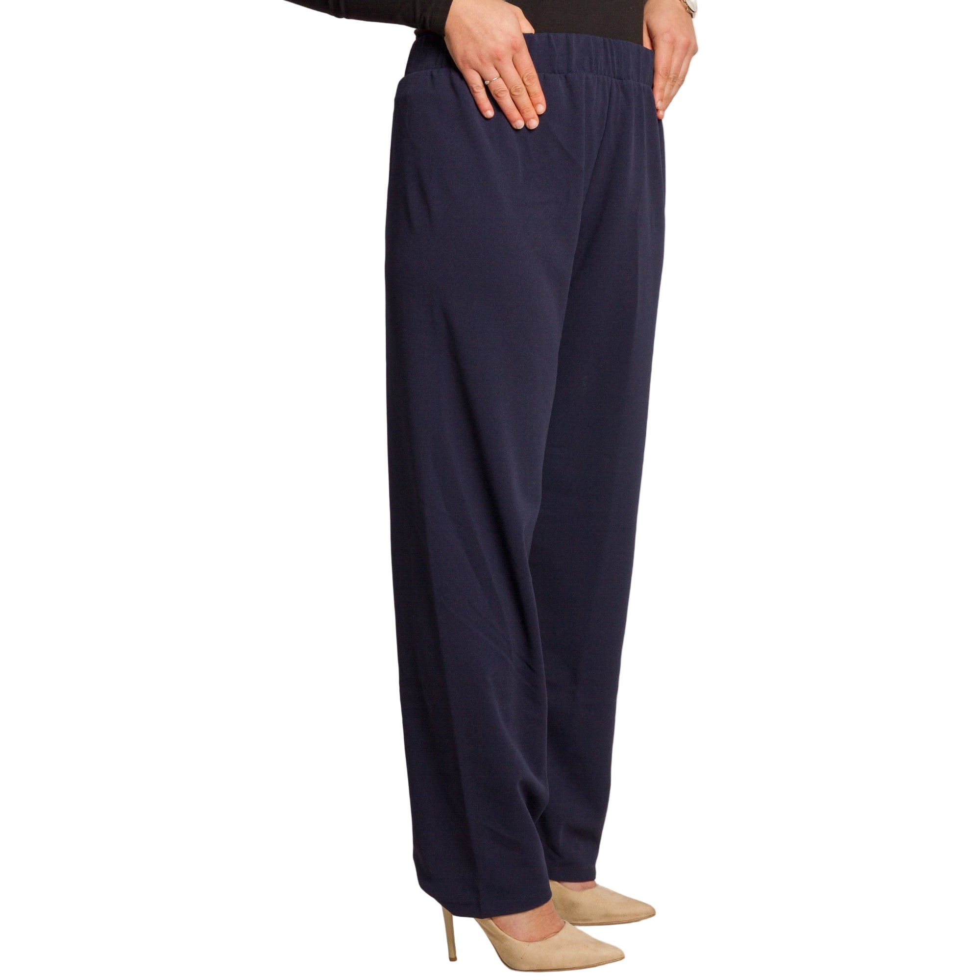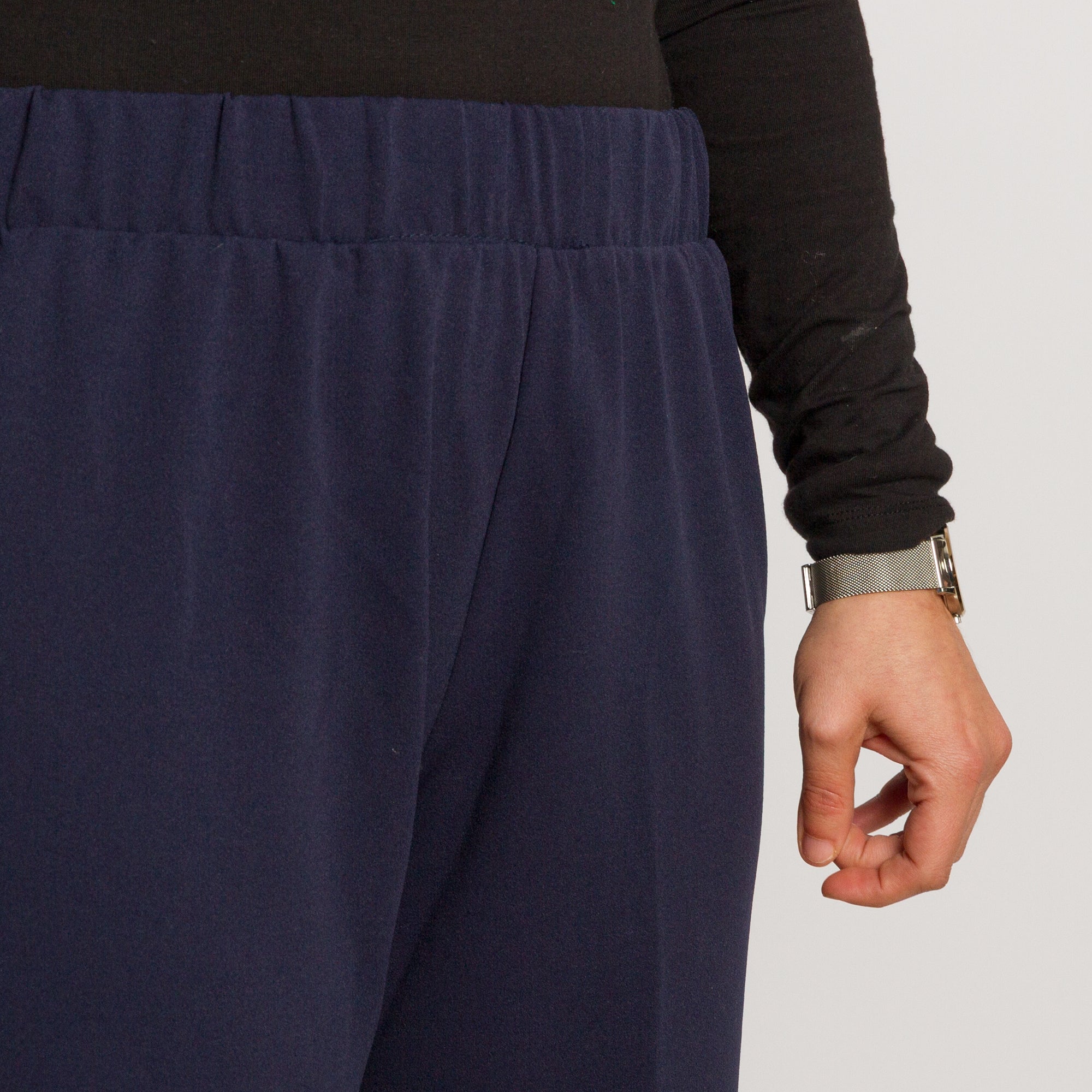Дамски панталон в тъмносин цвят, изработен от 95% Вискоза, 5% Еластан. Права кройка с ластик в кръста, еластична и приятна материя, осигуряваща удобство и стил. Идеален за носене през есенно-зимния сезон.