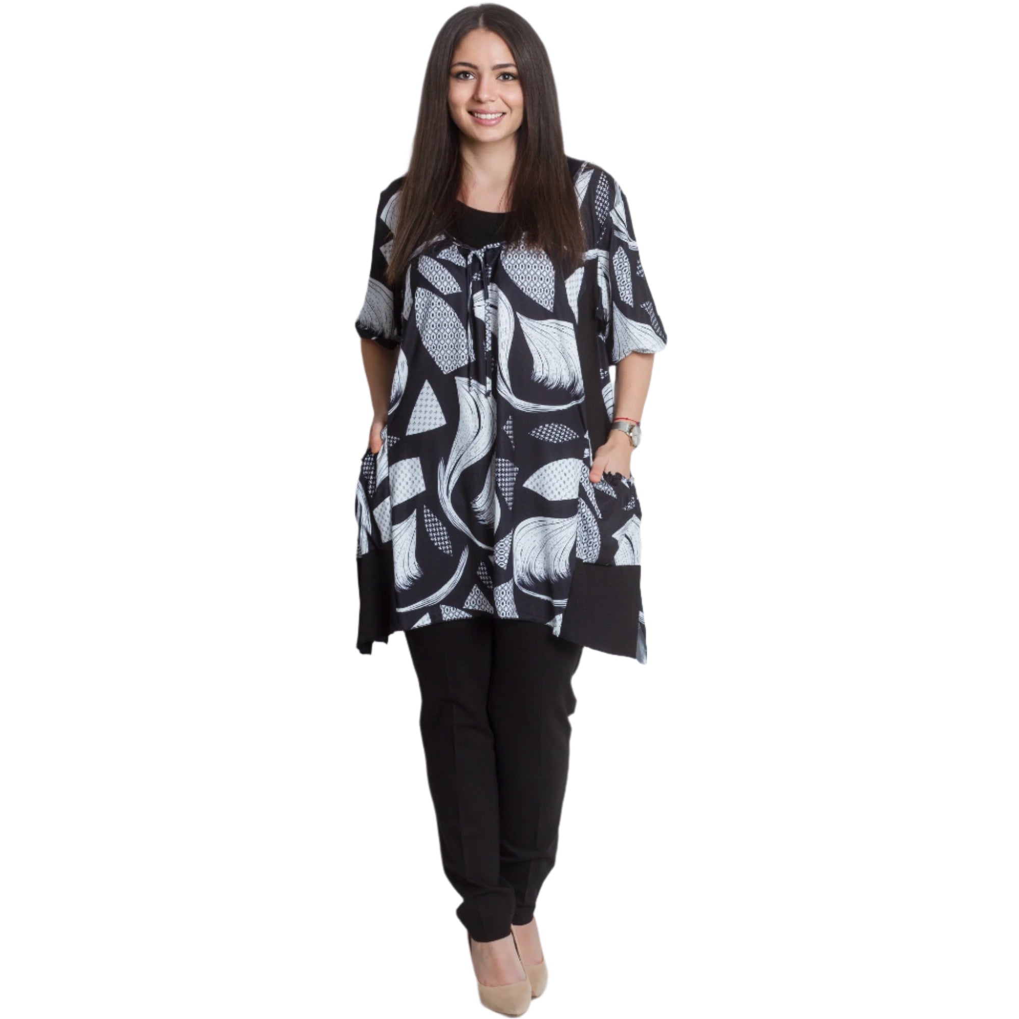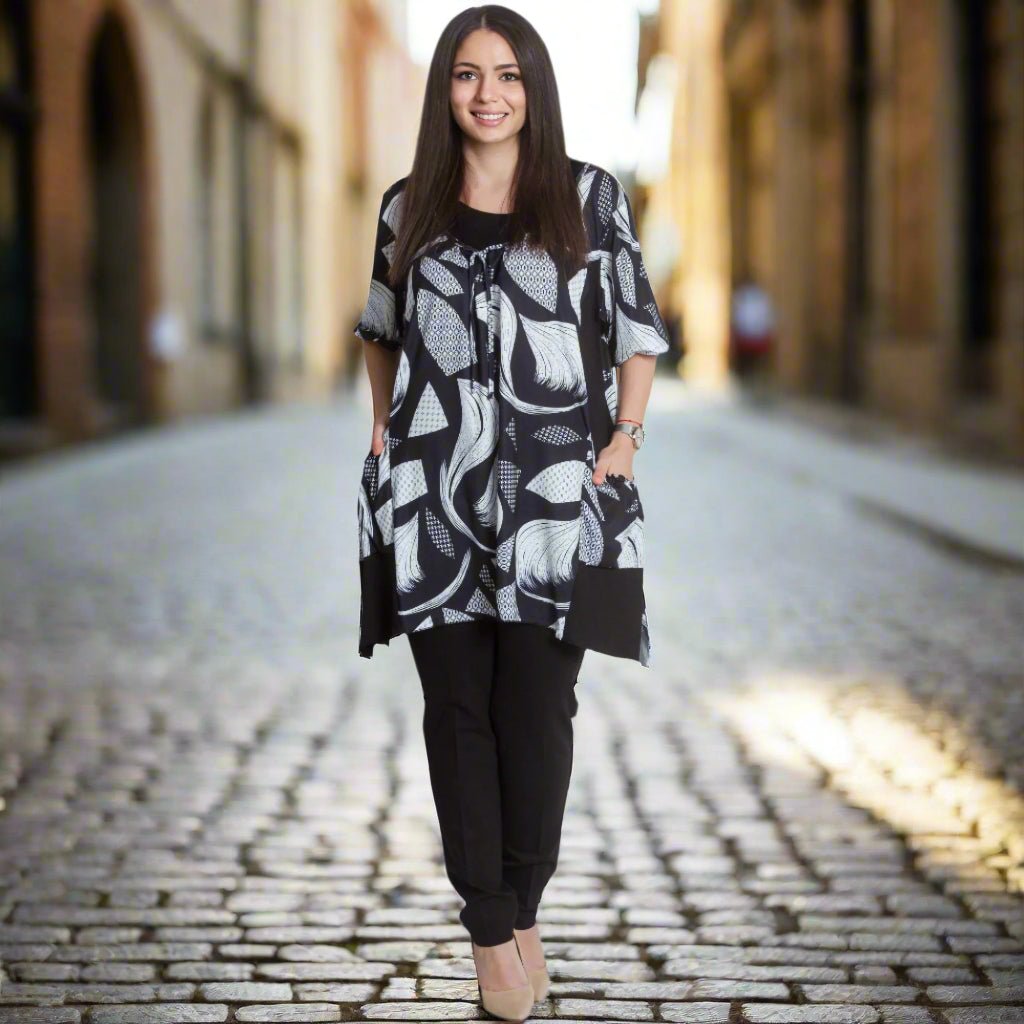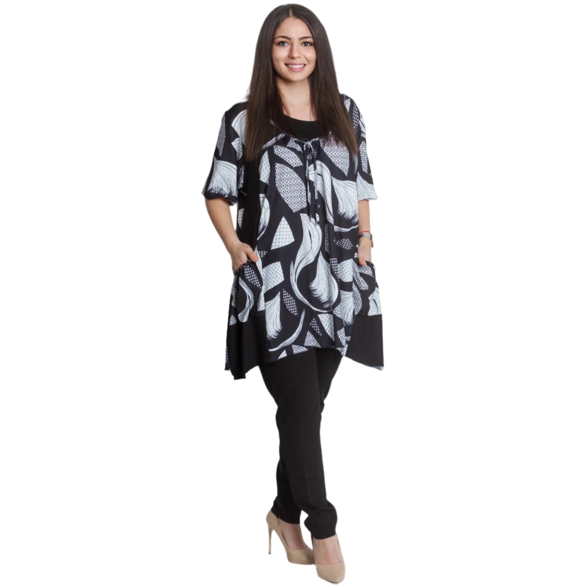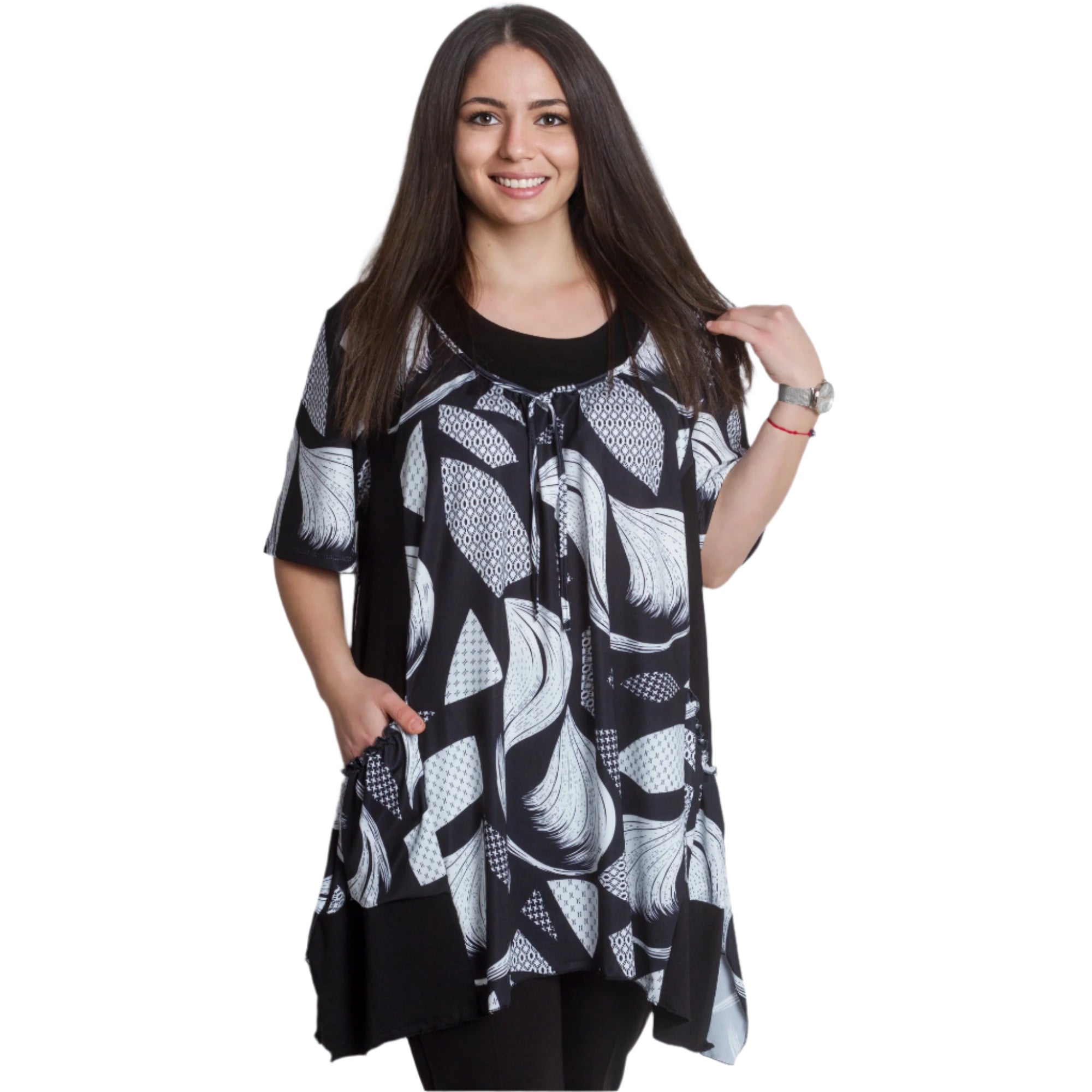 Разкроена дамска туника с абстрактен дизайн и практични джобчета. Изработена от 95% памук и 5% еластан, тази туника предлага комфорт и еластичност, подходяща за ежедневни поводи. С обло деколте и свежи цветове, тя е идеална за пролетно-летния сезон. Произведена в (ЕС), този модел комбинира стил и удобство, за да подчертае вашата индивидуалност.