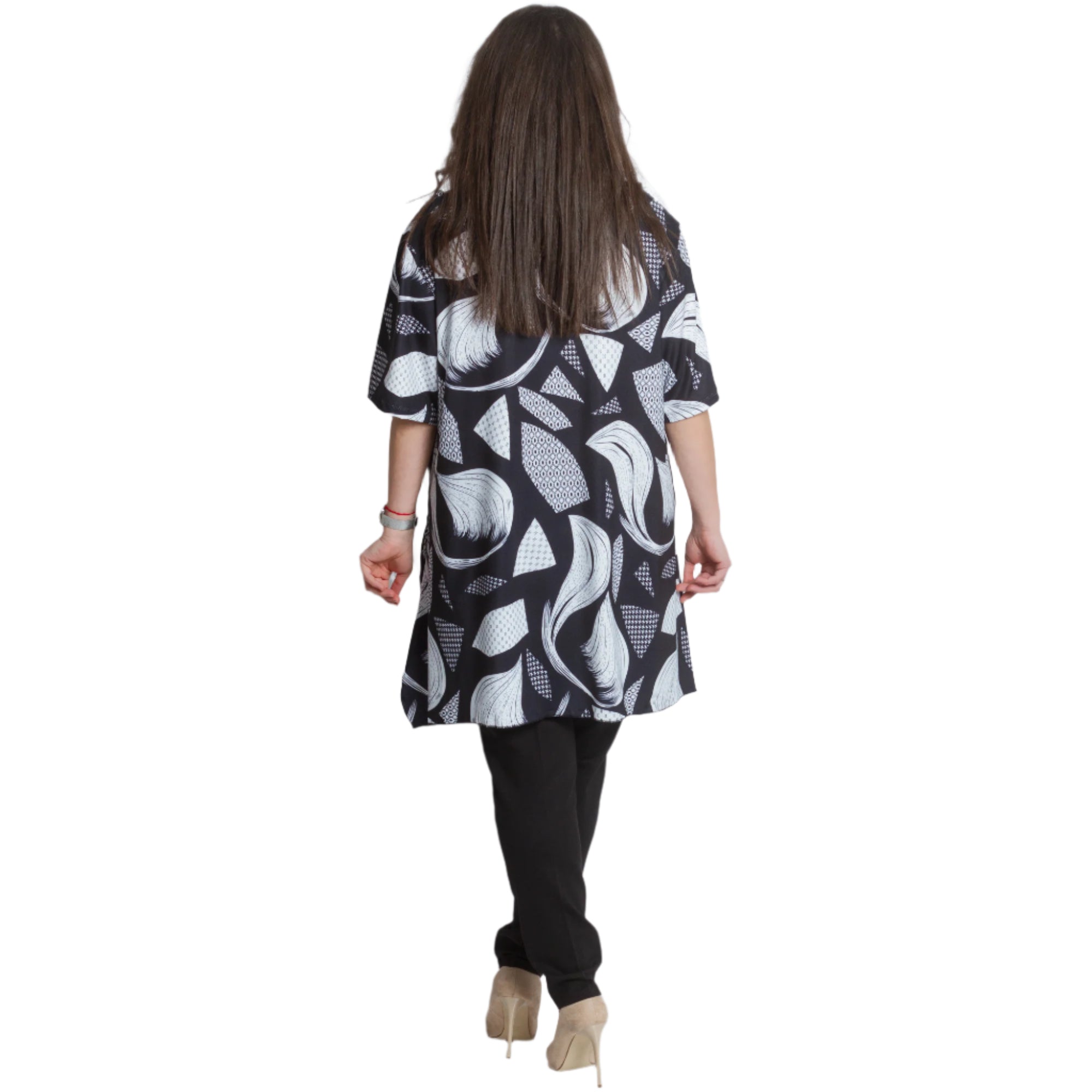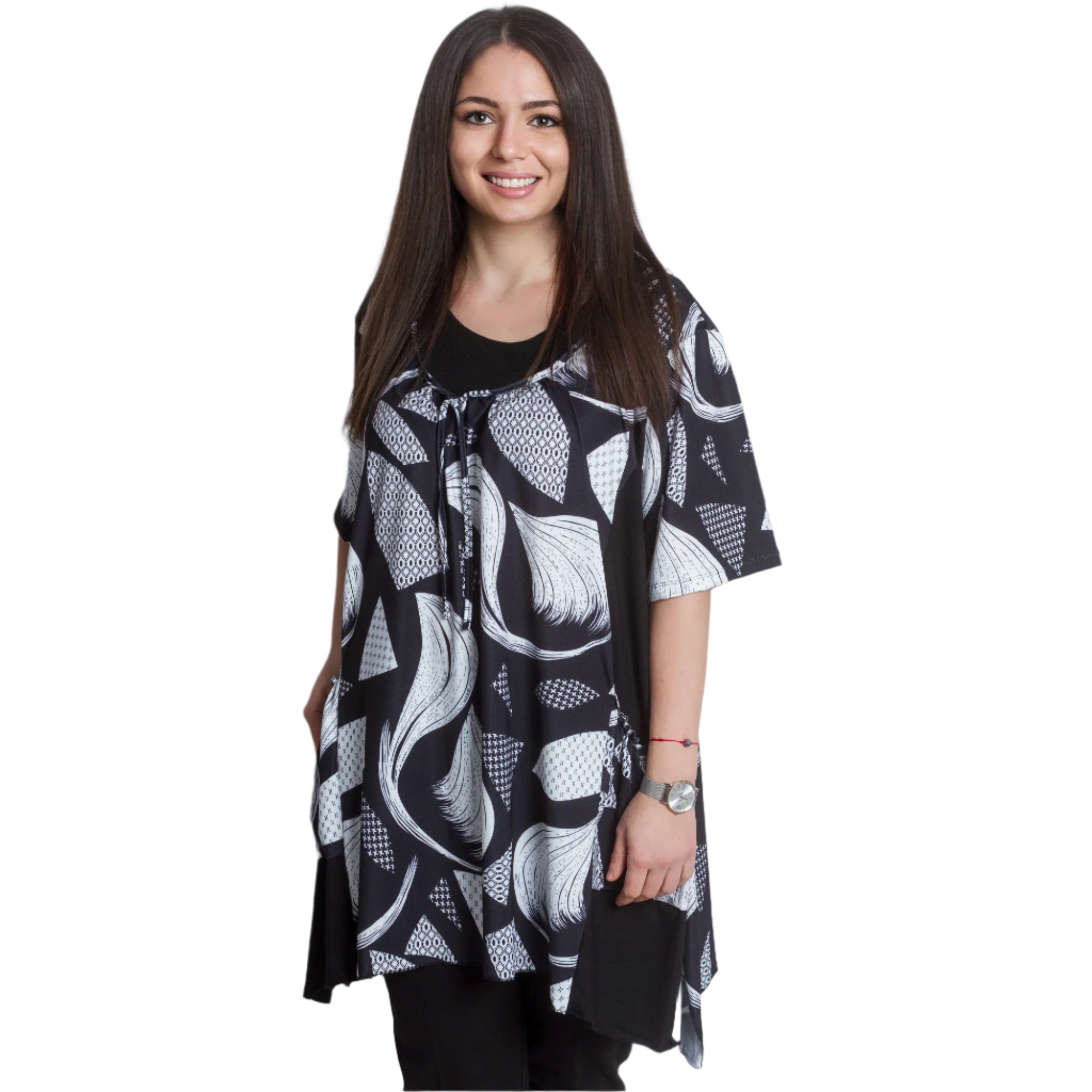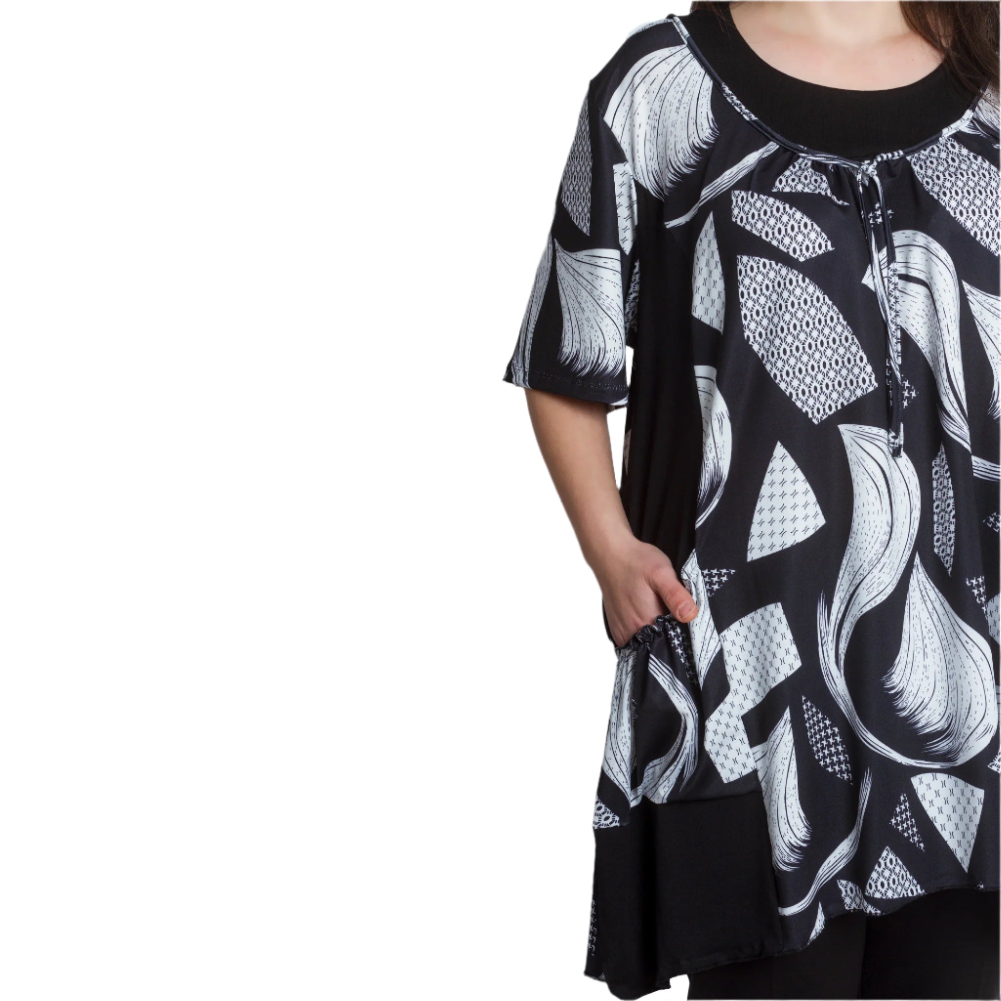 Разкроена дамска туника с абстрактен дизайн и практични джобчета. Изработена от 95% памук и 5% еластан, тази туника предлага комфорт и еластичност, подходяща за ежедневни поводи. С обло деколте и свежи цветове, тя е идеална за пролетно-летния сезон. Произведена в (ЕС), този модел комбинира стил и удобство, за да подчертае вашата индивидуалност.