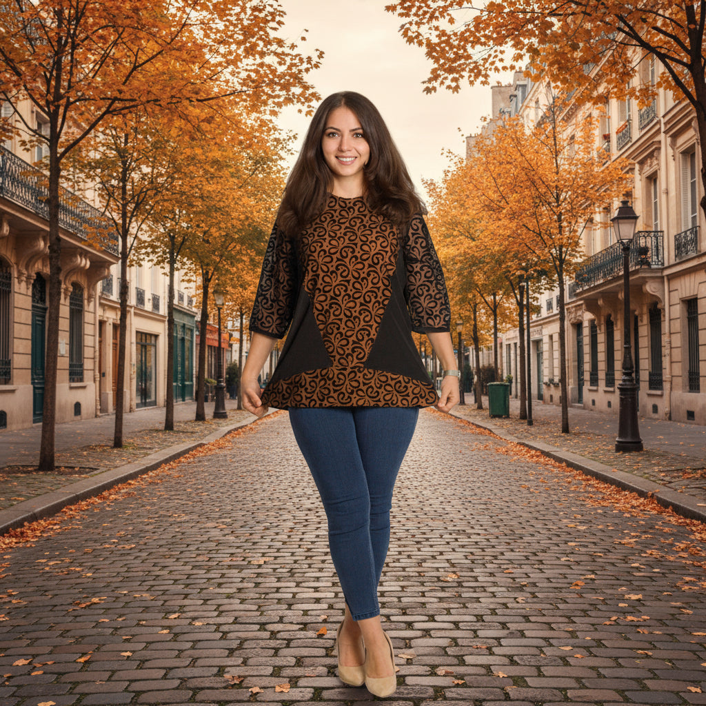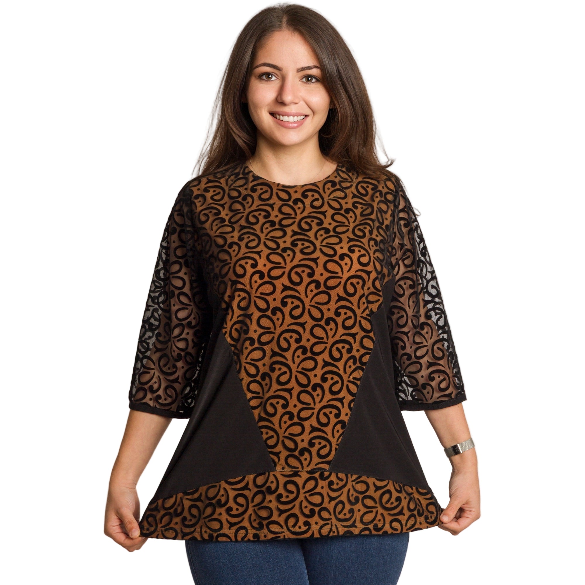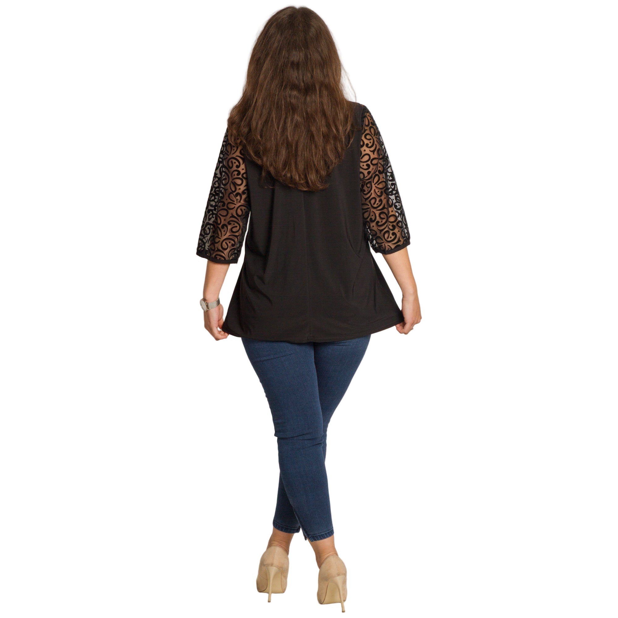 Елегантна официална туника с тюл и 3/4 ръкави, подходяща за специални поводи. Правата кройка и фината материя осигуряват комфорт и стил, а облото деколте допълва изискания вид. Изработена от 70% полиамид, 25% полиестер и 5% еластан.