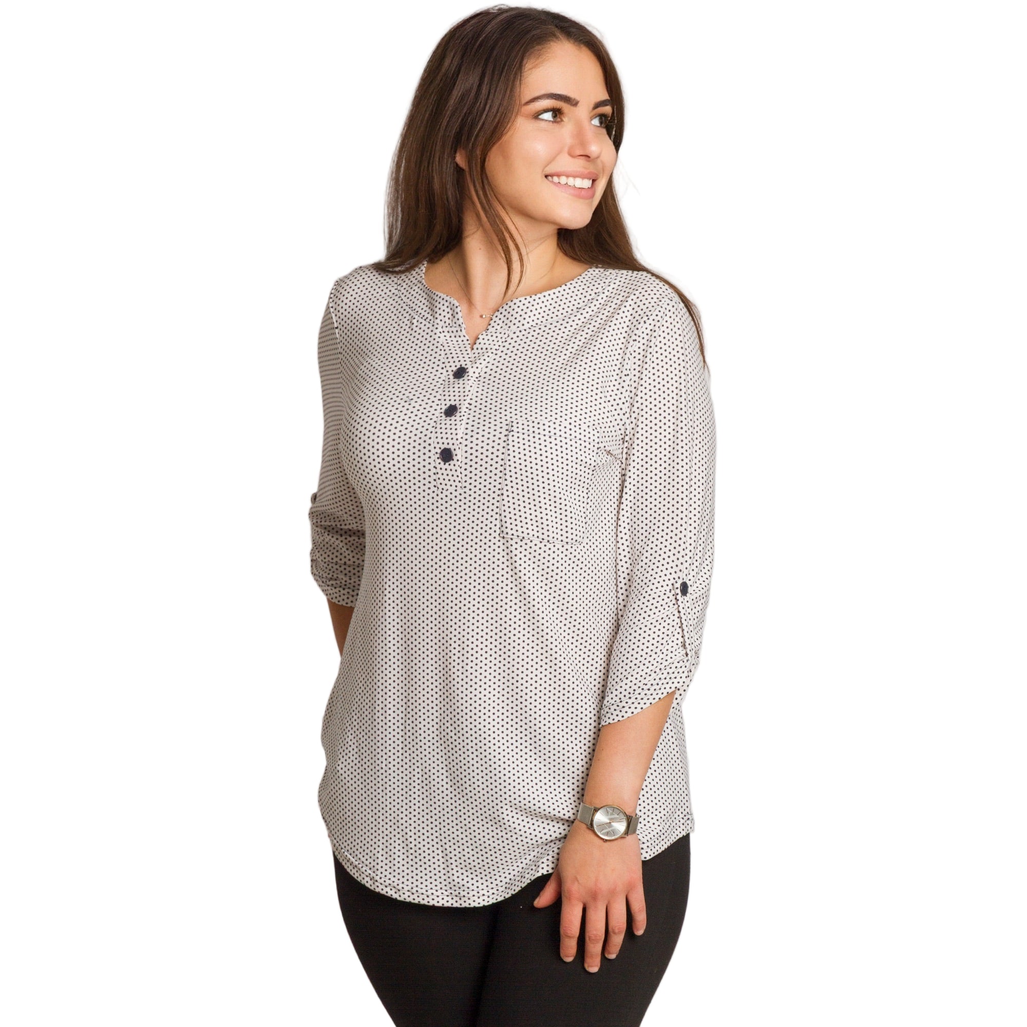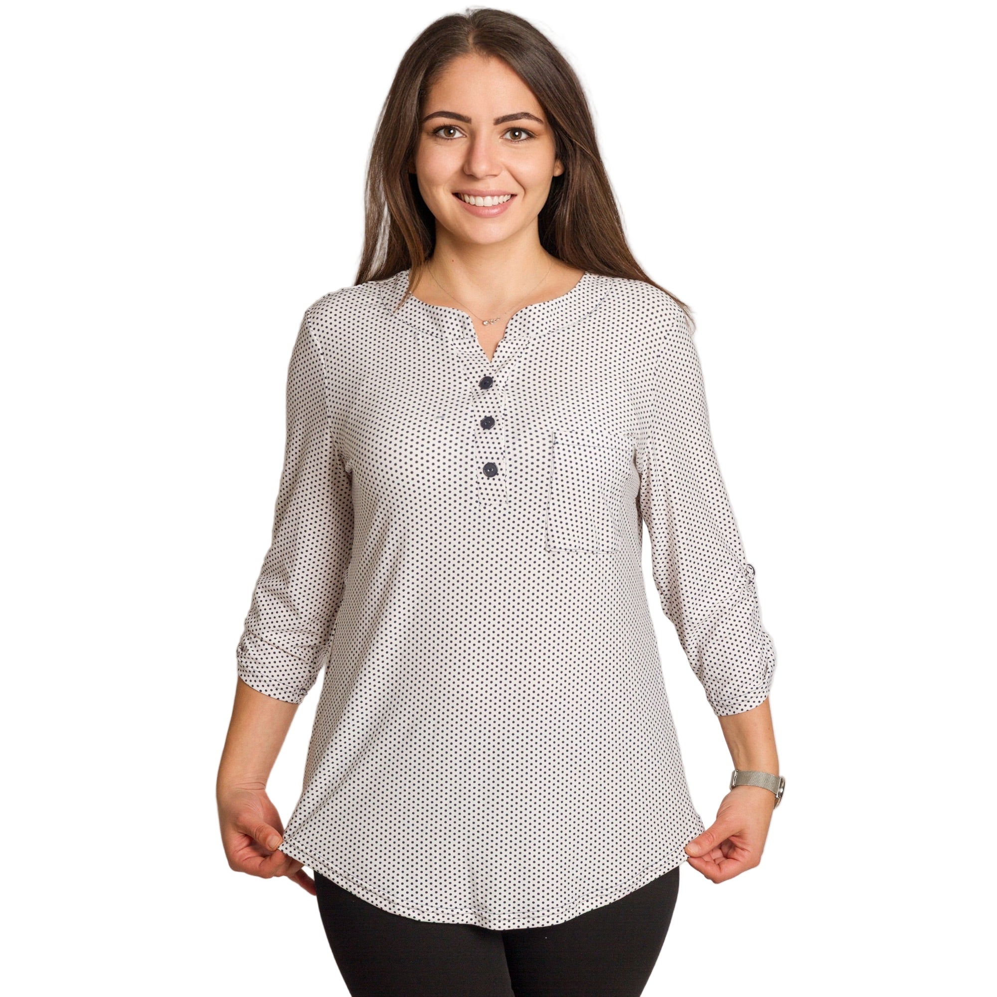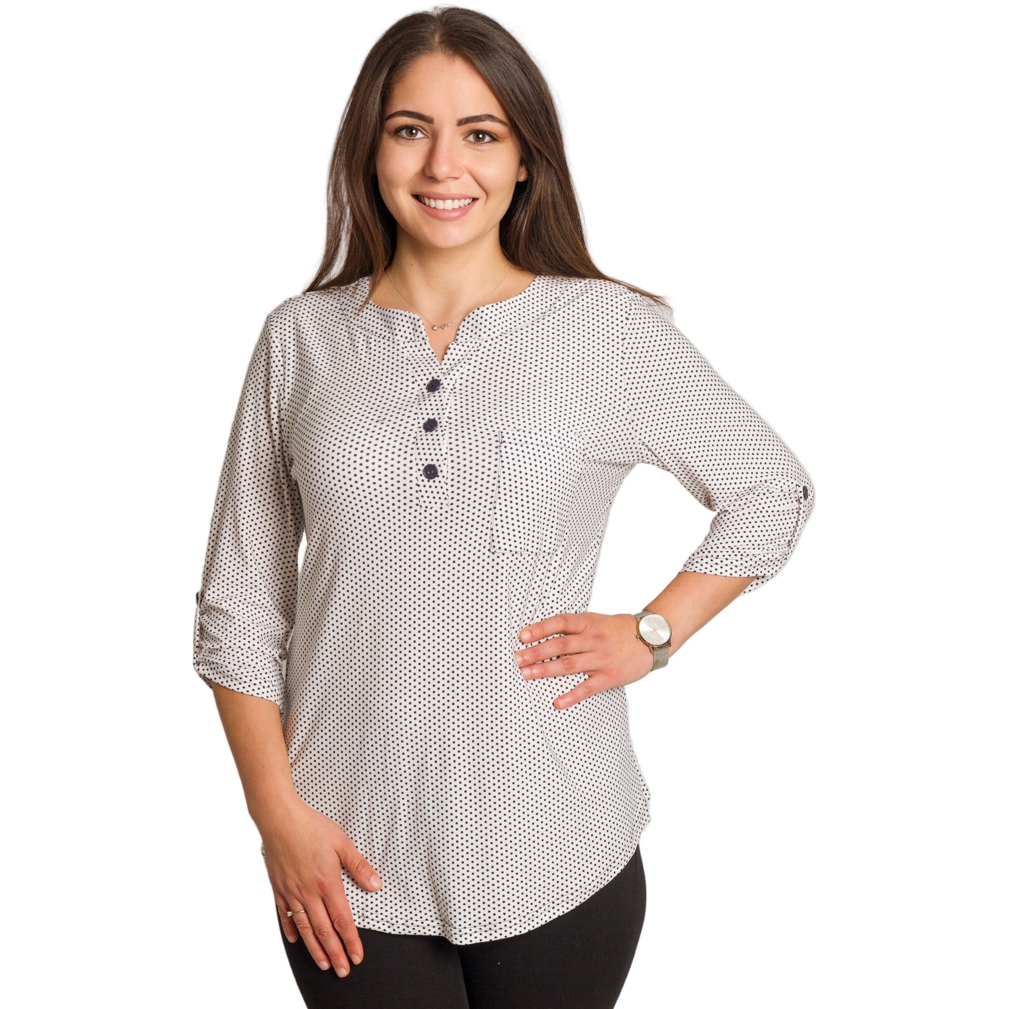 Бяла дамска риза с фин черен точков десен, която комбинира елегантност и удобство. Моделът е с права кройка, обло деколте с малка V-образна изрезка и декоративни копчета. Изработена от лека и приятна на допир материя, тази риза е идеален избор както за ежедневието, така и за по-специални поводи. Ръкавите са с дължина 3/4 и могат да се навиват, фиксирани с копче.