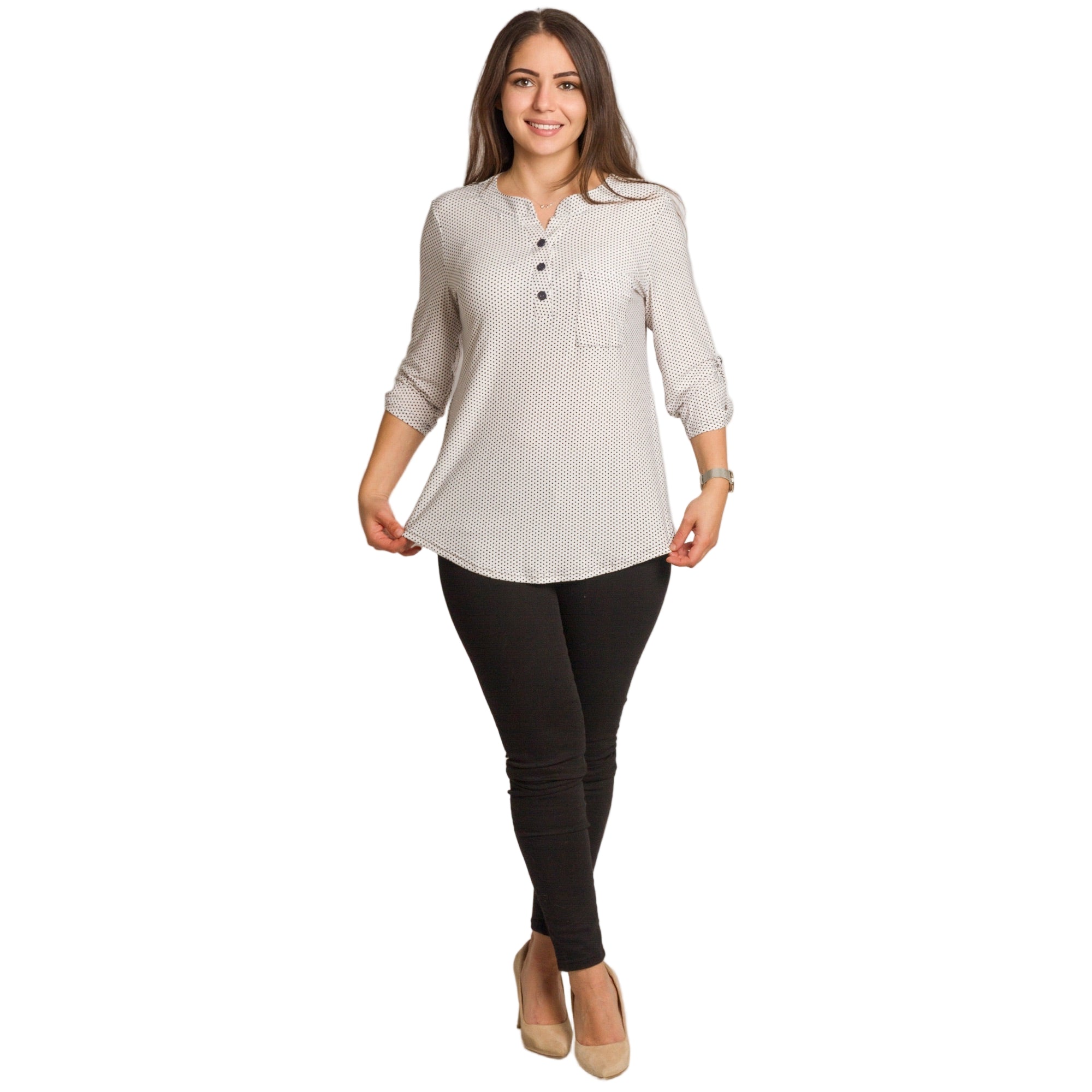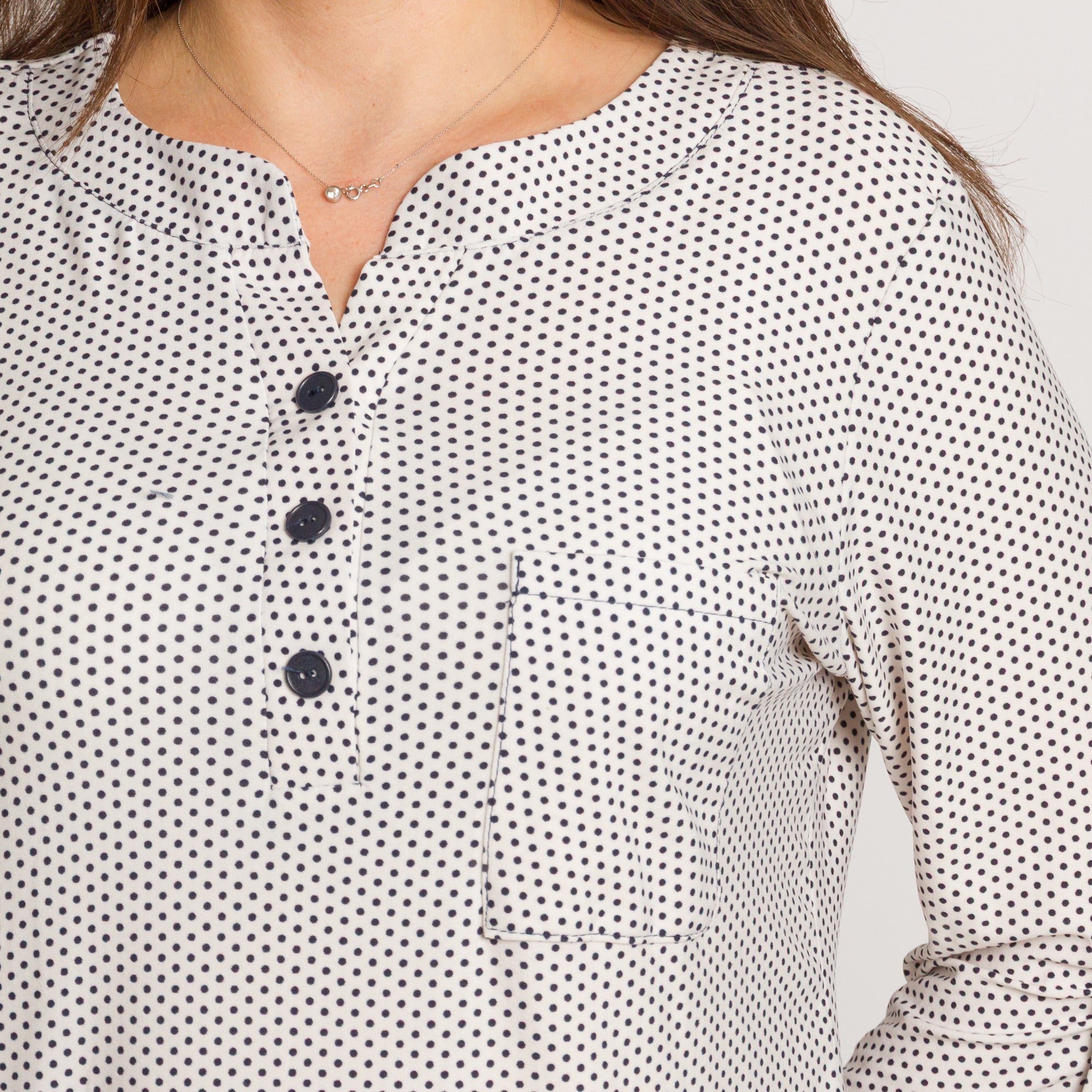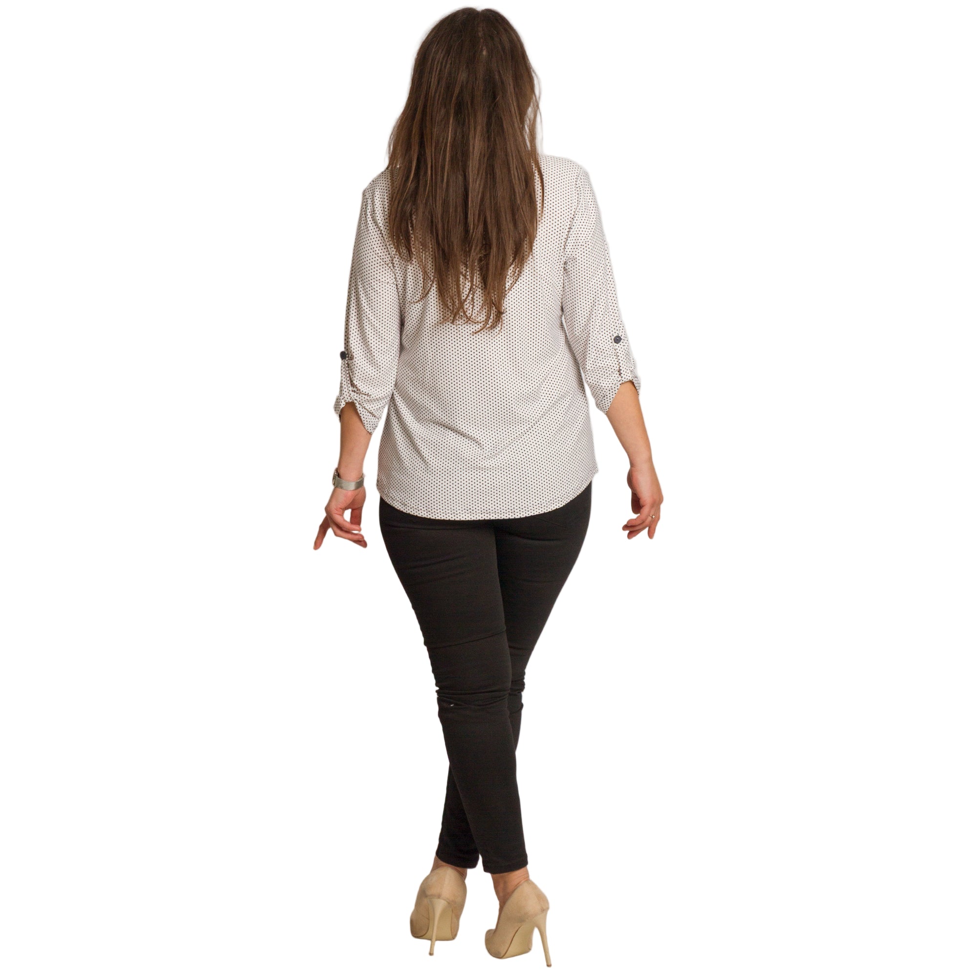 Бяла дамска риза с фин черен точков десен, която комбинира елегантност и удобство. Моделът е с права кройка, обло деколте с малка V-образна изрезка и декоративни копчета. Изработена от лека и приятна на допир материя, тази риза е идеален избор както за ежедневието, така и за по-специални поводи. Ръкавите са с дължина 3/4 и могат да се навиват, фиксирани с копче.