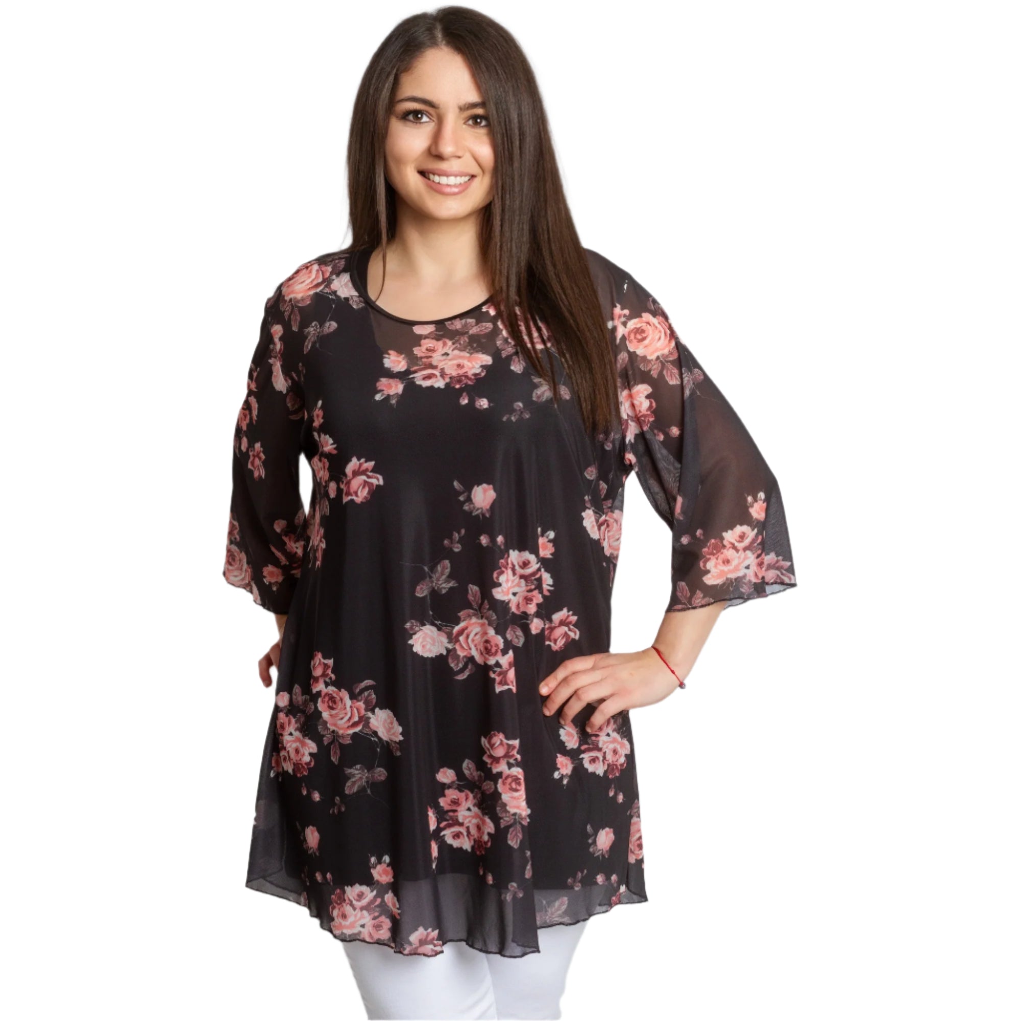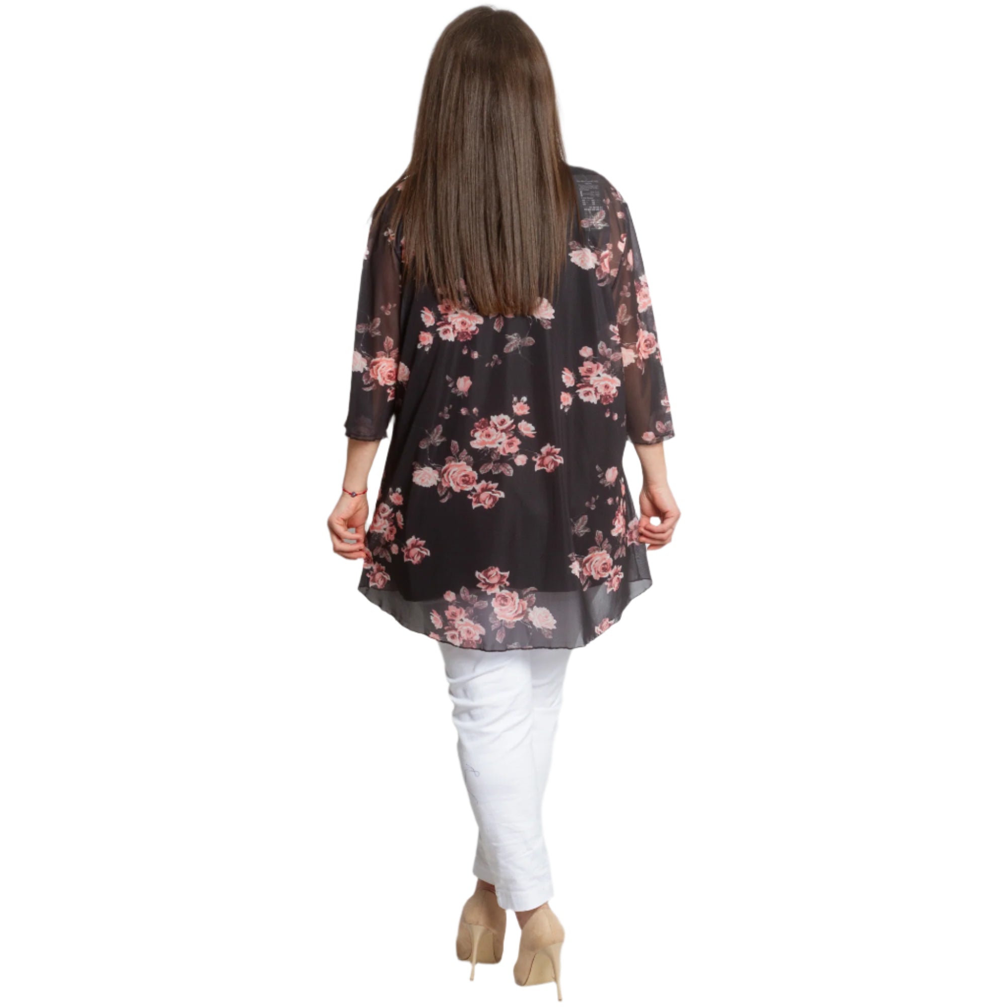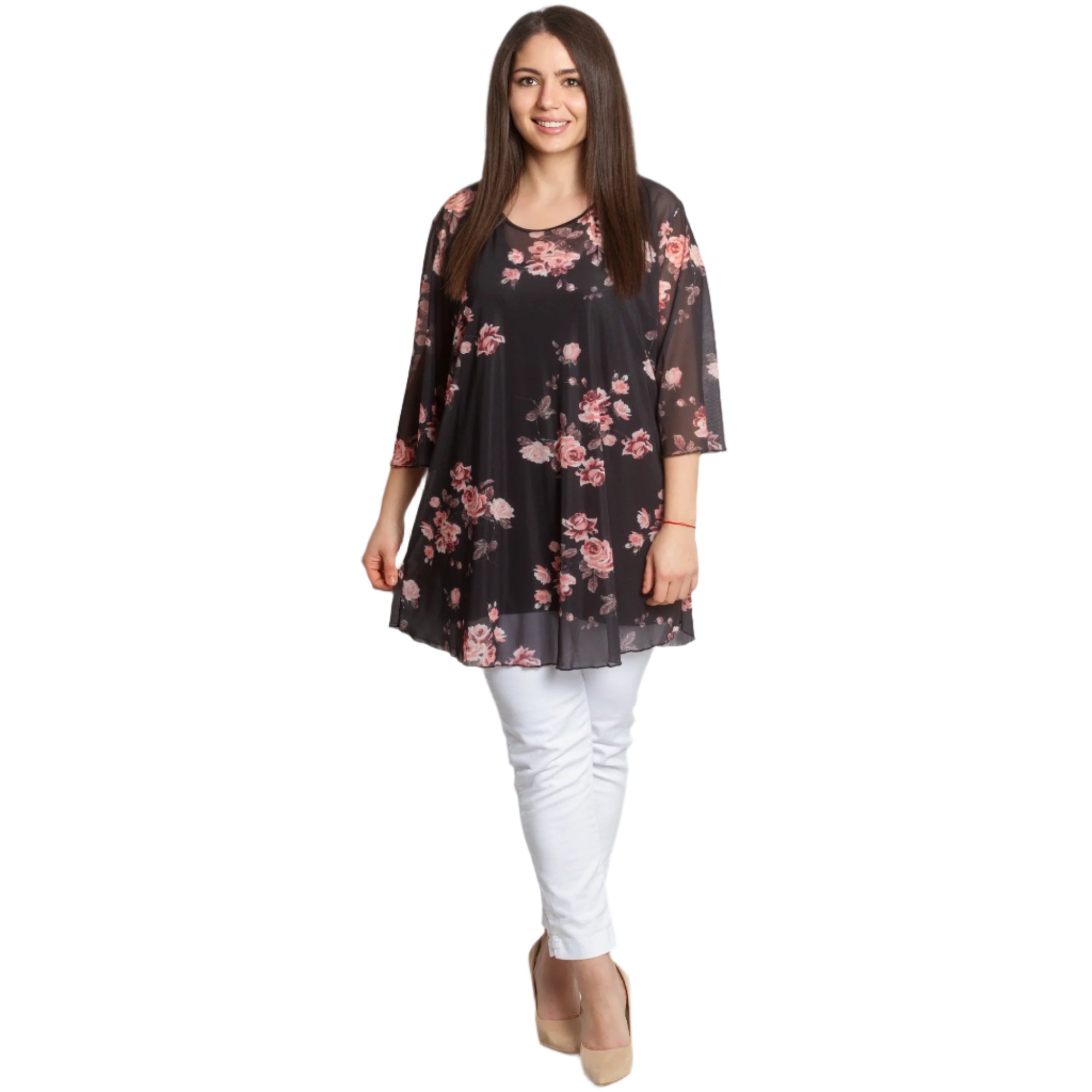 Шифонена черна макси туника, украсена с нежни флорални мотиви в розови нюанси. Изработена от 95% вискоза и 5% еластан, тази туника е изключително мека и приятна на допир. Прозрачните ръкави придават допълнителна елегантност, а свободната кройка осигурява комфорт през целия ден. Подходяща както за официални събития, така и за ежедневието.