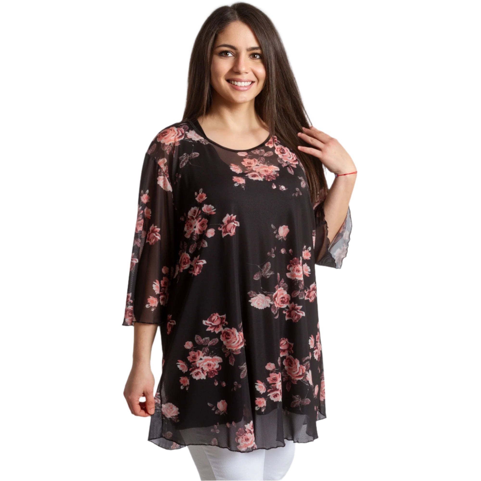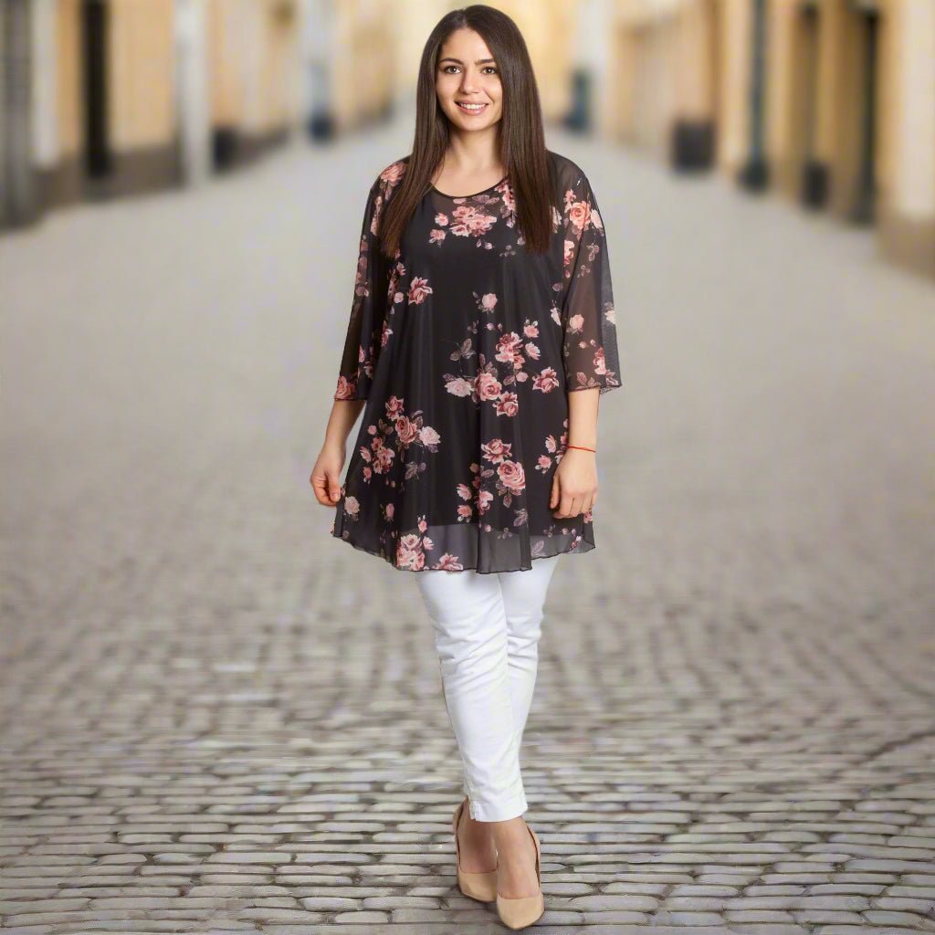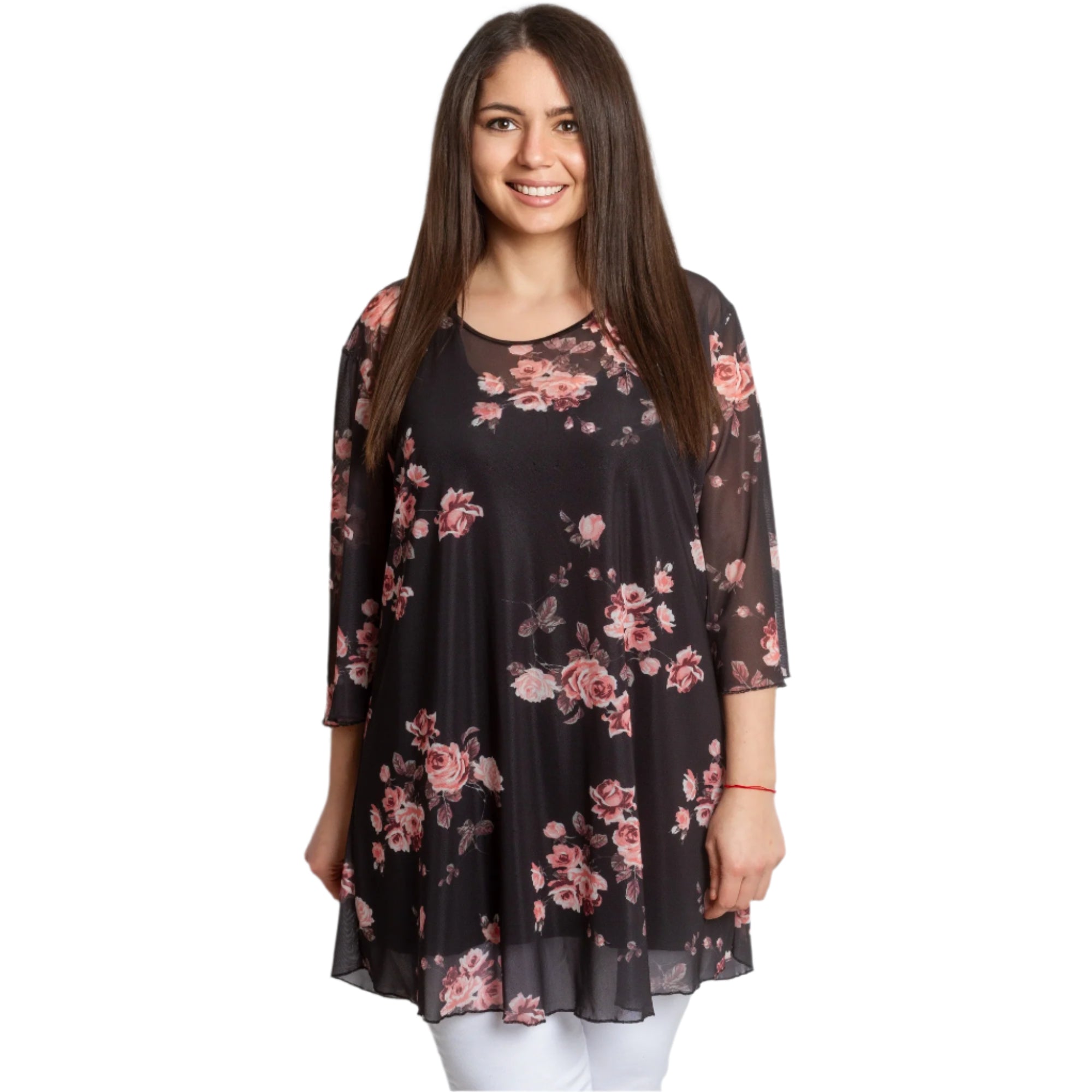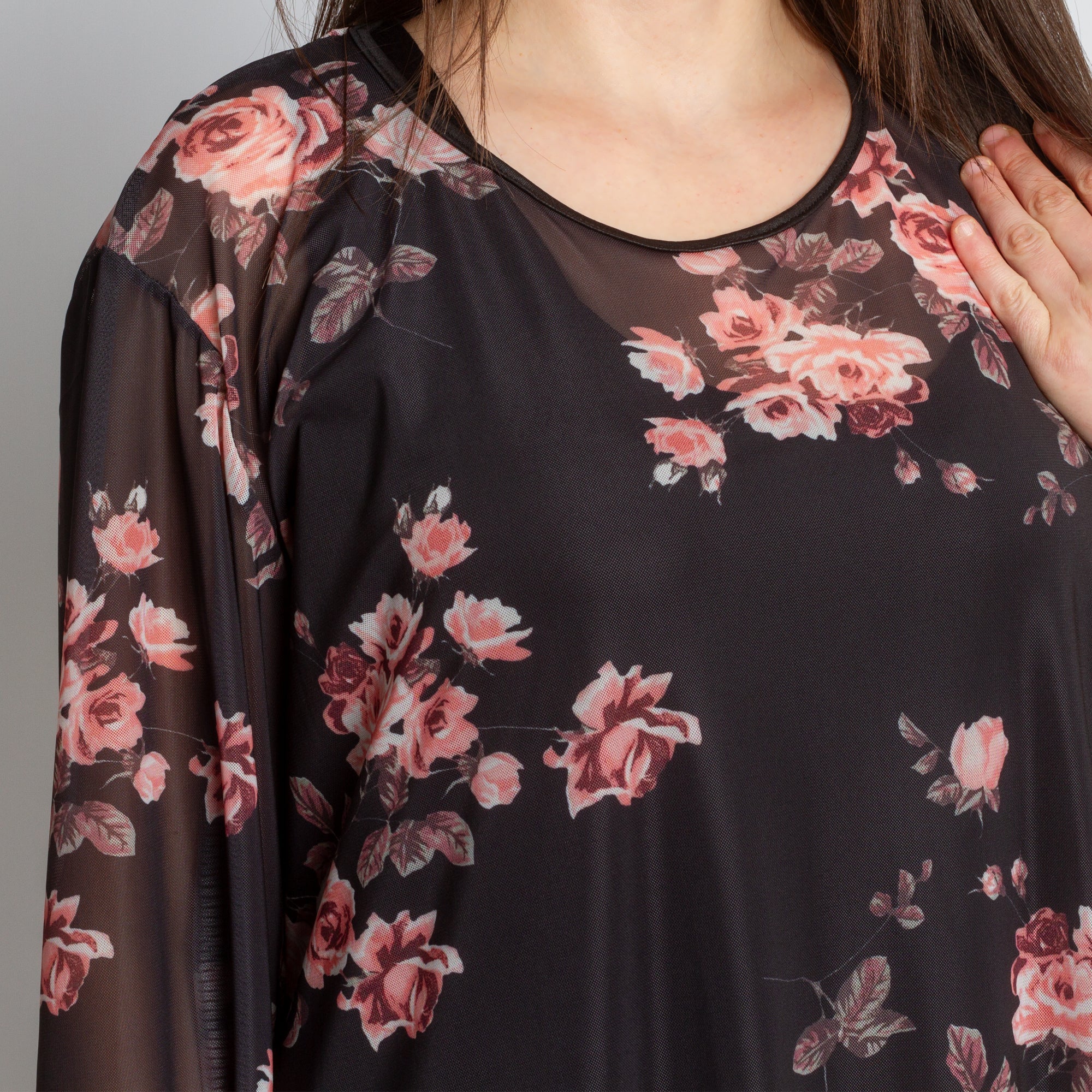 Шифонена черна макси туника, украсена с нежни флорални мотиви в розови нюанси. Изработена от 95% вискоза и 5% еластан, тази туника е изключително мека и приятна на допир. Прозрачните ръкави придават допълнителна елегантност, а свободната кройка осигурява комфорт през целия ден. Подходяща както за официални събития, така и за ежедневието.