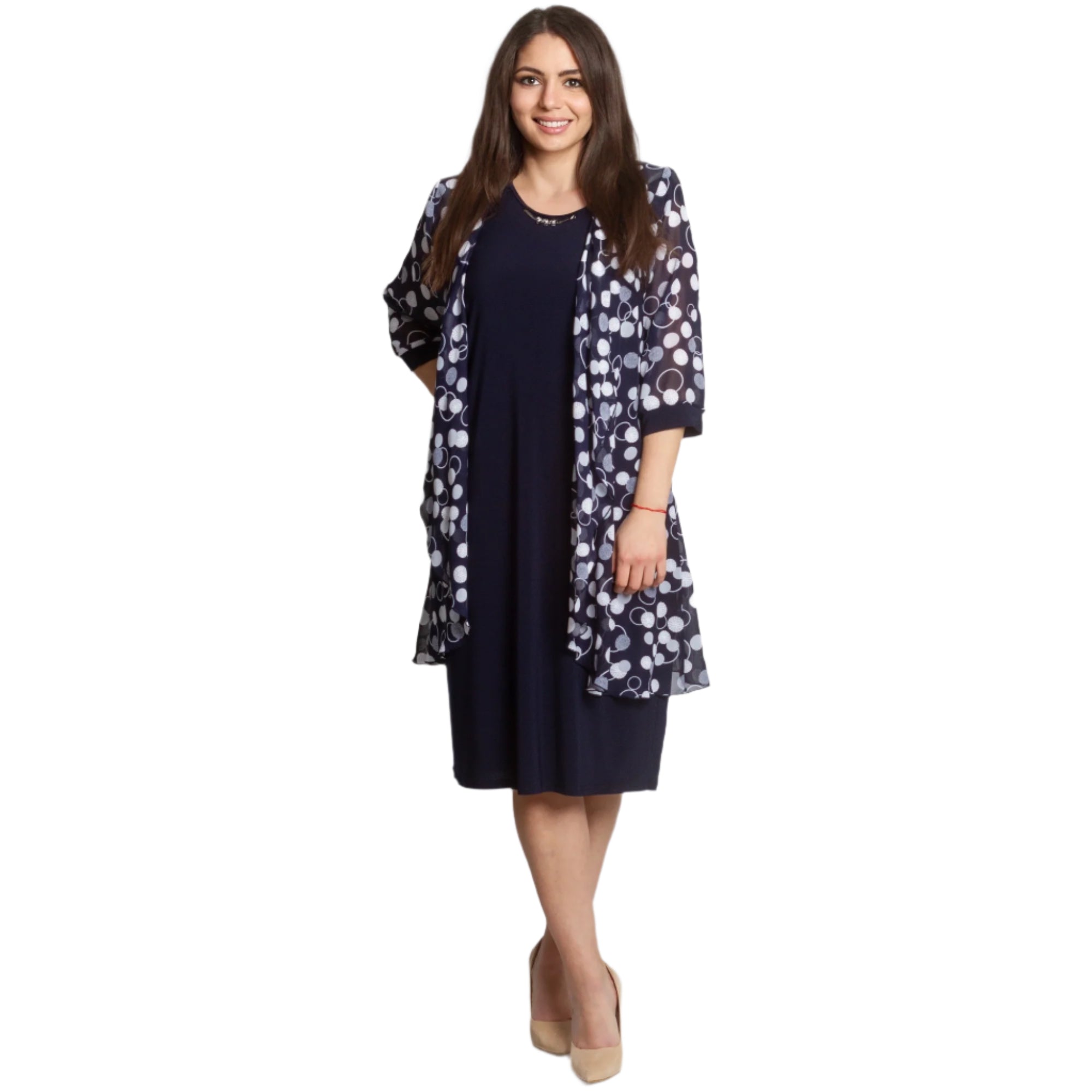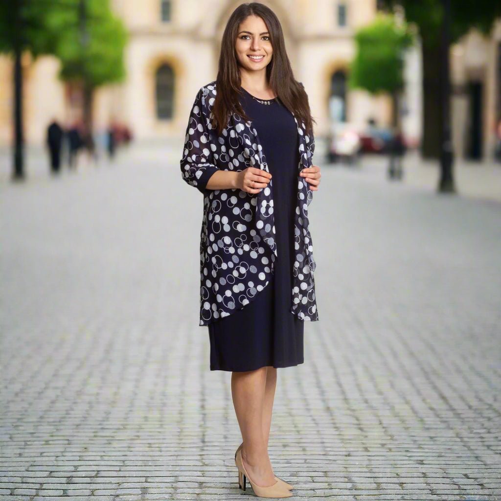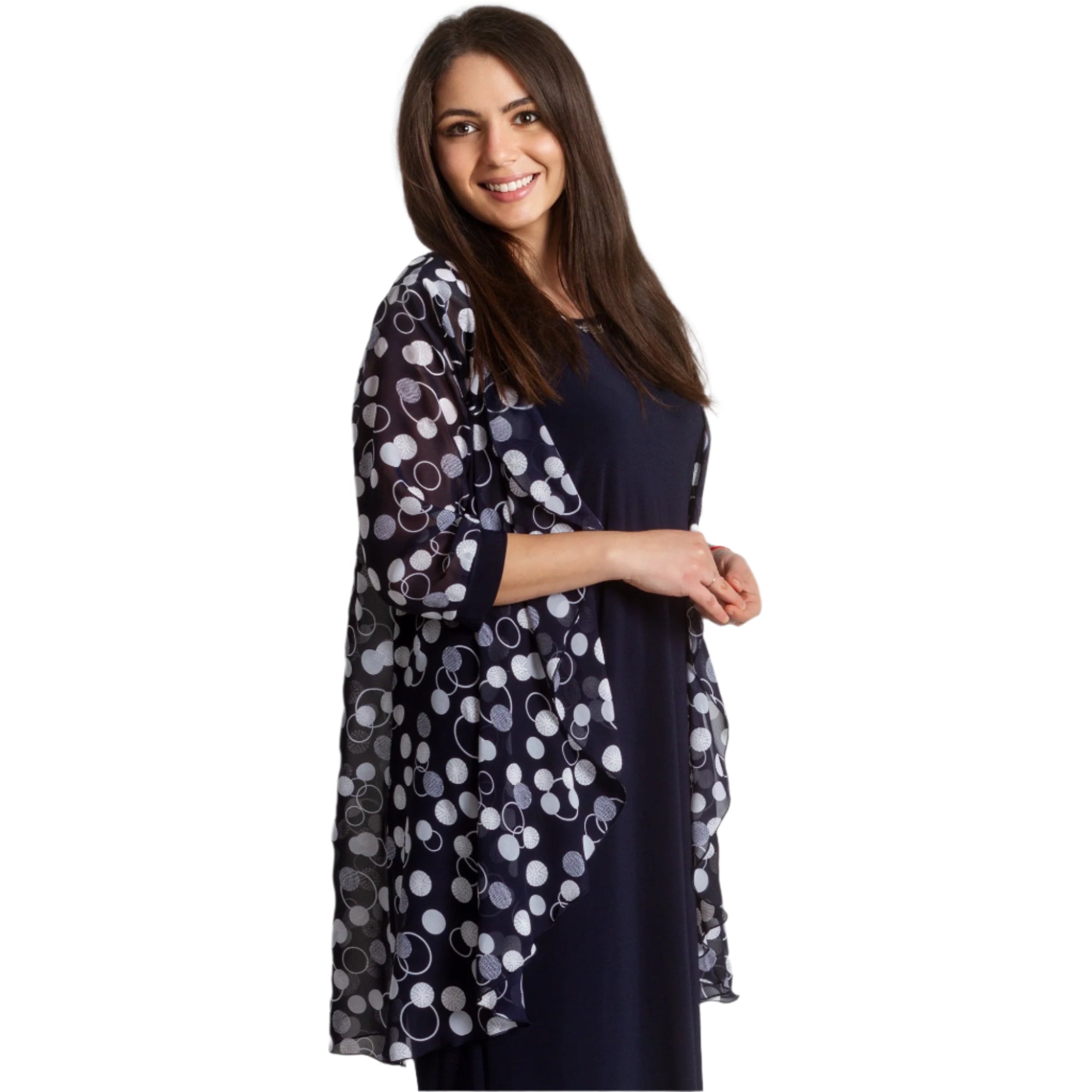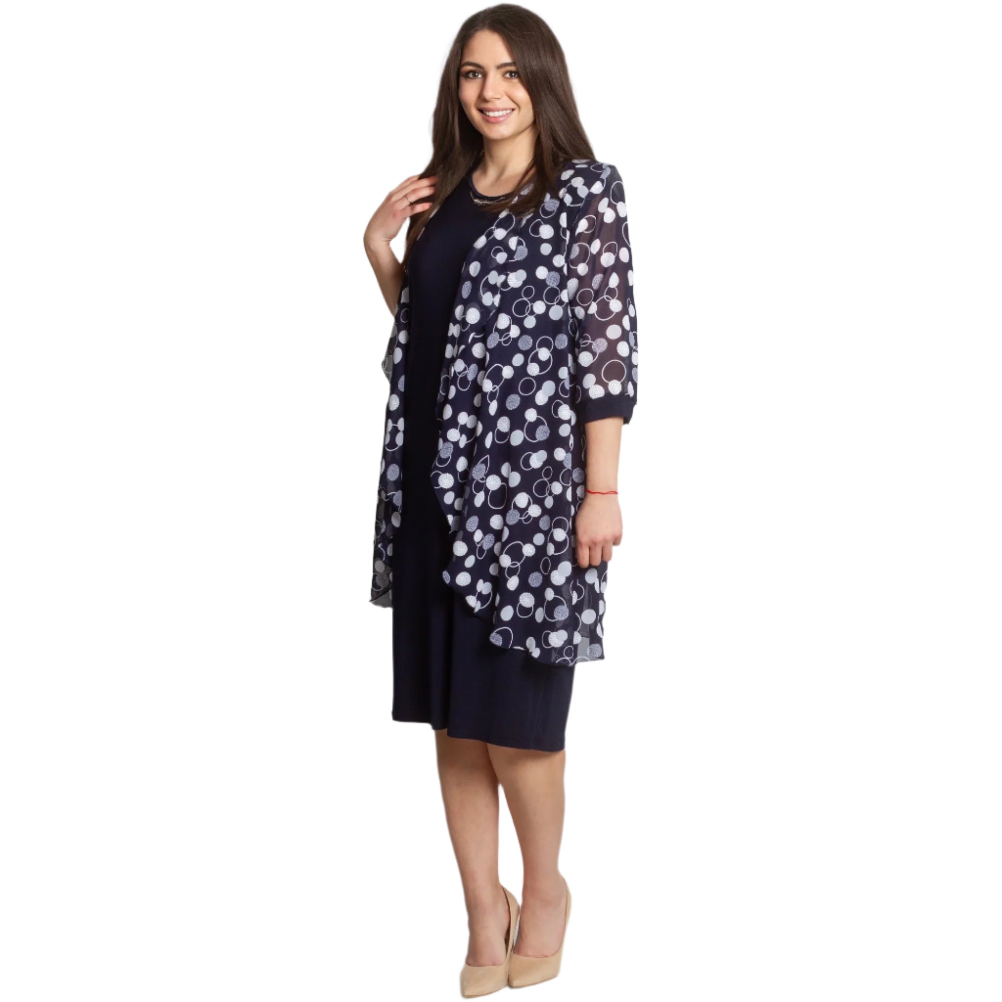 Официална рокля с шифонено наметало, идеална за стилни дами, които търсят изисканост и комфорт. Комплектът включва права рокля с дебели презрамки и стилно наметало от шифон. Дизайнът комбинира изчистена основна рокля с ефирно наметало, украсено с красиви кръгови мотиви. Роклята е с елегантно кръгло деколте, допълнено с дискретна декорация. Изработена от висококачествени материи, осигурява удобство и стил за всякакви официални поводи.