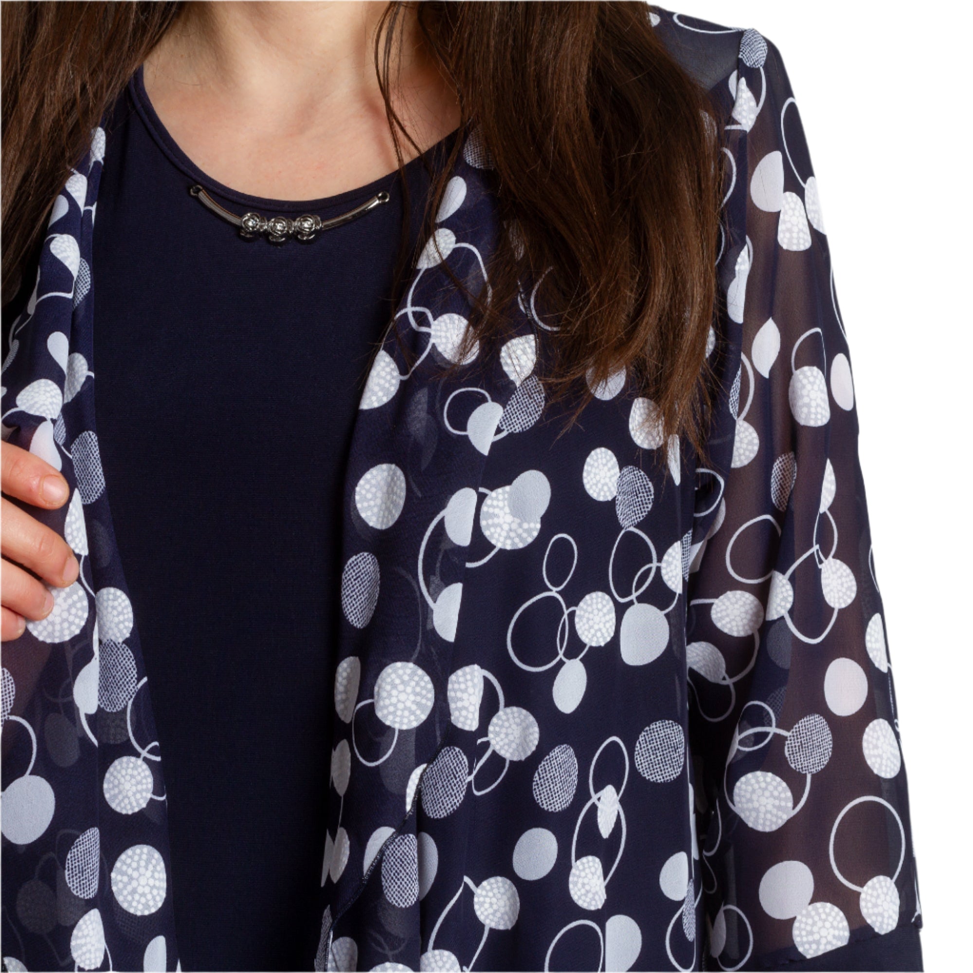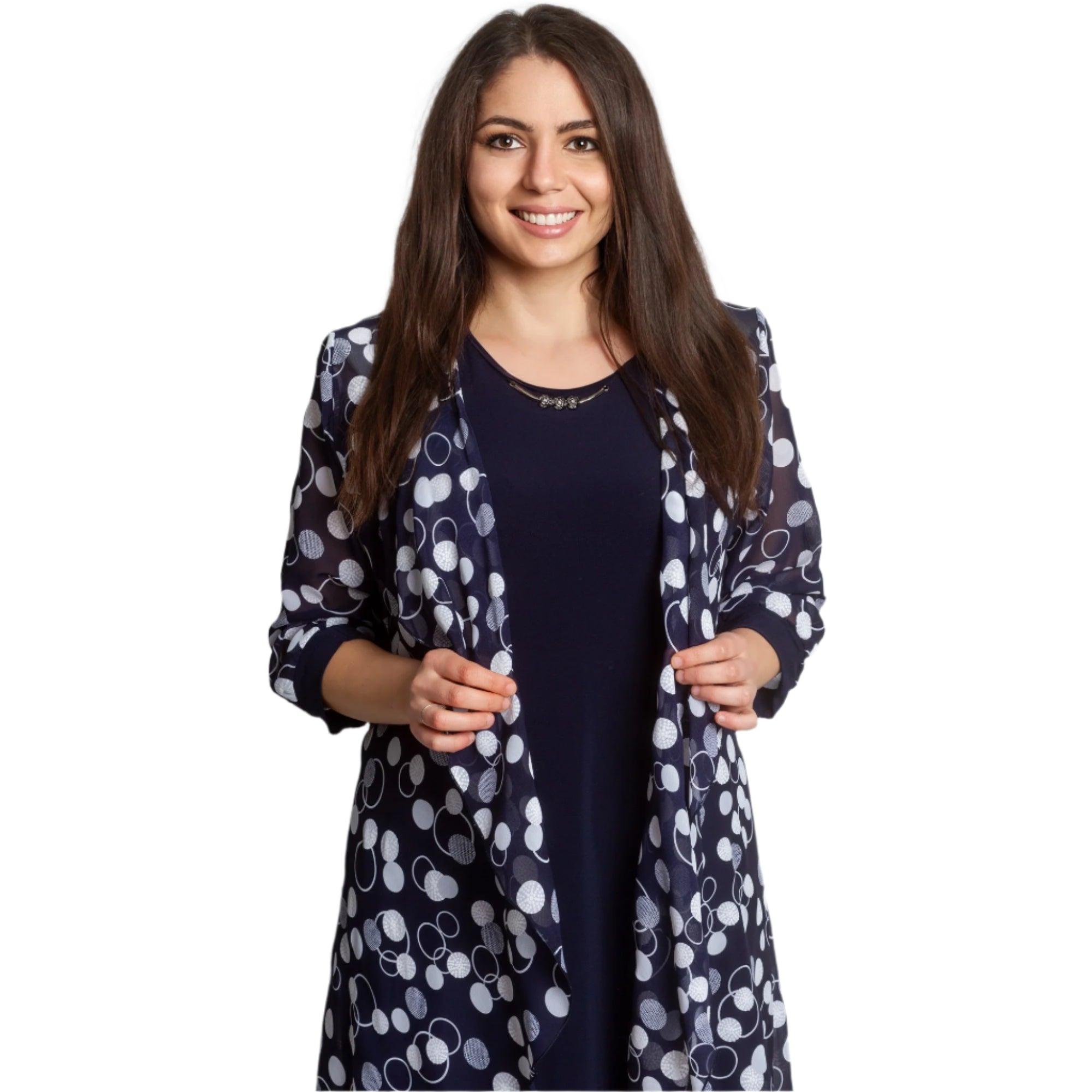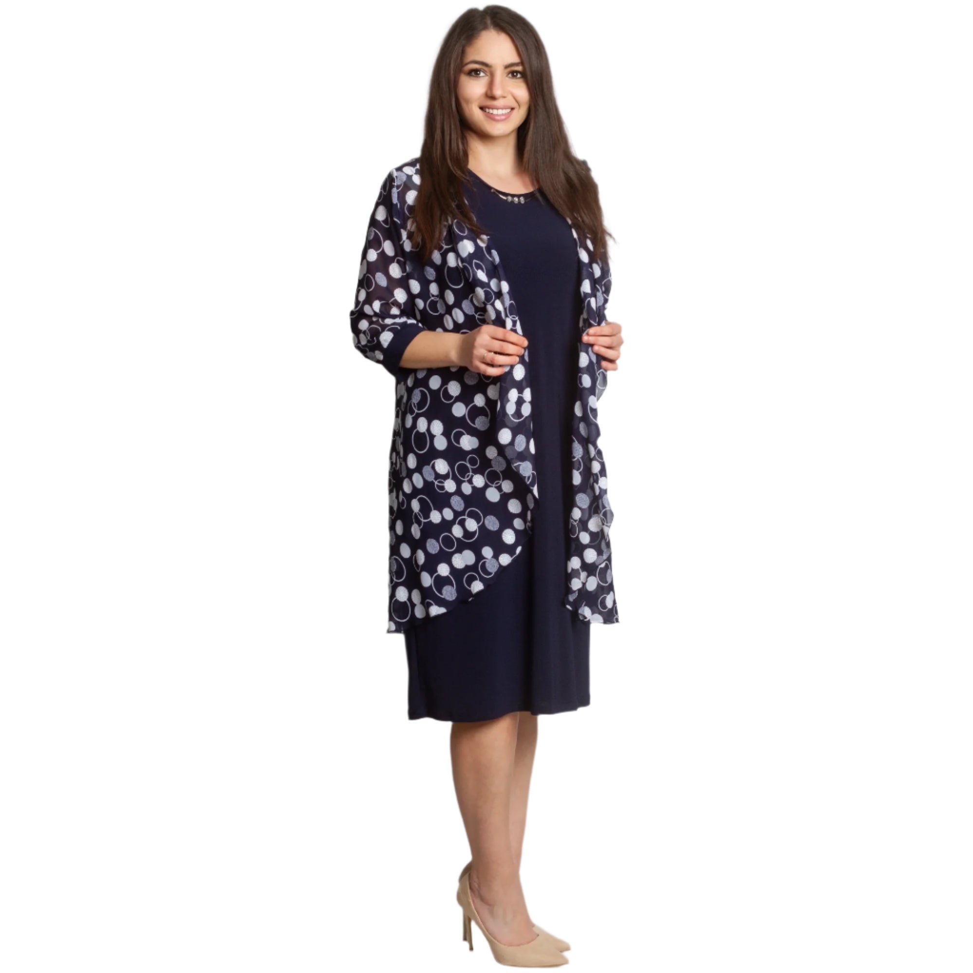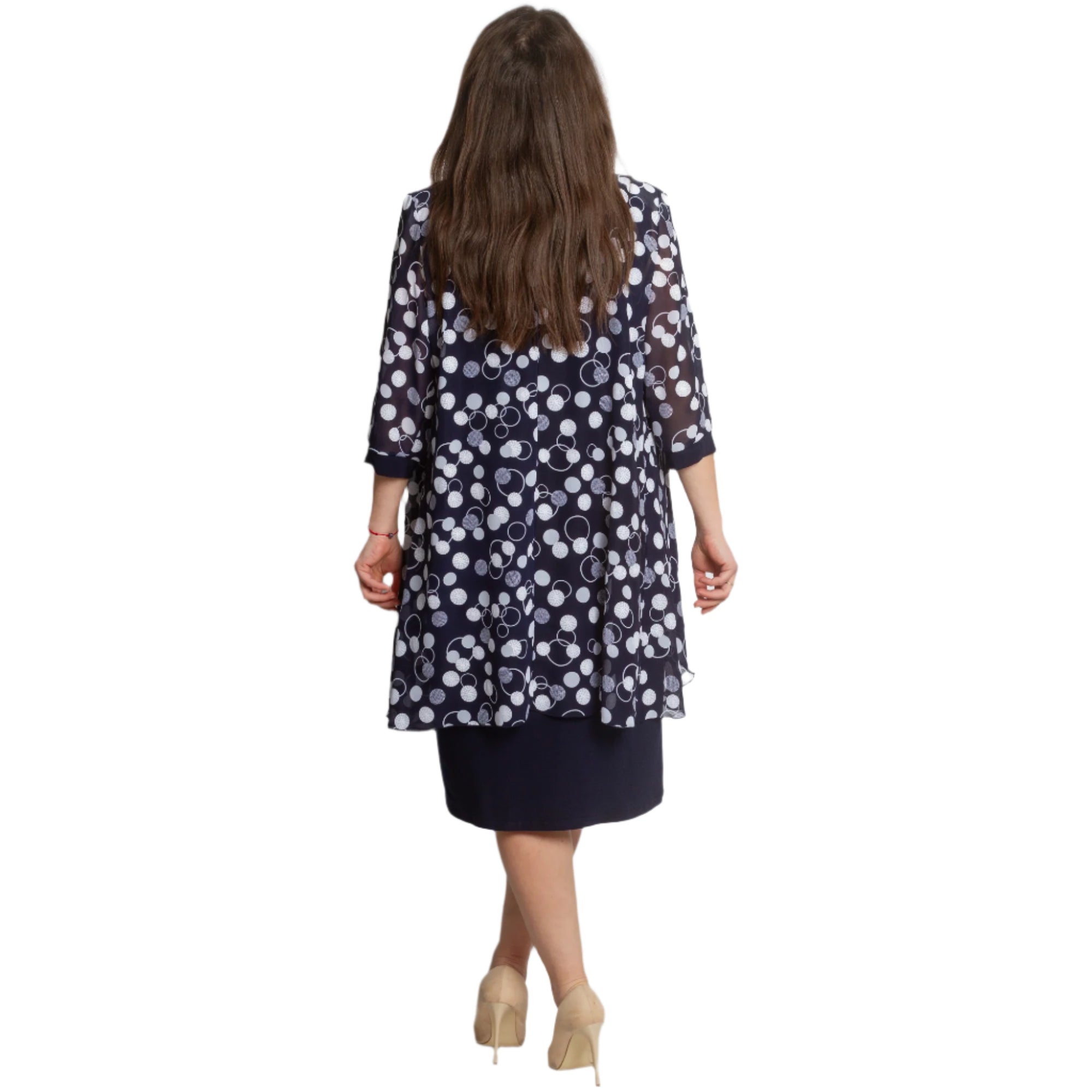 Официална рокля с шифонено наметало, идеална за стилни дами, които търсят изисканост и комфорт. Комплектът включва права рокля с дебели презрамки и стилно наметало от шифон. Дизайнът комбинира изчистена основна рокля с ефирно наметало, украсено с красиви кръгови мотиви. Роклята е с елегантно кръгло деколте, допълнено с дискретна декорация. Изработена от висококачествени материи, осигурява удобство и стил за всякакви официални поводи.