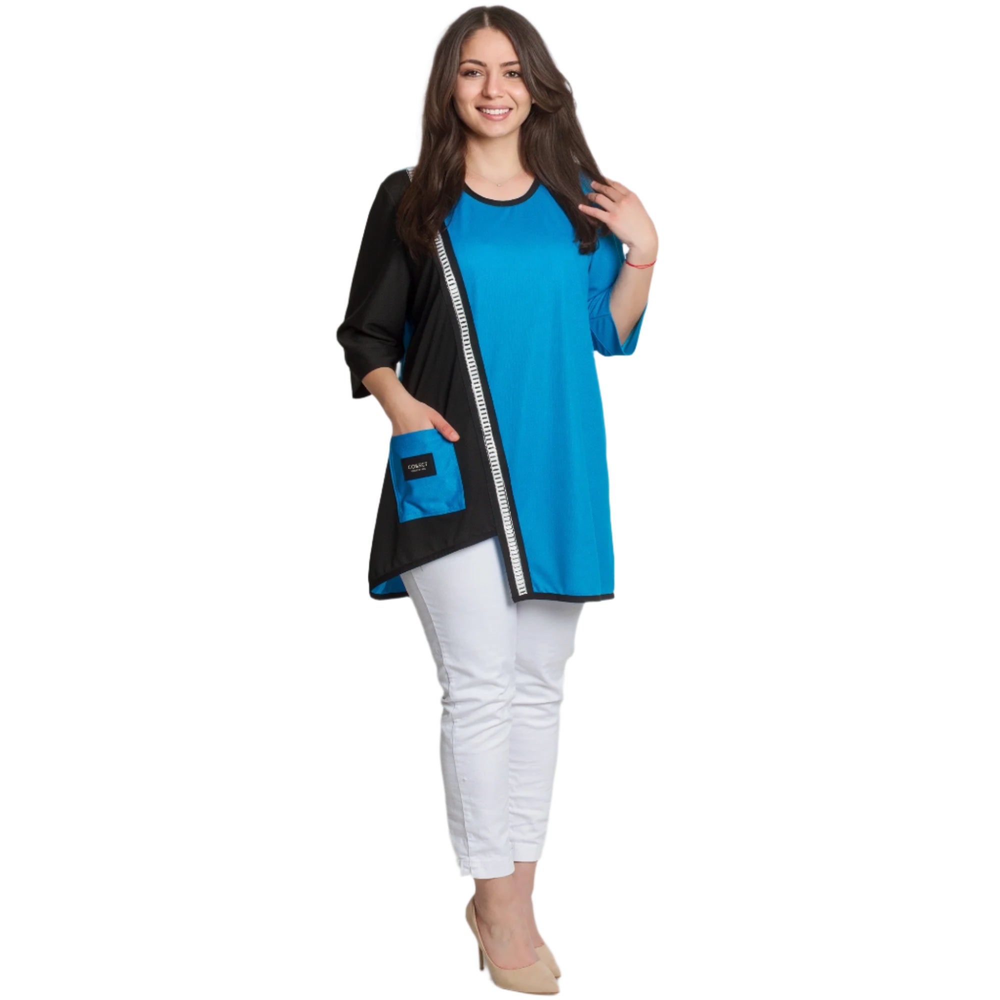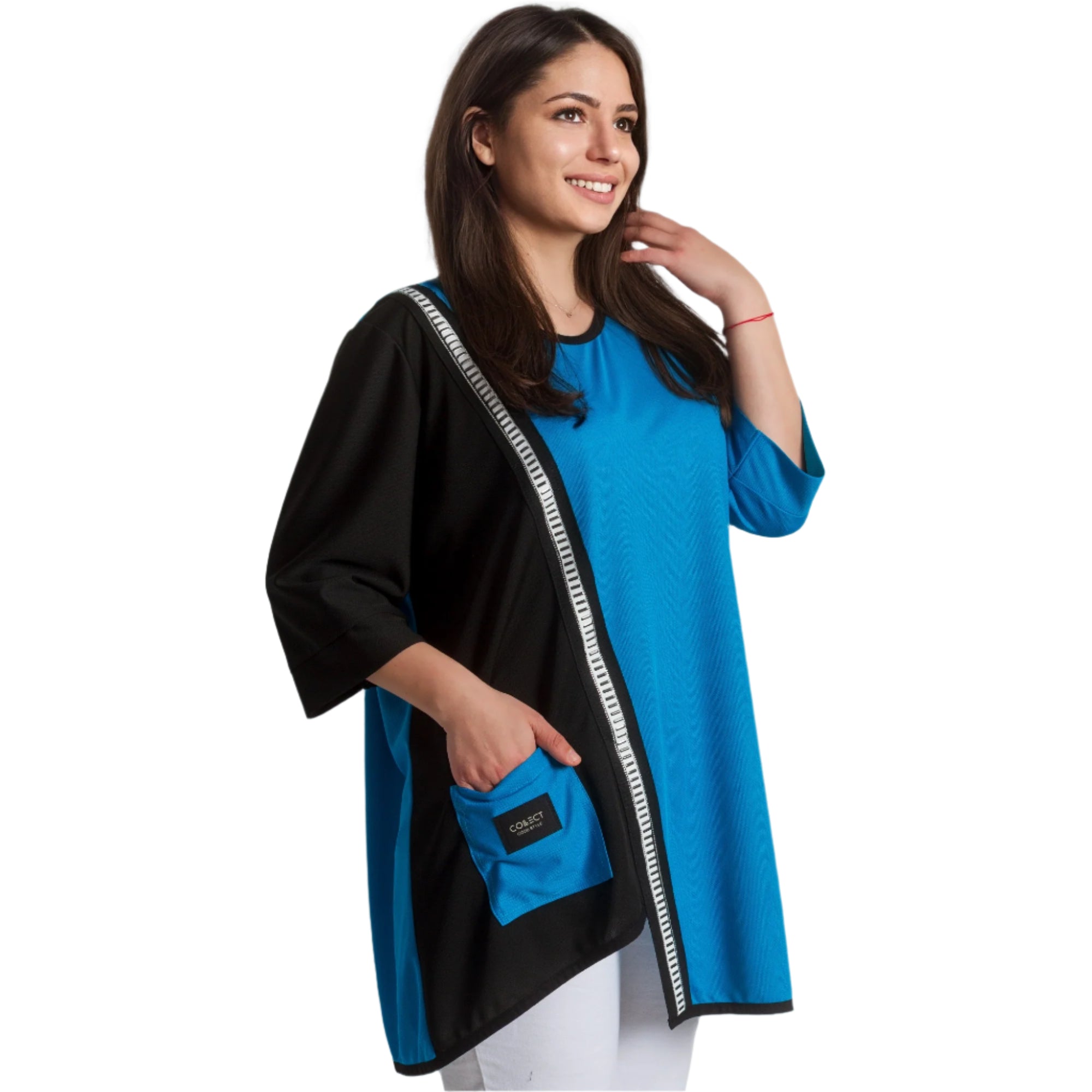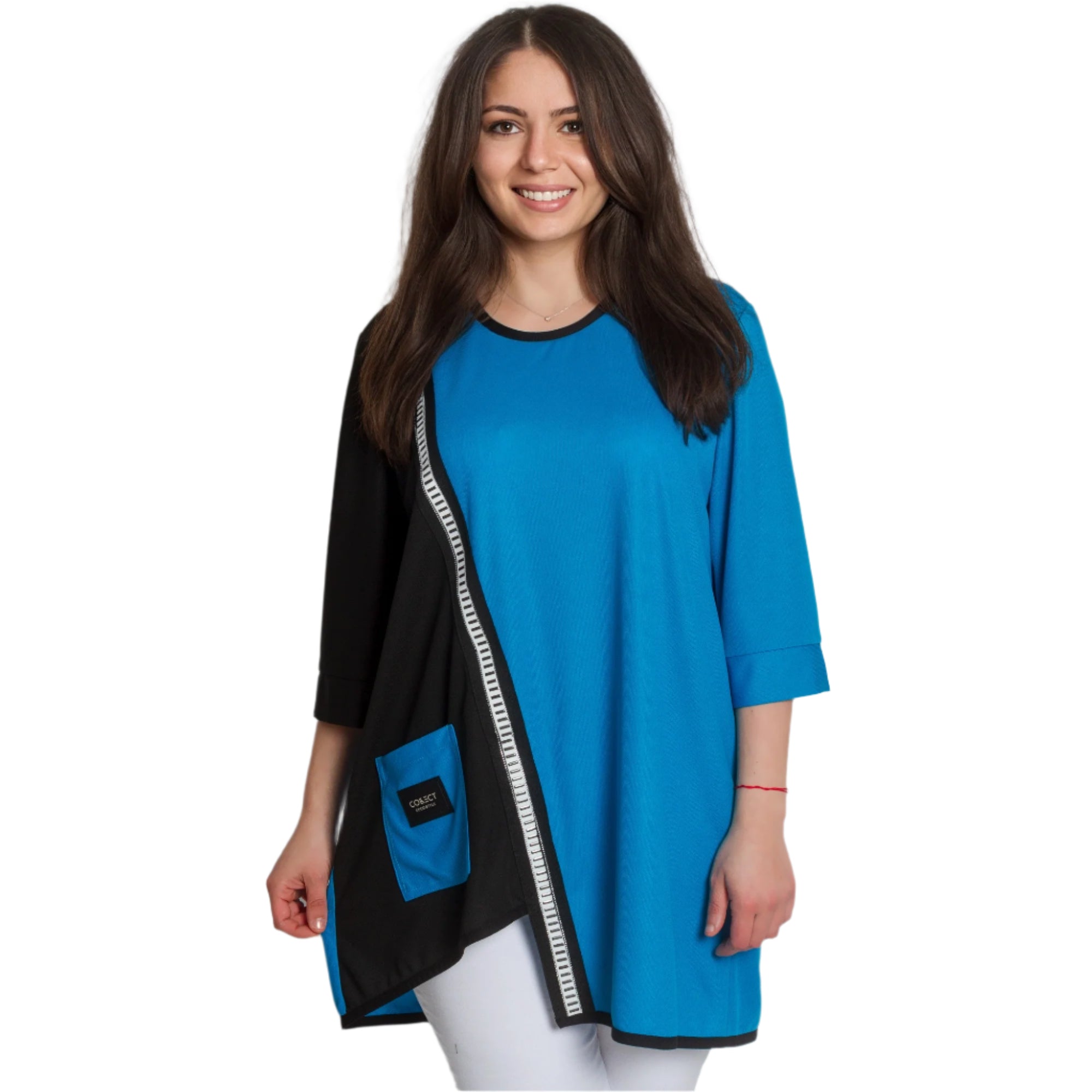 Стилна и удобна макси туника със свободна кройка, съчетаваща класическо черно с освежаващ син цвят. Декоративният кант по дължината на туниката добавя изискан акцент, а малкият джоб с контрастен детайл допълва модерната визия. Изработена от мека и еластична вискоза с еластан, тази туника е идеален избор за дамите, които търсят комфорт и елегантност в ежедневието или за официални поводи.