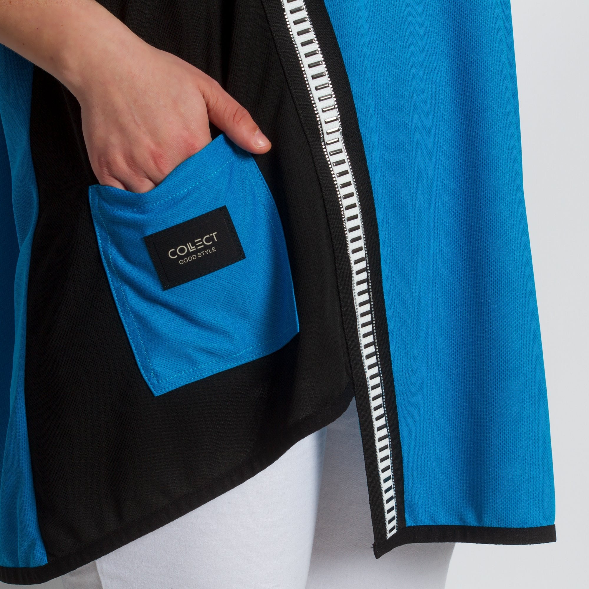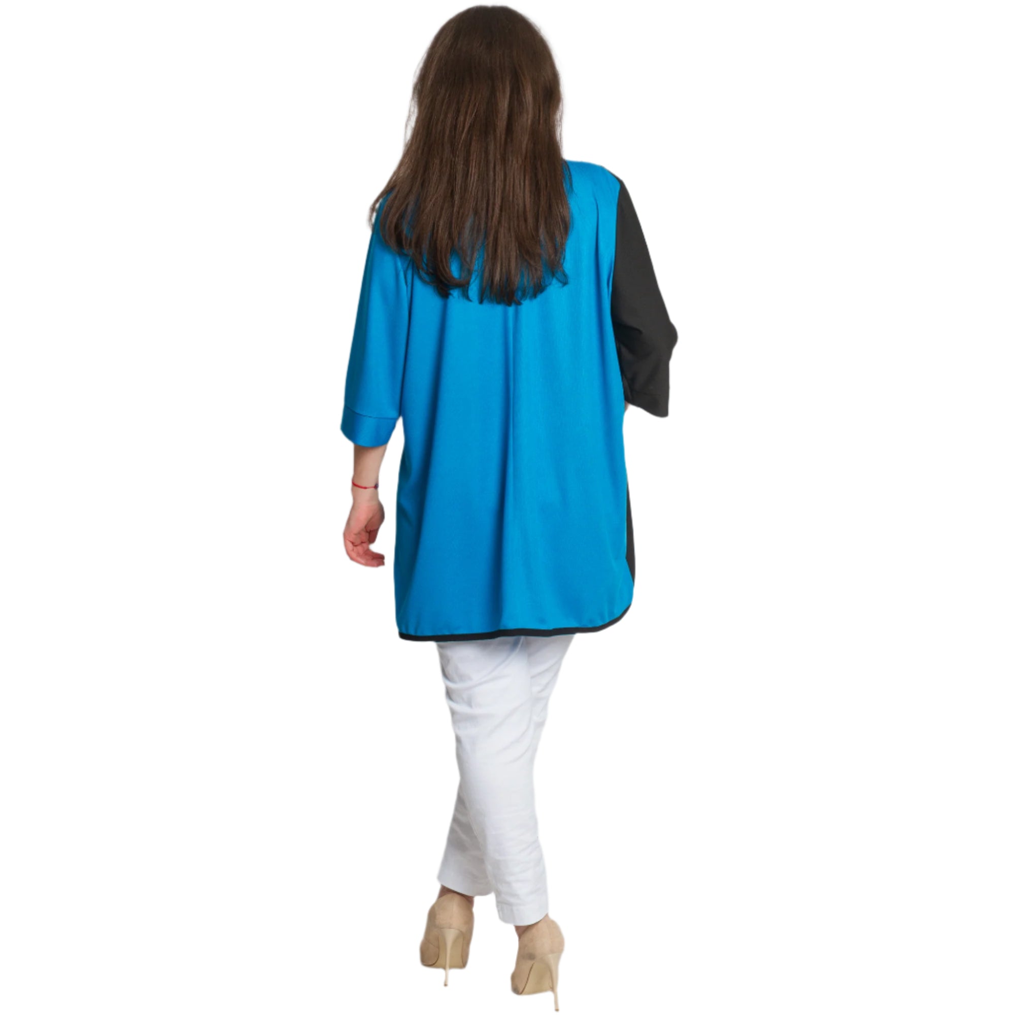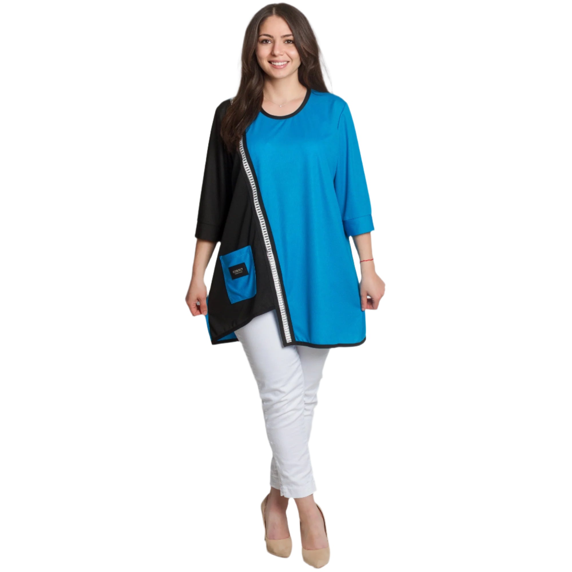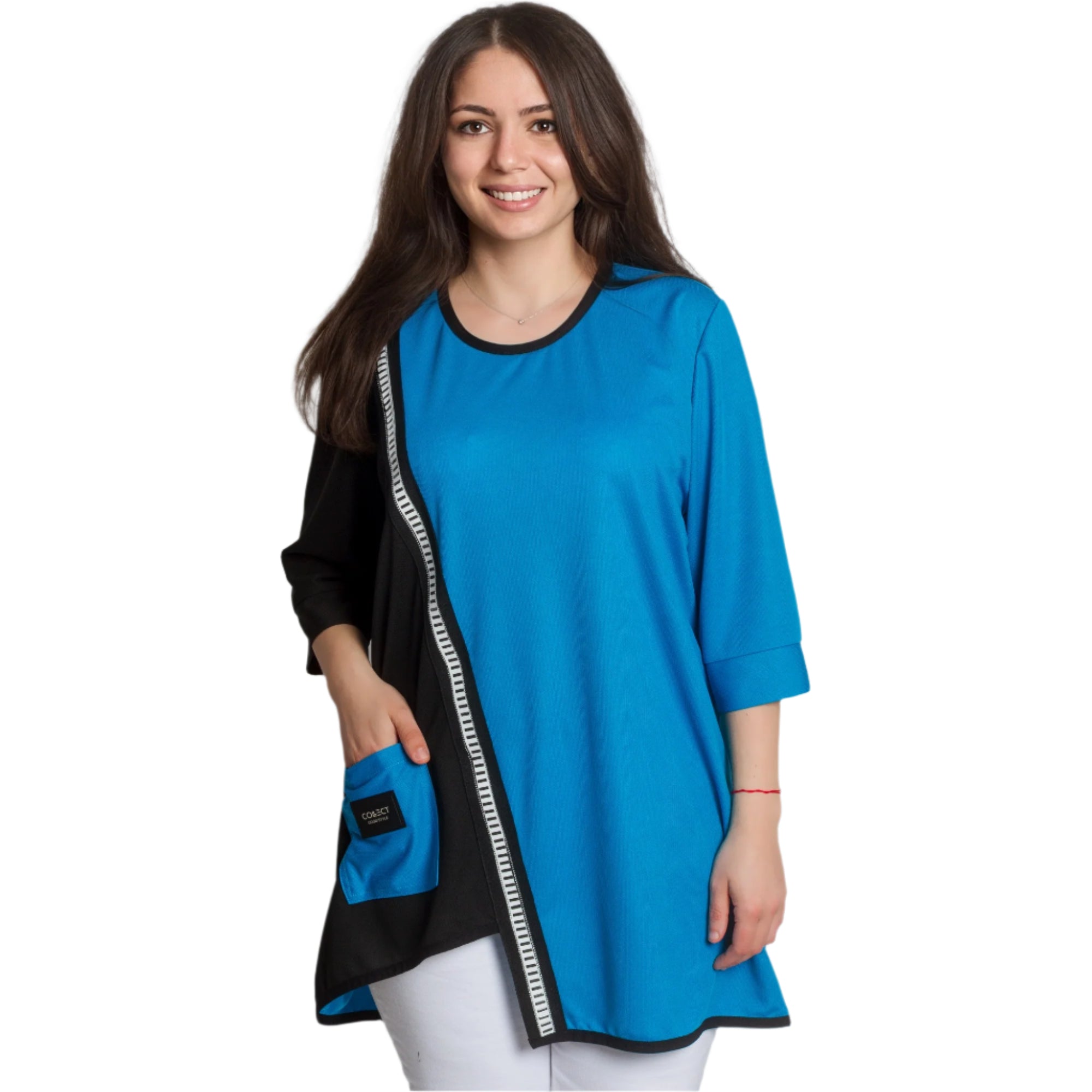 Стилна и удобна макси туника със свободна кройка, съчетаваща класическо черно с освежаващ син цвят. Декоративният кант по дължината на туниката добавя изискан акцент, а малкият джоб с контрастен детайл допълва модерната визия. Изработена от мека и еластична вискоза с еластан, тази туника е идеален избор за дамите, които търсят комфорт и елегантност в ежедневието или за официални поводи.