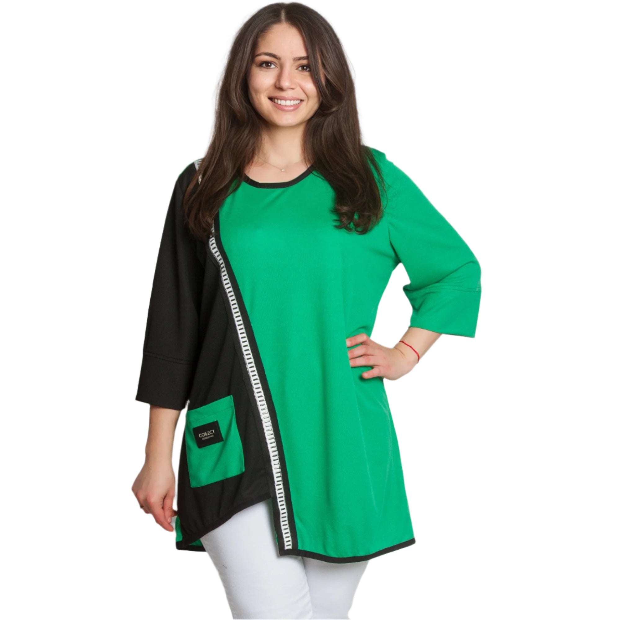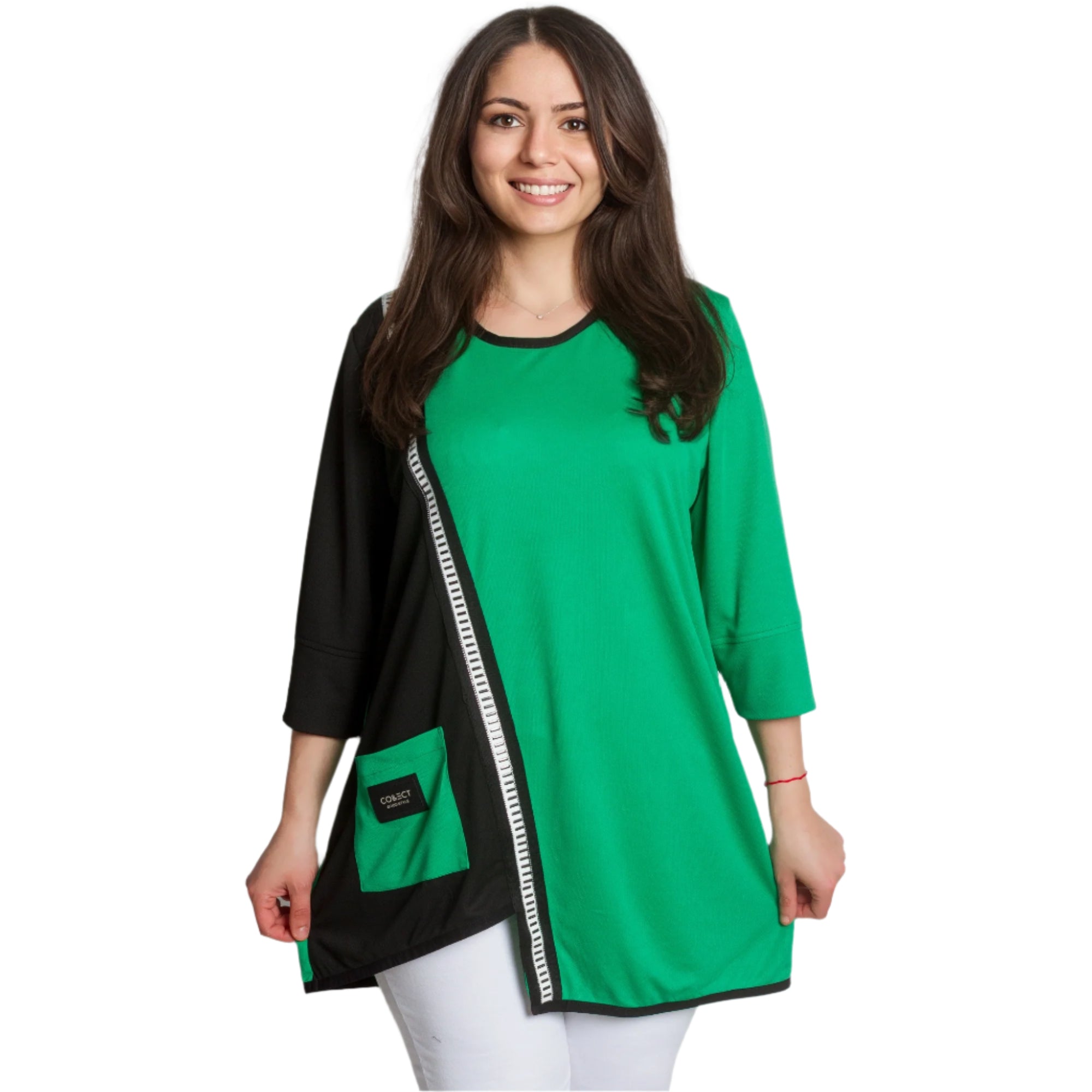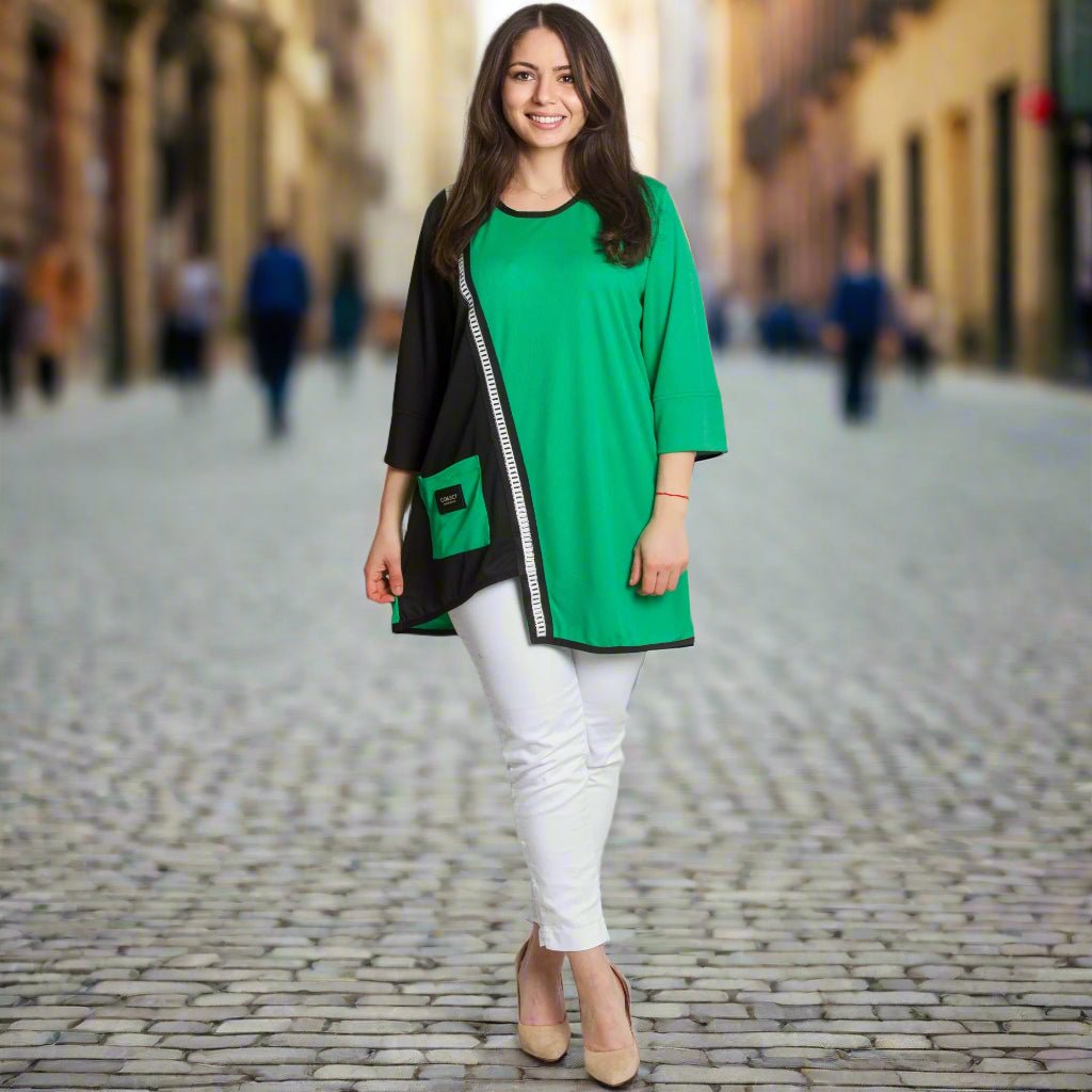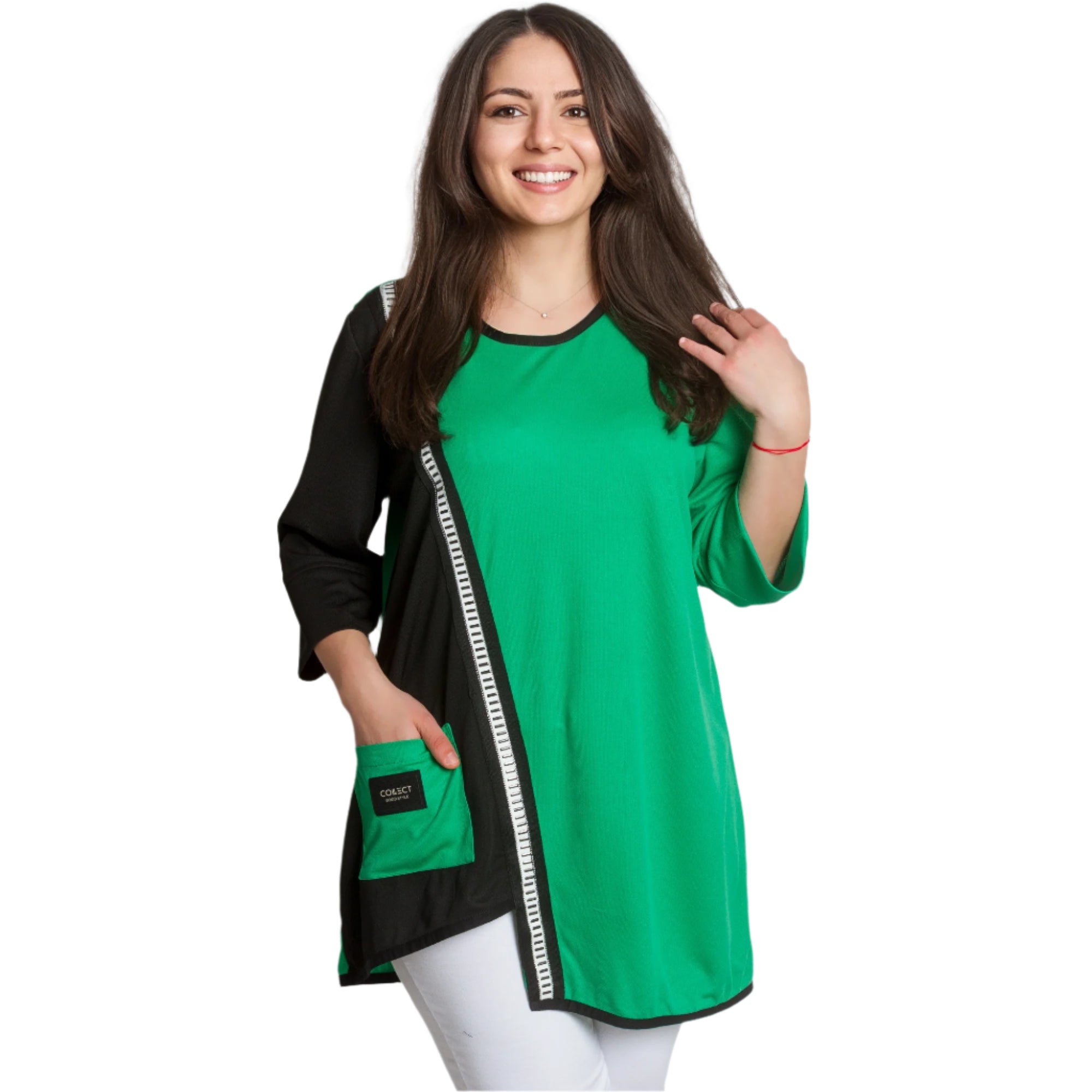 Стилна и удобна макси туника със свободна кройка, съчетаваща класическо черно с освежаващ зелен цвят. Декоративният кант по дължината на туниката добавя изискан акцент, а малкият джоб с контрастен детайл допълва модерната визия. Изработена от мека и еластична вискоза с еластан, тази туника е идеален избор за дамите, които търсят комфорт и елегантност в ежедневието или за официални поводи.
