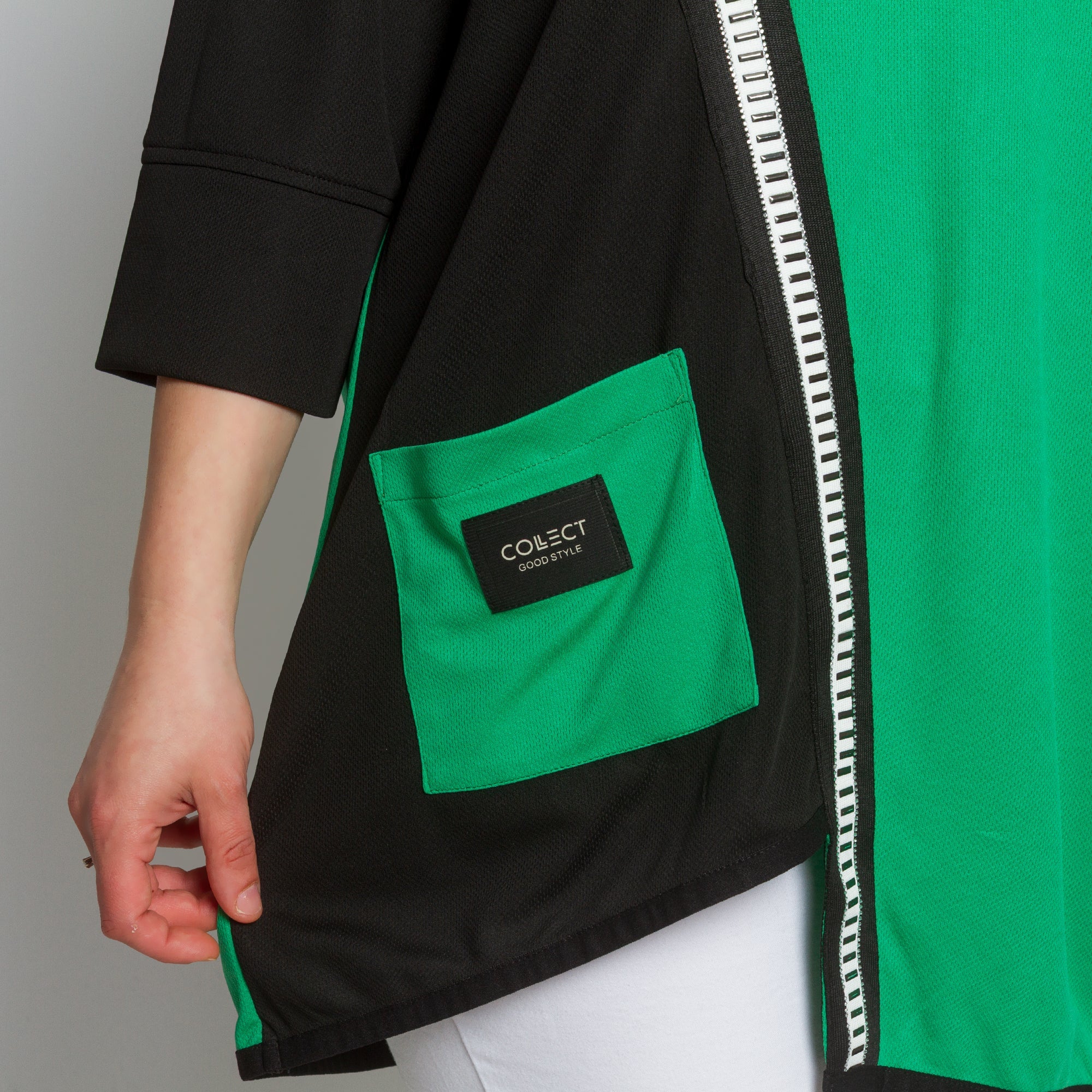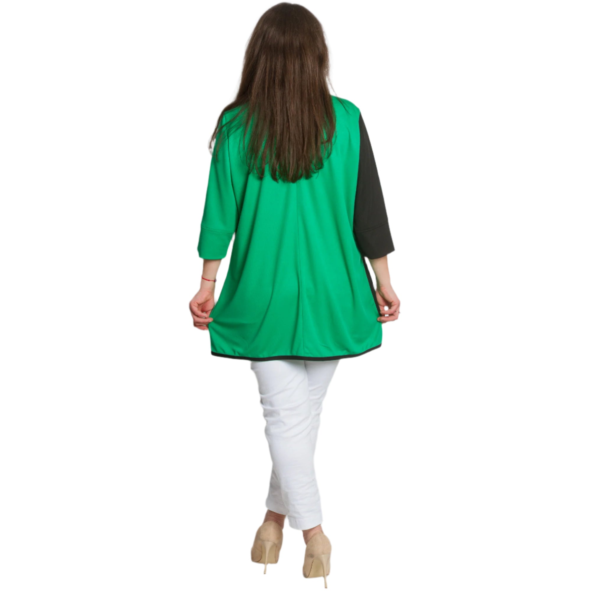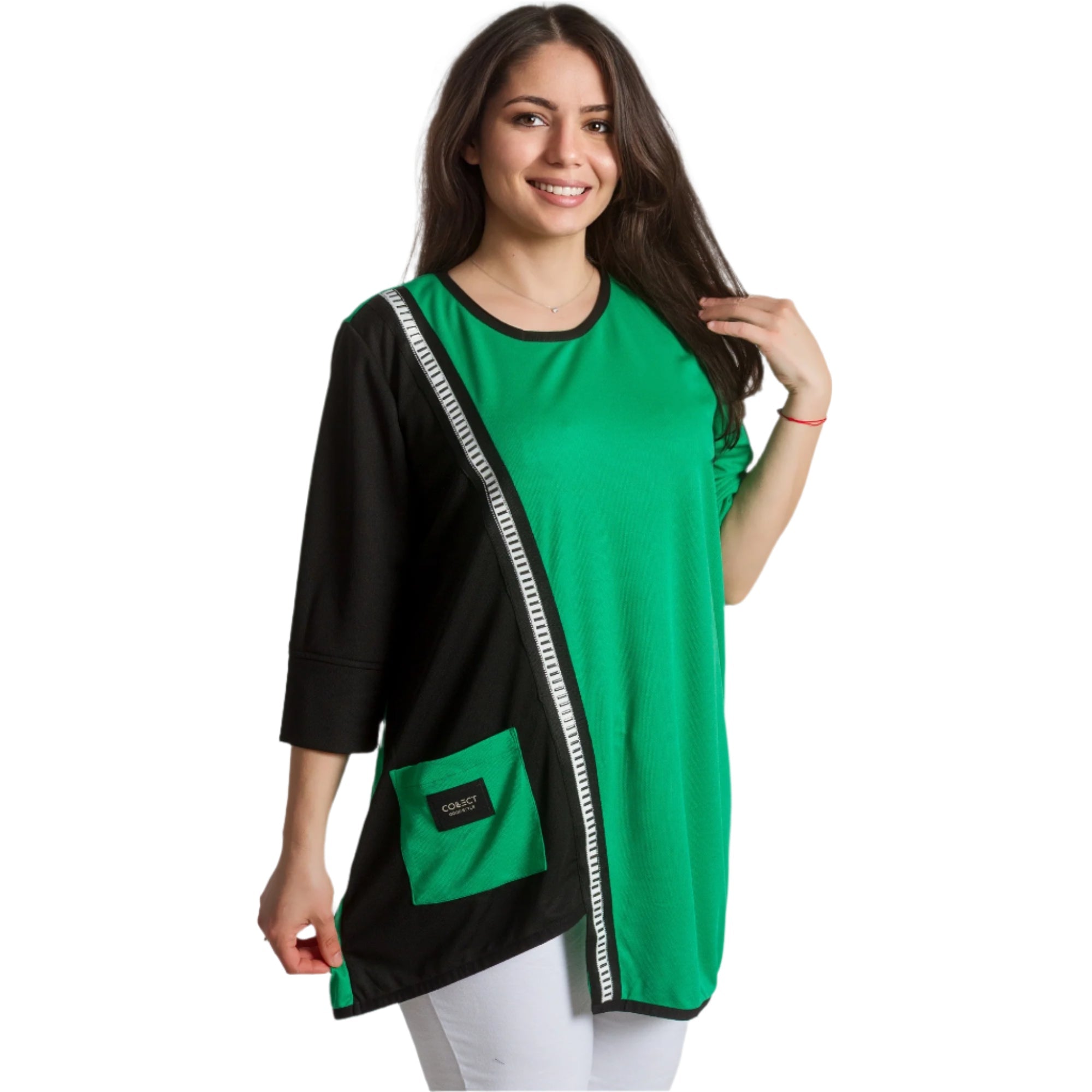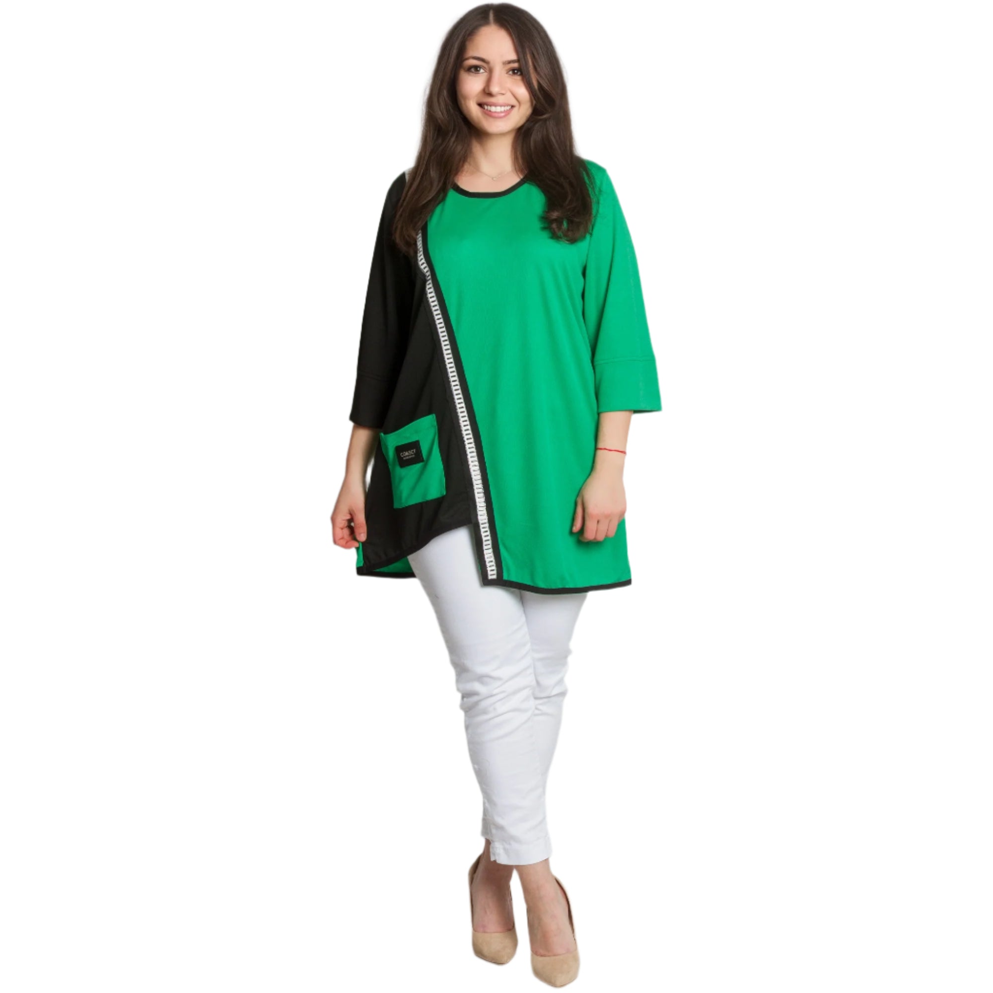 Стилна и удобна макси туника със свободна кройка, съчетаваща класическо черно с освежаващ зелен цвят. Декоративният кант по дължината на туниката добавя изискан акцент, а малкият джоб с контрастен детайл допълва модерната визия. Изработена от мека и еластична вискоза с еластан, тази туника е идеален избор за дамите, които търсят комфорт и елегантност в ежедневието или за официални поводи.