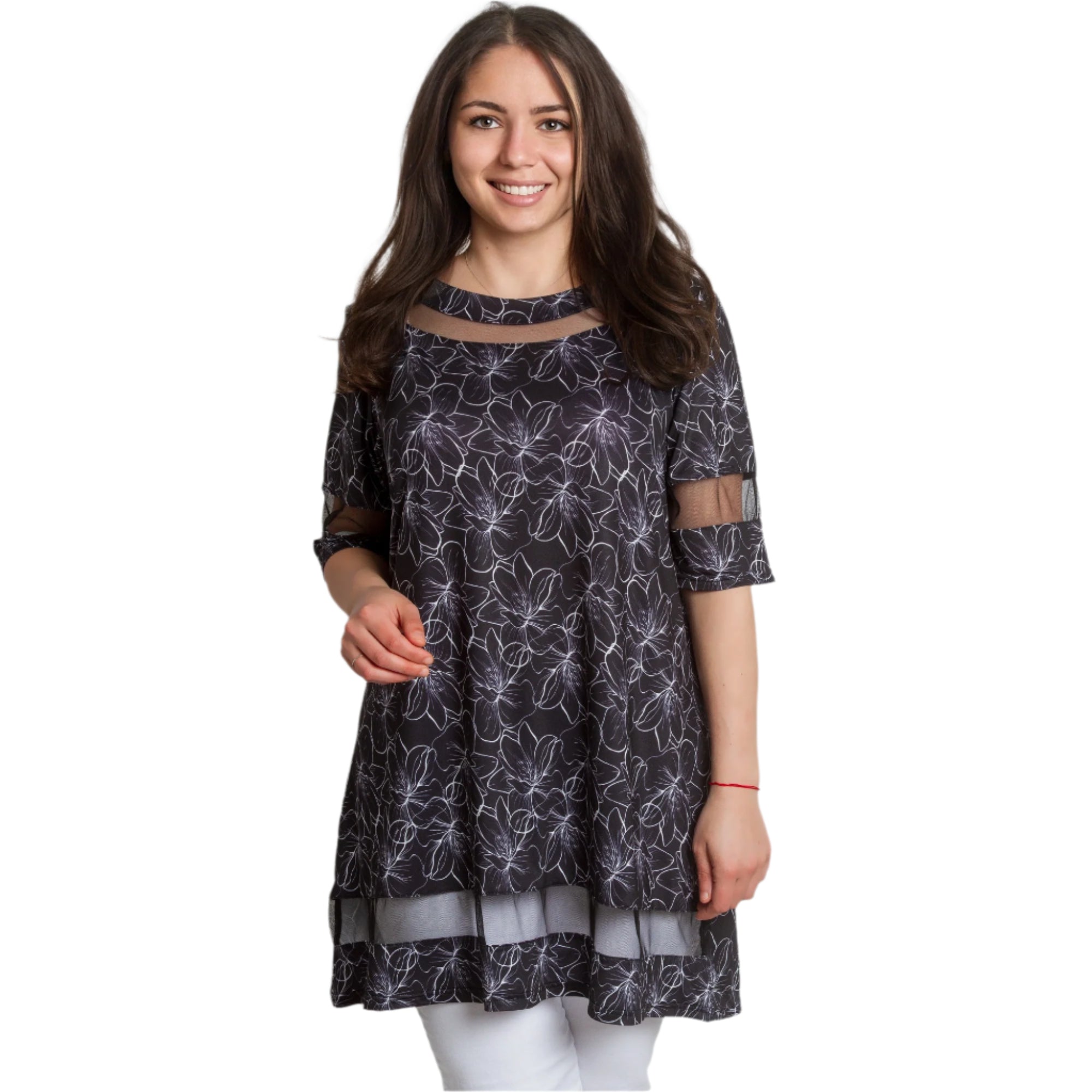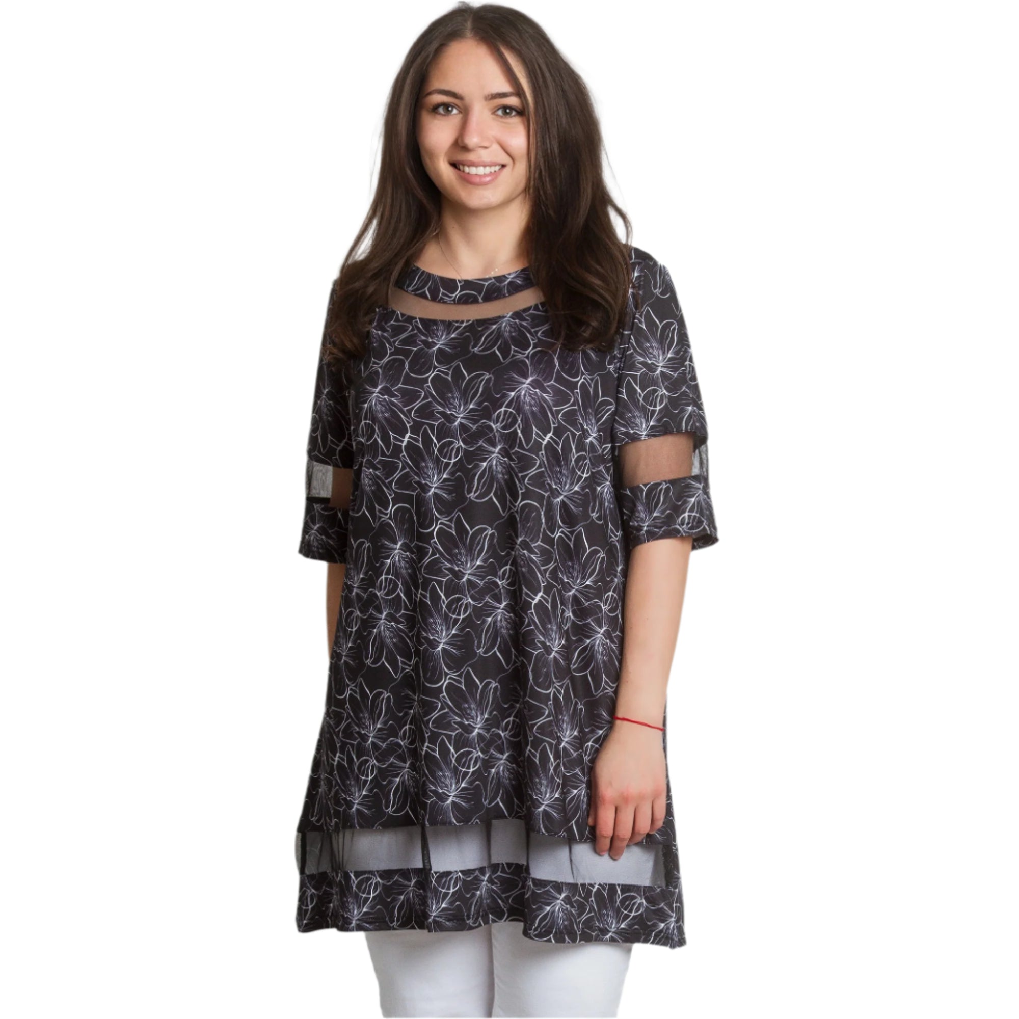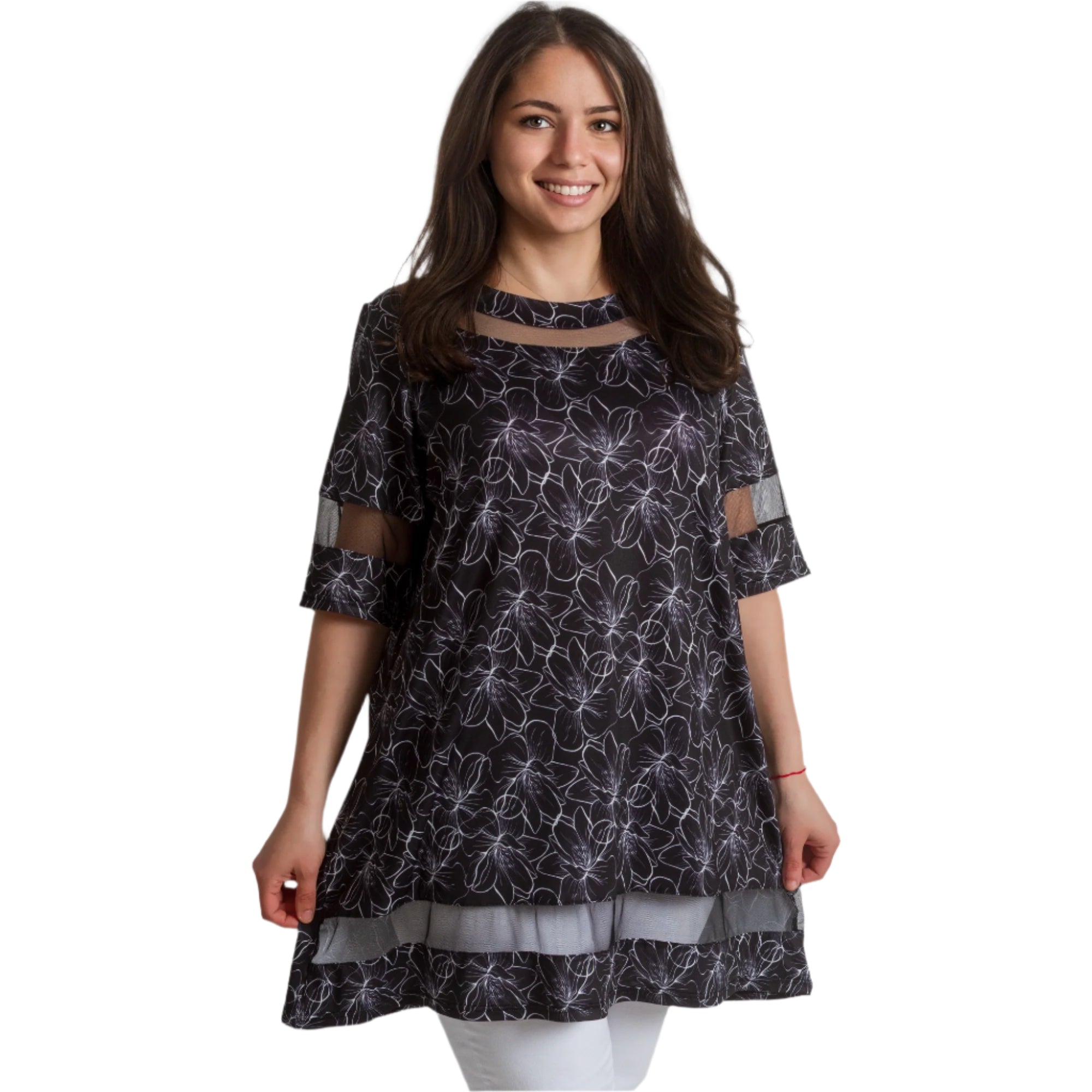 Стилна дамска туника в големи размери, декорирана с елегантен флорален десен в черно-бяло. Изработена от лека и приятна на допир материя – 70% полиамид, 25% полиестер и 5% еластан – този модел е перфектен за топлите сезони. Дизайнът е обогатен с мрежести елементи около деколтето, ръкавите и подгъва, допълнени от кожен акцент, който придава модерен вид. Туниката е с удобна свободна кройка и къс ръкав, което я прави подходяща както за ежедневието, така и за по-специални поводи.