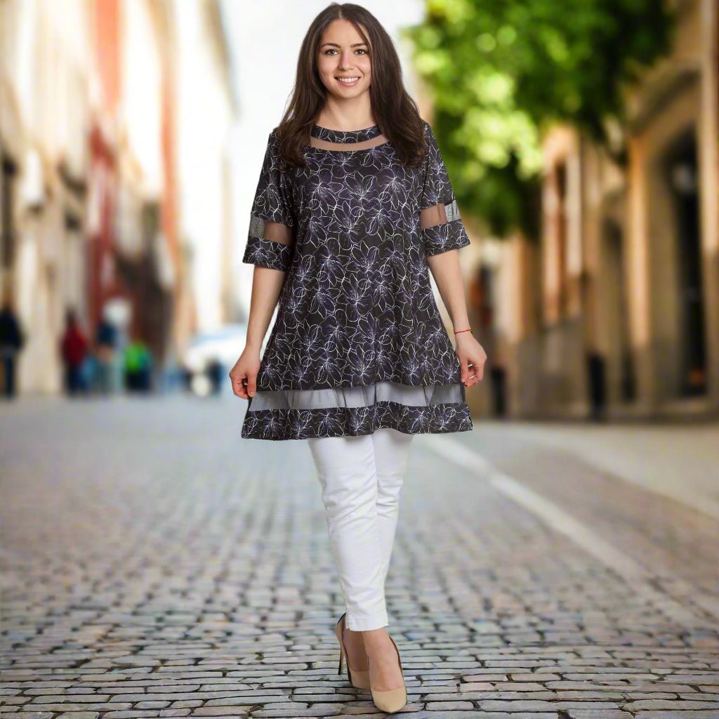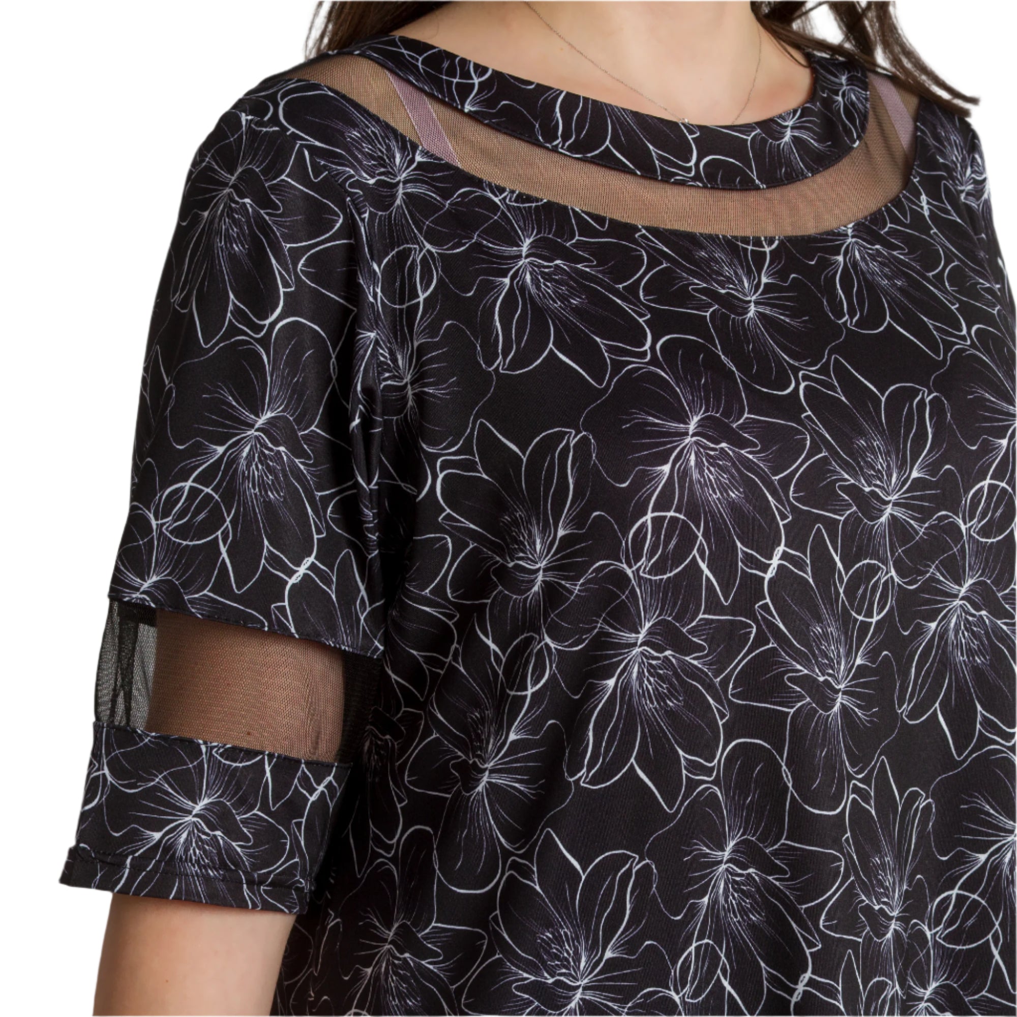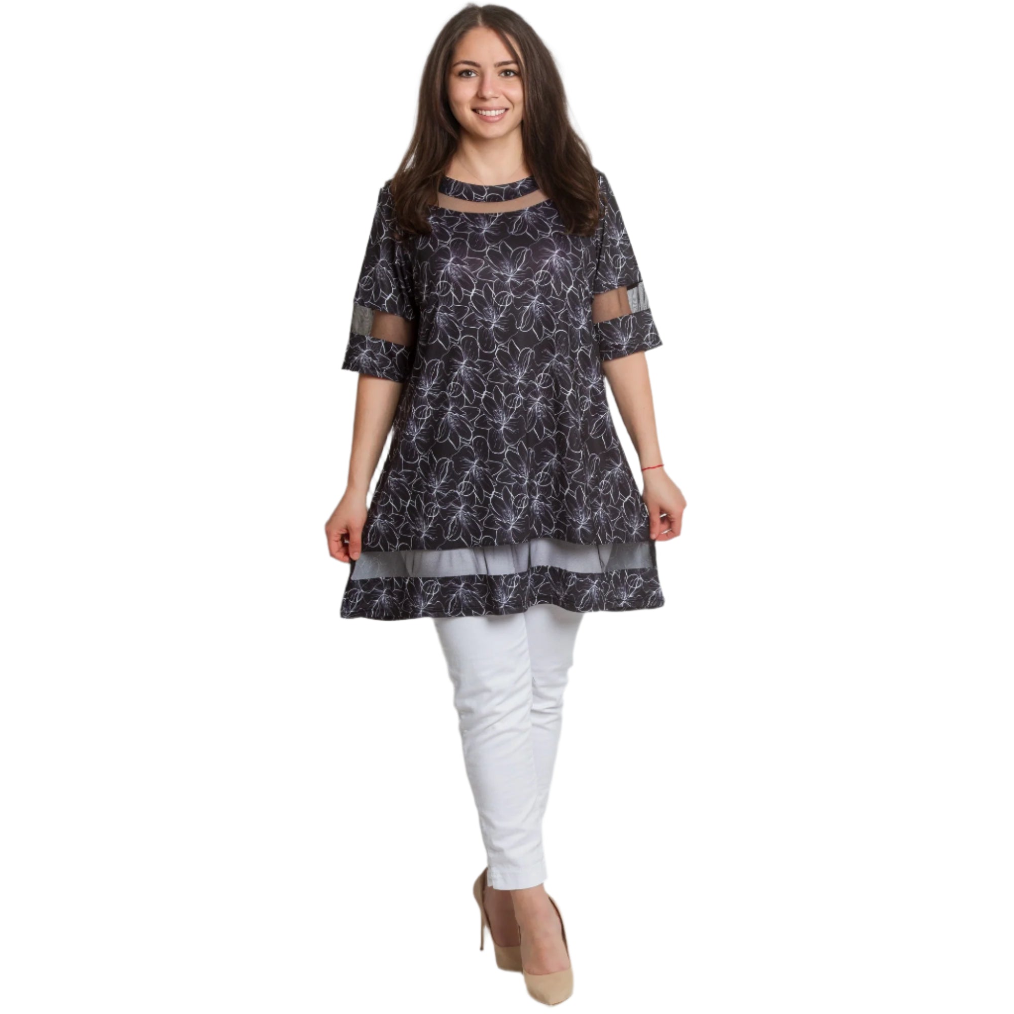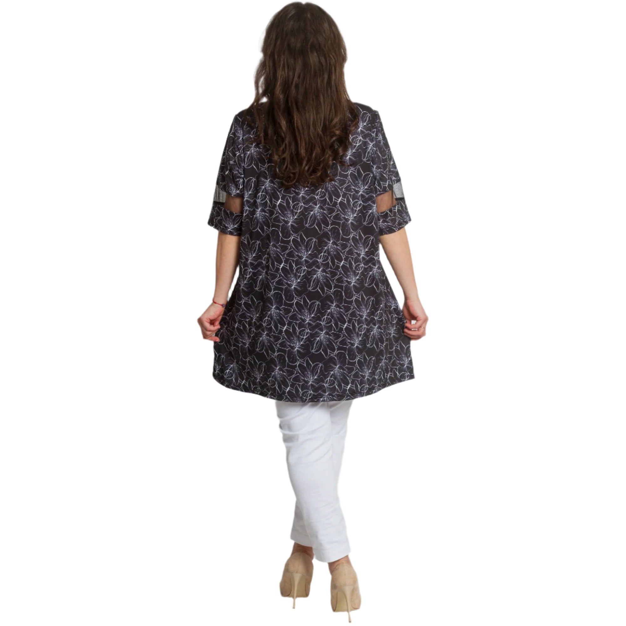Стилна дамска туника в големи размери, декорирана с елегантен флорален десен в черно-бяло. Изработена от лека и приятна на допир материя – 70% полиамид, 25% полиестер и 5% еластан – този модел е перфектен за топлите сезони. Дизайнът е обогатен с мрежести елементи около деколтето, ръкавите и подгъва, допълнени от кожен акцент, който придава модерен вид. Туниката е с удобна свободна кройка и къс ръкав, което я прави подходяща както за ежедневието, така и за по-специални поводи.