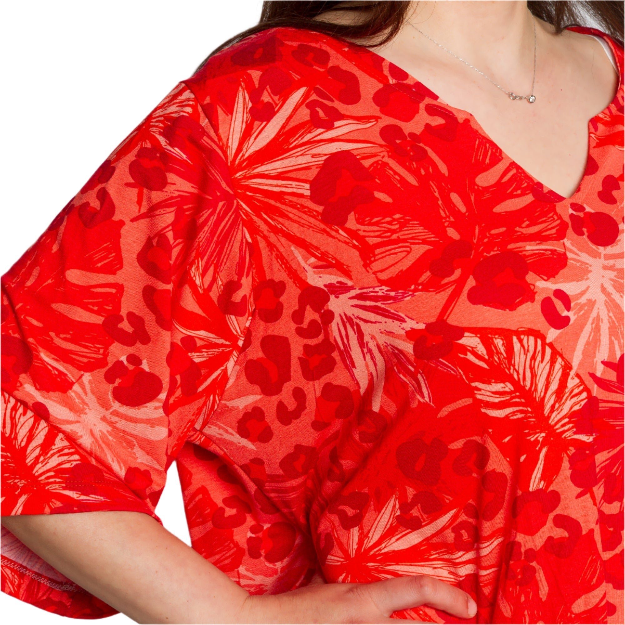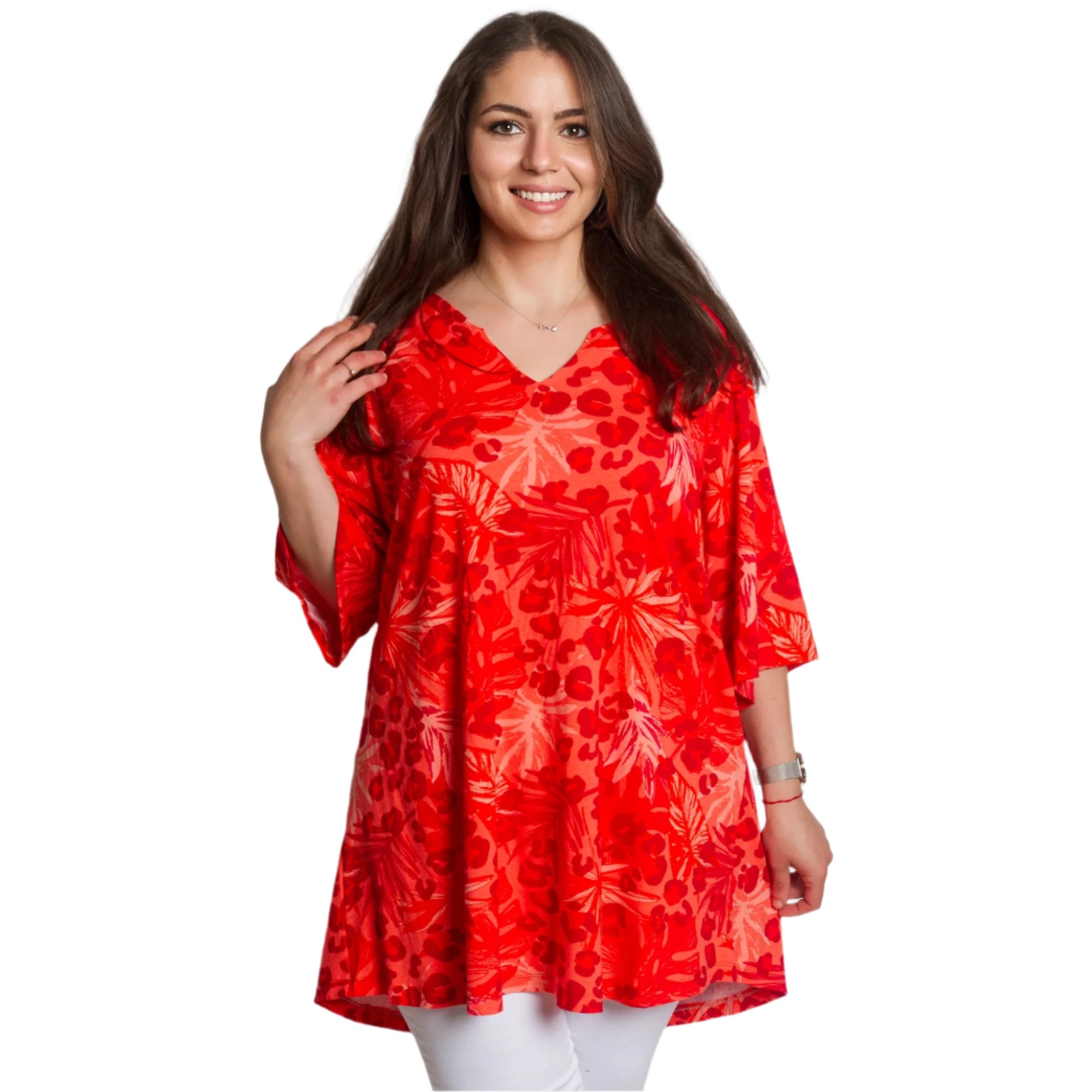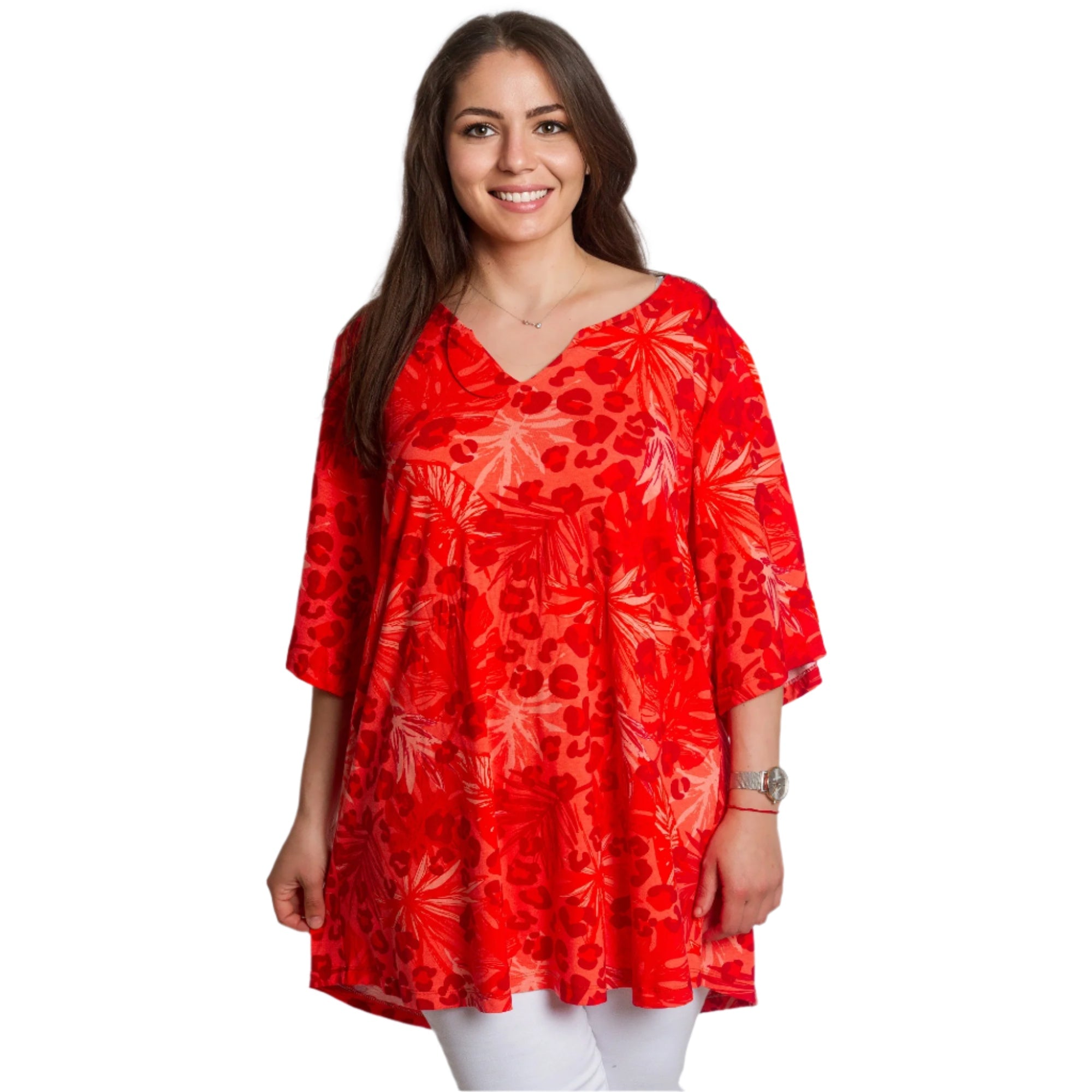 Освежете гардероба си с тази стилна и комфортна туника в ярко червено! Със своя свободен силует и свеж принт, съчетаващ палмови листа и животински мотив, този модел ще ви придаде настроение и увереност. Изработена от висококачествена материя с високо съдържание на вискоза, туниката осигурява комфорт през целия ден и е идеален избор за топлите сезони. V-образното деколте допълва женствената визия и подчертава бюста.