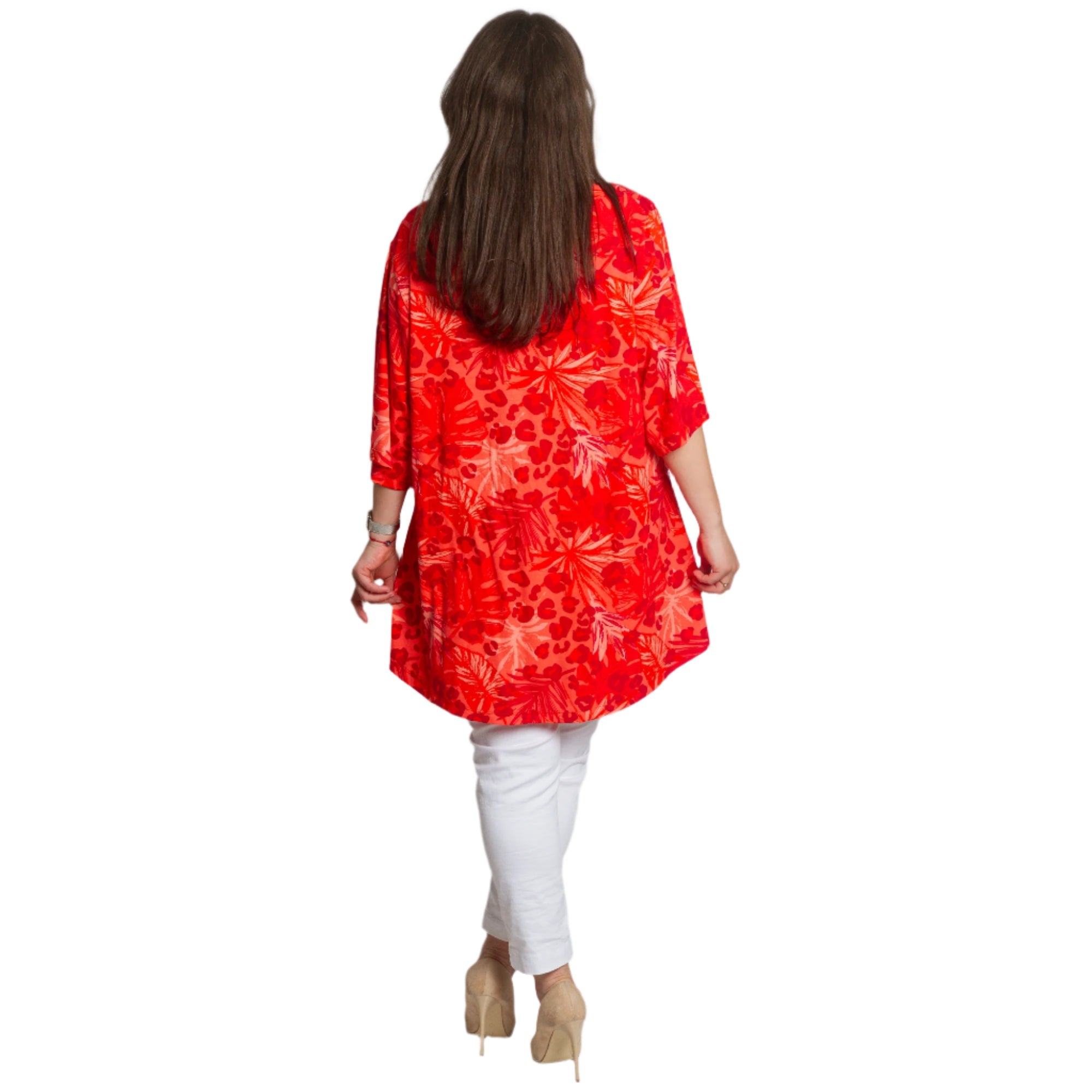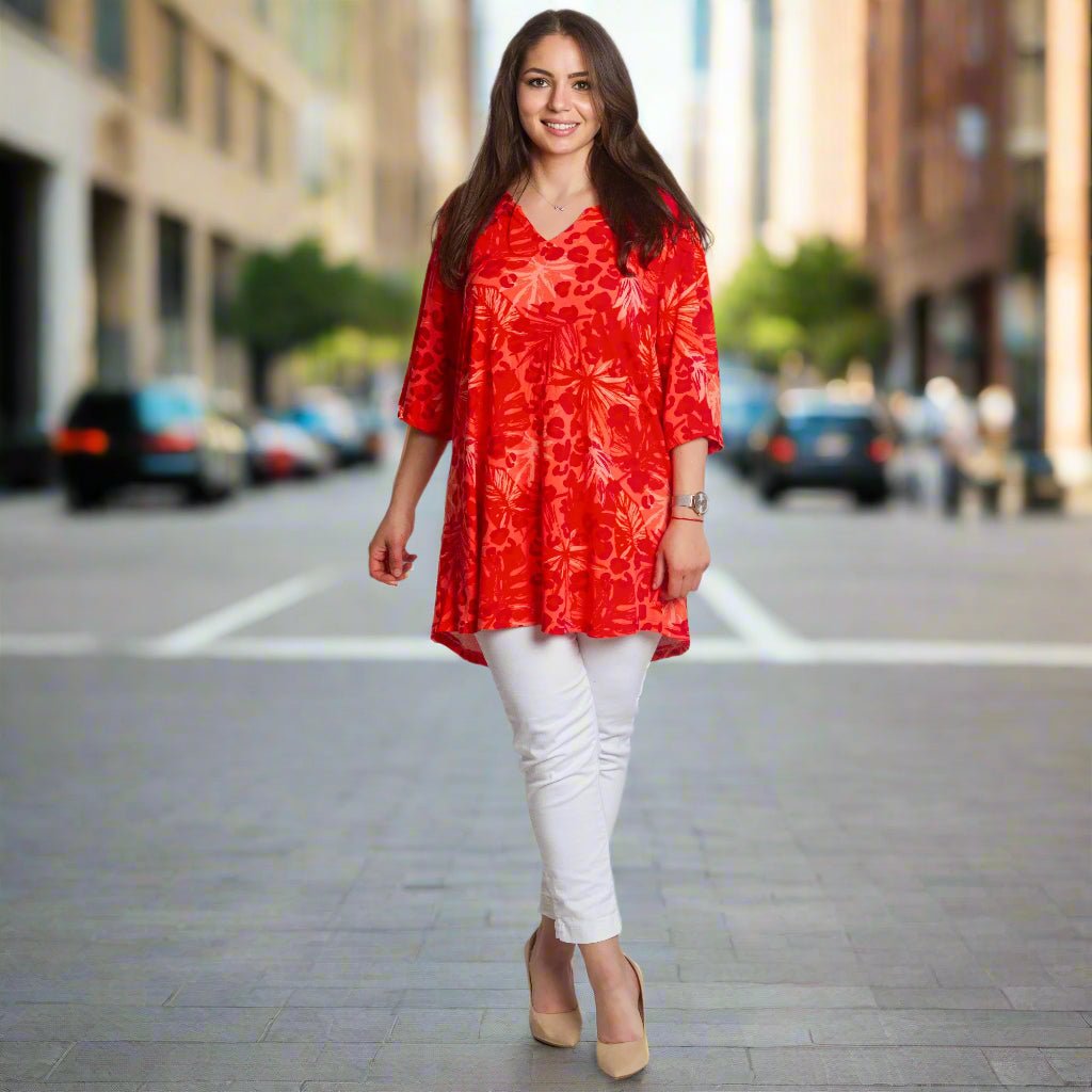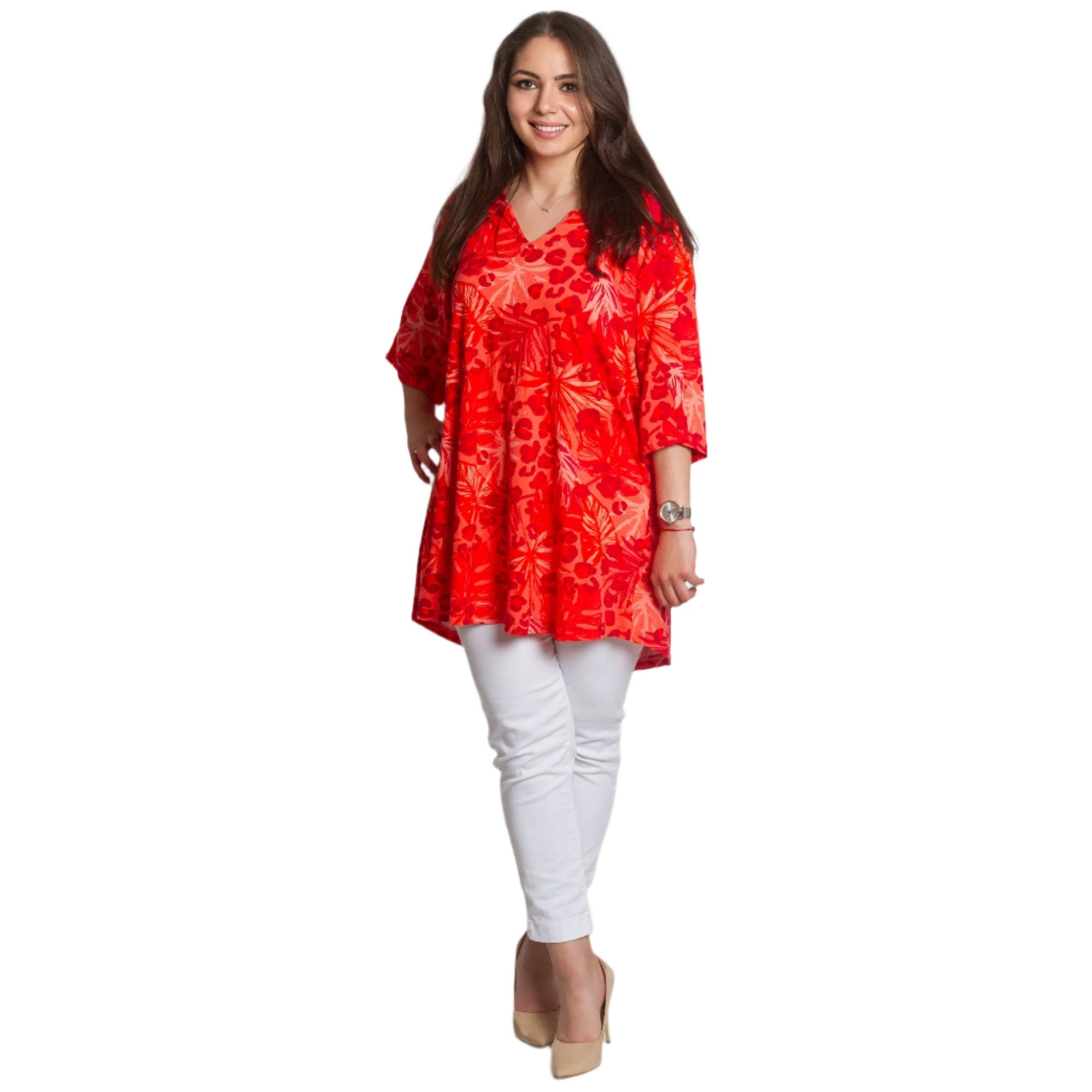 Освежете гардероба си с тази стилна и комфортна туника в ярко червено! Със своя свободен силует и свеж принт, съчетаващ палмови листа и животински мотив, този модел ще ви придаде настроение и увереност. Изработена от висококачествена материя с високо съдържание на вискоза, туниката осигурява комфорт през целия ден и е идеален избор за топлите сезони. V-образното деколте допълва женствената визия и подчертава бюста.
