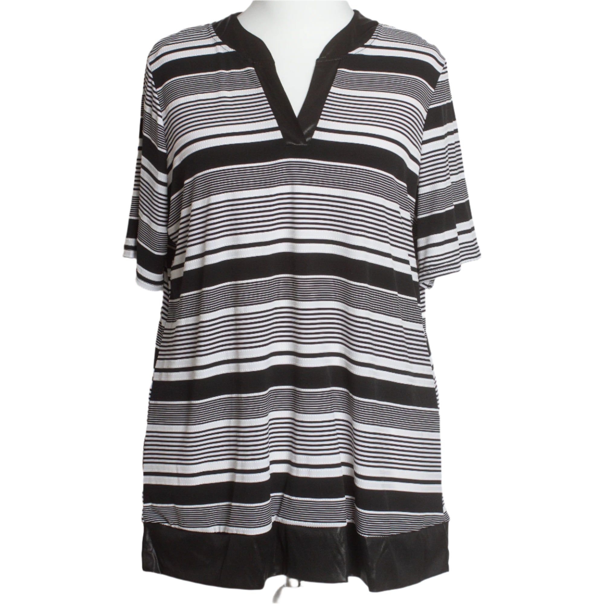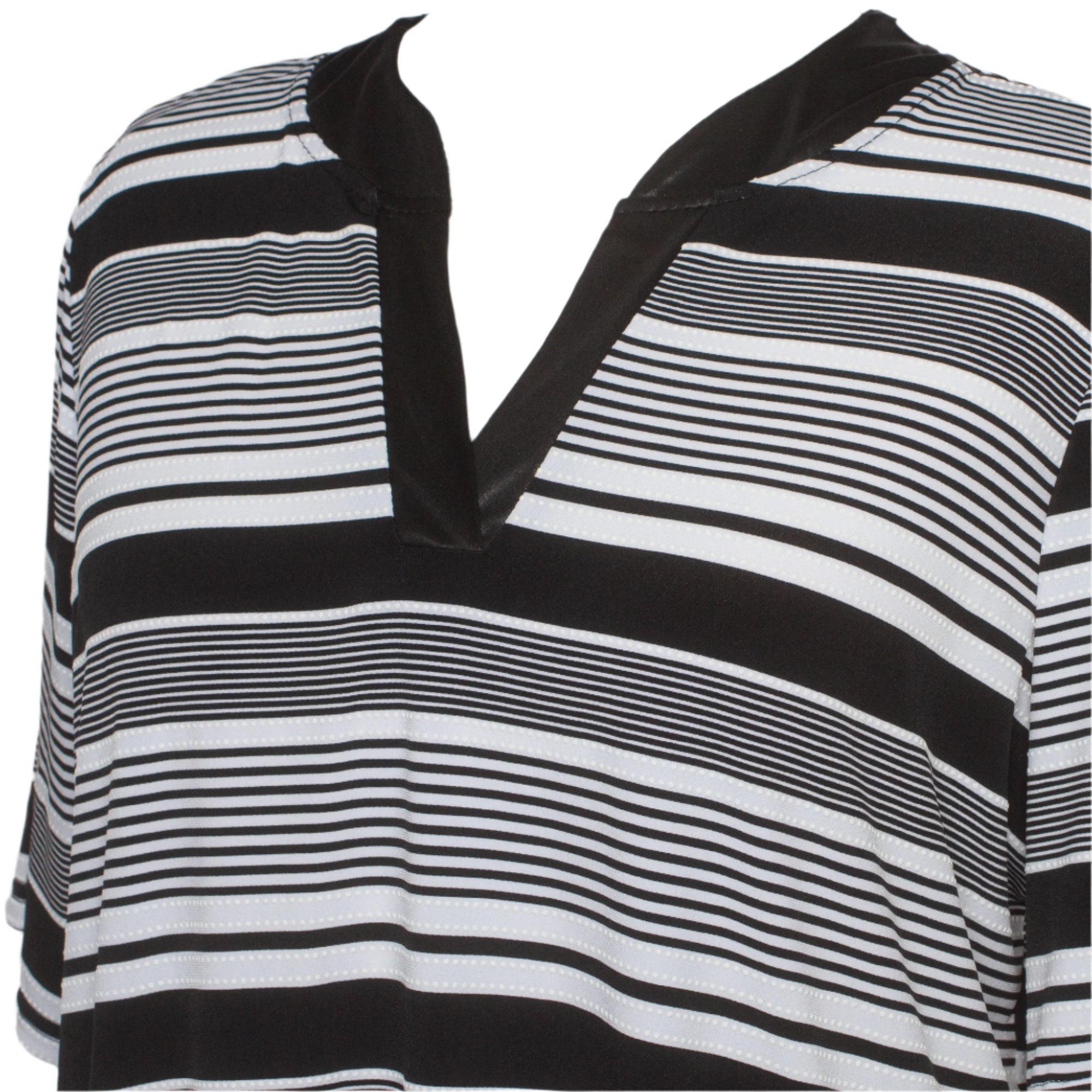 Освежете гардероба си с тази стилна дамска туника, създадена специално за жени с пищни форми. Дизайнът впечатлява с черно-бели райета, които оптически издължават силуета, а сатенените акценти по деколтето и долния край придават нотка елегантност. Свободната кройка осигурява комфорт през целия ден, докато леката и еластична материя се движи нежно с всяко движение.