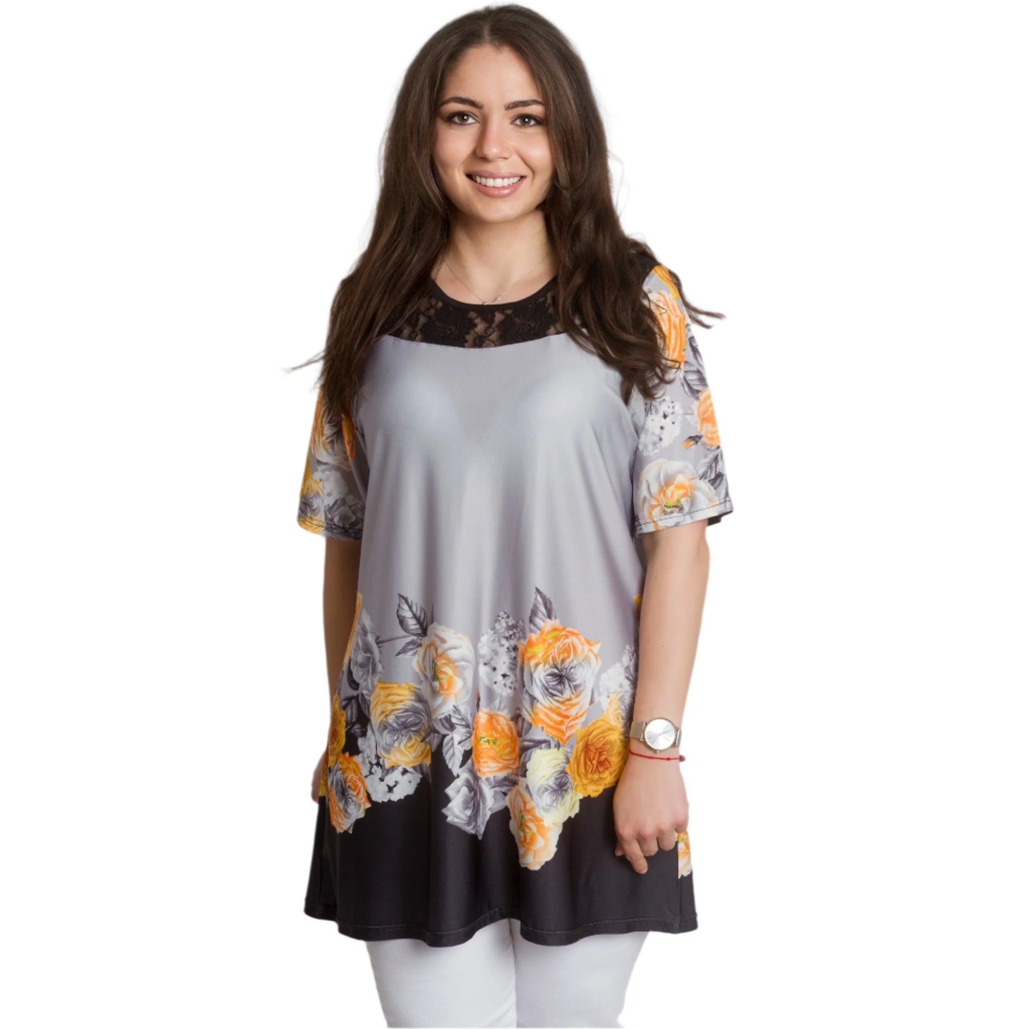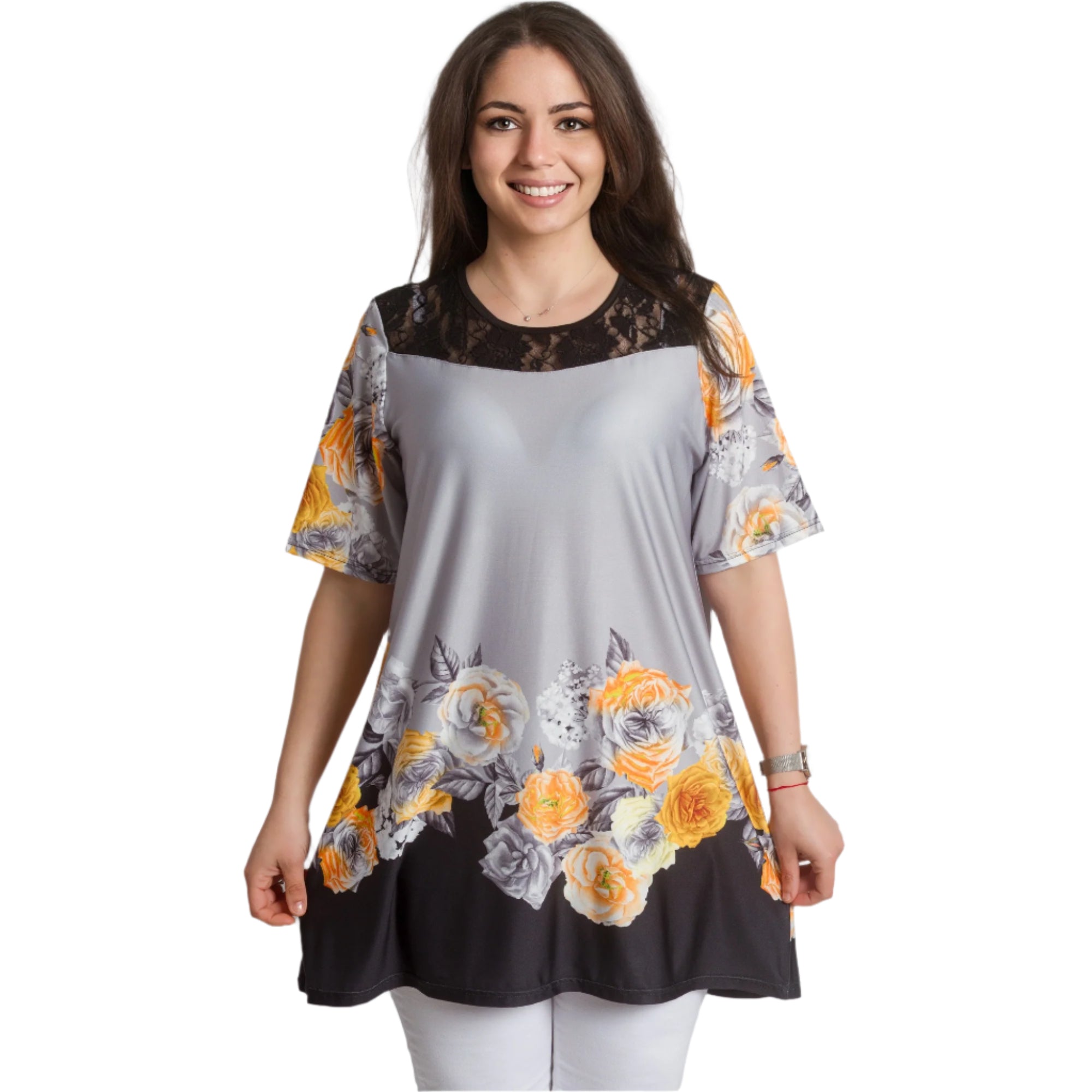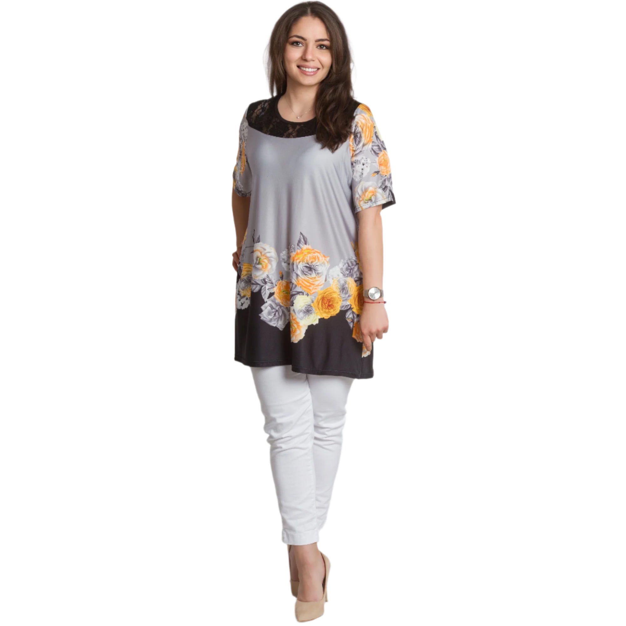Добавете нотка елегантност към гардероба си с тази изискана сива туника в макси размери. Моделът впечатлява с ефектен бордюр от рози в нюанси на червено и сиво, който придава женственост и стил. Горната част е завършена с деликатен дантелен акцент на деколтето, който придава фин завършек на визията. Туниката е с обло деколте и свободна кройка, която пада ефирно и не очертава тялото, осигурявайки комфорт и увереност. Подходяща е както за официални поводи, така и за стилни ежедневни визии.