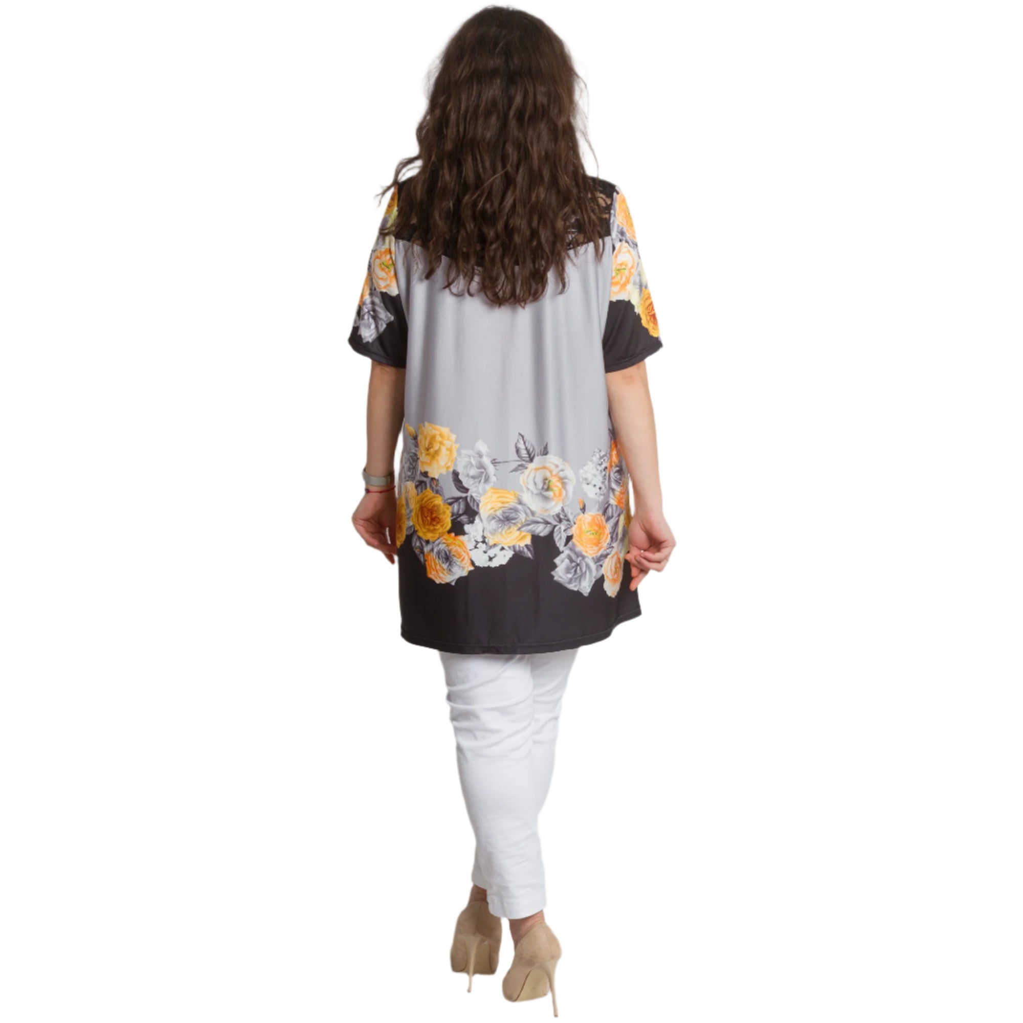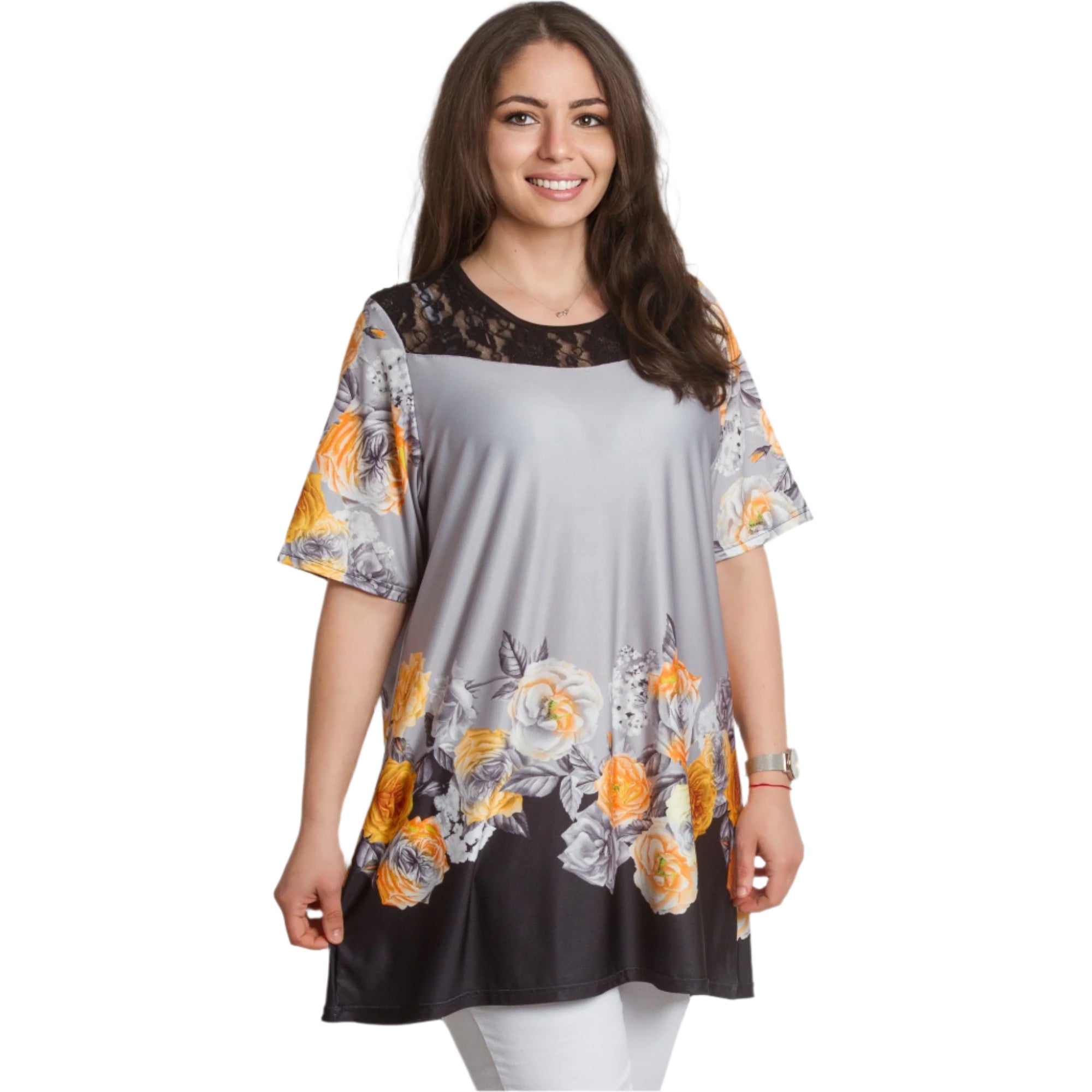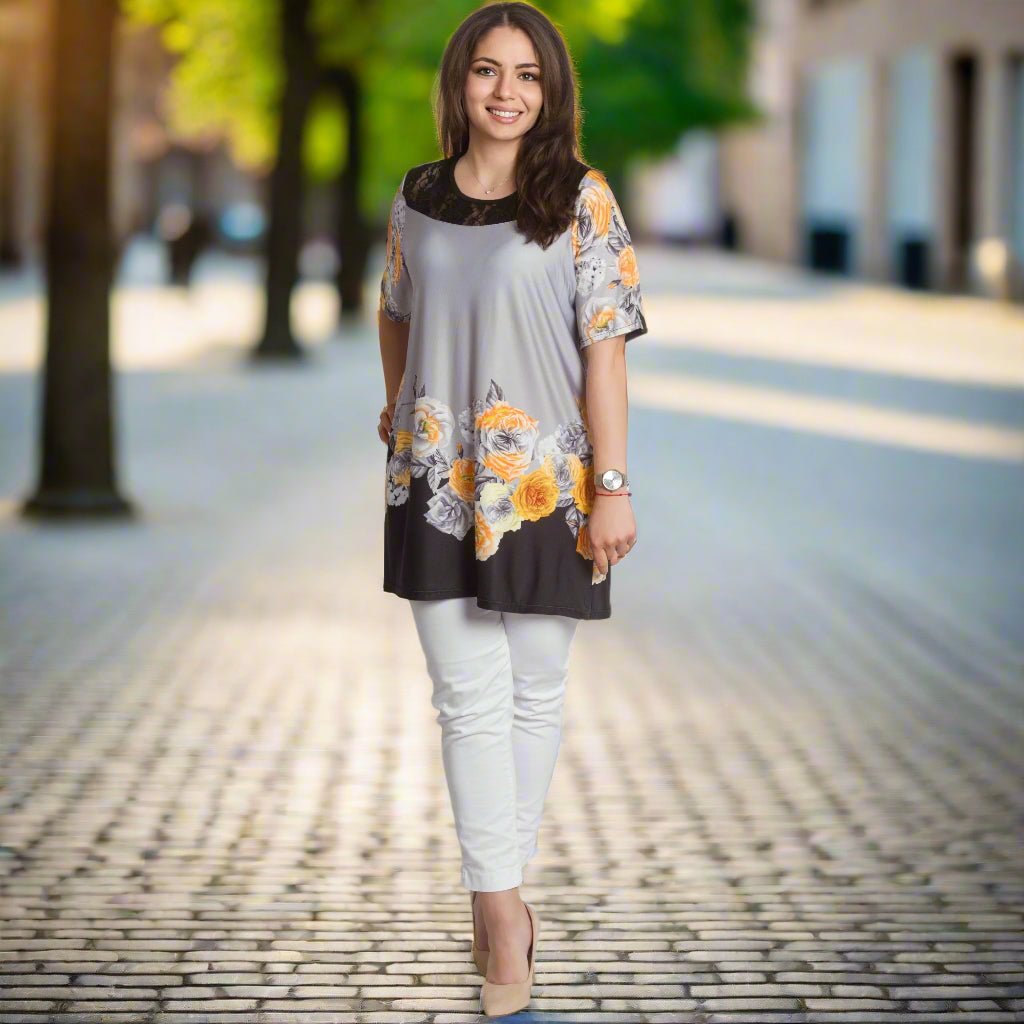 Добавете нотка елегантност към гардероба си с тази изискана сива туника в макси размери. Моделът впечатлява с ефектен бордюр от рози в нюанси на червено и сиво, който придава женственост и стил. Горната част е завършена с деликатен дантелен акцент на деколтето, който придава фин завършек на визията. Туниката е с обло деколте и свободна кройка, която пада ефирно и не очертава тялото, осигурявайки комфорт и увереност. Подходяща е както за официални поводи, така и за стилни ежедневни визии.