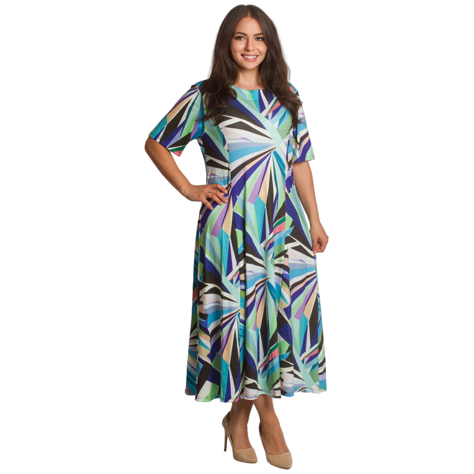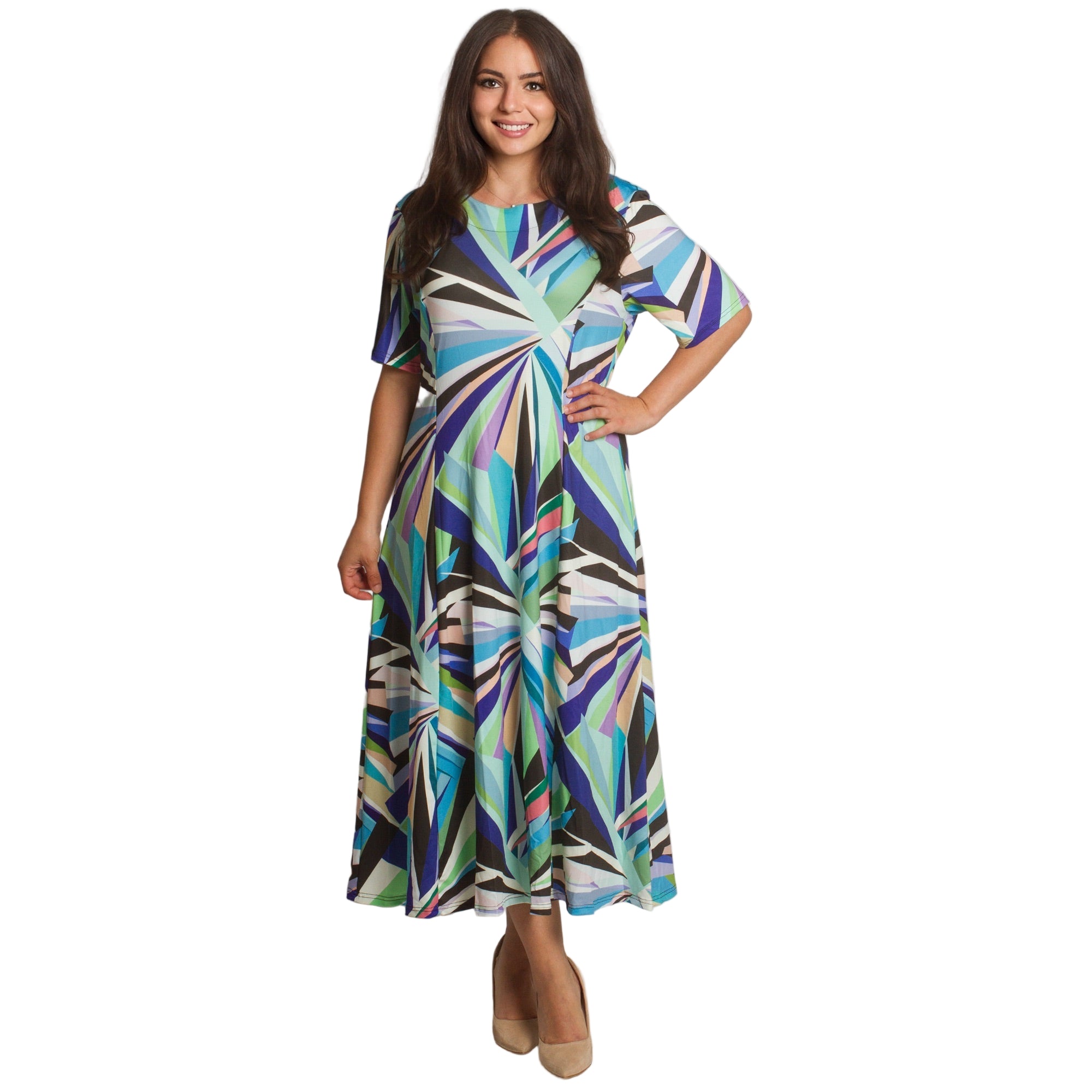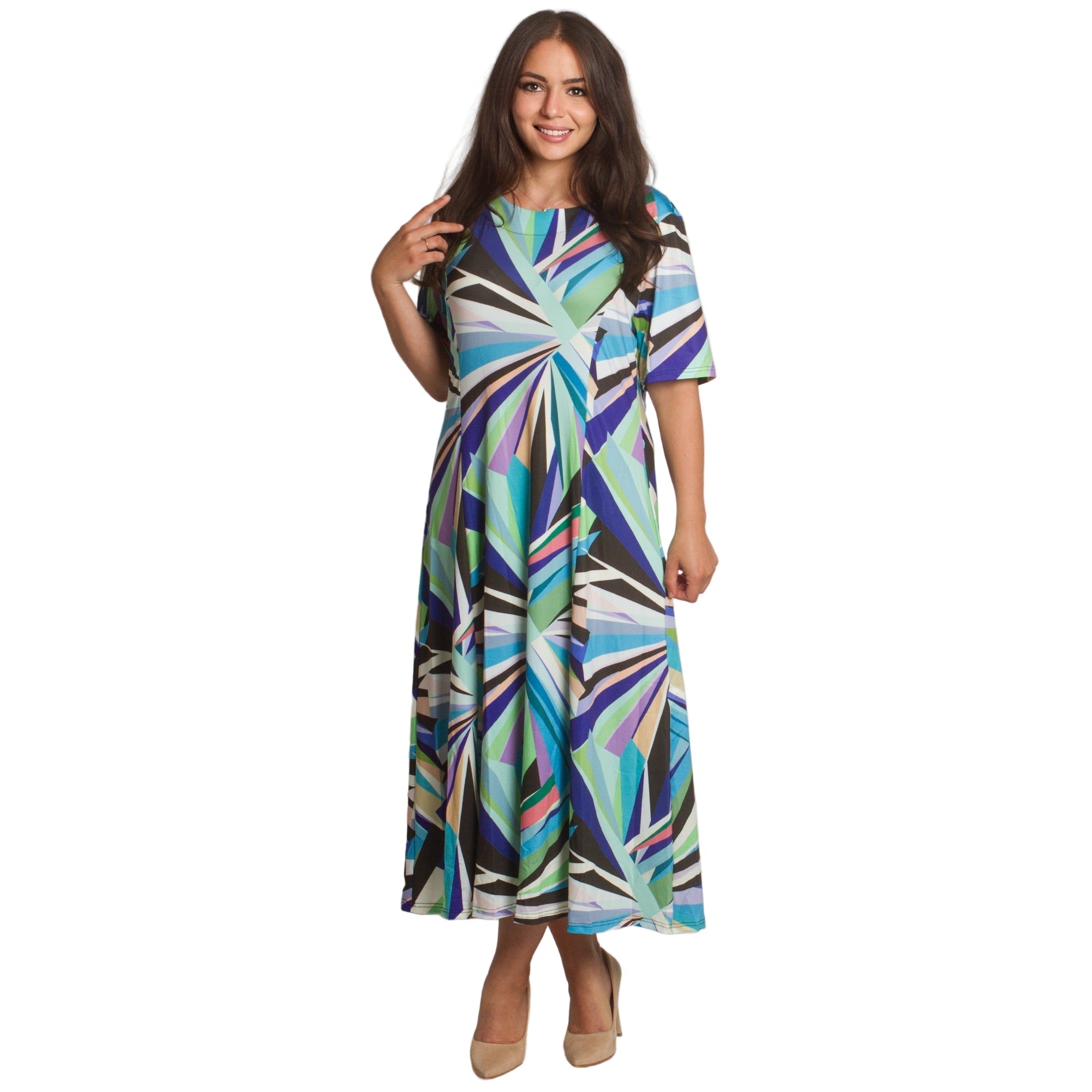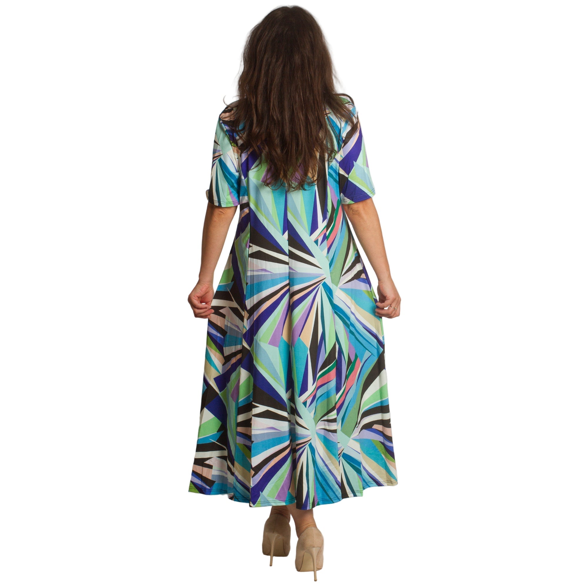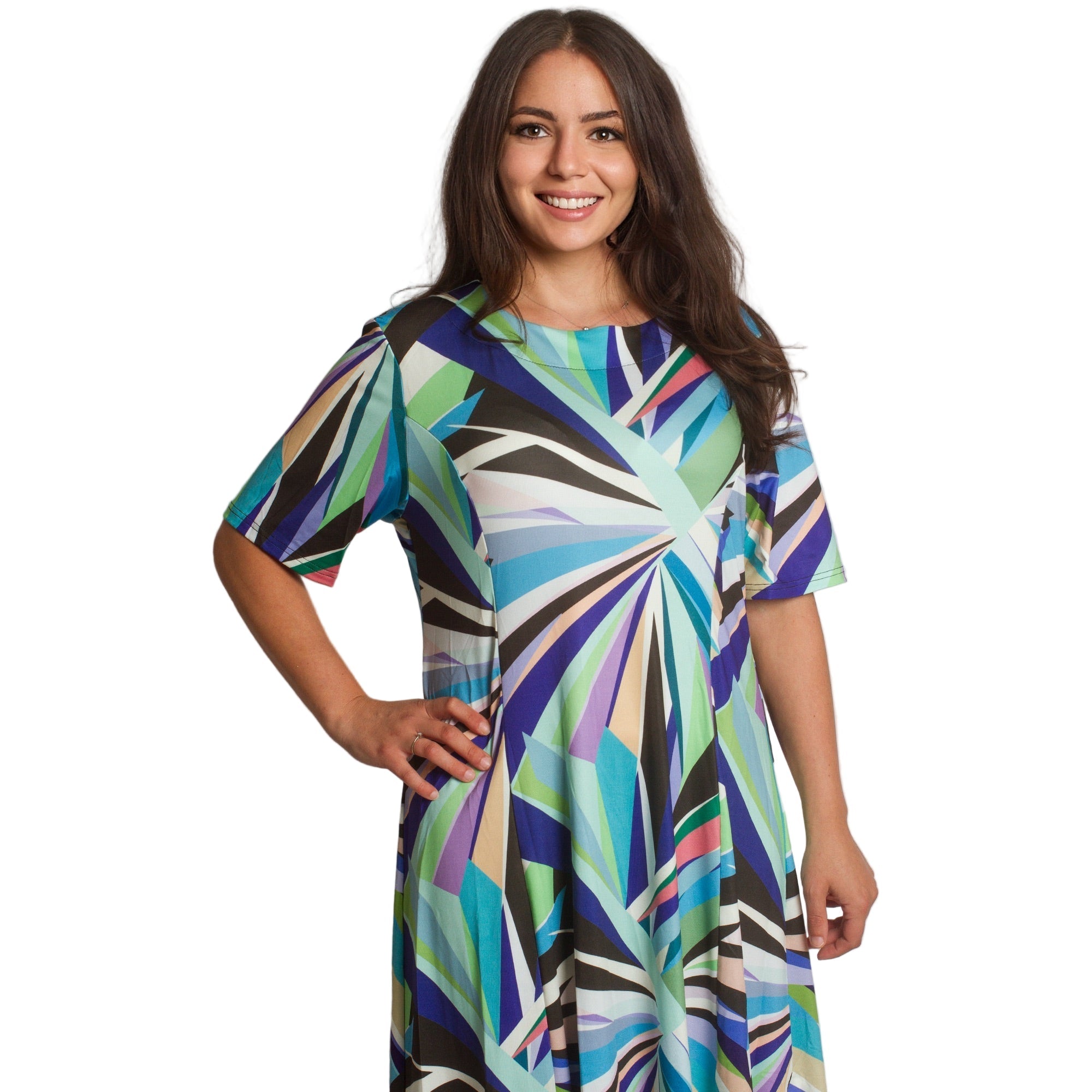 Впечатляваща официална рокля в големи размери с уникален цветен геометричен десен, която съчетава комфорт и елегантност. Моделът е с разкроена кройка, която подчертава талията и прикрива ханша, а меката еластична материя осигурява свобода на движение през целия ден. Със стилни ръкави до лакътя и обло деколте, роклята е перфектен избор за официални събития, тържества или специални поводи.