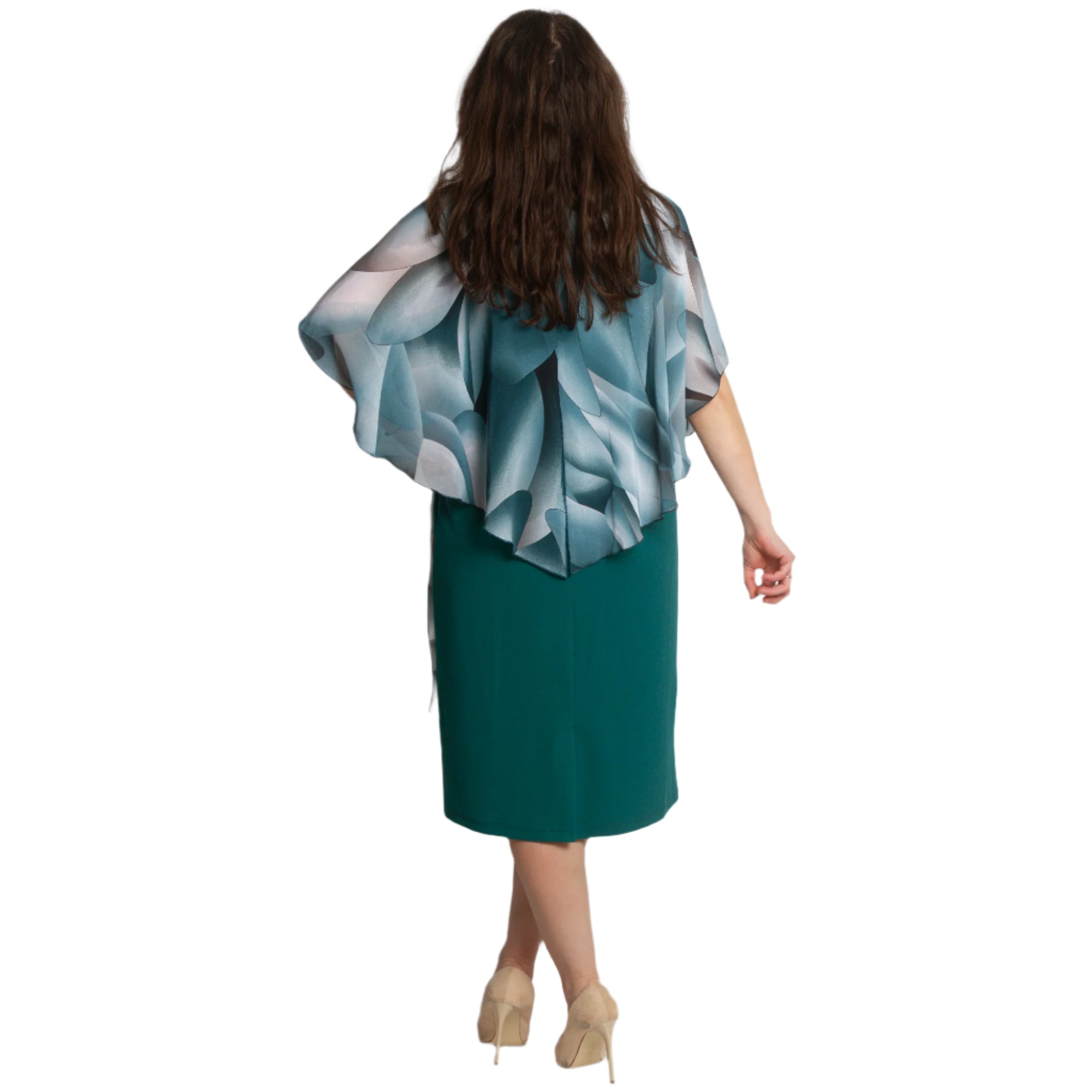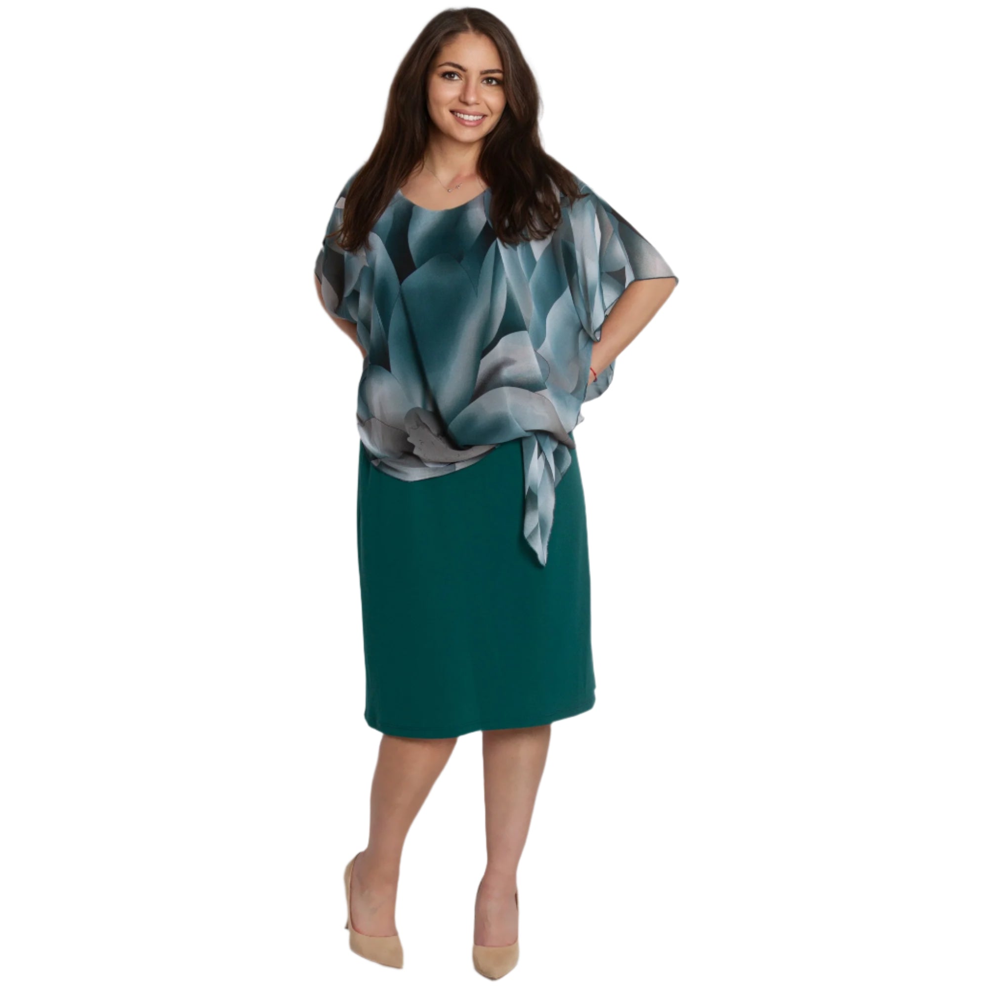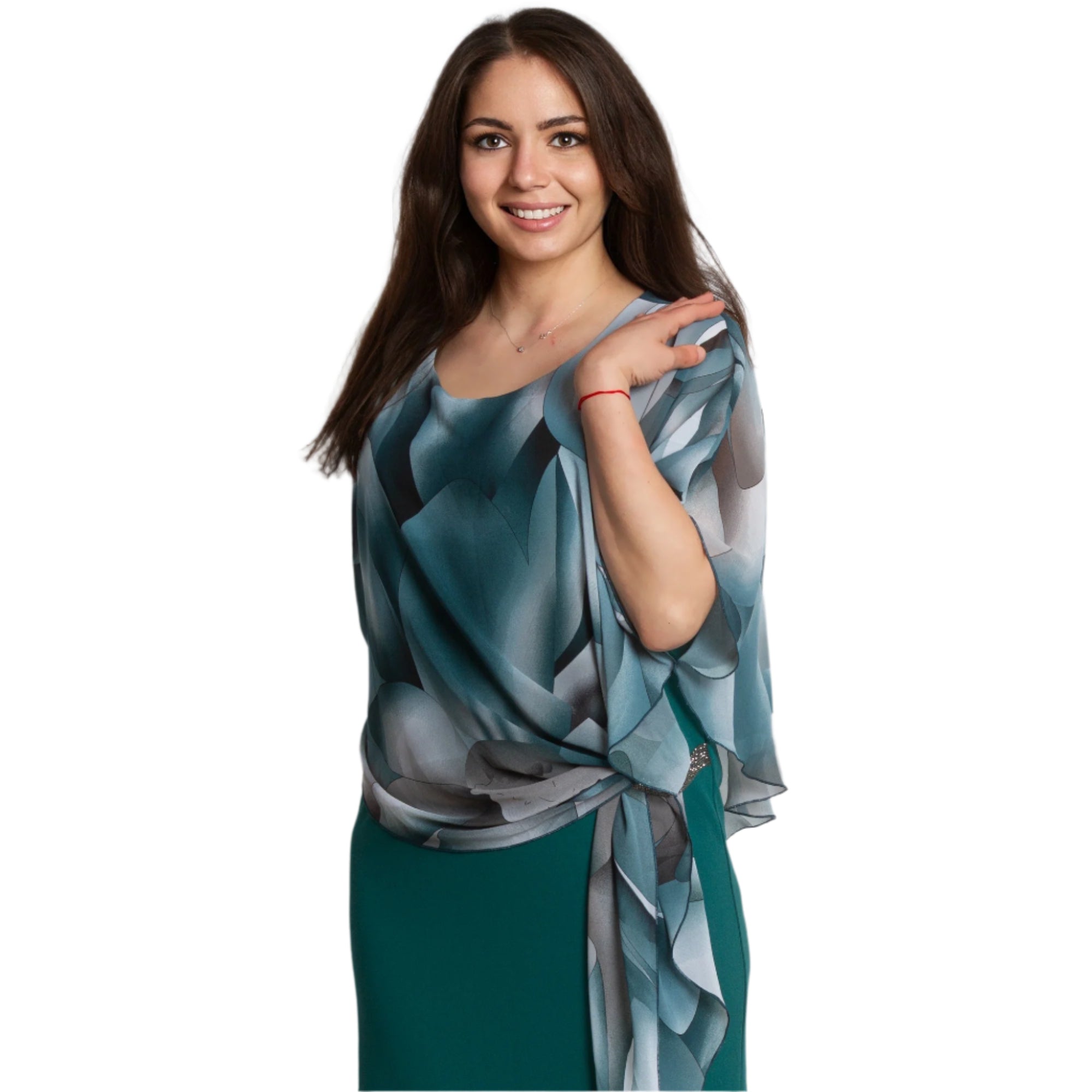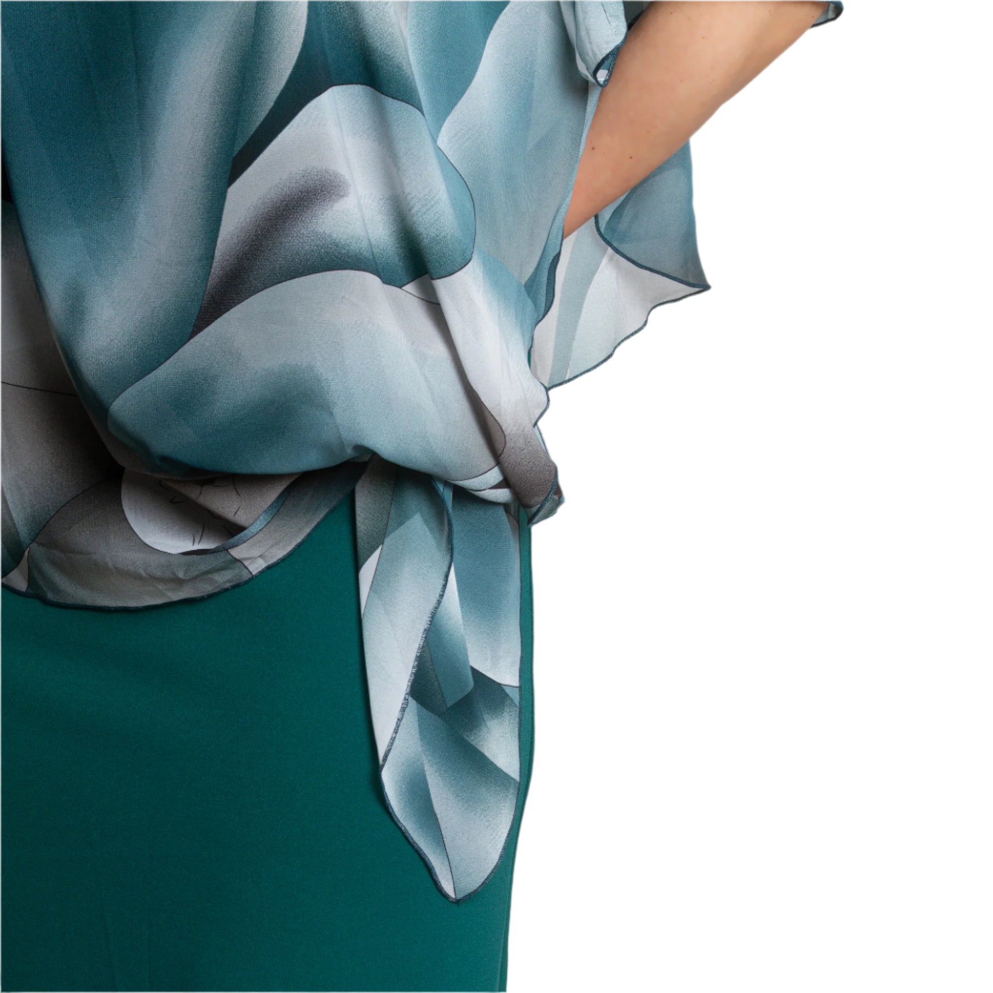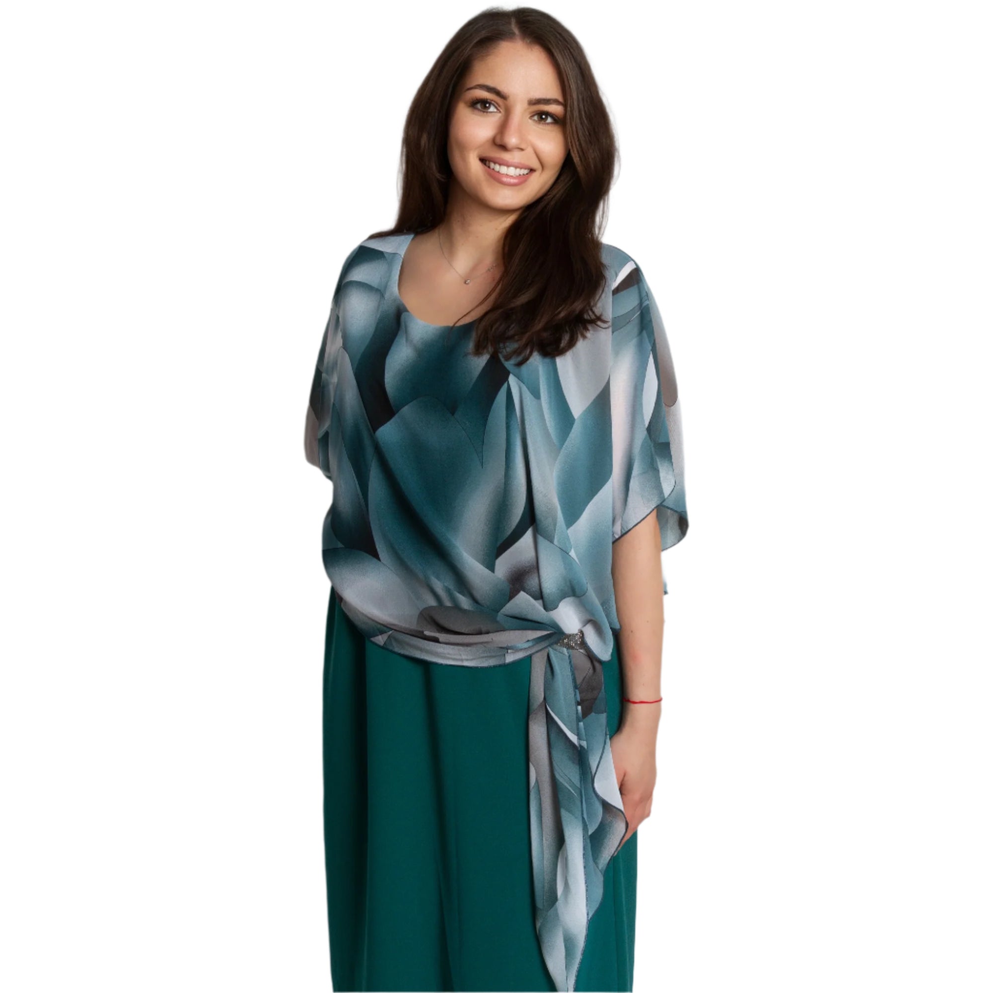 Почувствайте се уверени и елегантни с тази изискана рокля с ефектен шифон в горната част, който красиво се спуска и се завързва отпред. Моделът е с удобна права кройка и изчистена зелена основа, която е допълнена от артистичен принт в сиви и сини нюанси. Подходяща е както за официални поводи, така и за по-елегантни ежедневни събития. Изработена от висококачествена вискоза с еластан за комфорт и свобода на движение.