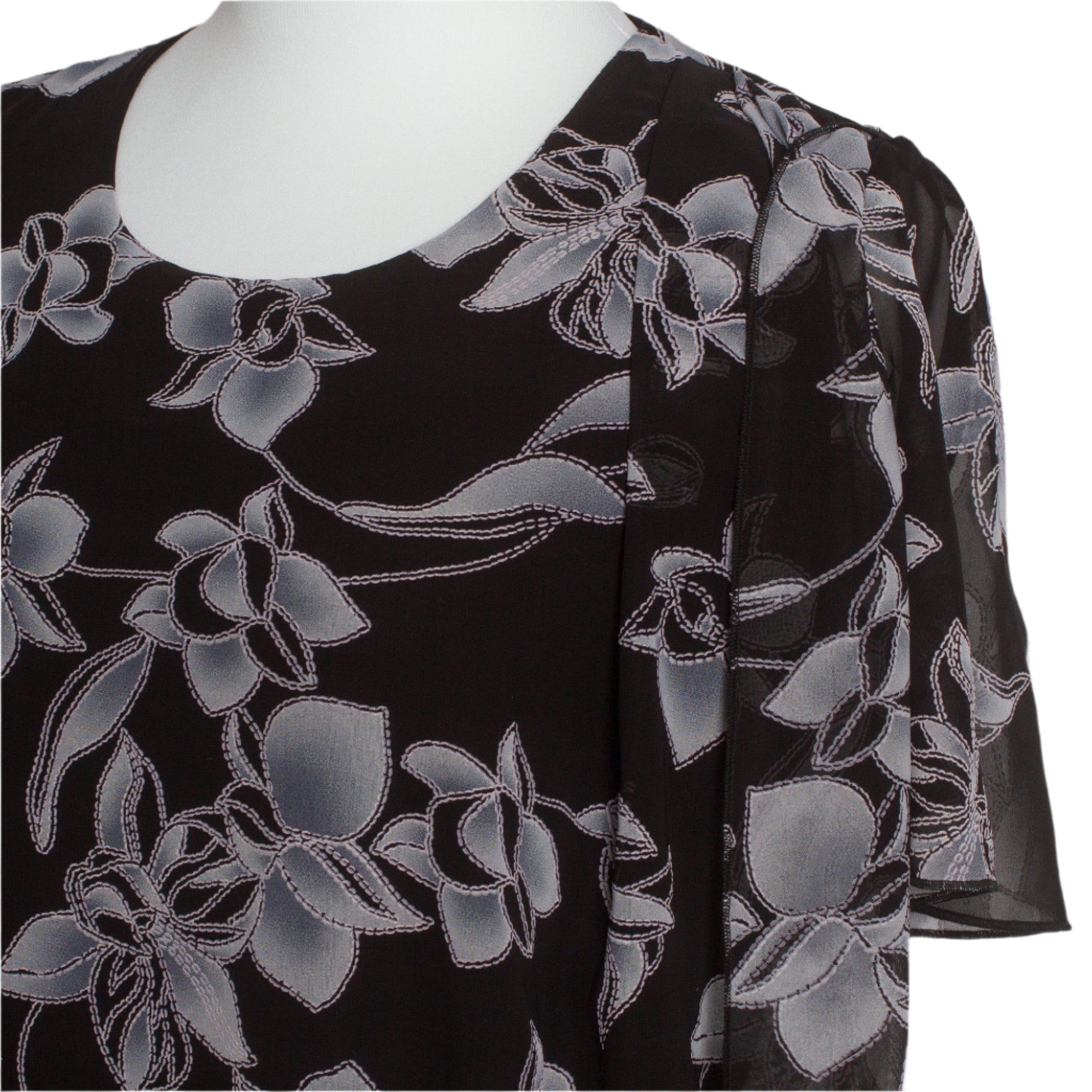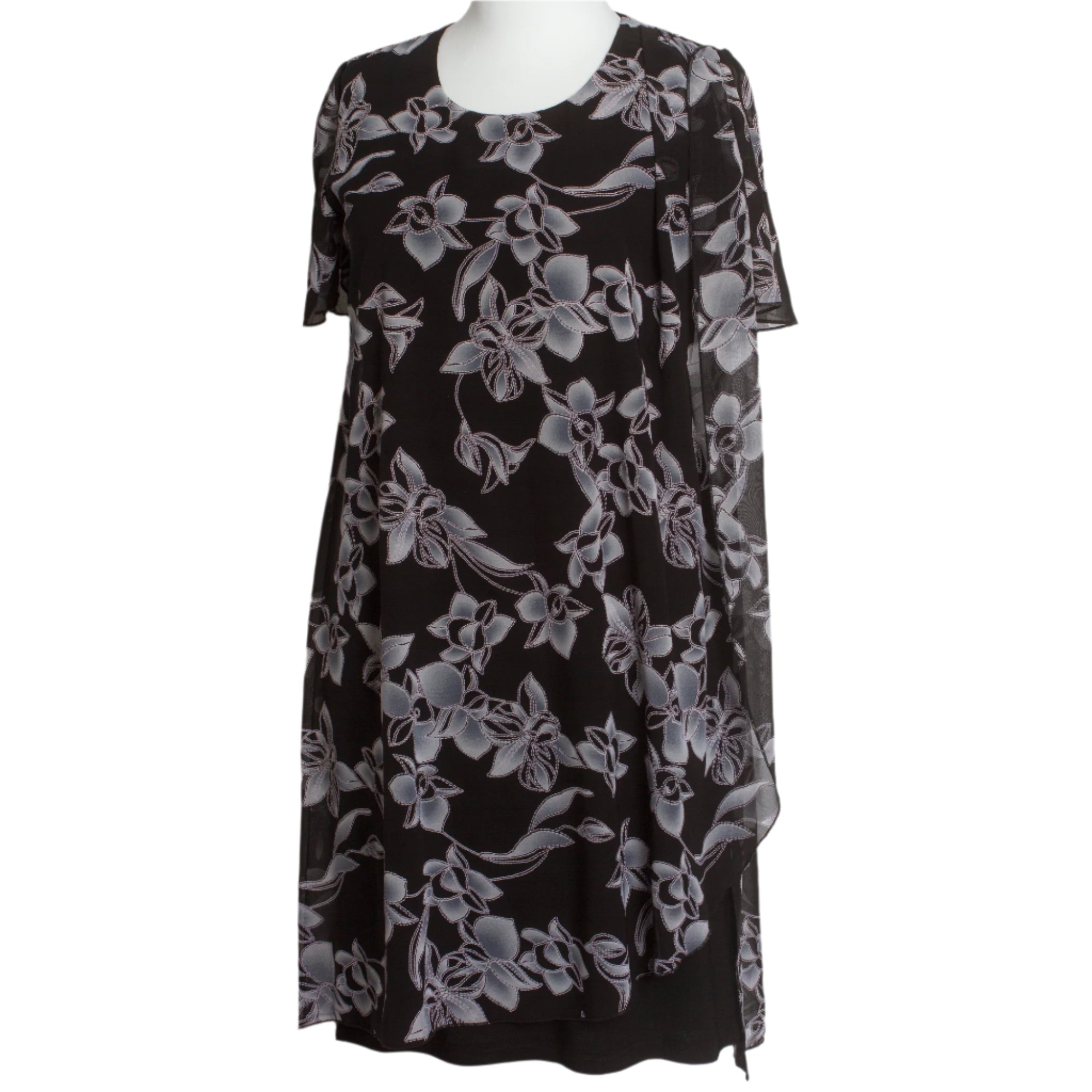 Потопи се в нежността и елегантността с тази изискана черна рокля с ефирен флорален шифон. Изработена с внимание към всяка извивка на тялото, моделът е с права кройка, мека подплата и красиво кръгло деколте. Леката полупрозрачна материя придава женственост и стил, а удобната дължина и свободна линия я правят идеална за специални поводи.