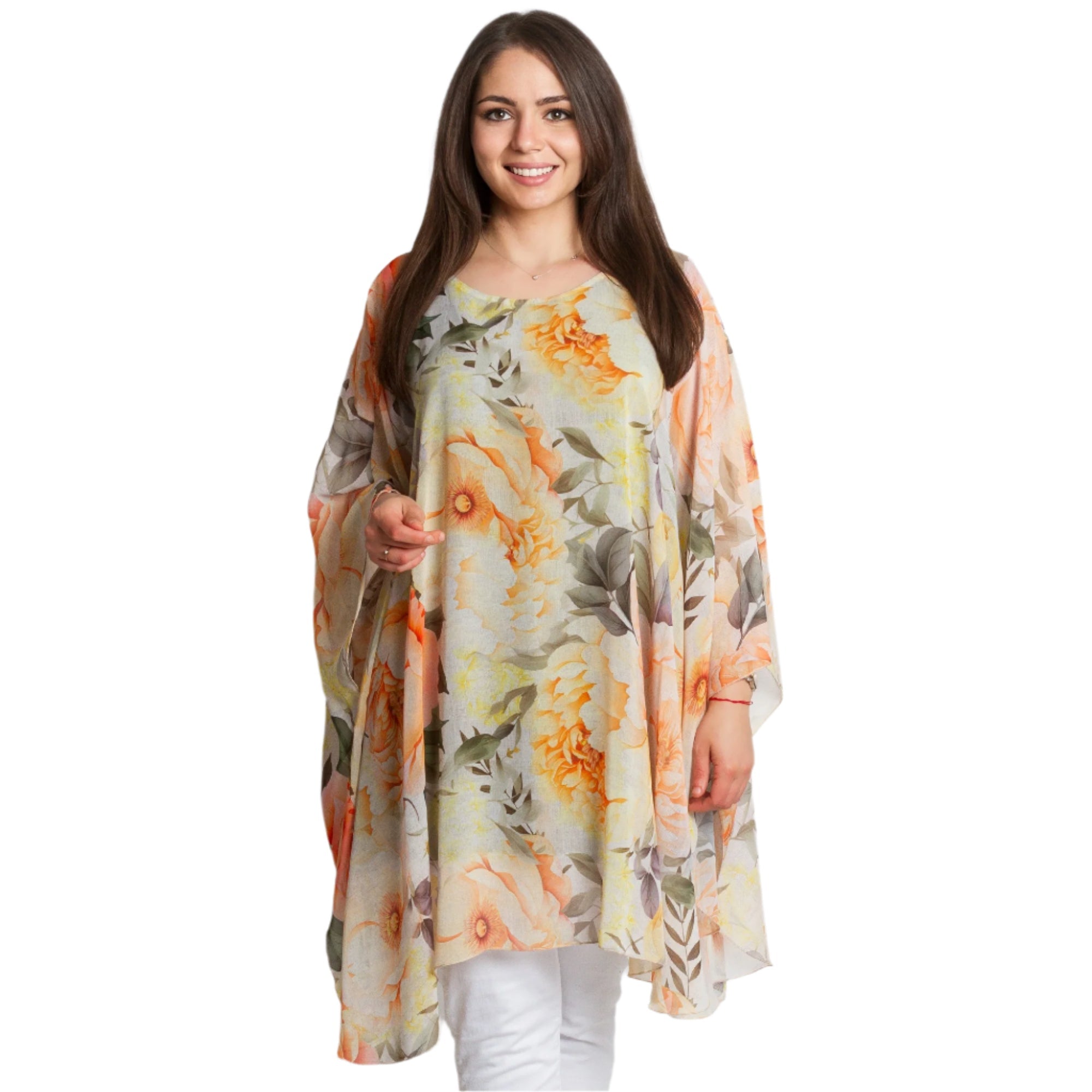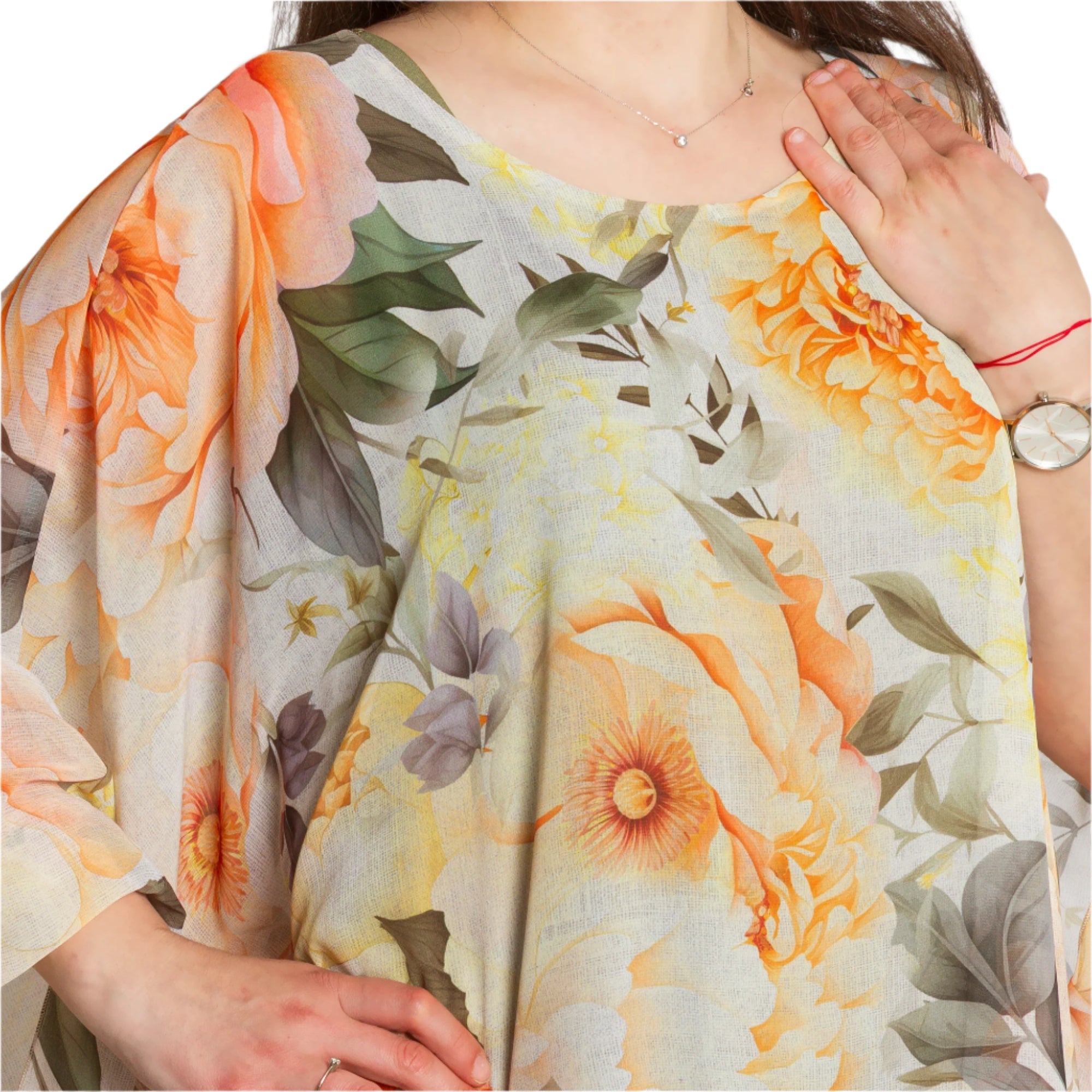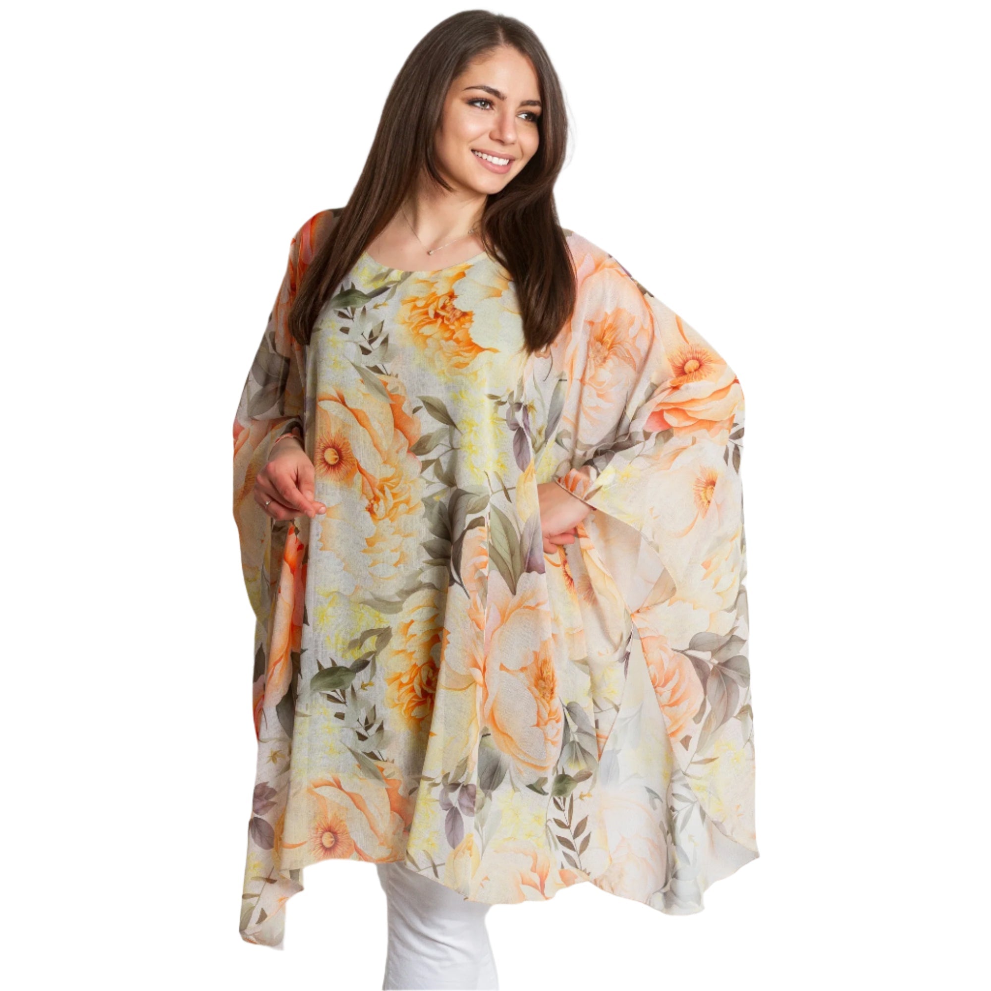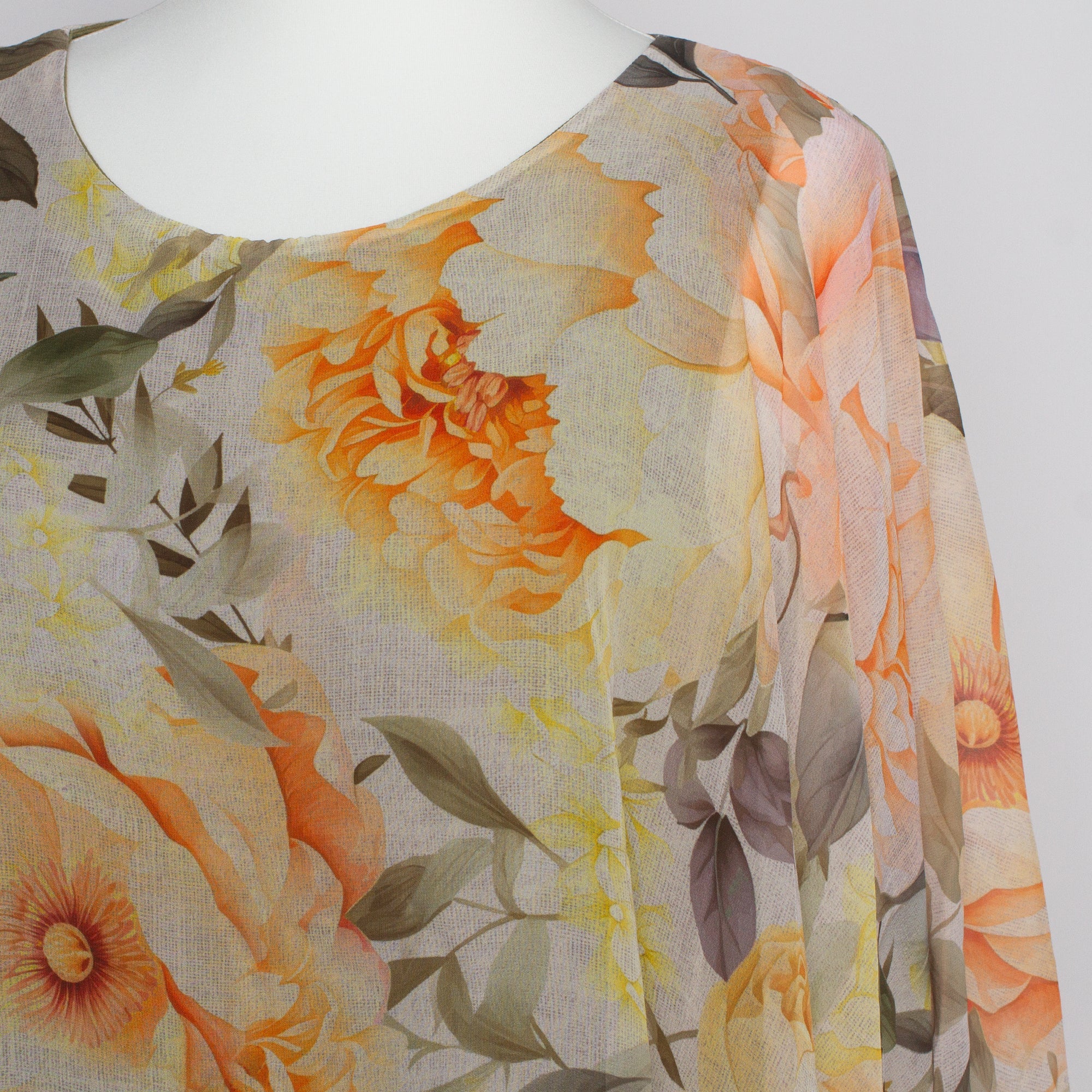 Добавете нотка нежност и елегантност към официалния си стил с тази шифонена туника с подплата. Моделът е изработен от висококачествена материя с преобладаващи оранжеви и жълти флорални мотиви, подходяща за специални поводи или ежедневна елегантност. Свободната кройка осигурява комфорт и свобода на движение, а подплатата от вискоза придава приятно усещане върху кожата.