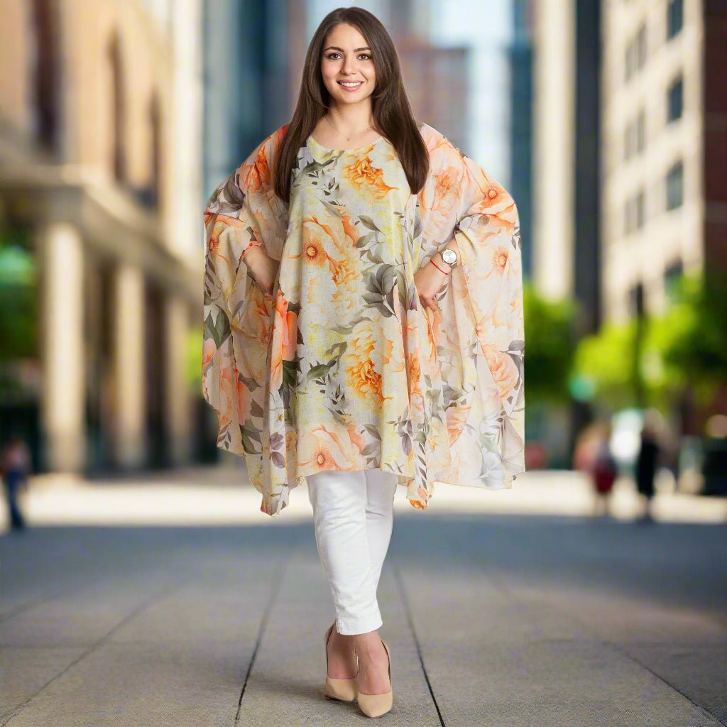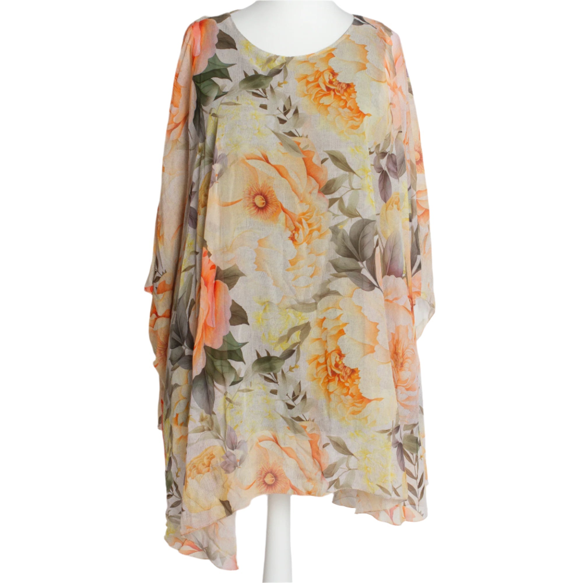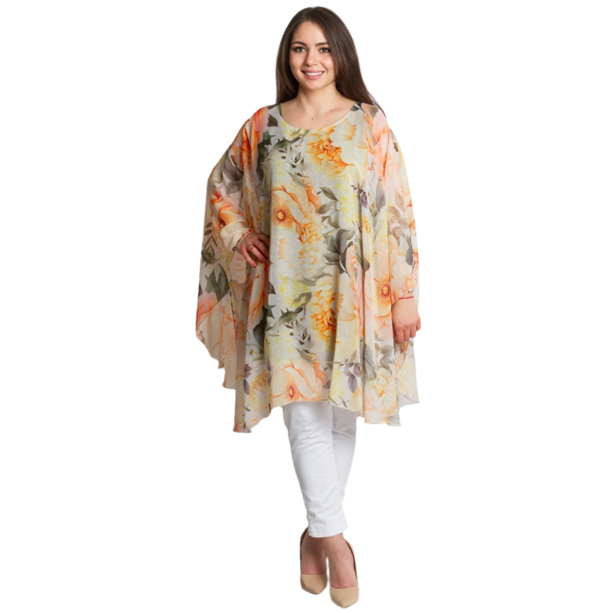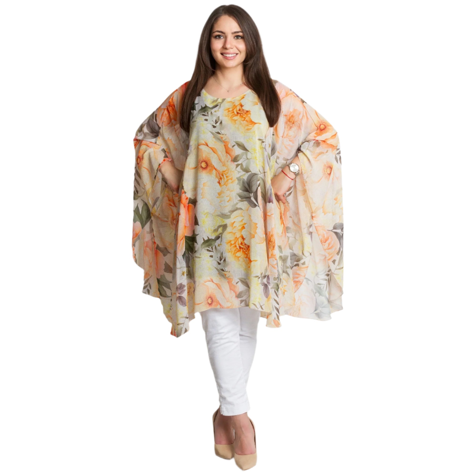 Добавете нотка нежност и елегантност към официалния си стил с тази шифонена туника с подплата. Моделът е изработен от висококачествена материя с преобладаващи оранжеви и жълти флорални мотиви, подходяща за специални поводи или ежедневна елегантност. Свободната кройка осигурява комфорт и свобода на движение, а подплатата от вискоза придава приятно усещане върху кожата.