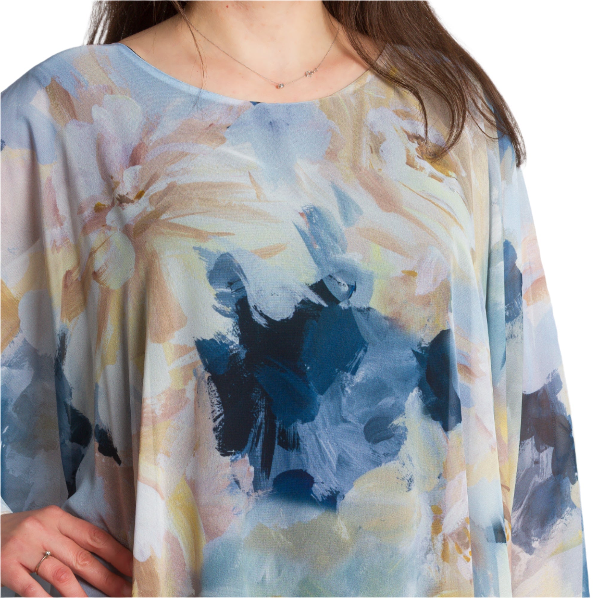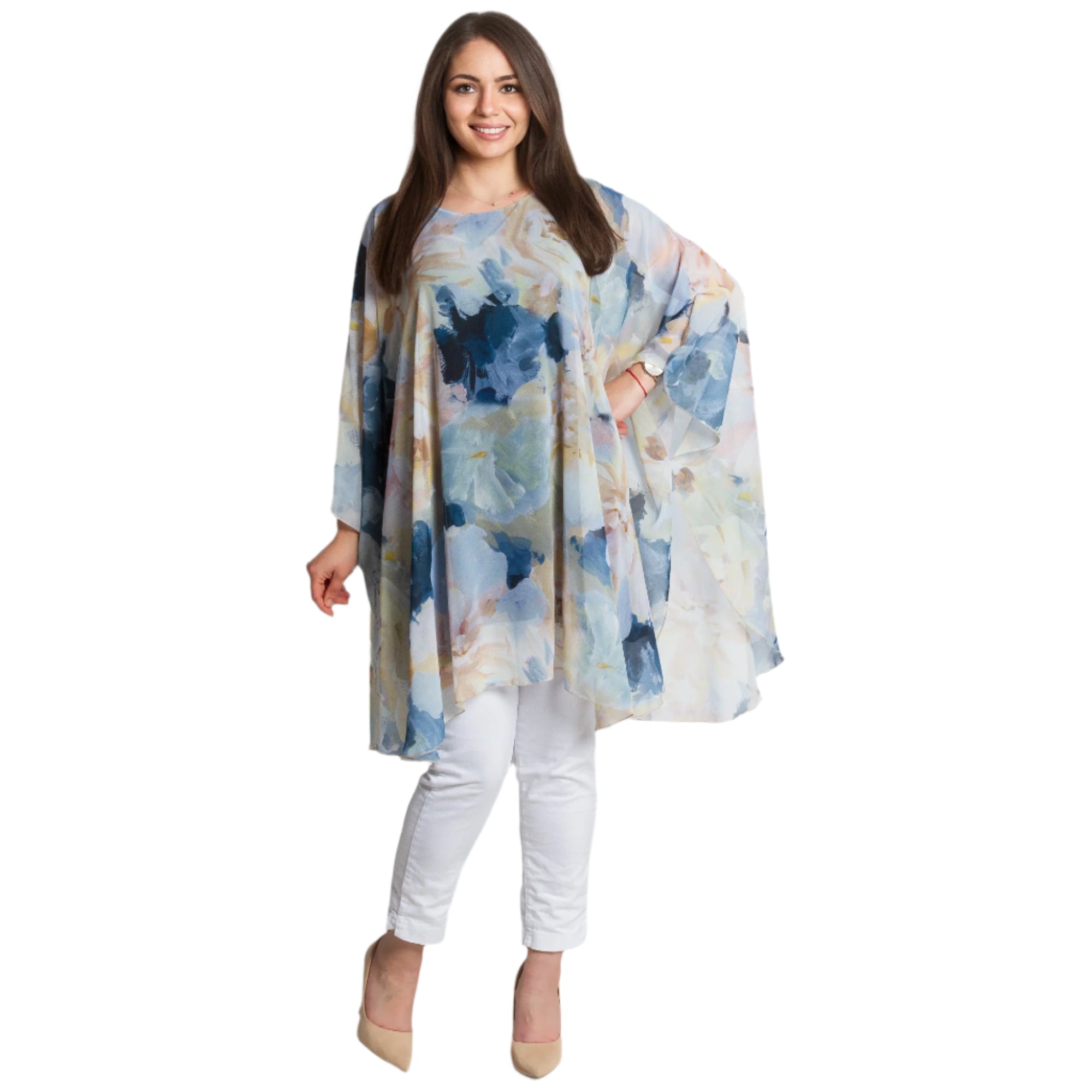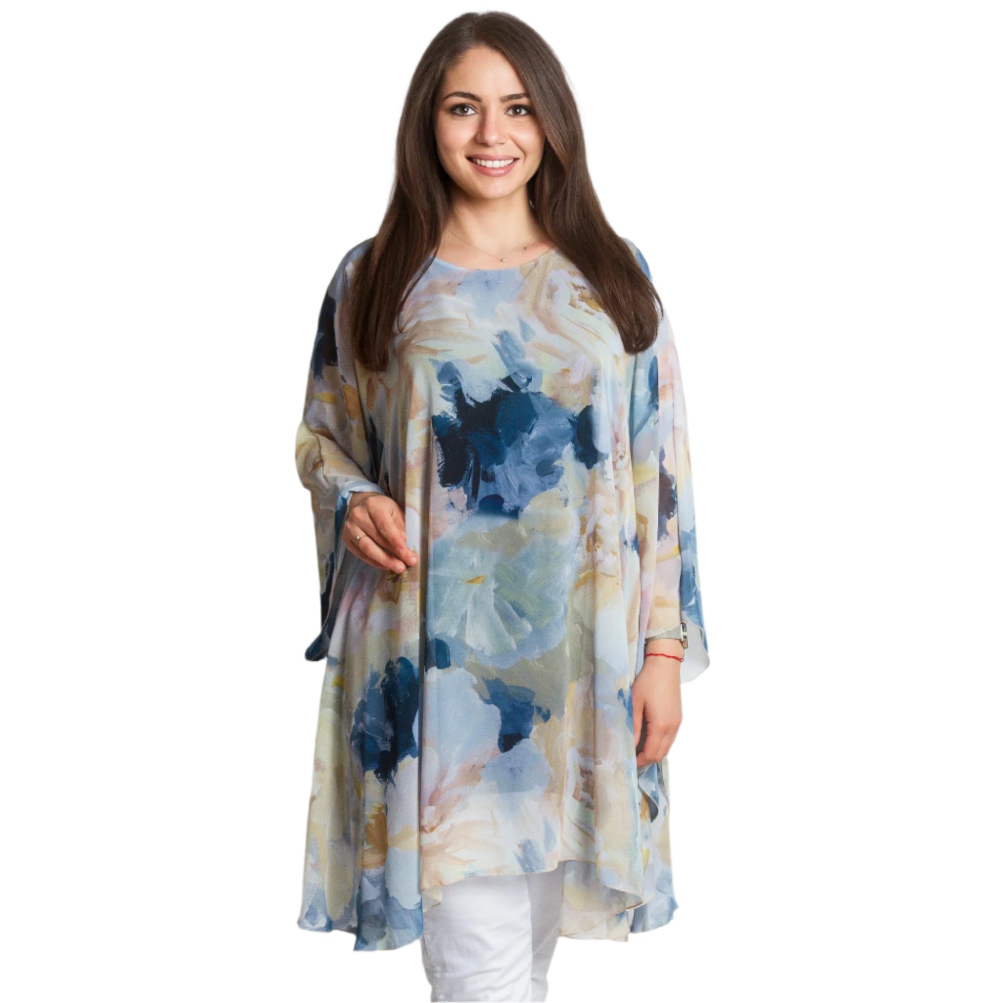 Изразителна и елегантна, тази туника с артистичен флорален десен в сини и пастелни тонове е създадена за жени с вкус към красивото. С ефирна горна част от шифон и подплата от мека вискоза, моделът е създаден със свободна кройка, която осигурява комфорт и свобода на движение. Облото деколте и широките ръкави подчертават лекотата на силуета, като добавят нотка романтика и изтънченост. Перфектен избор за официални събития, празници или елегантни срещи.