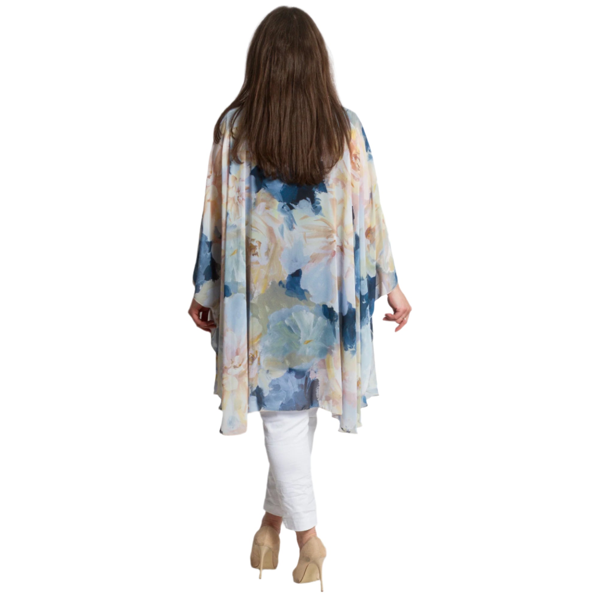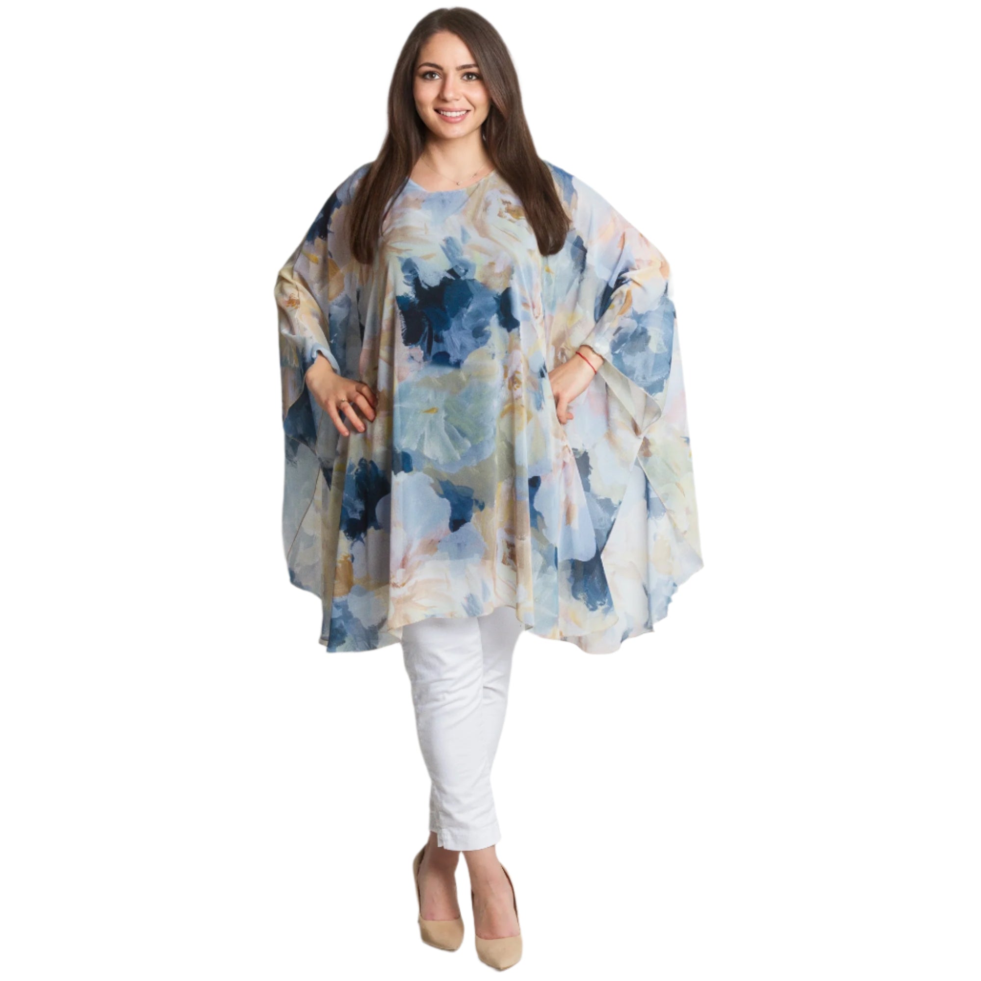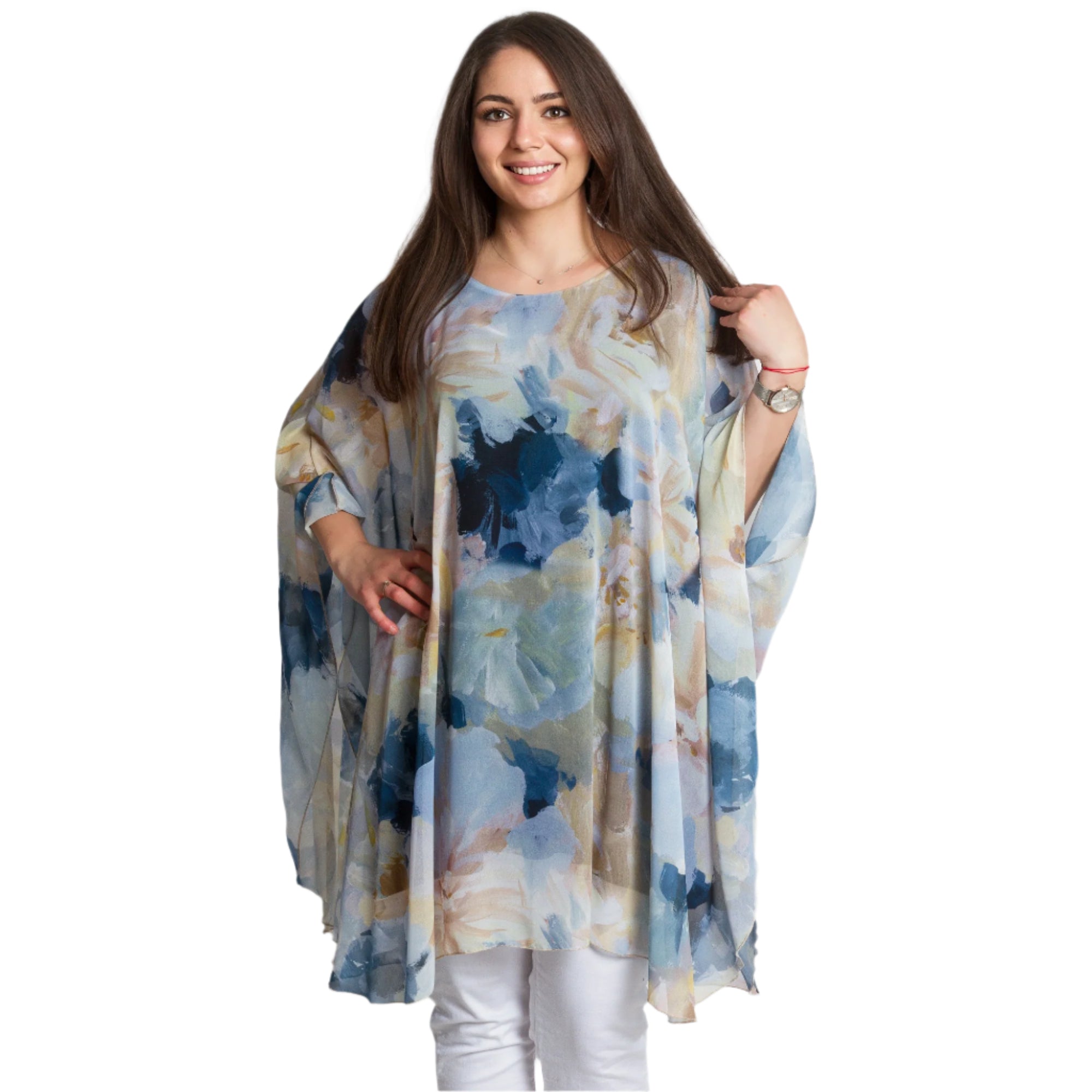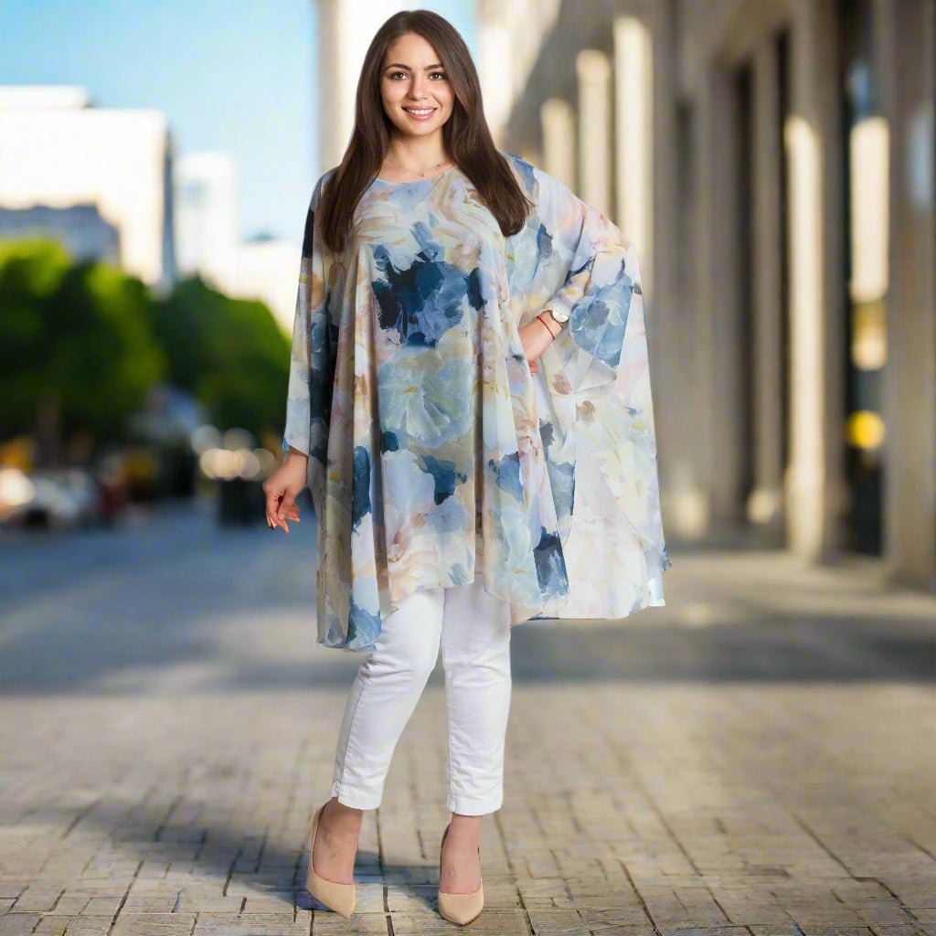 Изразителна и елегантна, тази туника с артистичен флорален десен в сини и пастелни тонове е създадена за жени с вкус към красивото. С ефирна горна част от шифон и подплата от мека вискоза, моделът е създаден със свободна кройка, която осигурява комфорт и свобода на движение. Облото деколте и широките ръкави подчертават лекотата на силуета, като добавят нотка романтика и изтънченост. Перфектен избор за официални събития, празници или елегантни срещи.