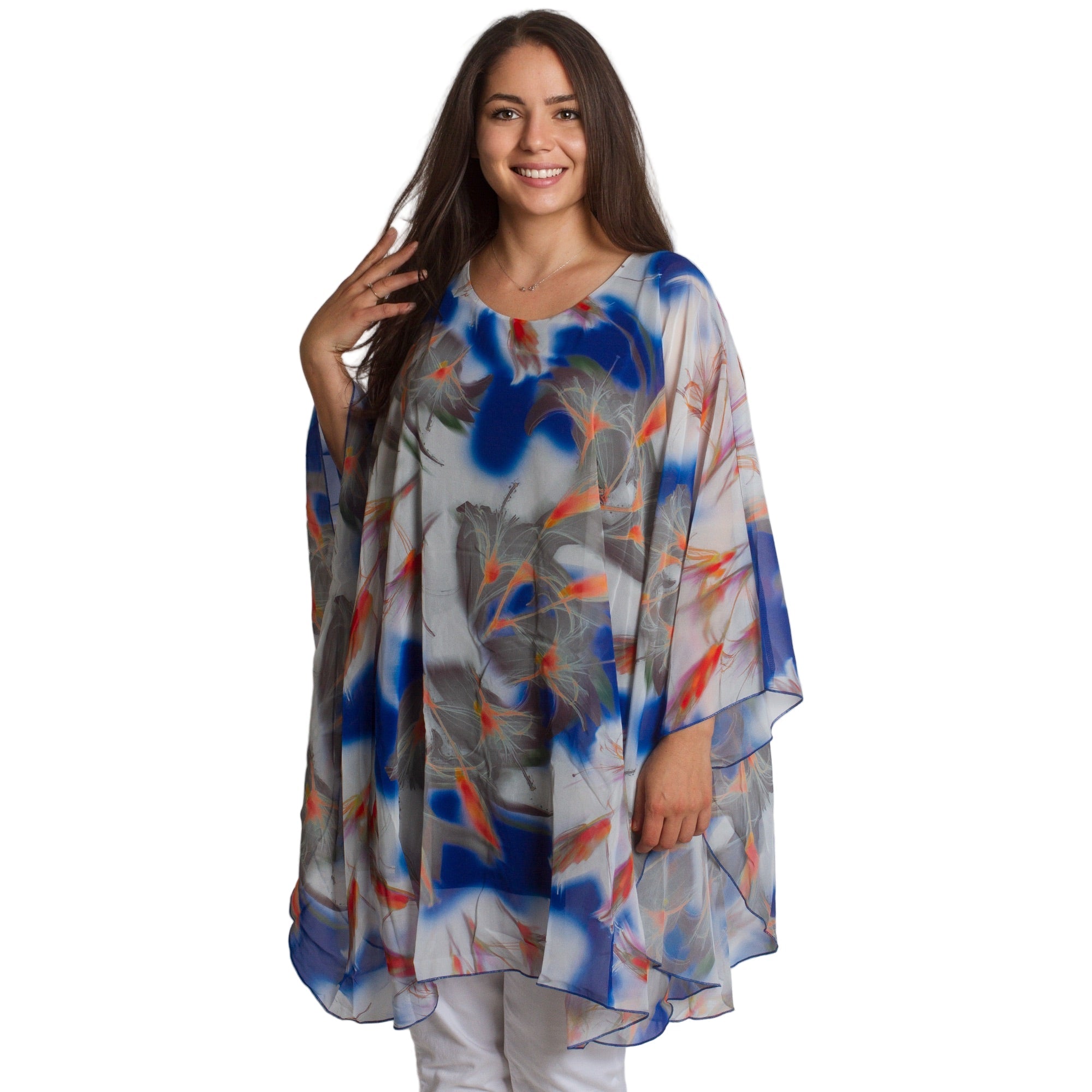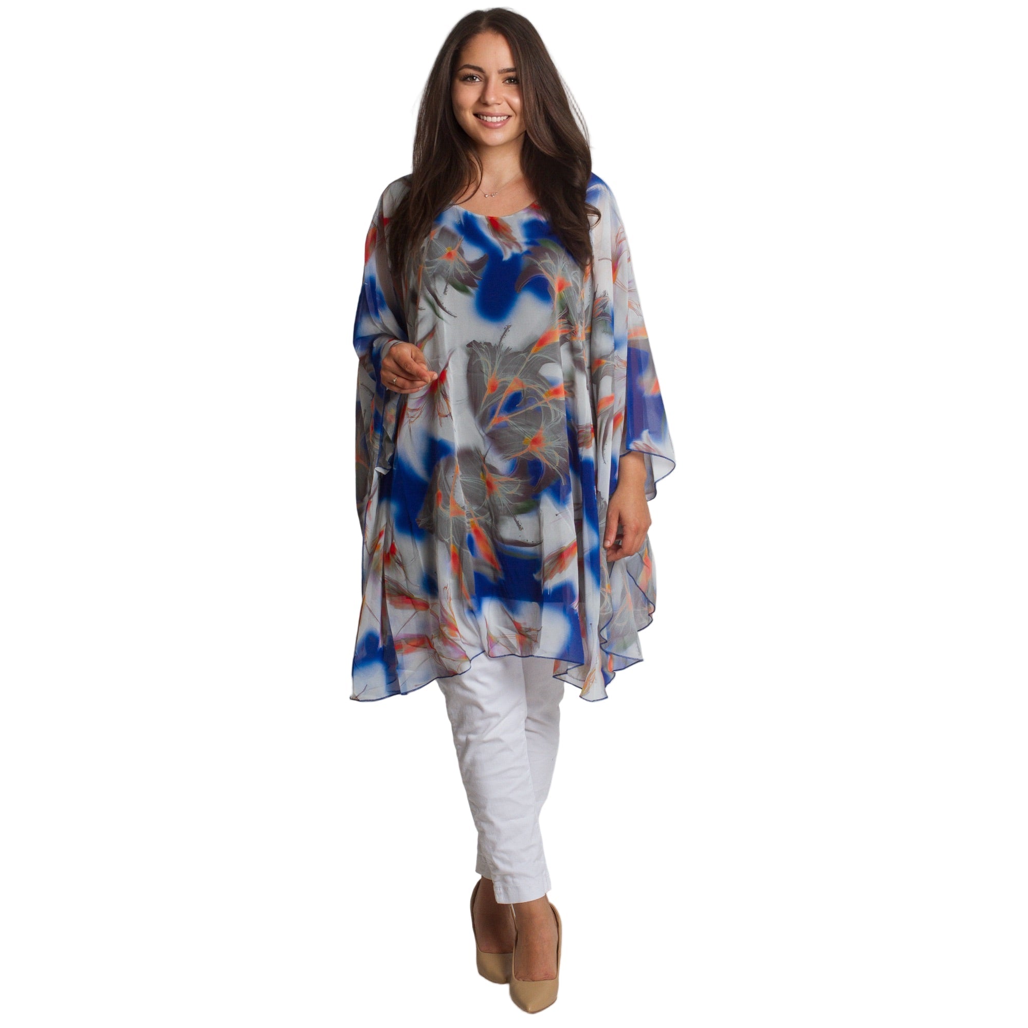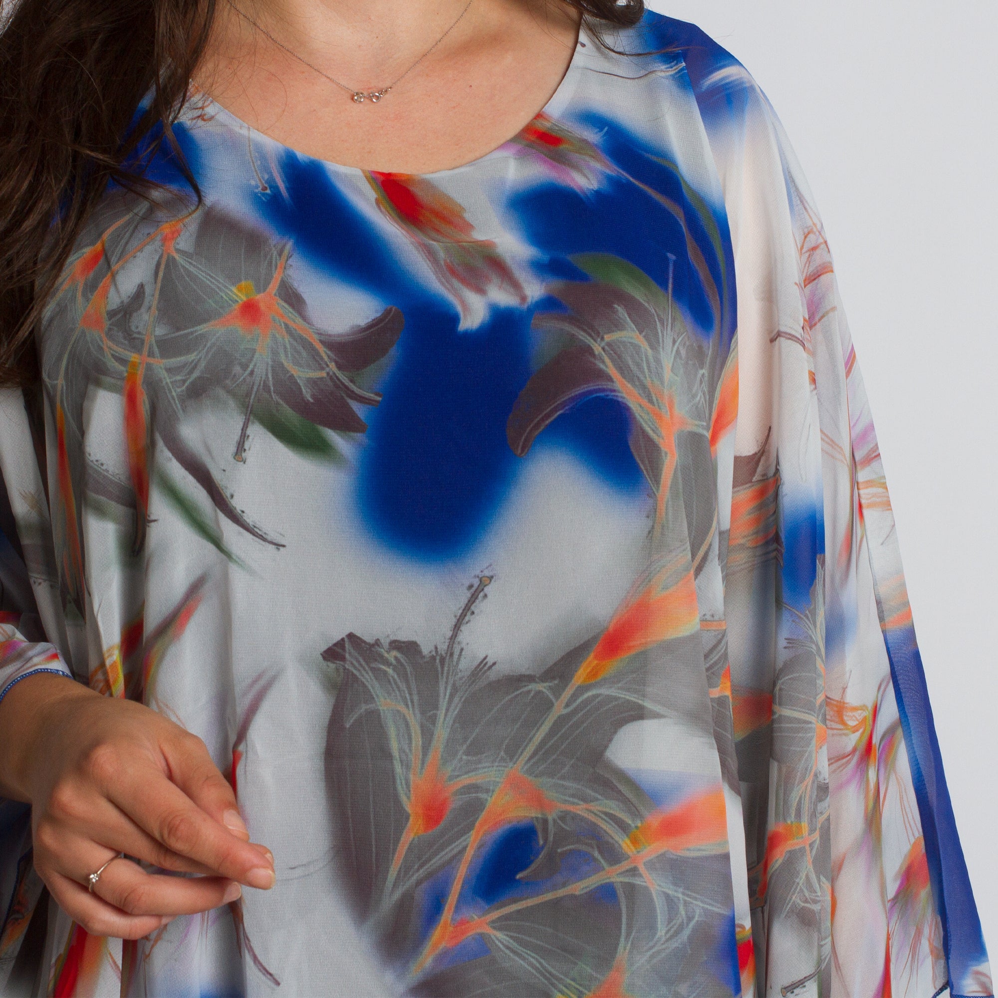 Подарете си комфорт и стил с тази елегантна туника в големи размери, изработена от ефирен шифон в абстрактен синьо-сив десен с флорални нотки. Подплатата от вискоза осигурява комфорт и непрозрачност, а разкроената свободна кройка прикрива нежно ханша и корема. Моделът е идеален избор за официални поводи, тържества и празнични вечери.
