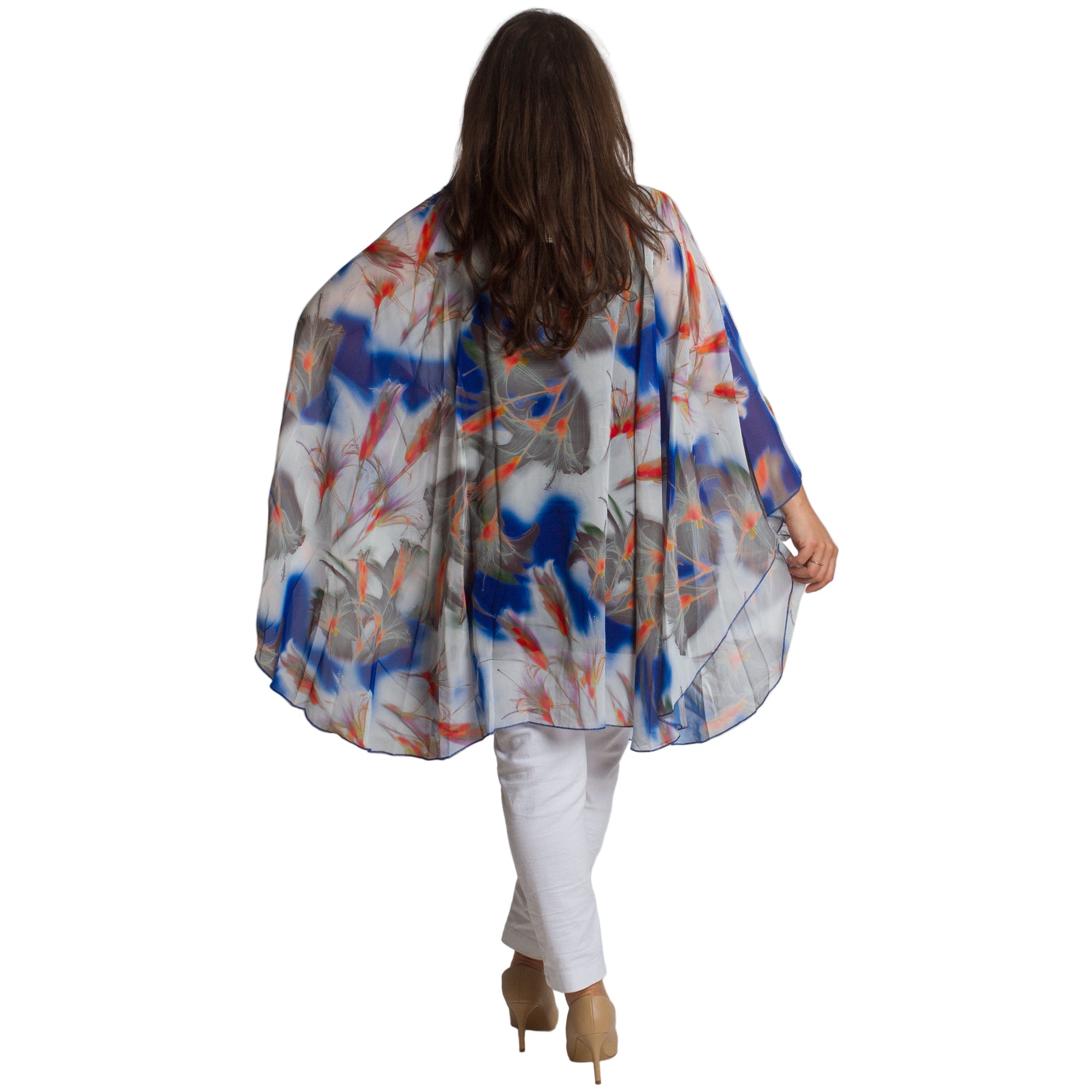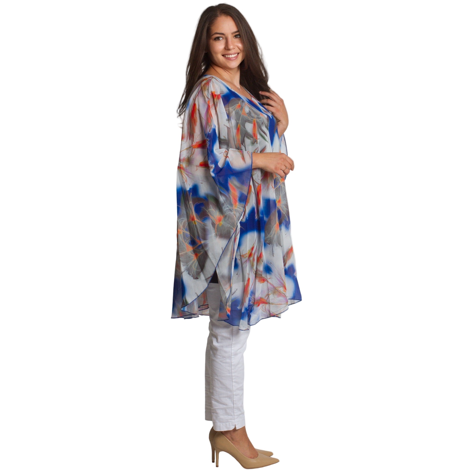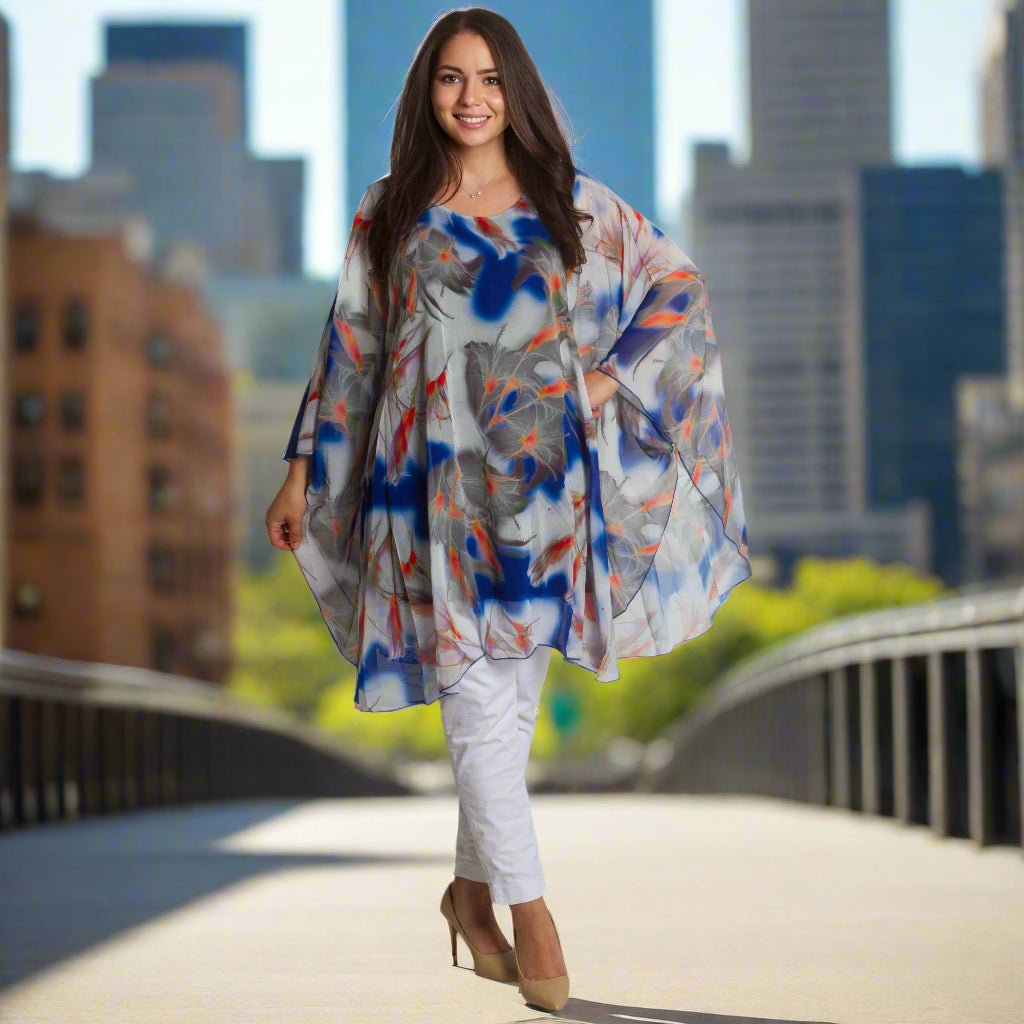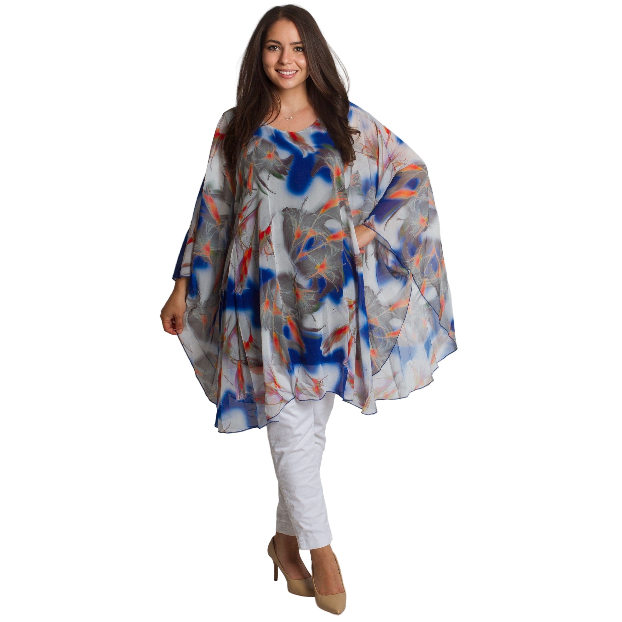 Подарете си комфорт и стил с тази елегантна туника в големи размери, изработена от ефирен шифон в абстрактен синьо-сив десен с флорални нотки. Подплатата от вискоза осигурява комфорт и непрозрачност, а разкроената свободна кройка прикрива нежно ханша и корема. Моделът е идеален избор за официални поводи, тържества и празнични вечери.