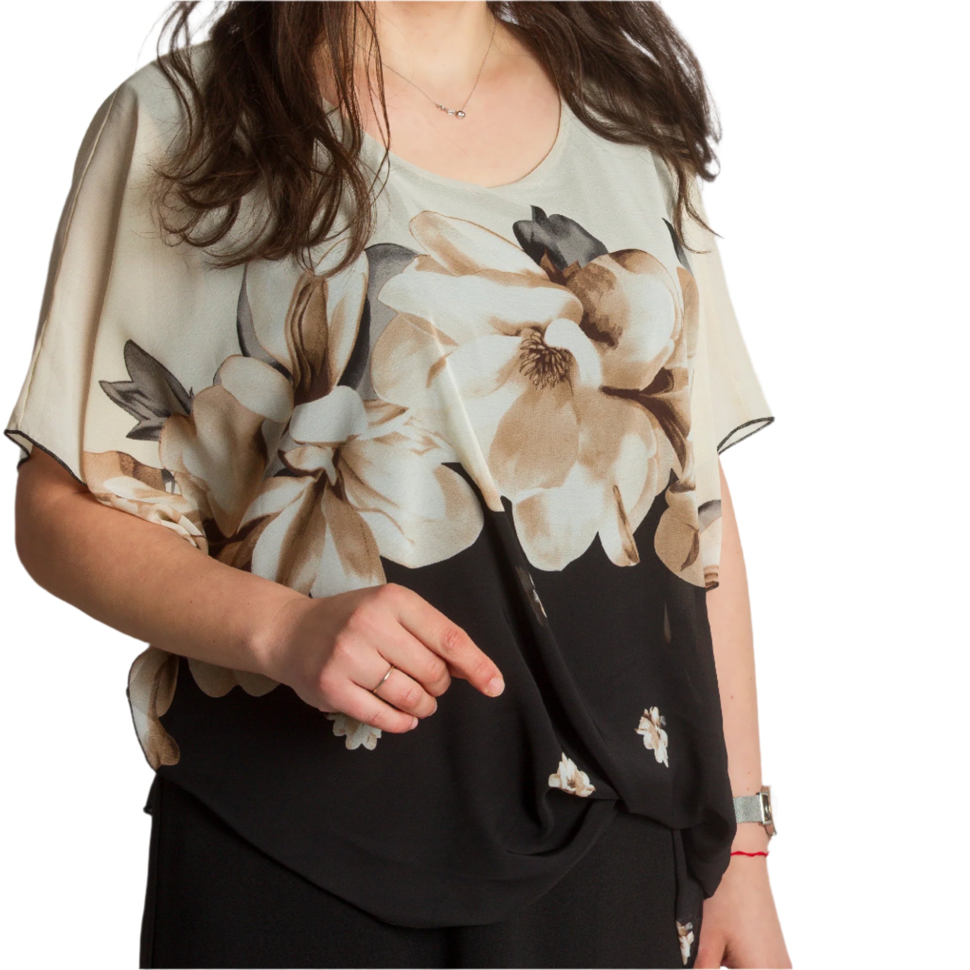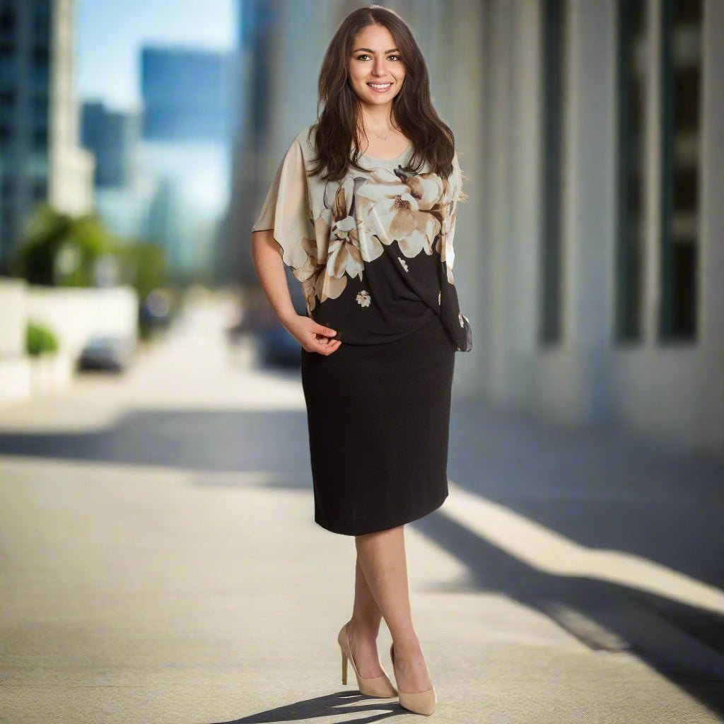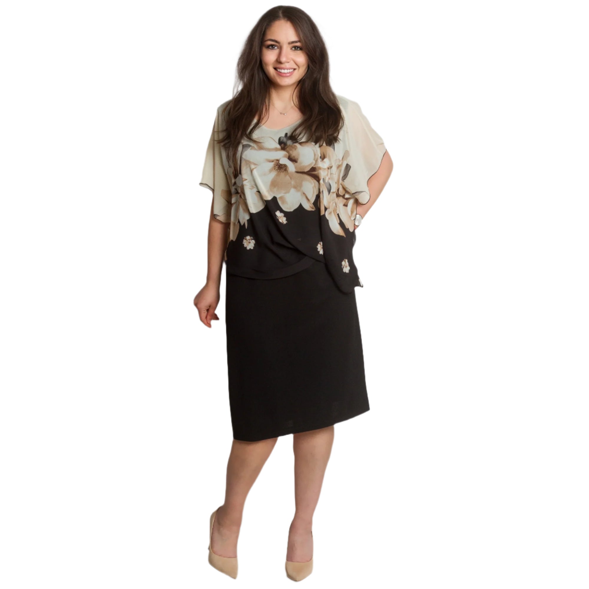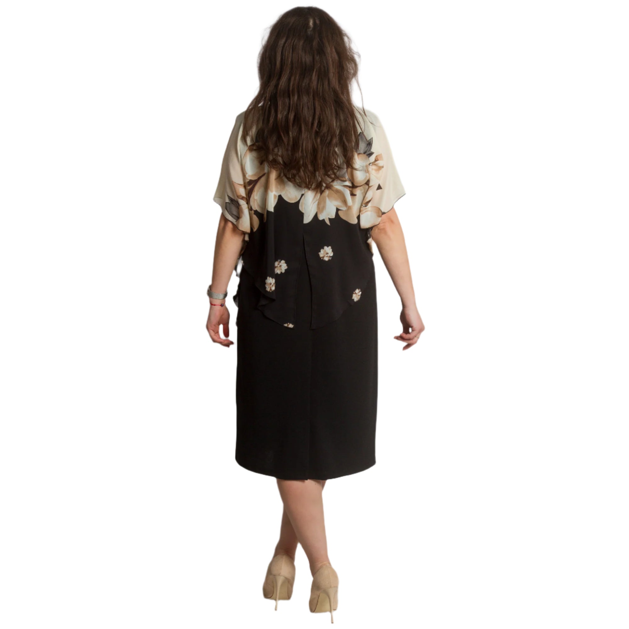 Почувствайте се женствено и елегантно с тази впечатляваща официална рокля с ефектен флорален шифон в неутрални бежово-черни тонове. Горната част е изработена от лек и ефирен шифон с красив цветен мотив, който придава изтънченост и стил. Късите ръкави и свободната линия предлагат удобство, дори в най-официалната обстановка. Роклята е перфектният избор за специални поводи, официални вечери или семейни празници.
