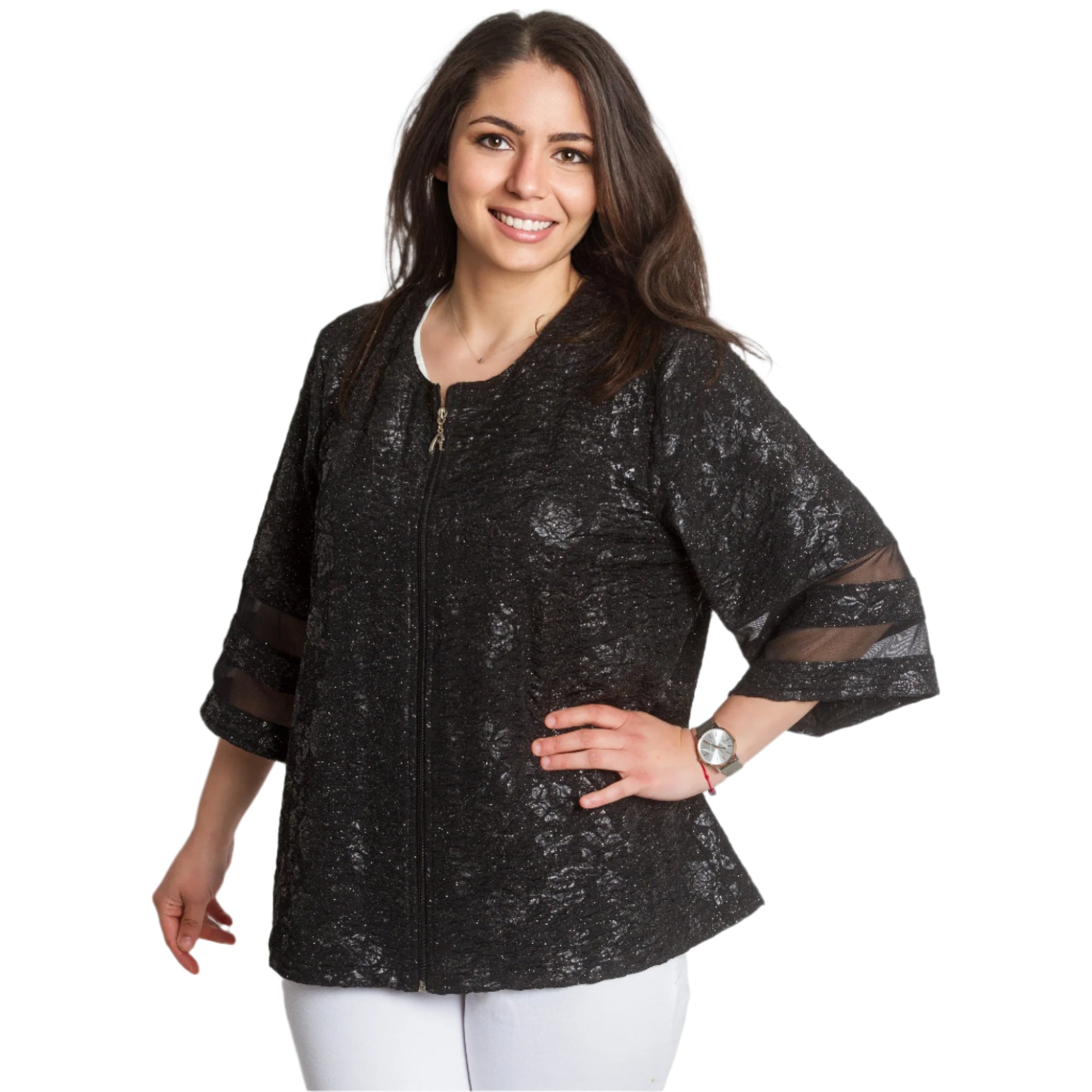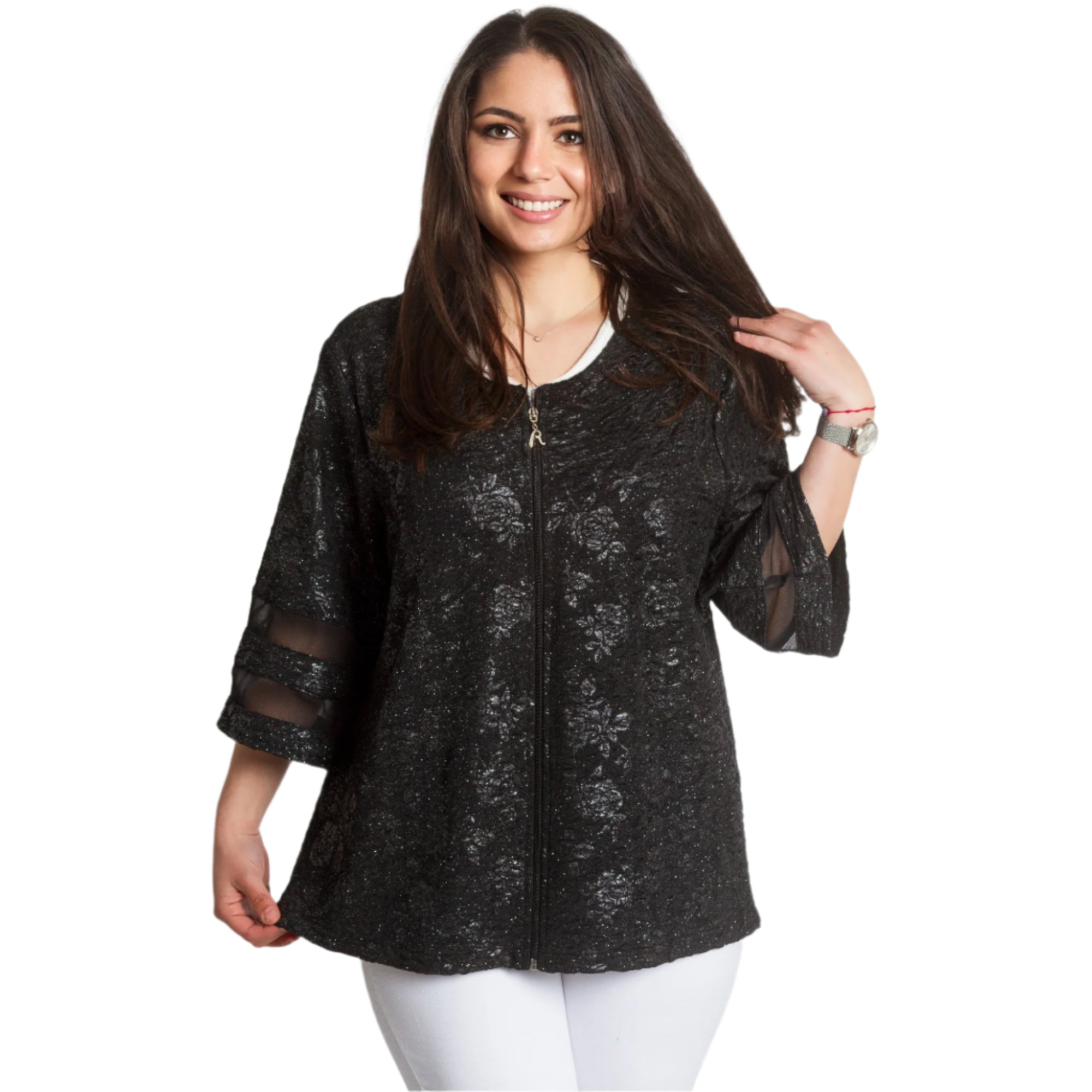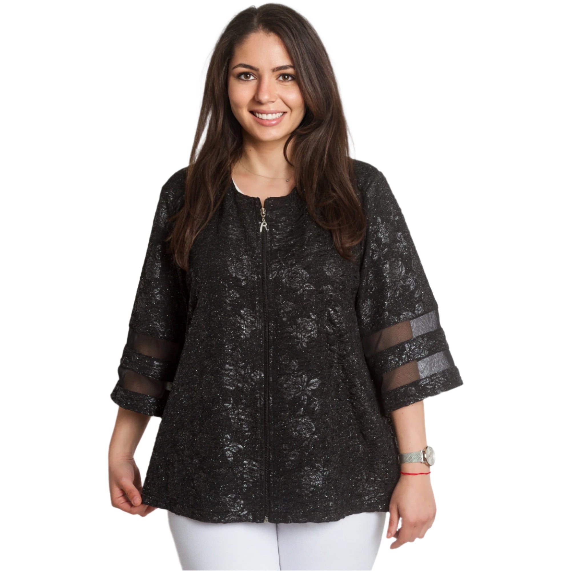 Добавете изисканост към визията си с това стилно черно сако в макси размери. Моделът е изработен от 100% полиестер с флорална текстура и нежна блестяща нишка, която придава фин блясък. Сакото е с цип отпред и 3/4 ръкави с ефектни прозрачни ленти от тюл, които го правят елегантно и подходящо за официални събития. Свободната кройка осигурява комфорт и свобода на движение, а черният цвят е класически и лесен за съчетаване.