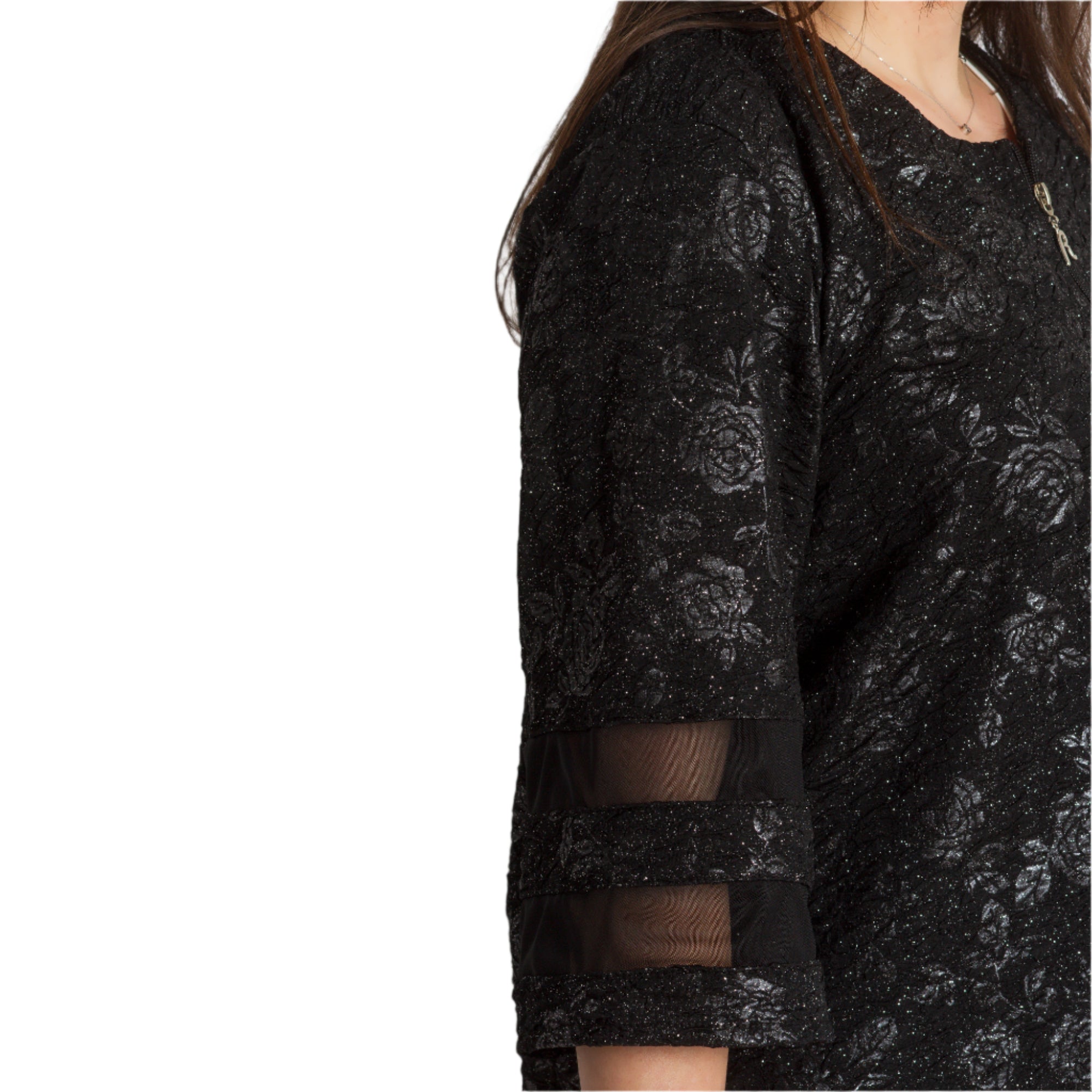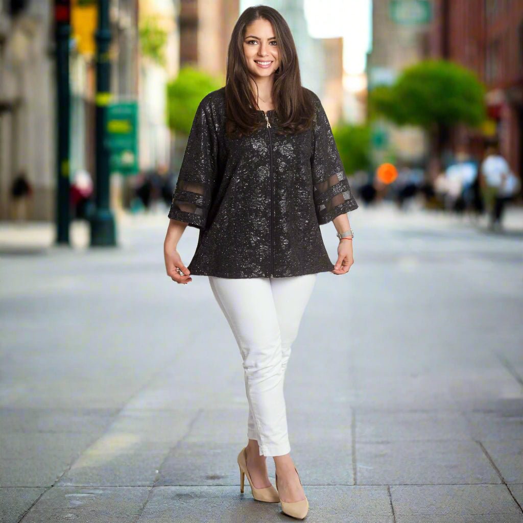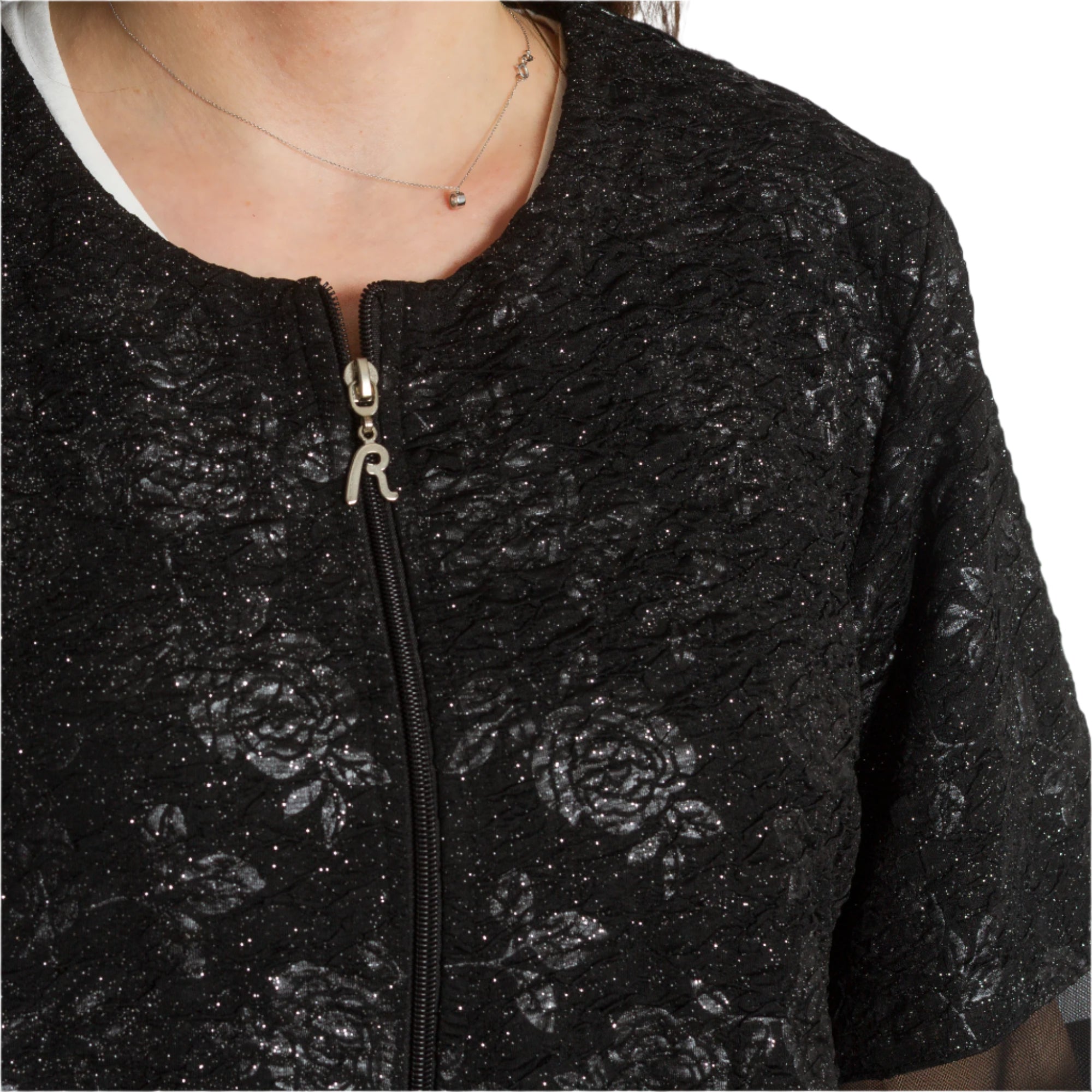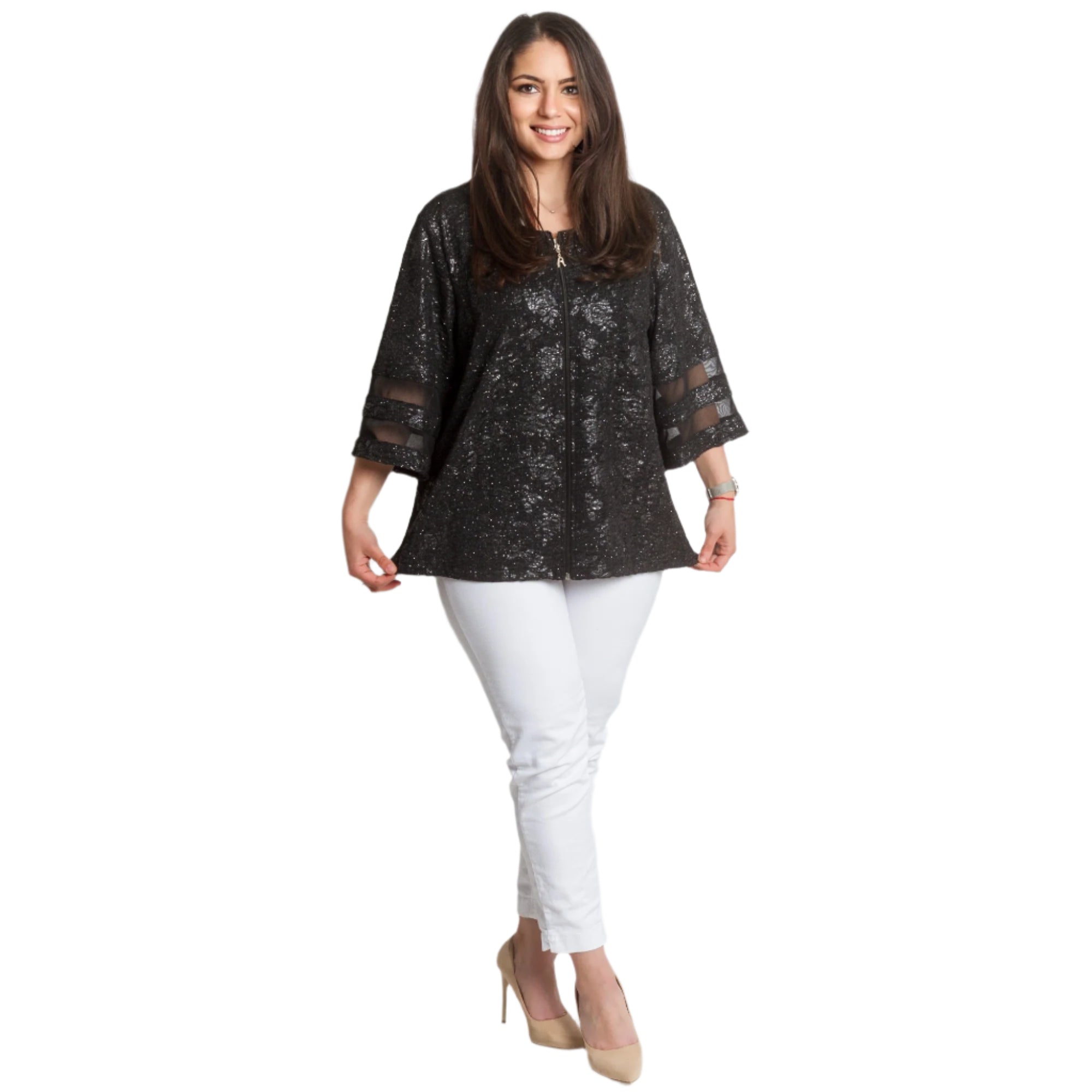 Добавете изисканост към визията си с това стилно черно сако в макси размери. Моделът е изработен от 100% полиестер с флорална текстура и нежна блестяща нишка, която придава фин блясък. Сакото е с цип отпред и 3/4 ръкави с ефектни прозрачни ленти от тюл, които го правят елегантно и подходящо за официални събития. Свободната кройка осигурява комфорт и свобода на движение, а черният цвят е класически и лесен за съчетаване.