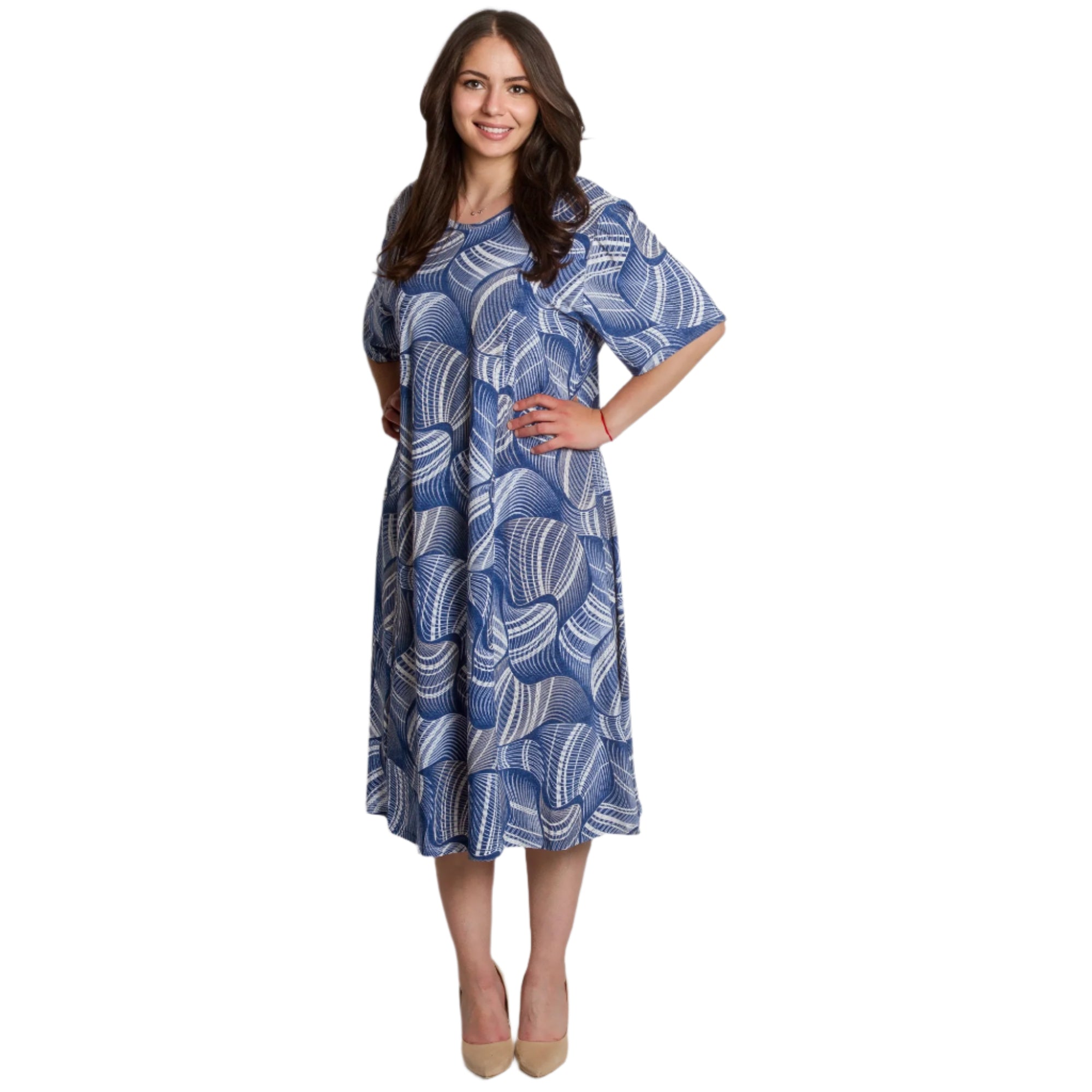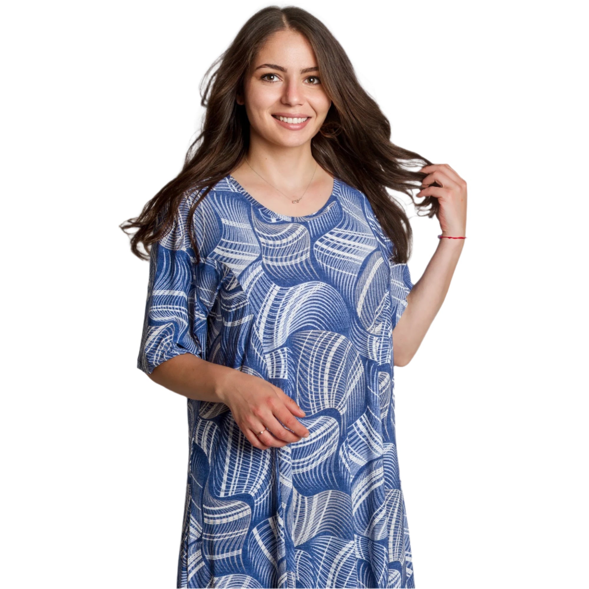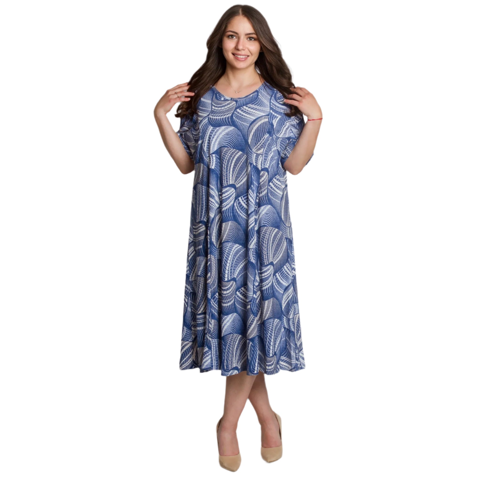Добавете свежест и стил към гардероба си с тази разкроена рокля в макси размери. Изработена от мека и еластична вискозна материя, роклята осигурява комфорт през целия ден. Дизайнът с къс ръкав и обло деколте е допълнен от ефектен абстрактен десен в сини и бели тонове, който създава визуален интерес и подчертава женствеността. Идеална за ежедневни разходки, срещи с приятели или неформални поводи през пролетно-летния сезон.