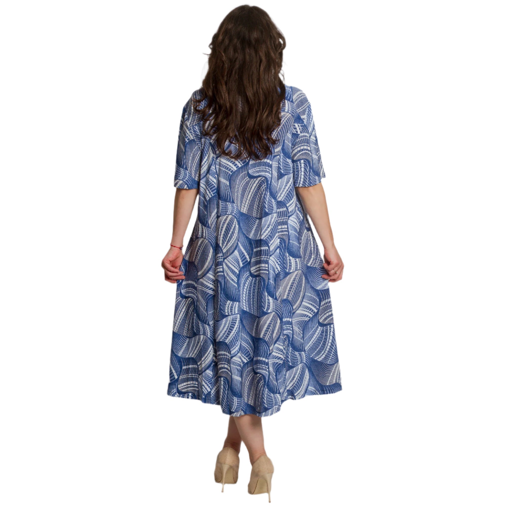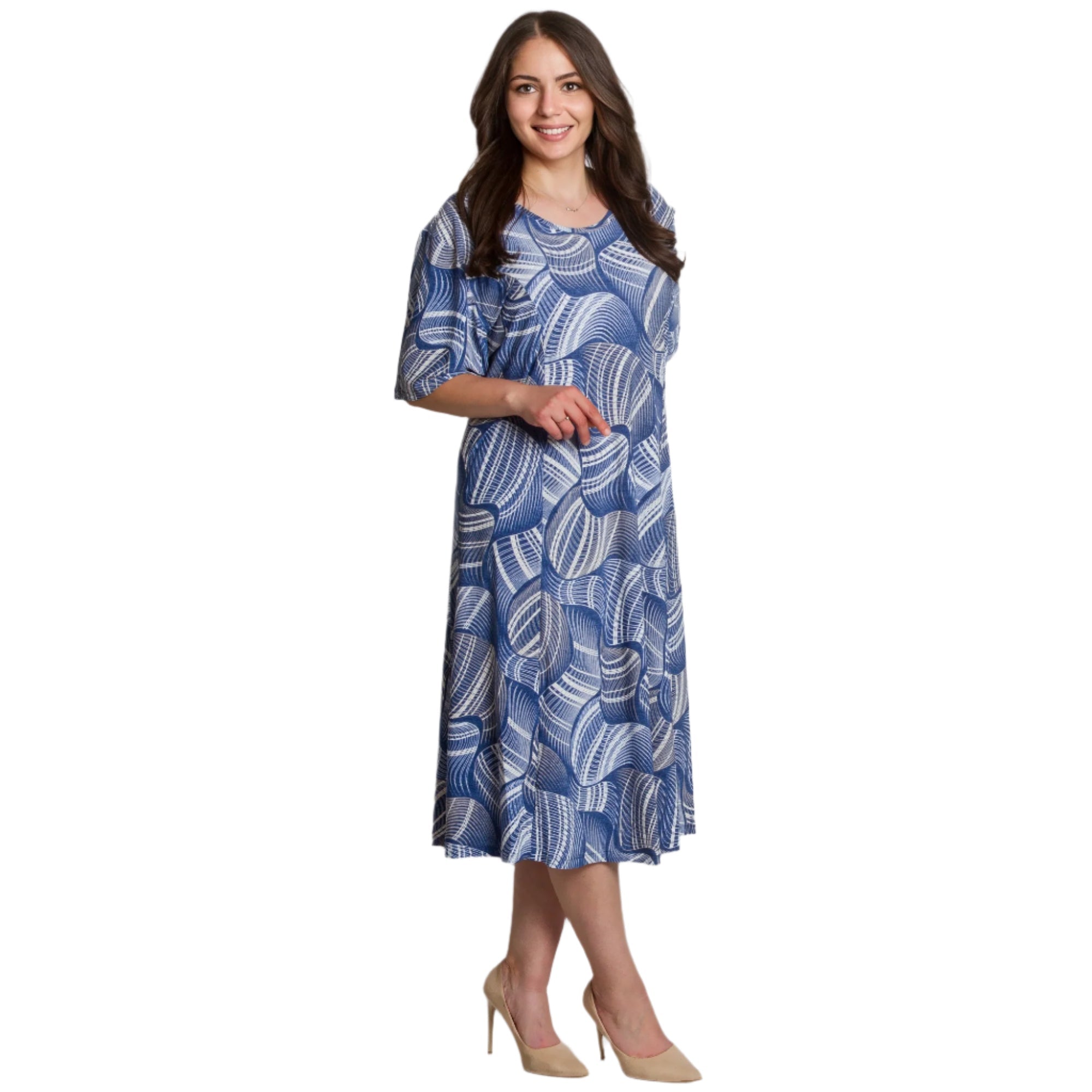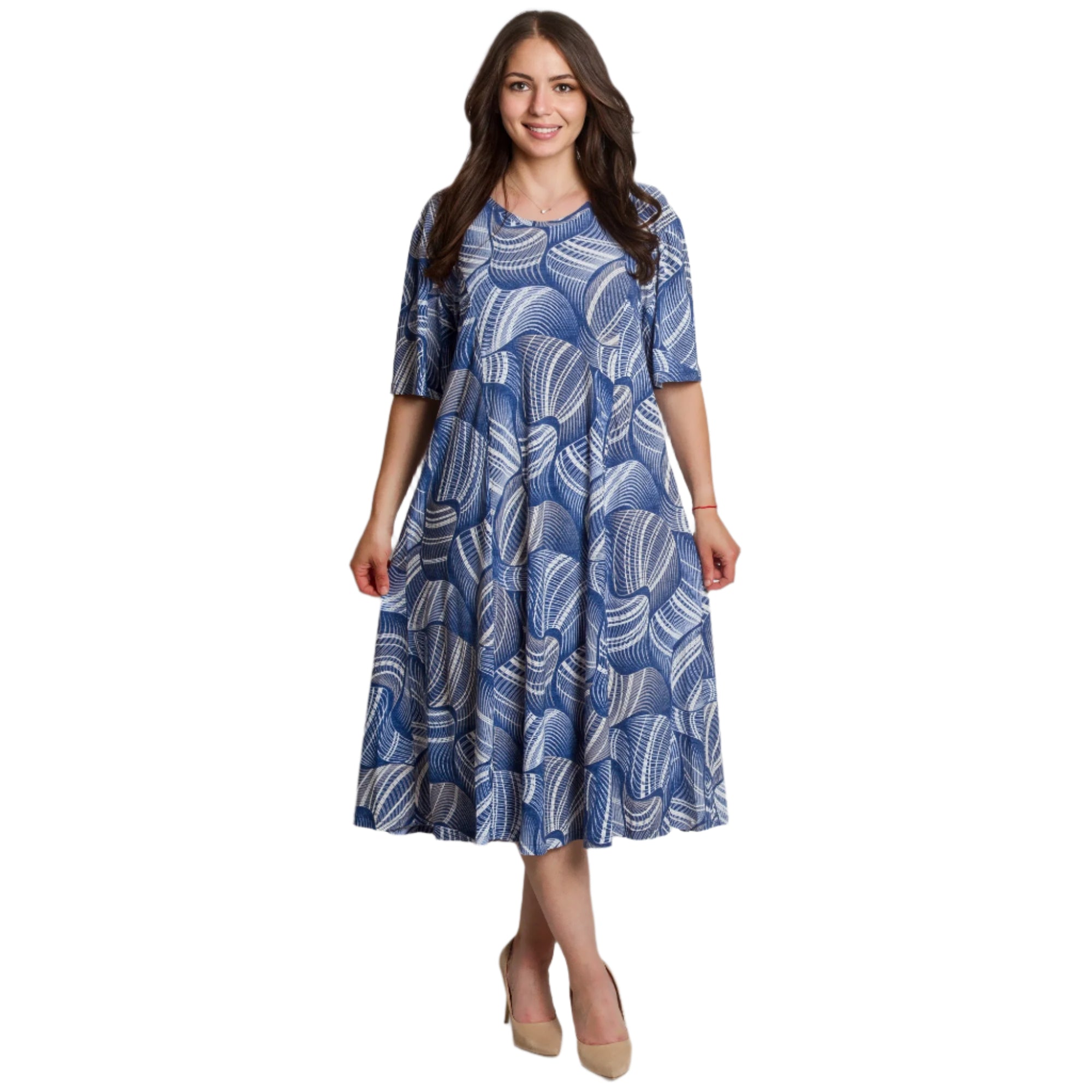 Добавете свежест и стил към гардероба си с тази разкроена рокля в макси размери. Изработена от мека и еластична вискозна материя, роклята осигурява комфорт през целия ден. Дизайнът с къс ръкав и обло деколте е допълнен от ефектен абстрактен десен в сини и бели тонове, който създава визуален интерес и подчертава женствеността. Идеална за ежедневни разходки, срещи с приятели или неформални поводи през пролетно-летния сезон.