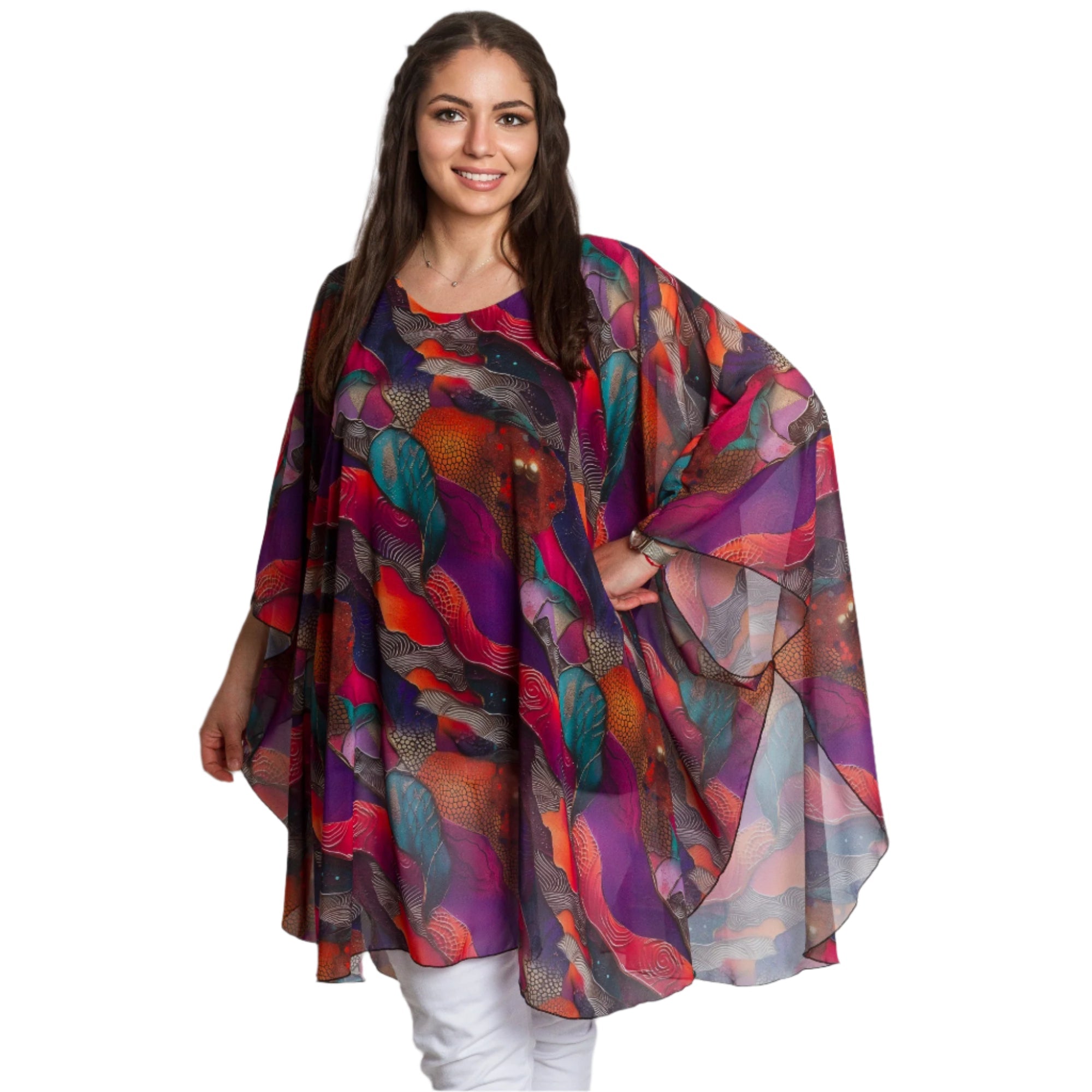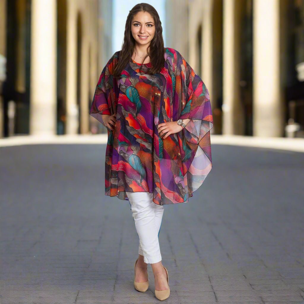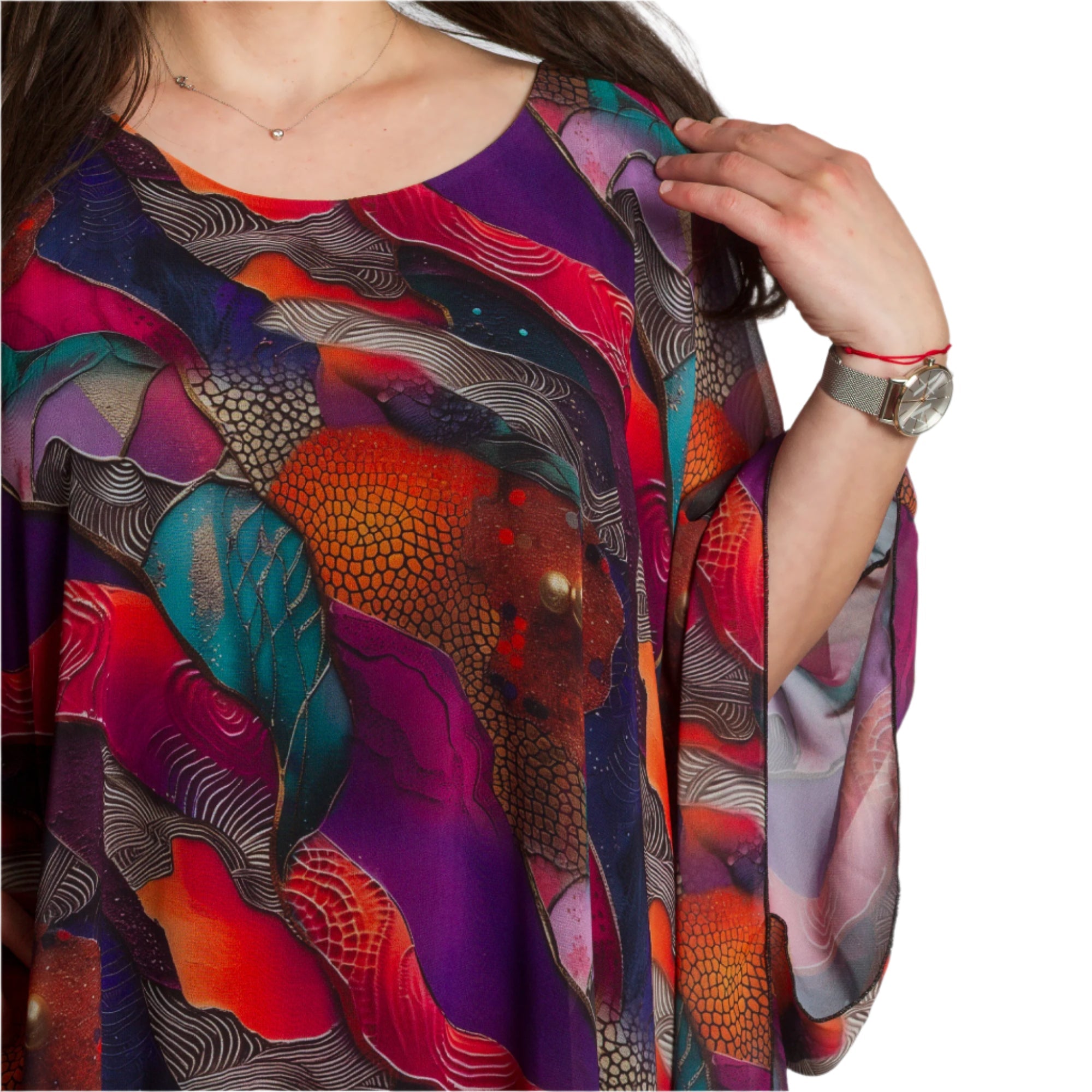 Зашеметяваща асиметрична туника с разкроена кройка, изработена от лек шифон с многоцветен артистичен десен. Моделът е подходящ за официални поводи през пролетно-летния сезон. Кръглото деколте и ефирните ръкави осигуряват комфорт и стил, а свободната кройка подчертава изяществото на женската фигура, без да я притиска.
