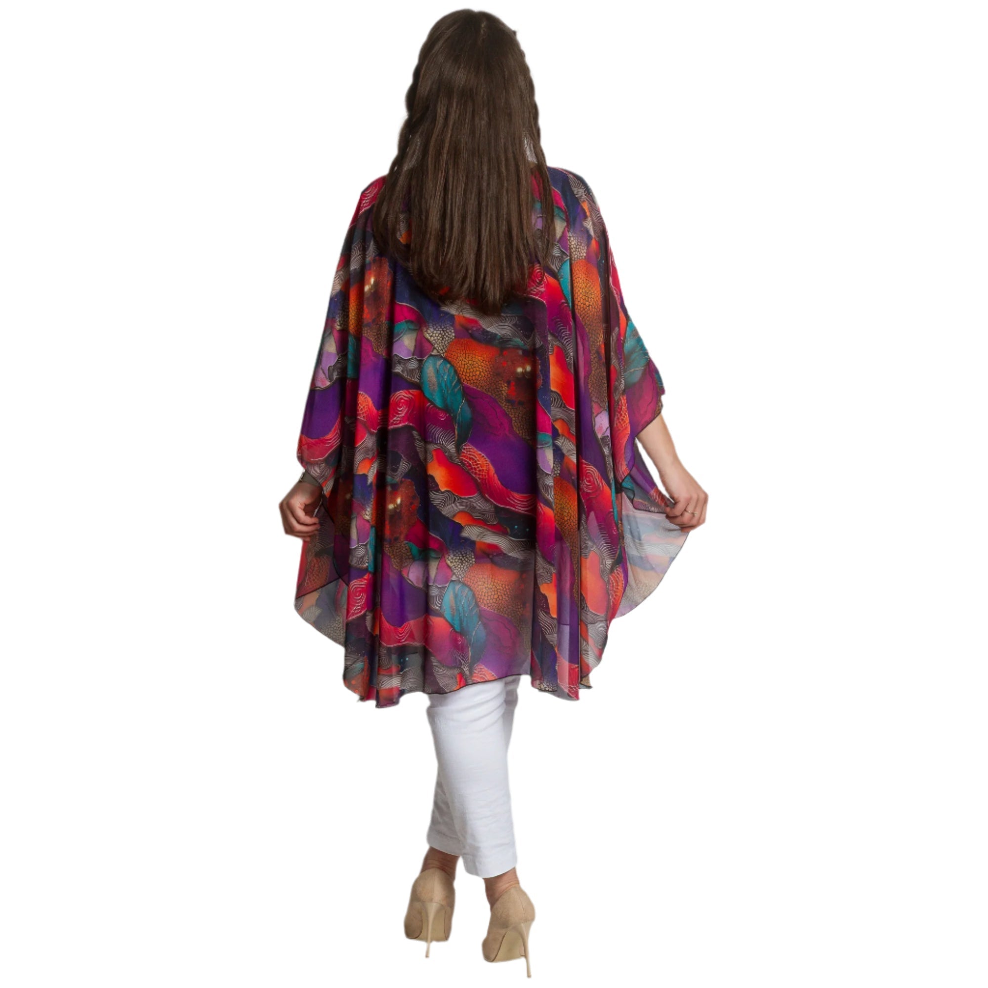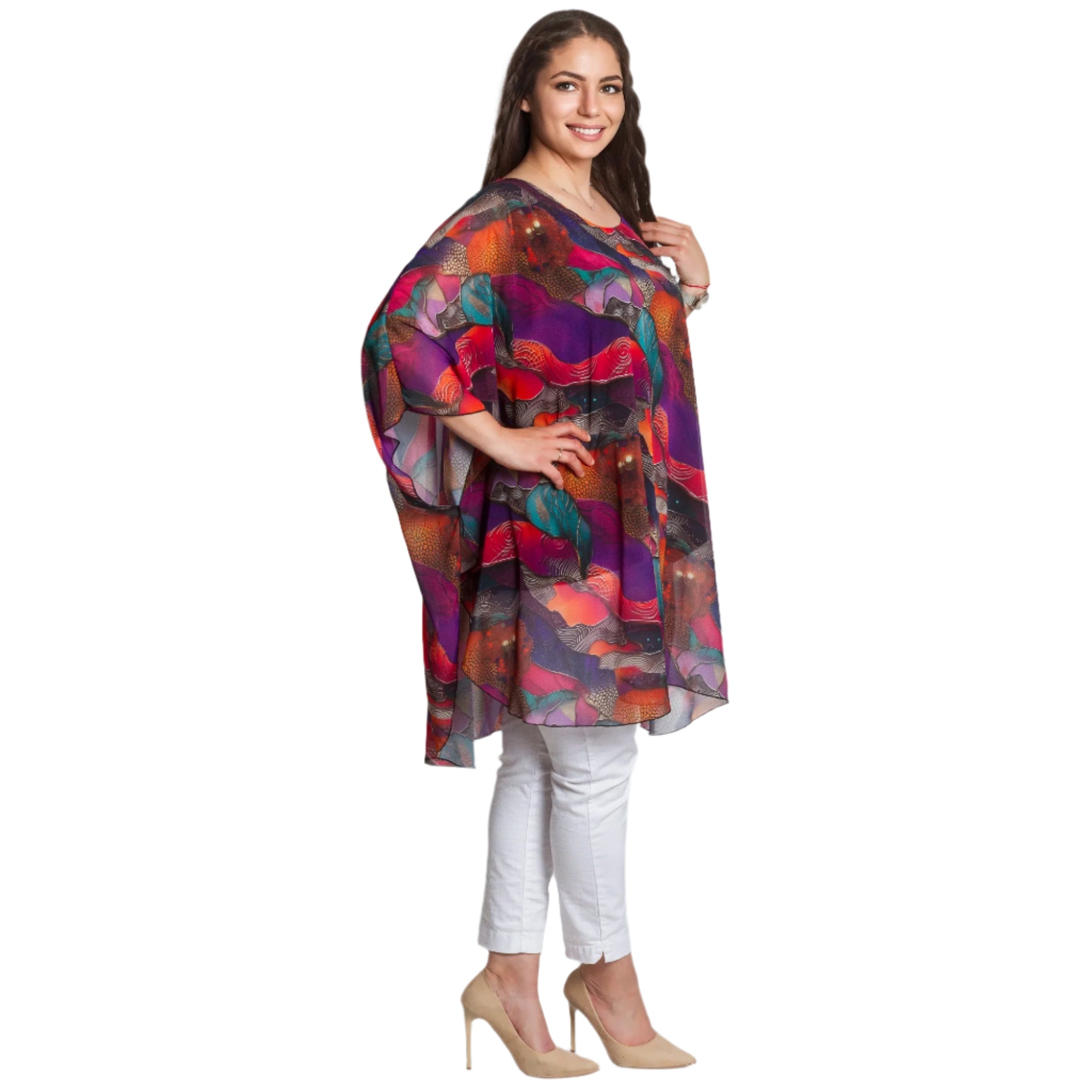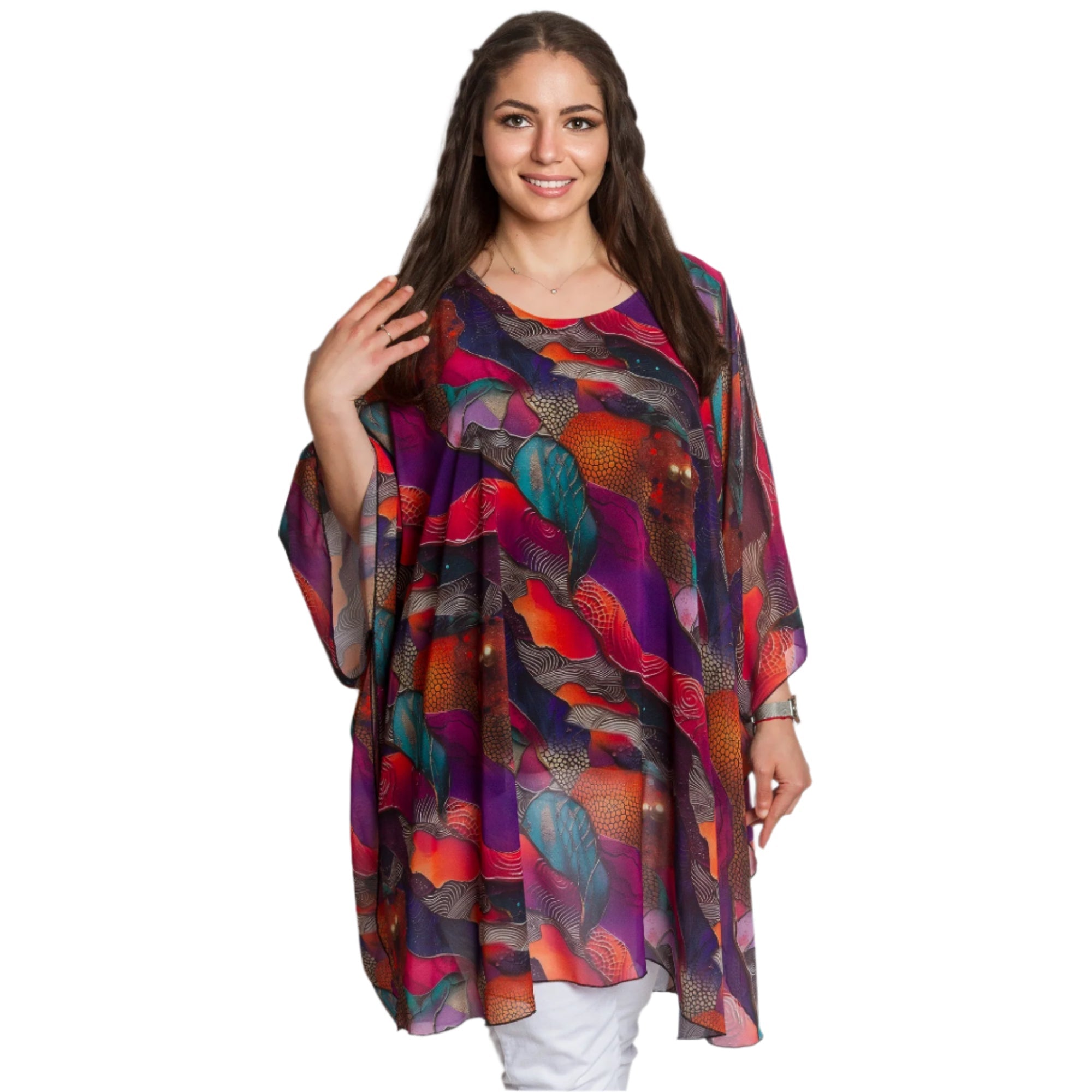 Зашеметяваща асиметрична туника с разкроена кройка, изработена от лек шифон с многоцветен артистичен десен. Моделът е подходящ за официални поводи през пролетно-летния сезон. Кръглото деколте и ефирните ръкави осигуряват комфорт и стил, а свободната кройка подчертава изяществото на женската фигура, без да я притиска.