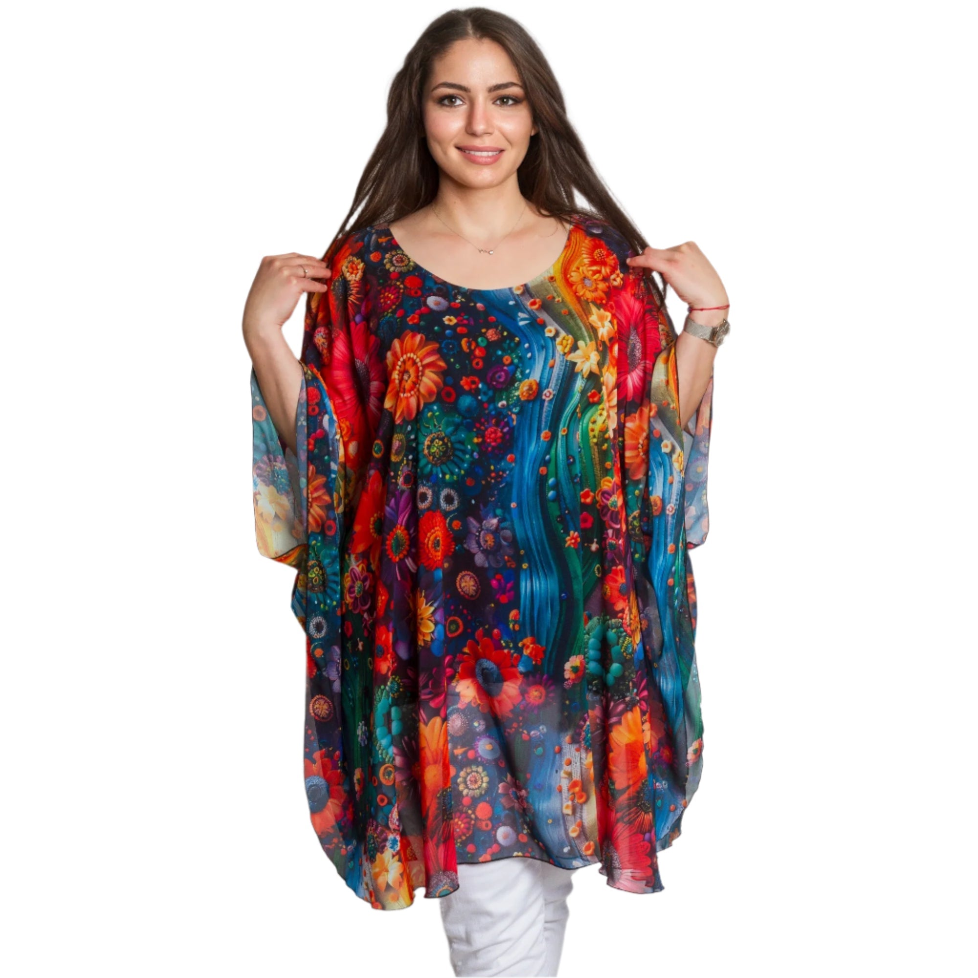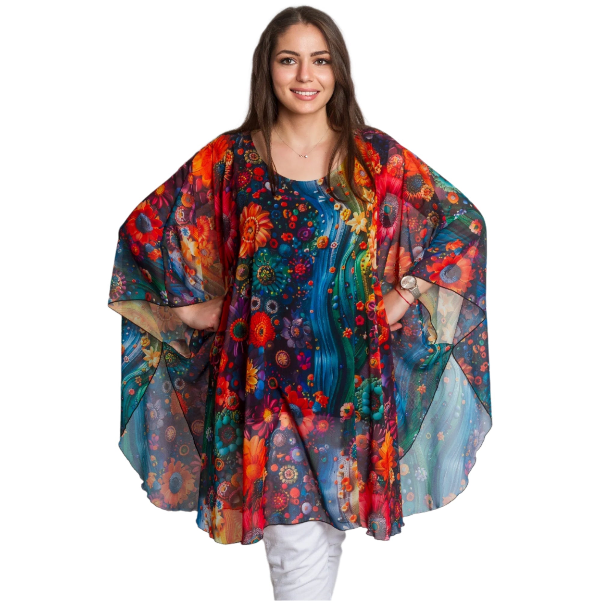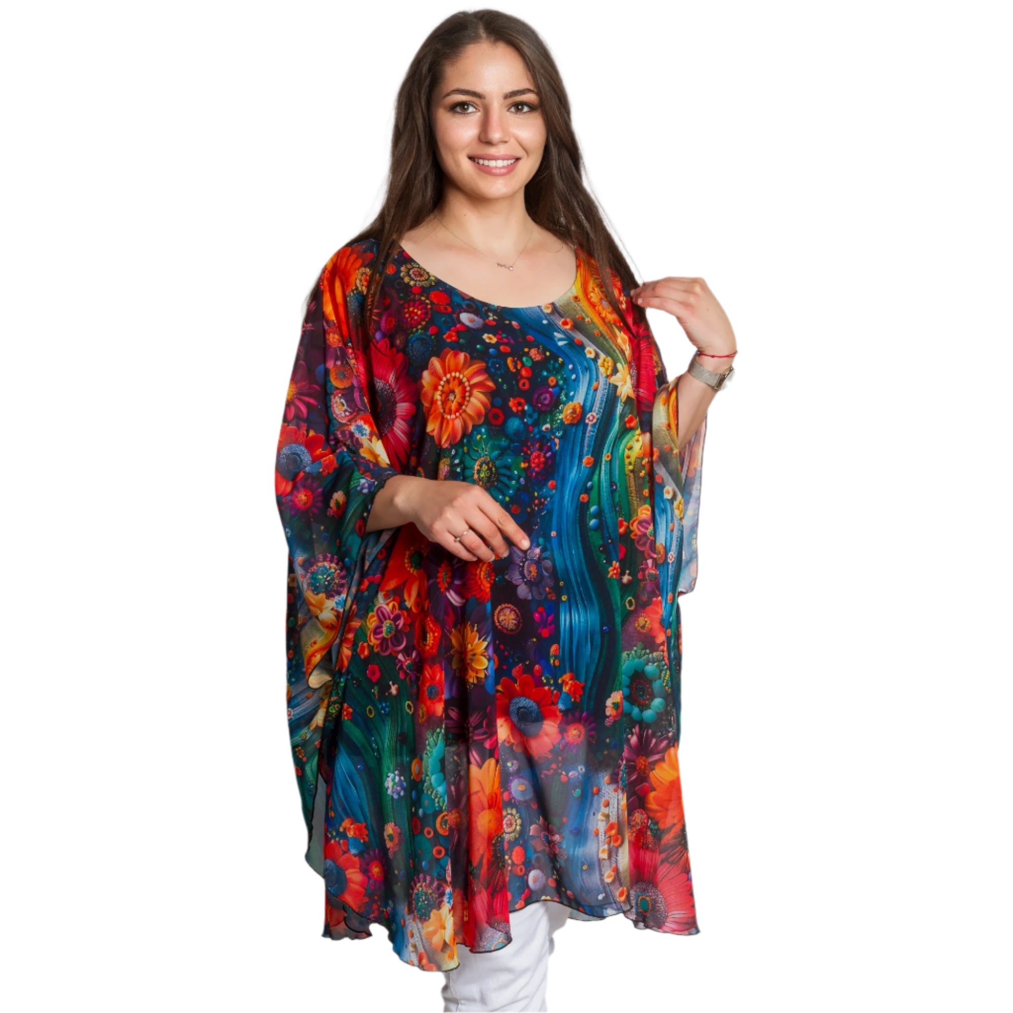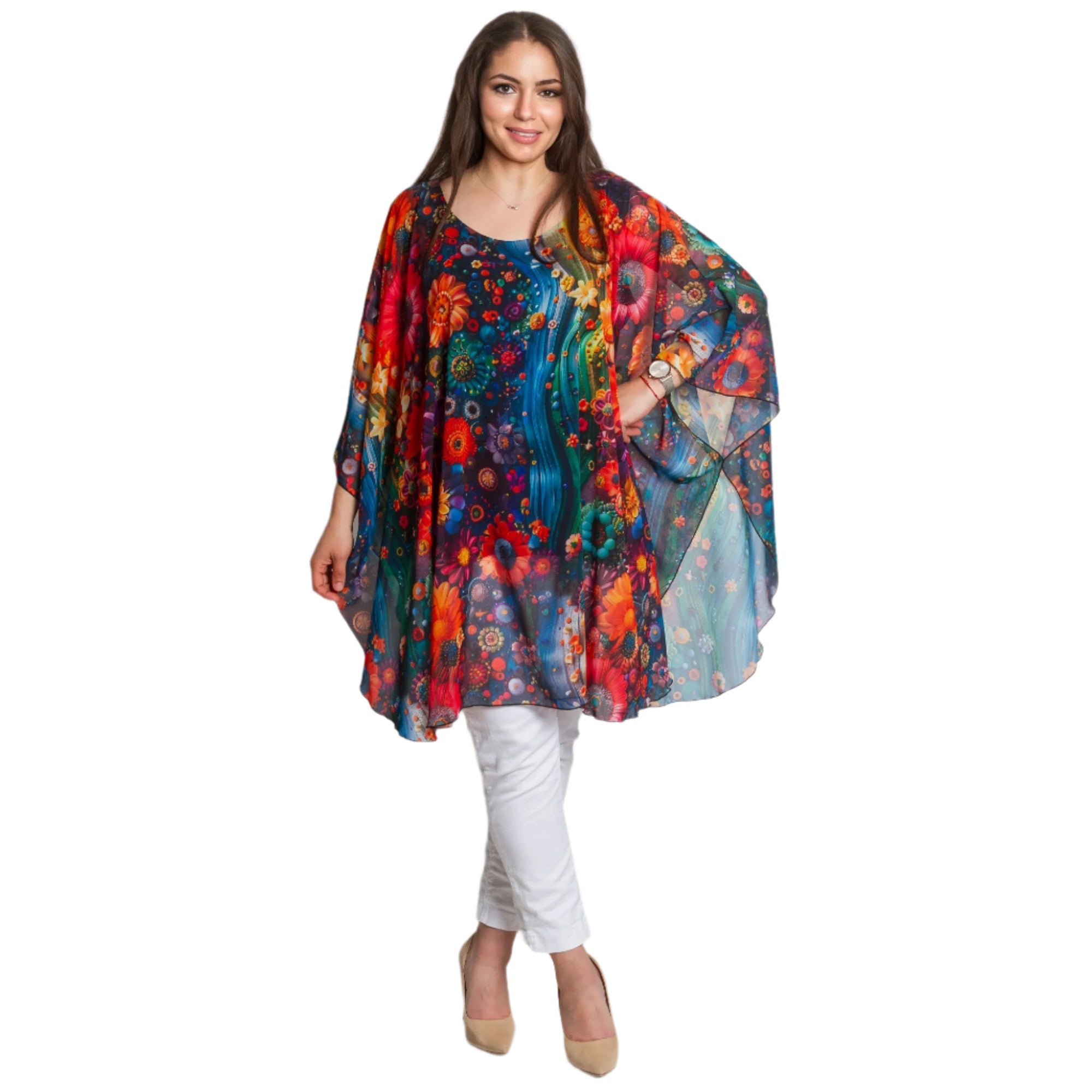 Преобразете визията си с тази ефектна туника в големи размери, изработена от ефирен шифон. С многоцветен флорален и абстрактен десен, моделът впечатлява с асиметрична кройка и свободен силует, който подчертава женствеността с комфорт. Идеална за официални събития, тази туника съчетава изящество и стил с лекота.