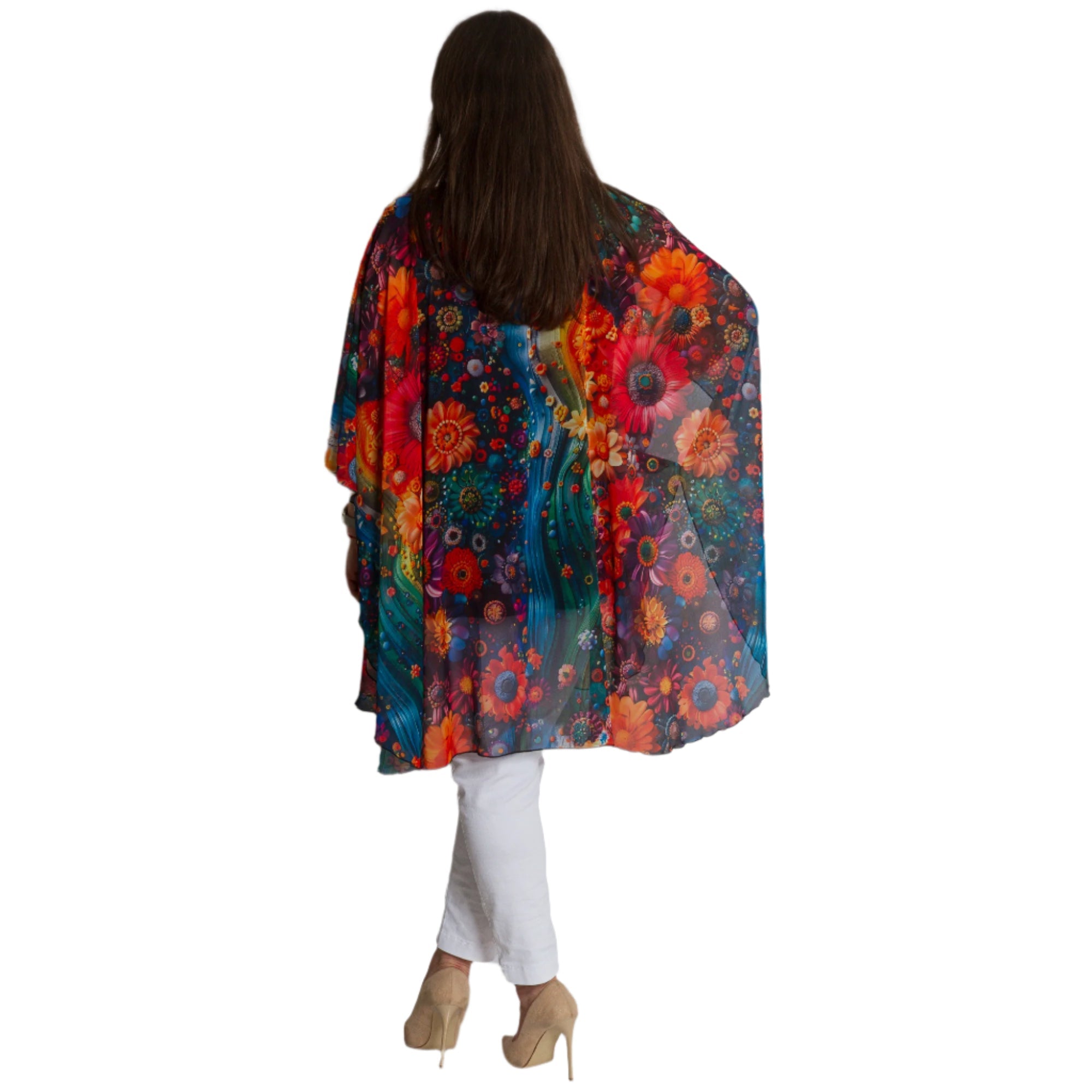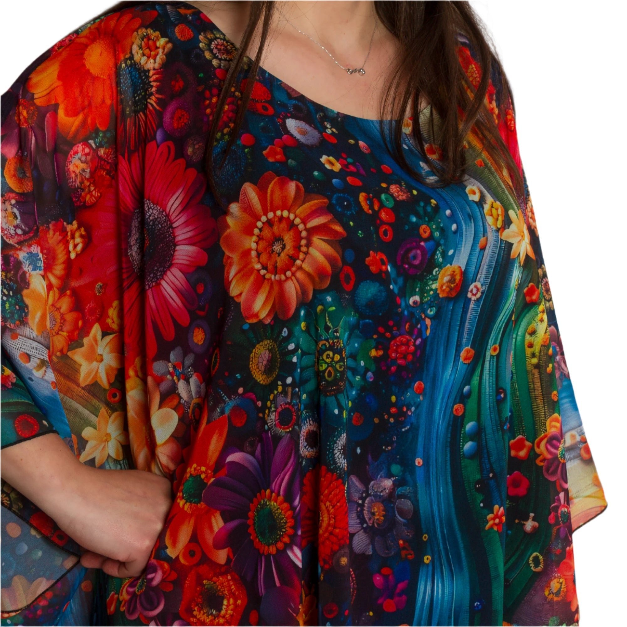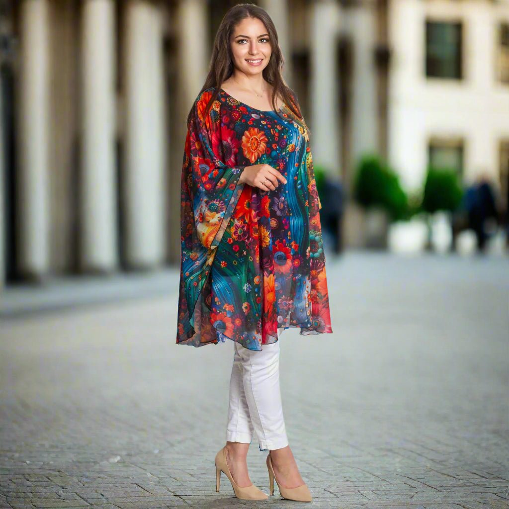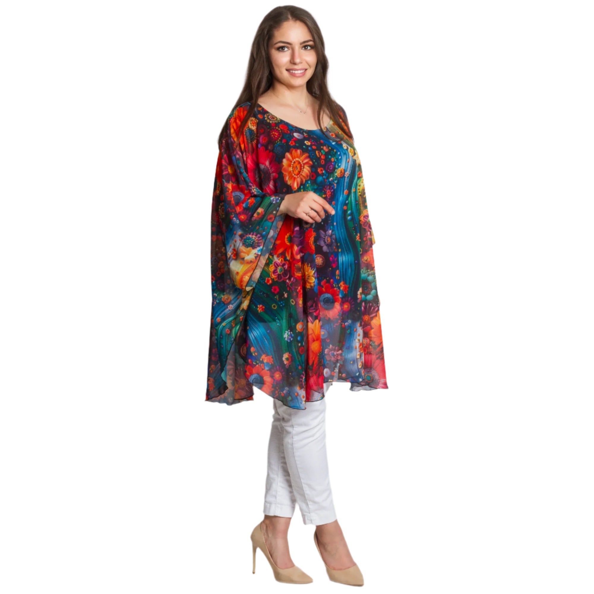 Преобразете визията си с тази ефектна туника в големи размери, изработена от ефирен шифон. С многоцветен флорален и абстрактен десен, моделът впечатлява с асиметрична кройка и свободен силует, който подчертава женствеността с комфорт. Идеална за официални събития, тази туника съчетава изящество и стил с лекота.