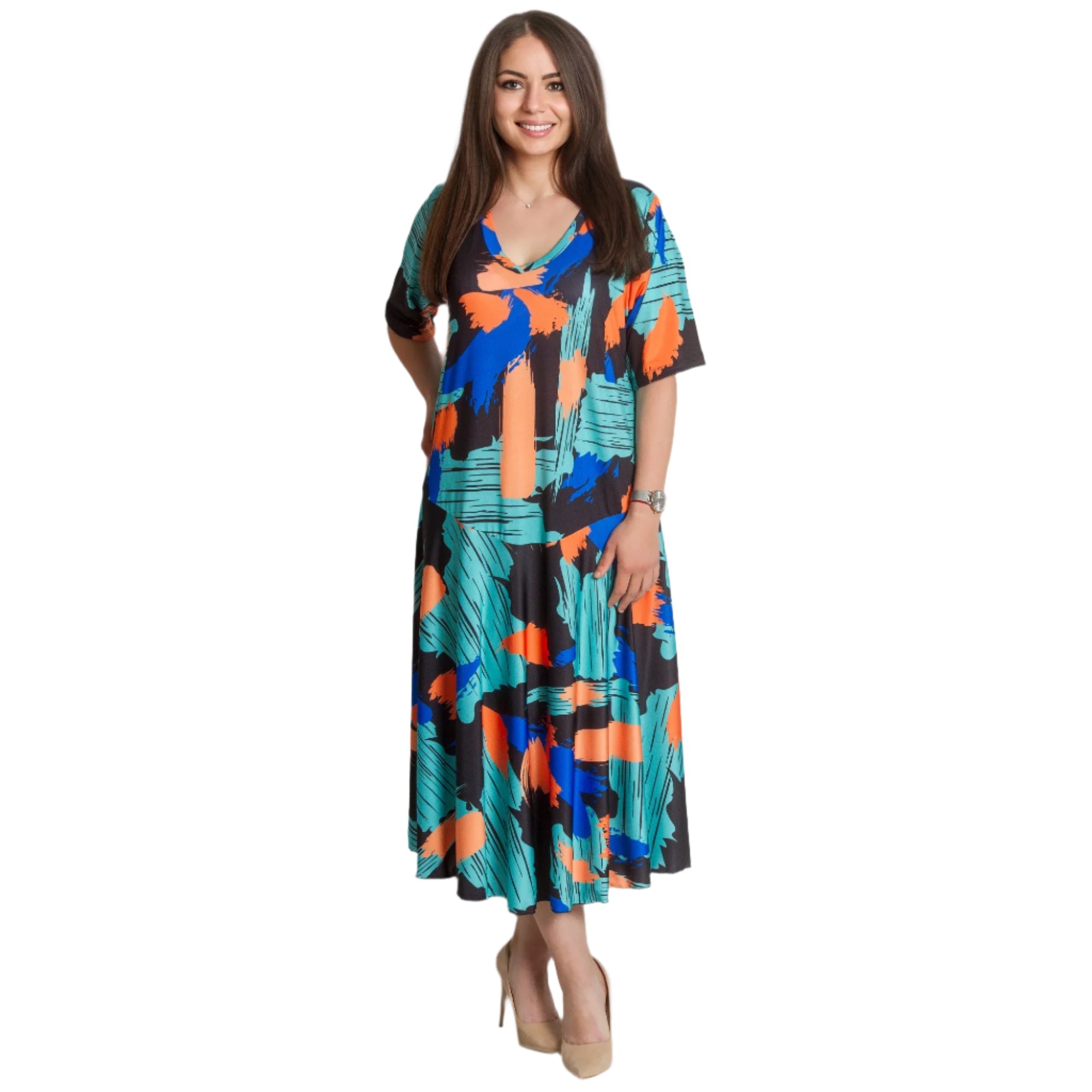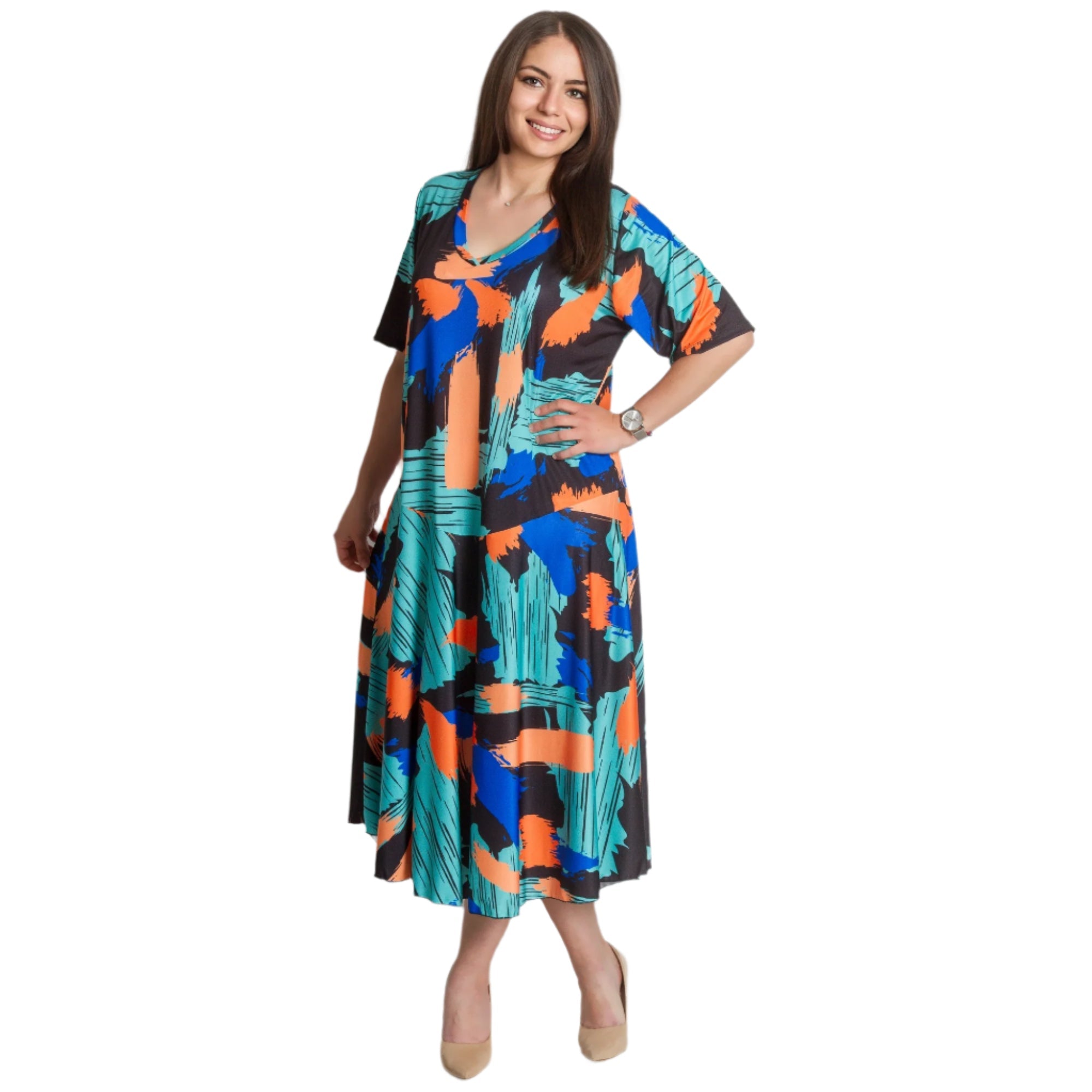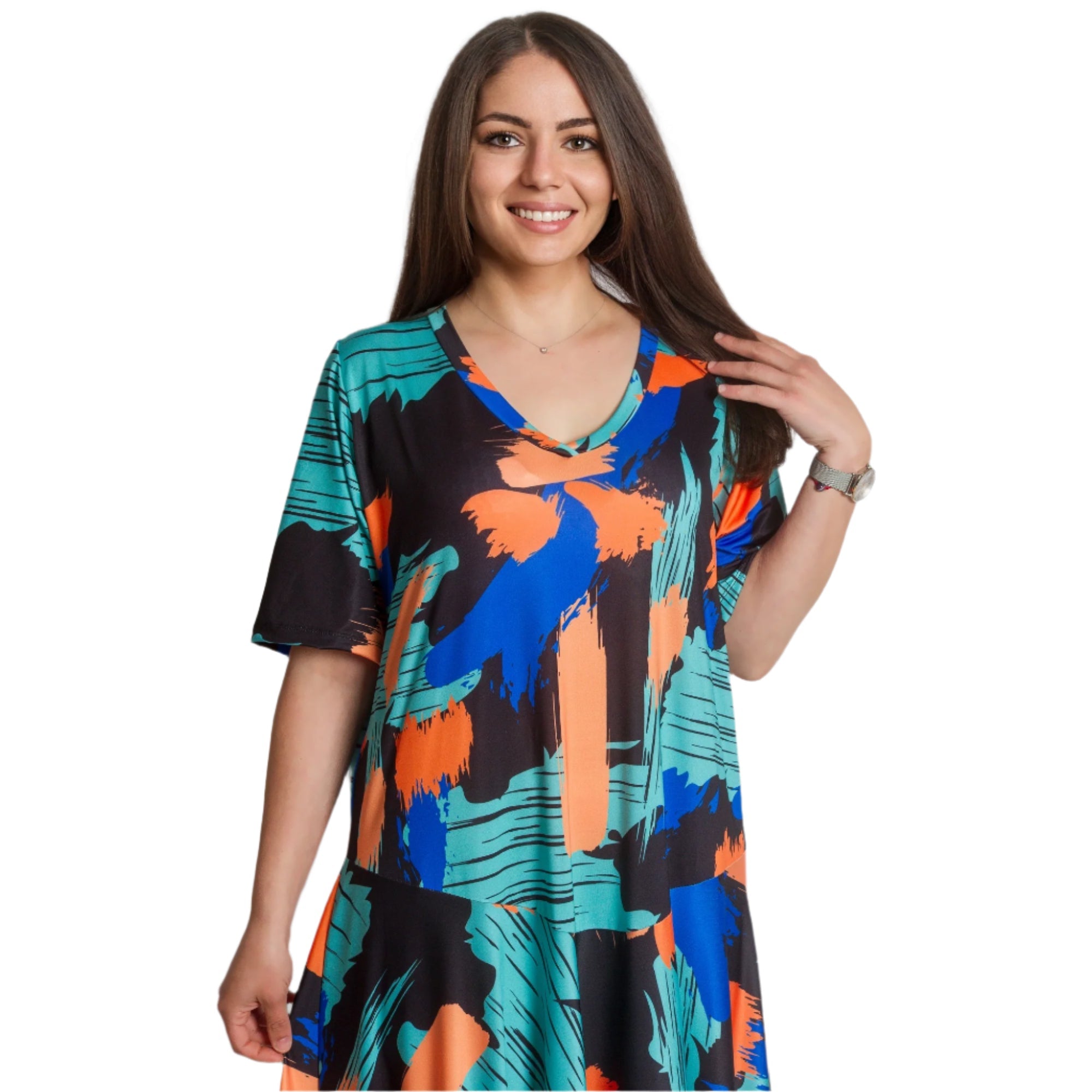 Създайте смела и модерна визия с тази разкроена рокля в големи размери с артистичен абстрактен десен в ярки нюанси на синьо, оранжево и зелено. Изработена от удобна и лека материя с памук и полиестер, роклята осигурява комфорт през целия ден. V-образното деколте придава женственост, а свободната кройка подчертава фигурата без да прилепва. Идеален избор за официални поводи или срещи, където искате да се откроите.