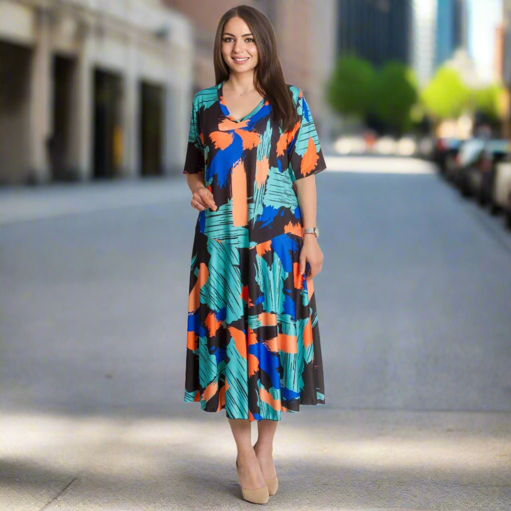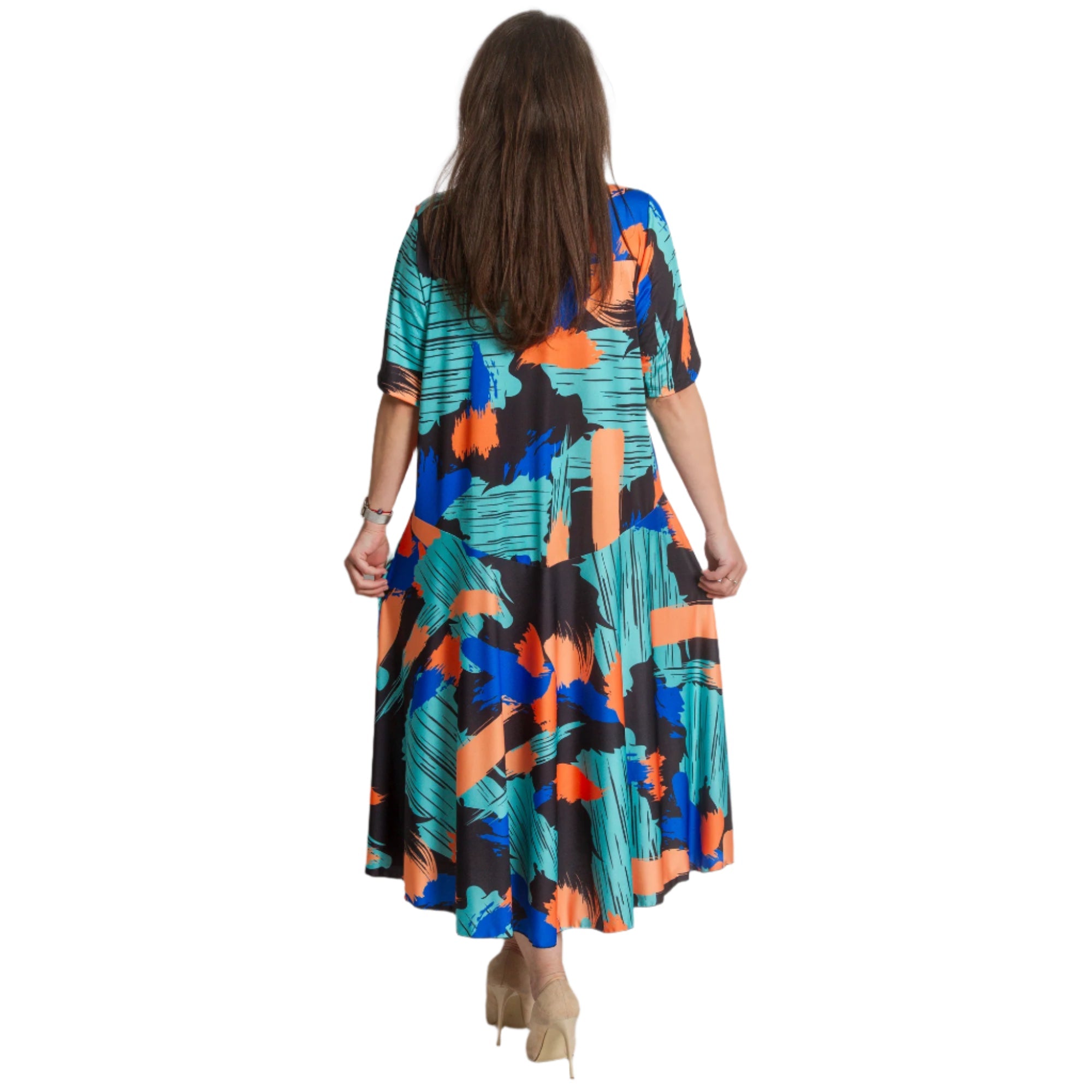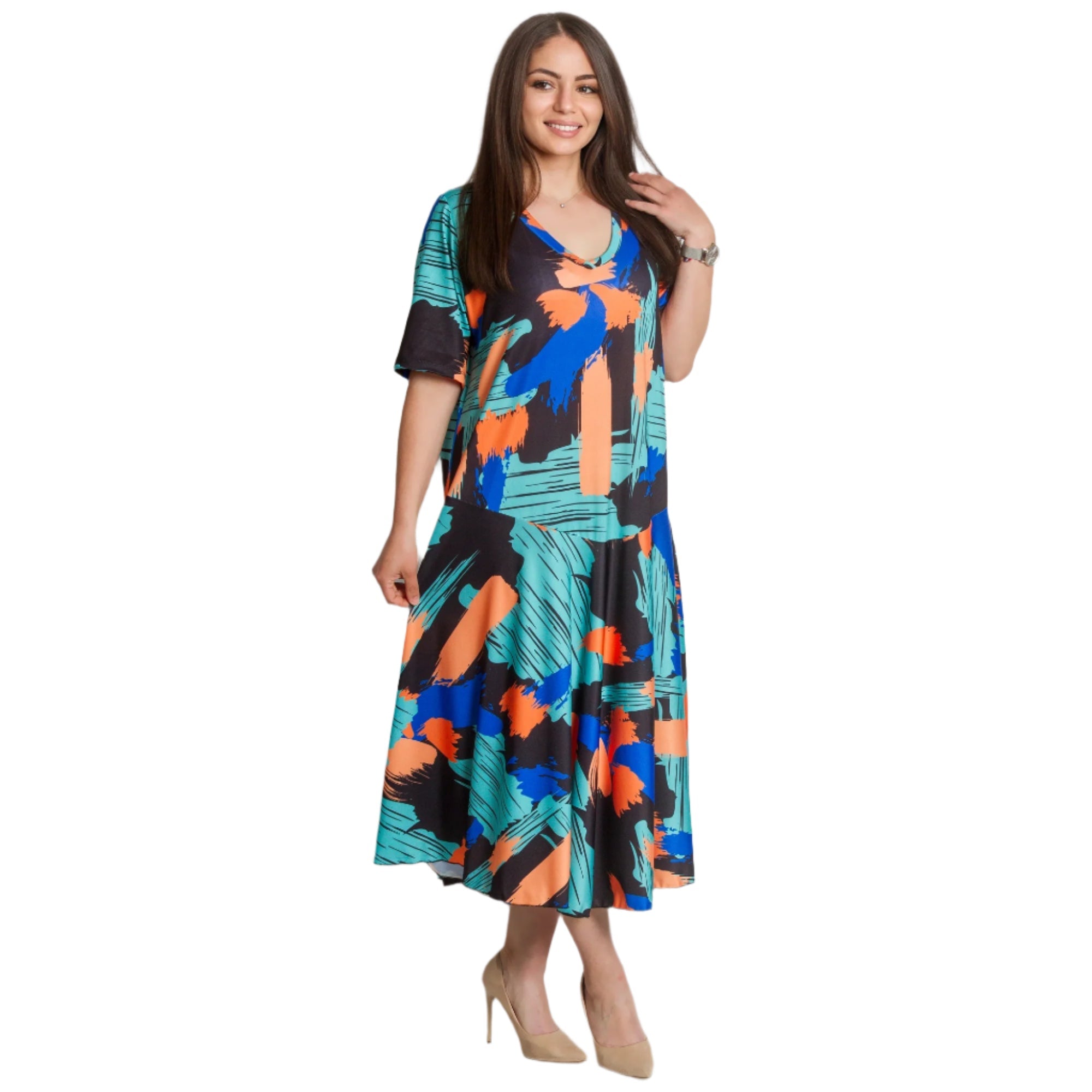 Създайте смела и модерна визия с тази разкроена рокля в големи размери с артистичен абстрактен десен в ярки нюанси на синьо, оранжево и зелено. Изработена от удобна и лека материя с памук и полиестер, роклята осигурява комфорт през целия ден. V-образното деколте придава женственост, а свободната кройка подчертава фигурата без да прилепва. Идеален избор за официални поводи или срещи, където искате да се откроите.