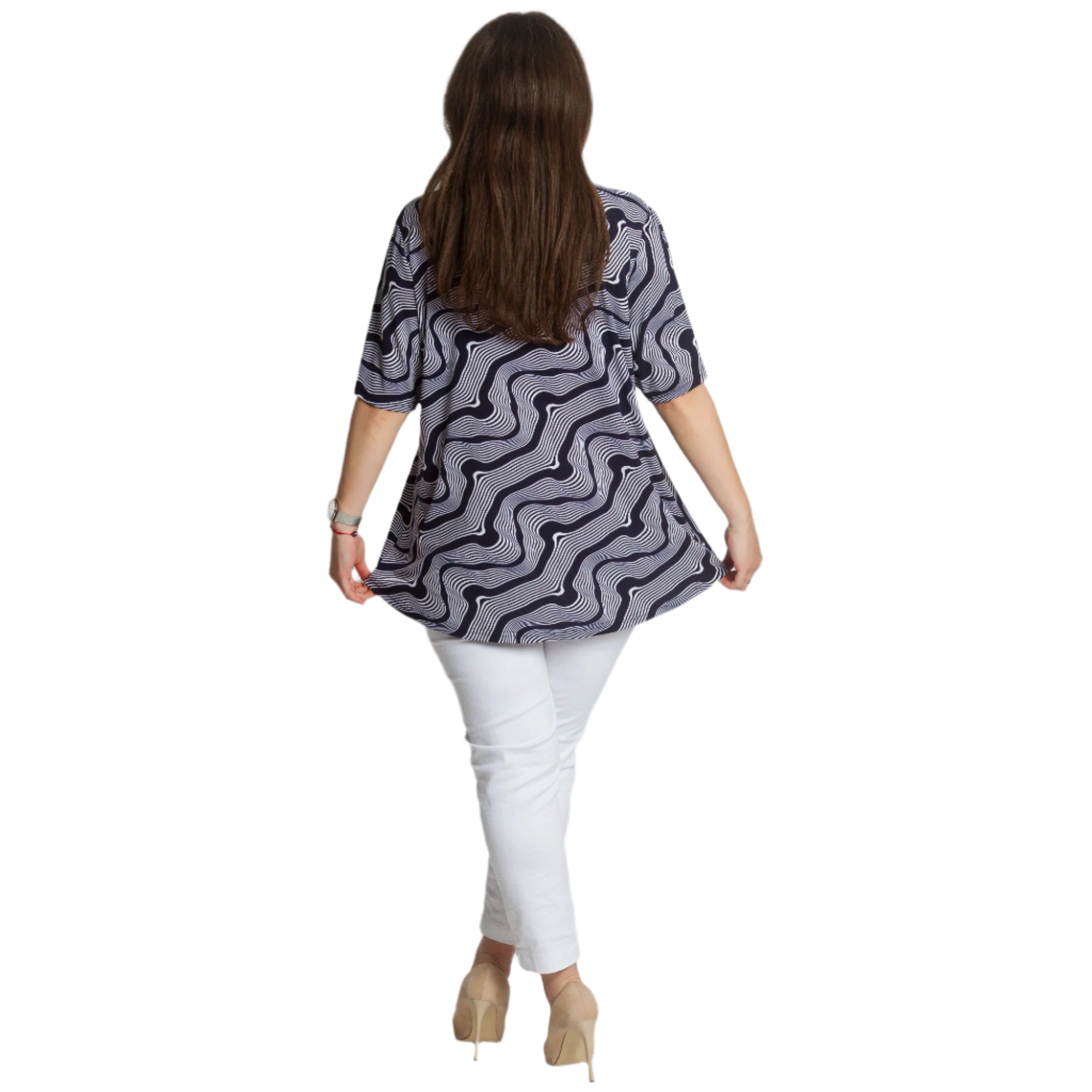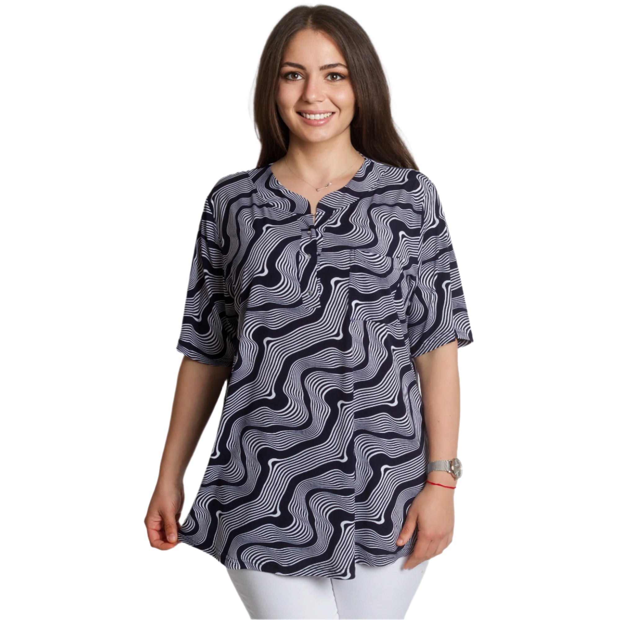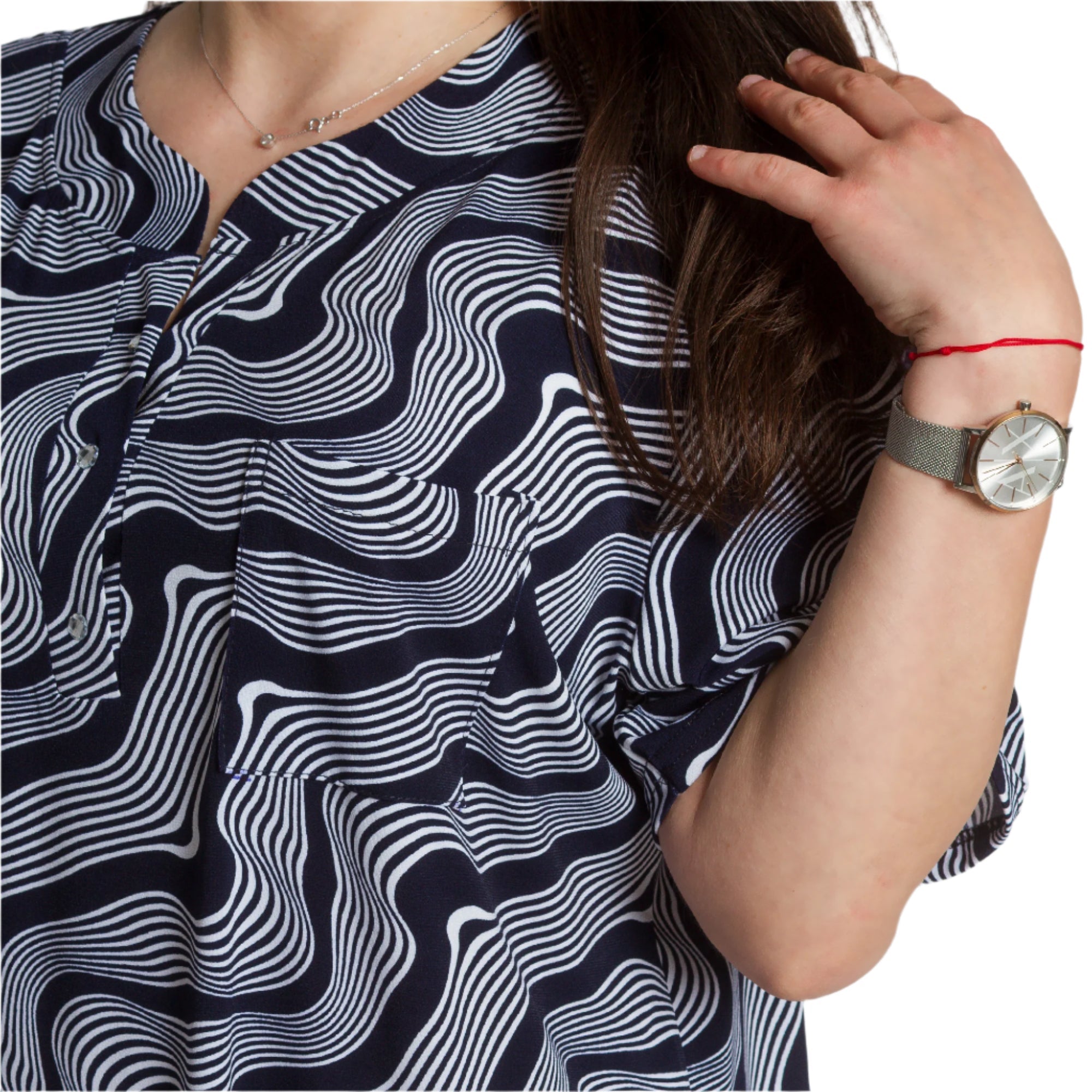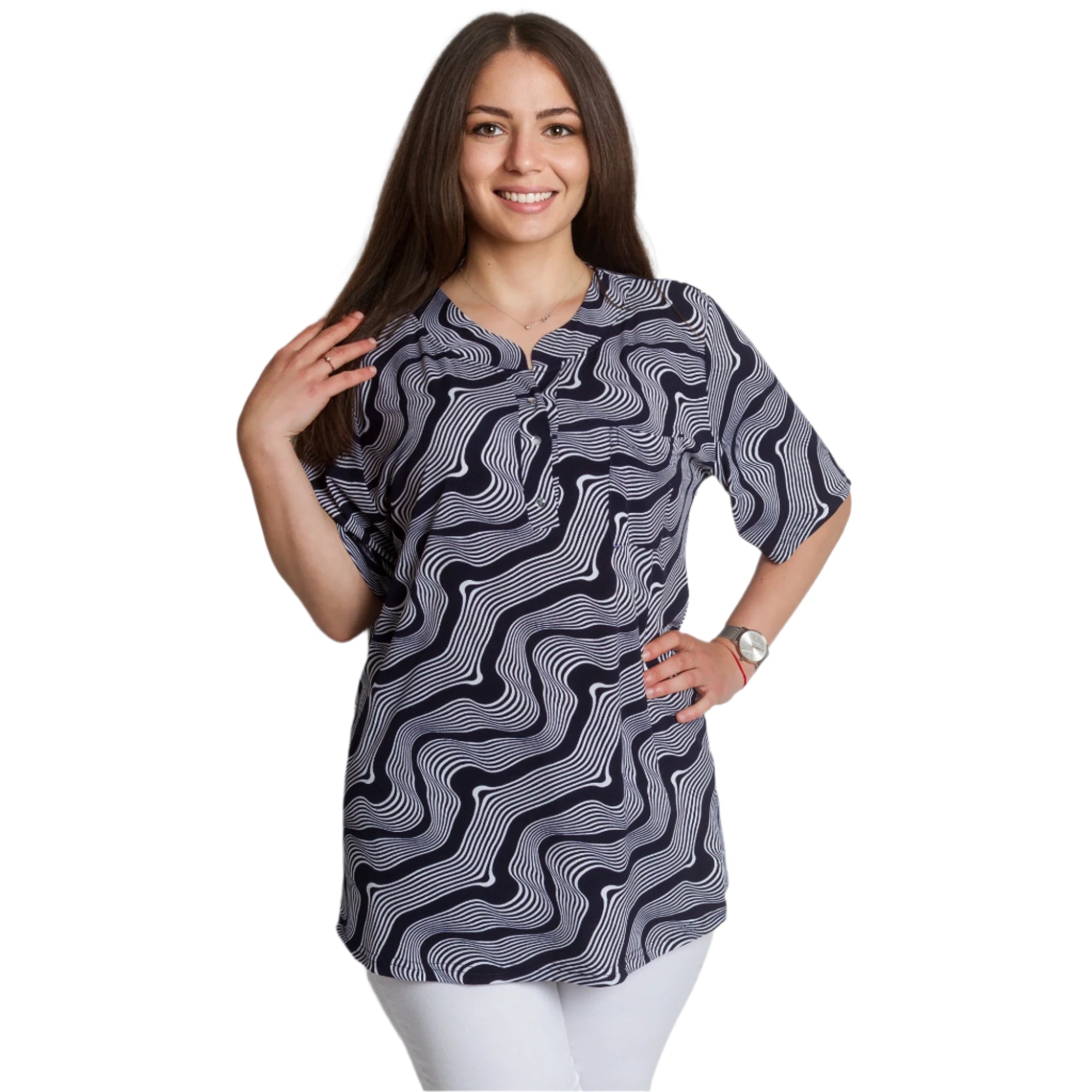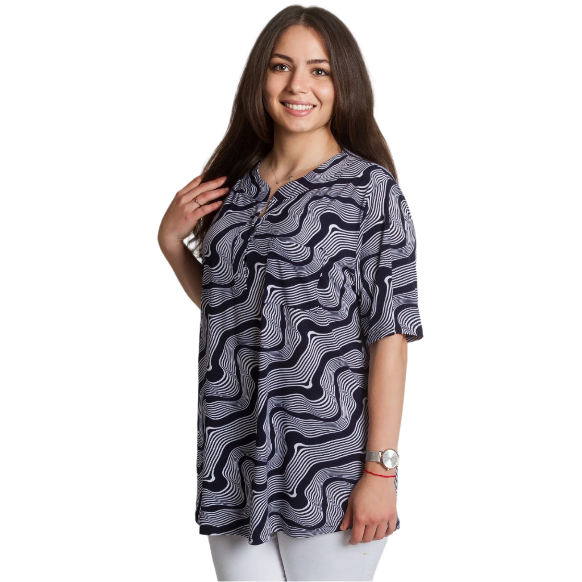 Открийте удобството и стила с тази ефектна туника с практично джобче. Изработена от мека и еластична вискозна материя, тя осигурява пълен комфорт през целия ден. Свободната кройка подчертава женствеността, без да стяга. Малкото джобче в горната част добавя нотка практичност, а модерната щампа – усещане за индивидуалност. Подходяща е за ежедневно носене, разходки, срещи с приятели или дори за по-елегантни поводи, съчетана с подходящ панталон или клин.