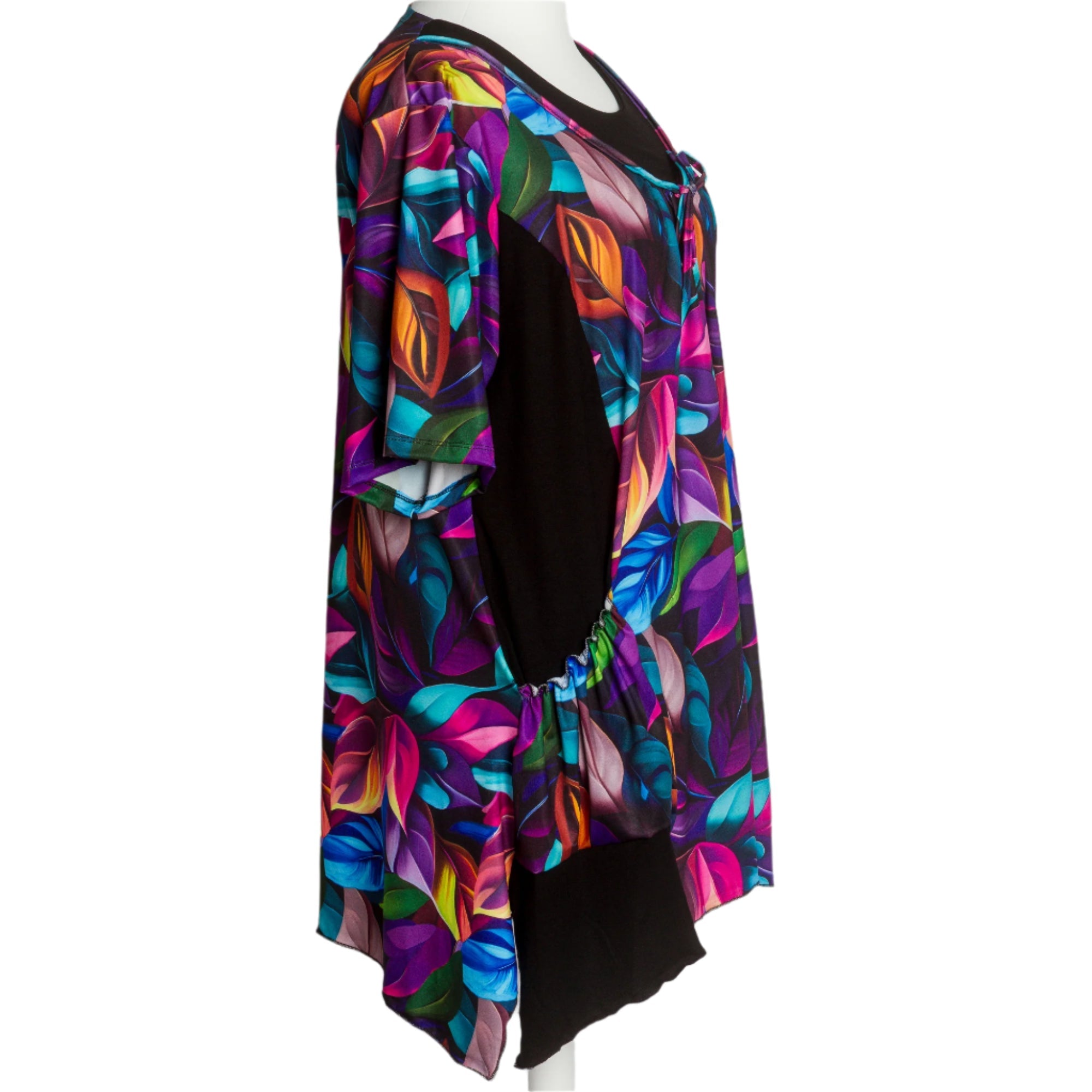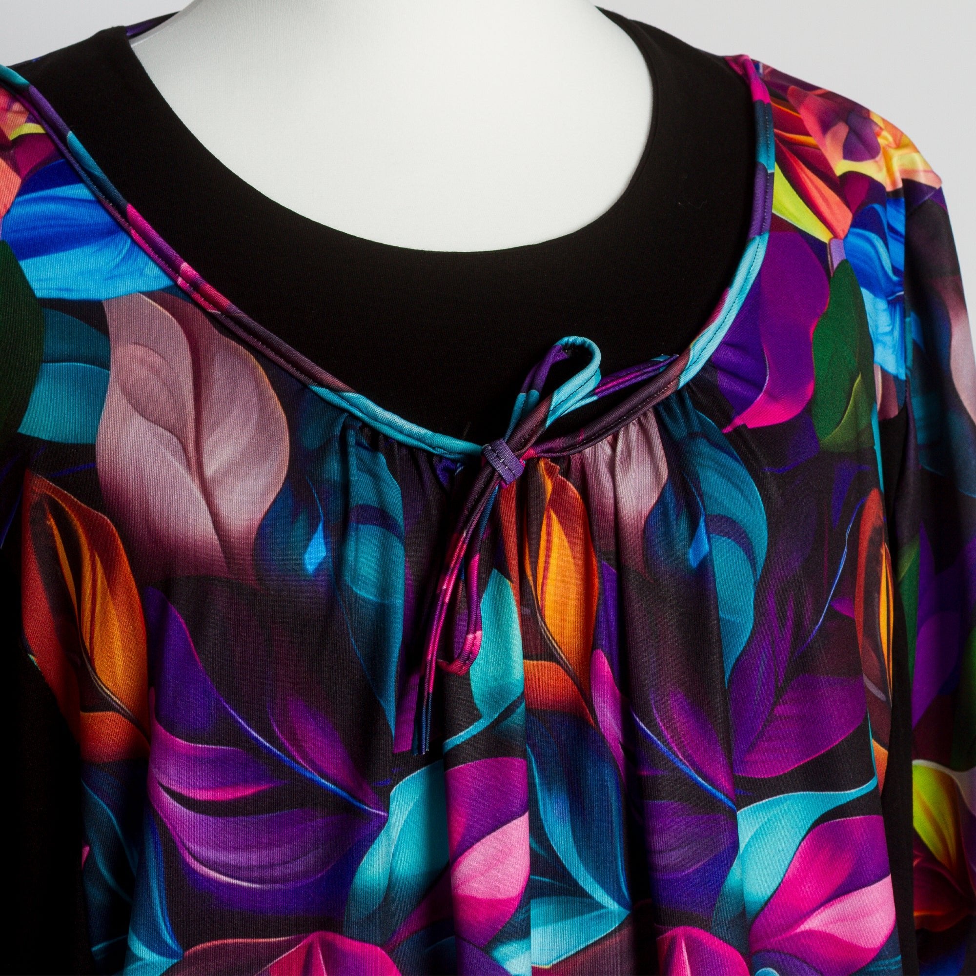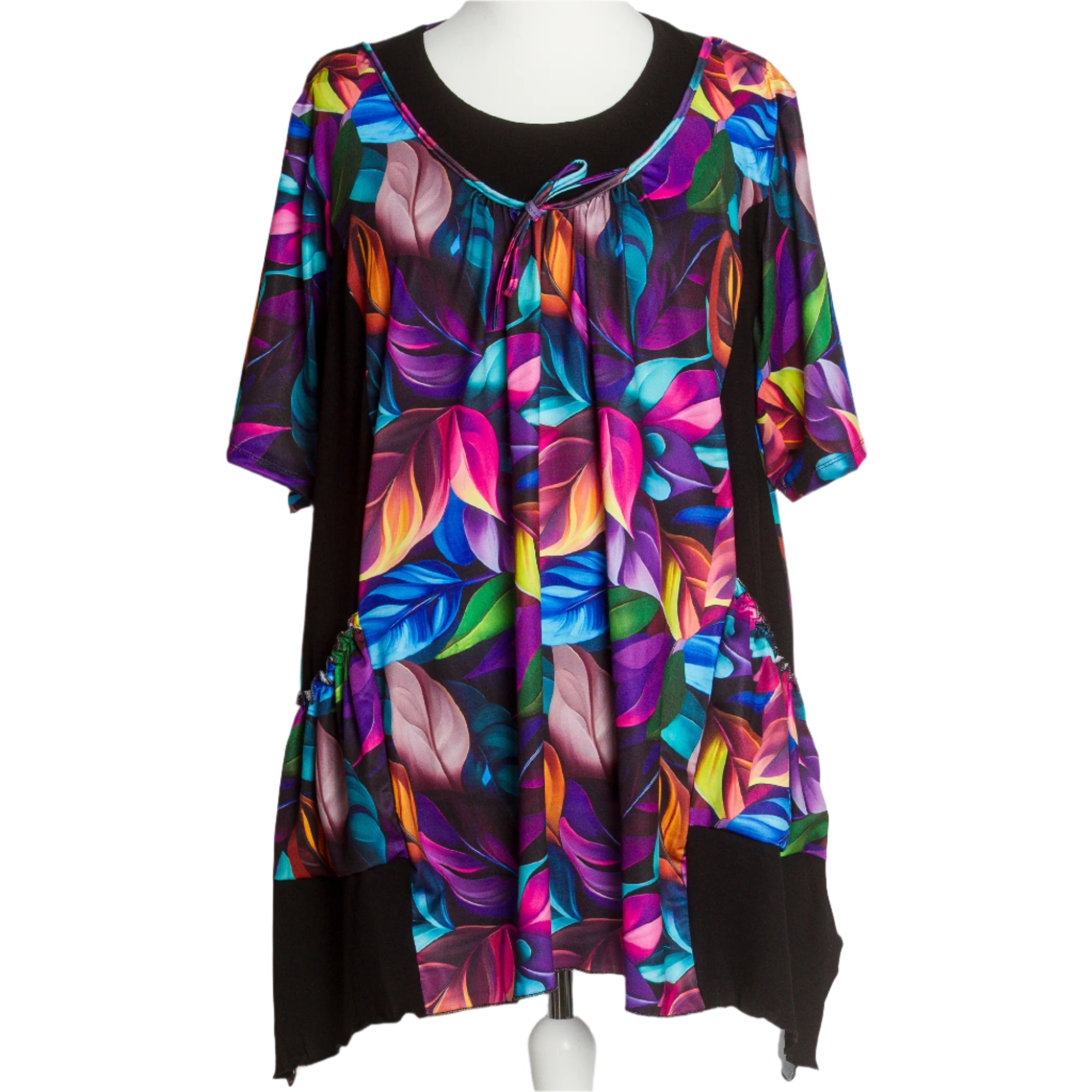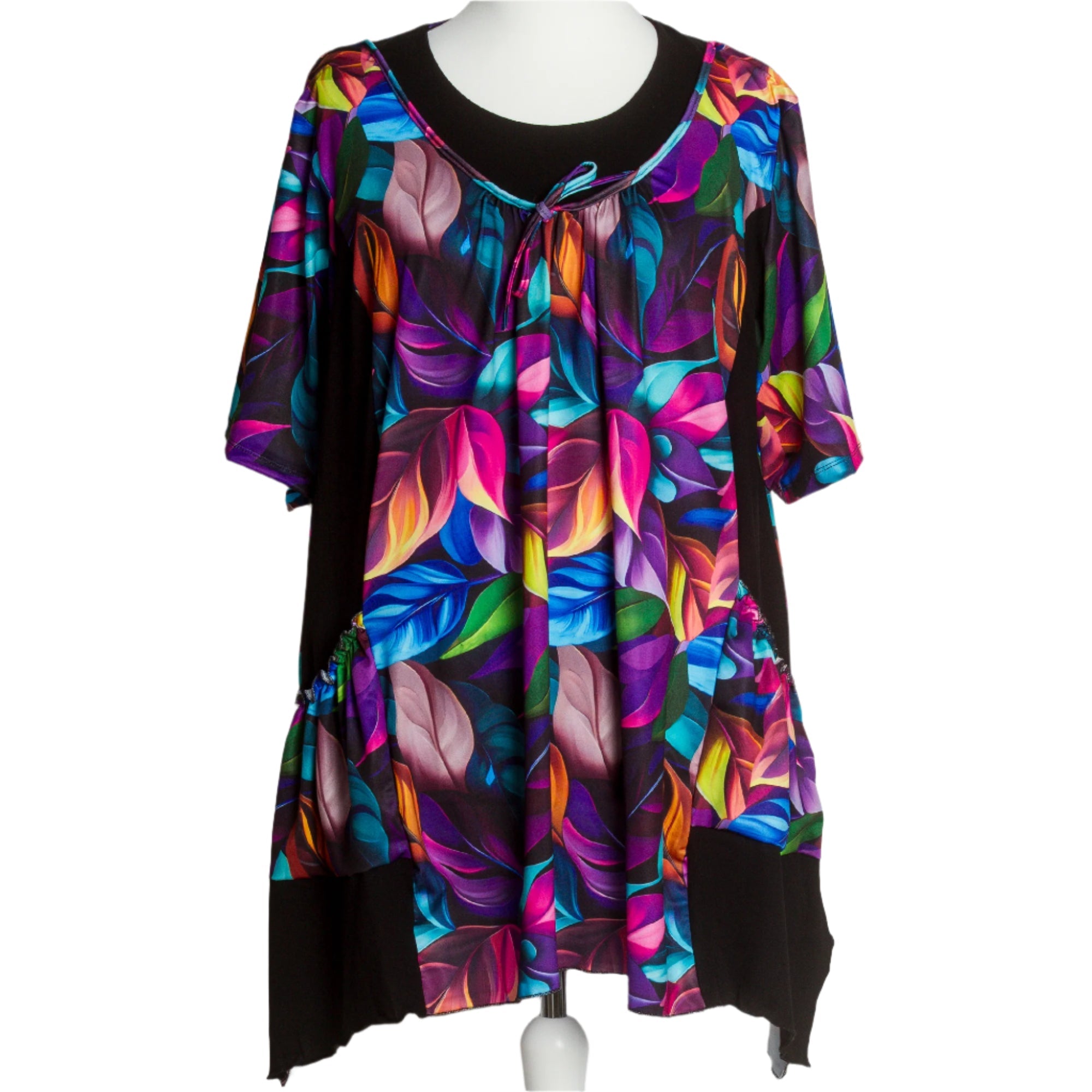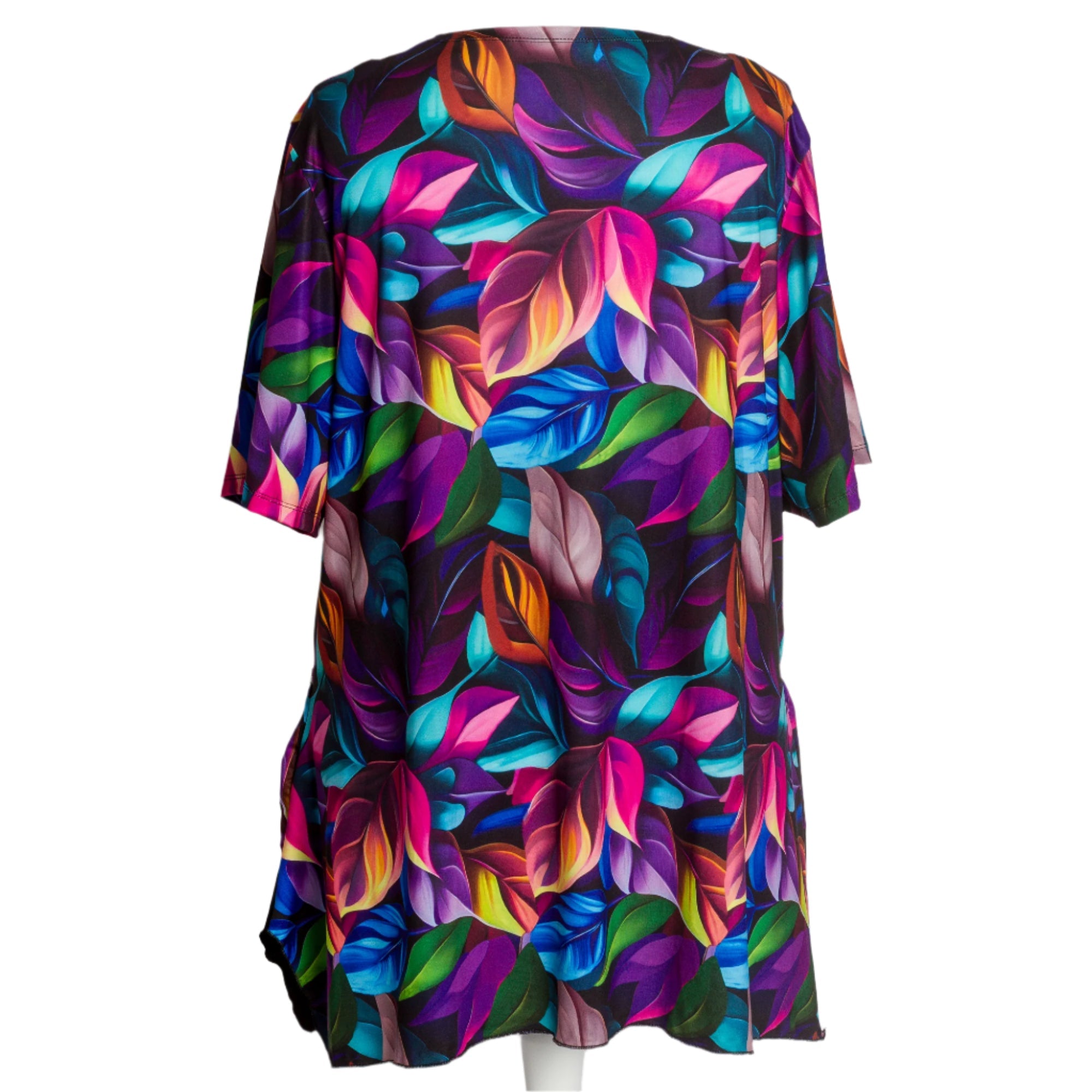 Подарете си цветно настроение с тази елегантна туника в големи размери, декорирана с ярък листен принт в наситени нюанси на лилаво, синьо, оранжево и зелено. Тъмният фон подчертава живите цветове и оформя силуета визуално. Разкроената кройка осигурява удобство през целия ден, а връзките на деколтето и двата джоба добавят функционалност и стил. Идеален избор за ежедневието или по-официални поводи.